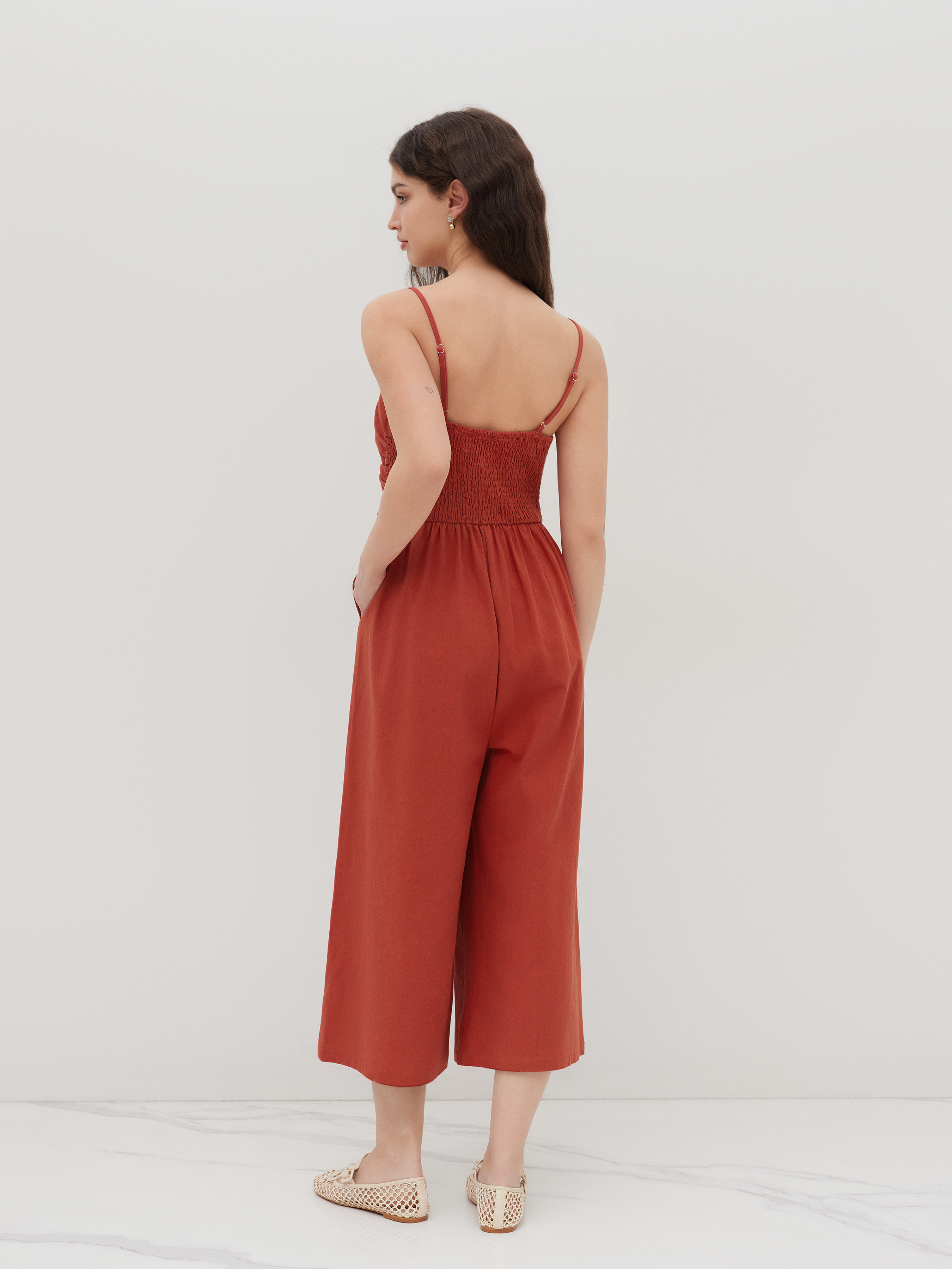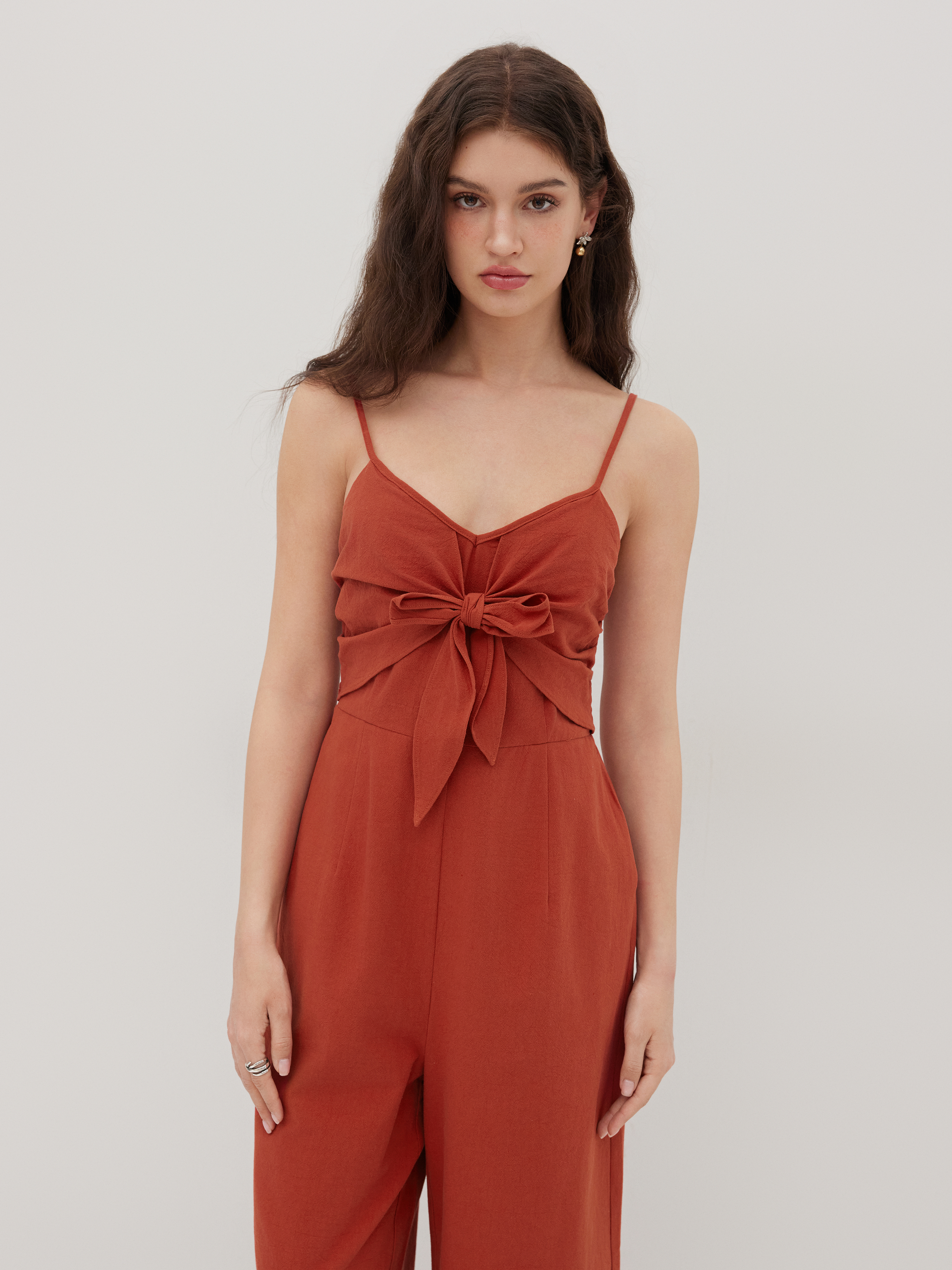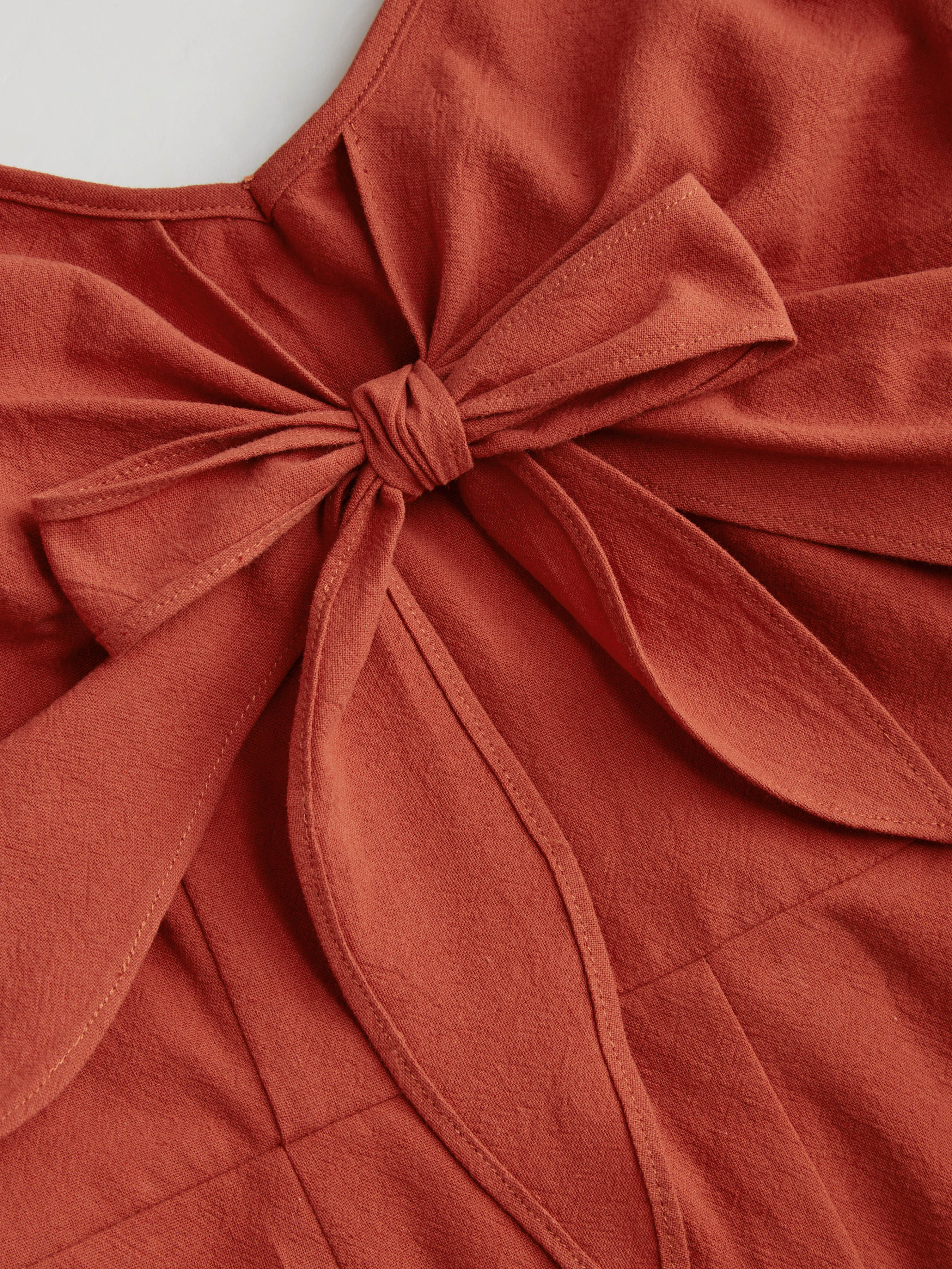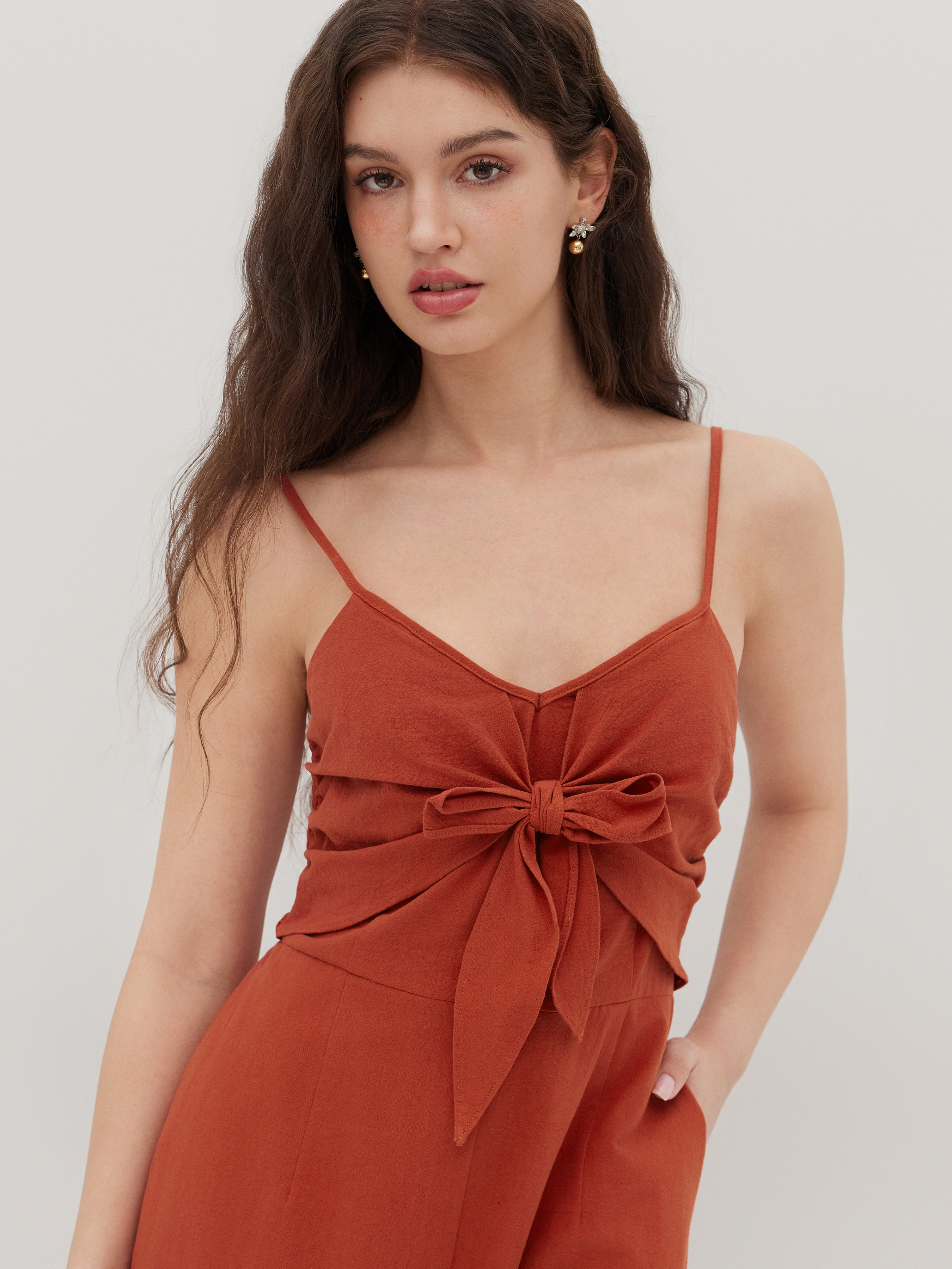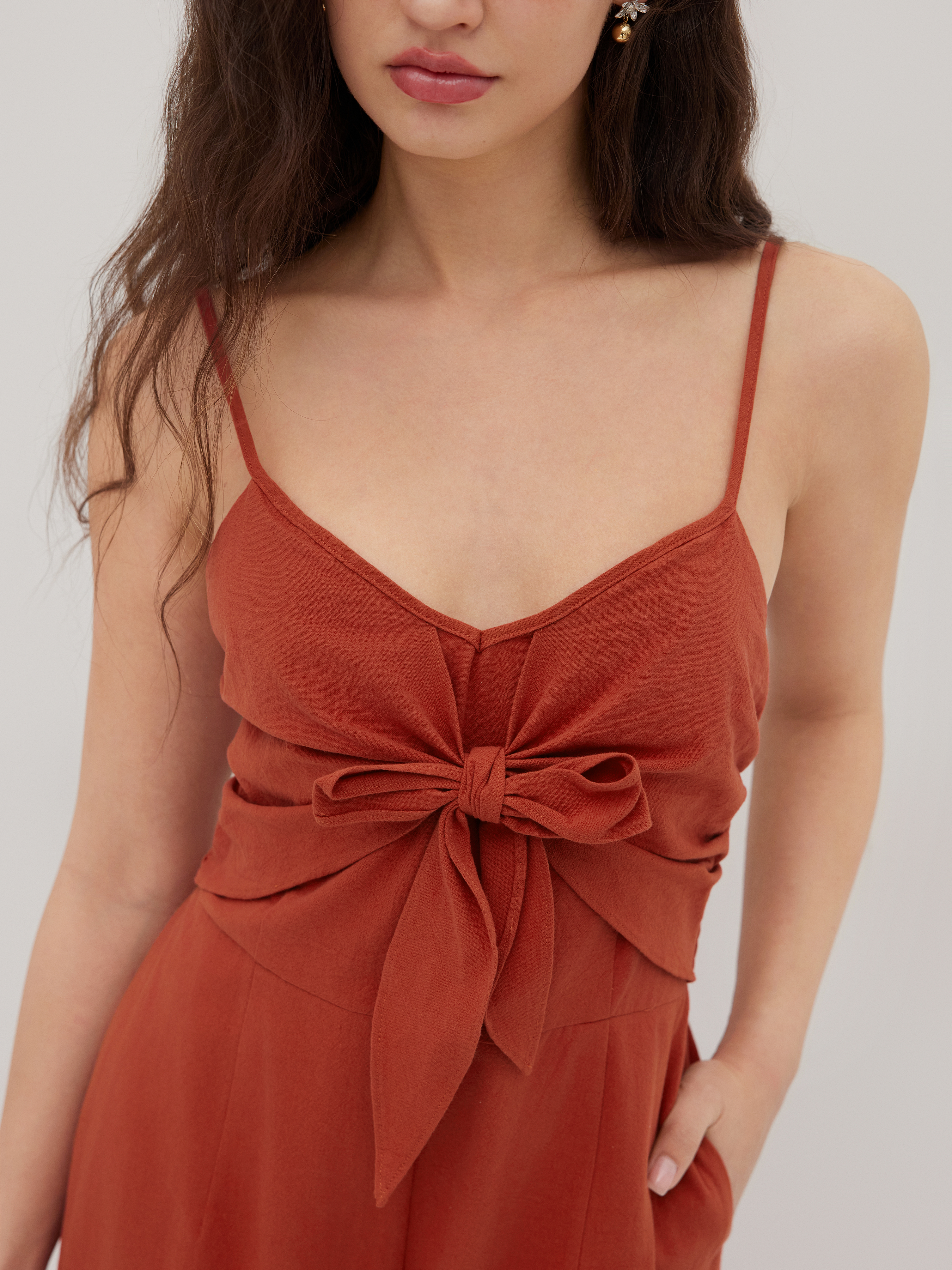 Tuta cropped a gamba larga arricciata con fiocco in 100% cotone