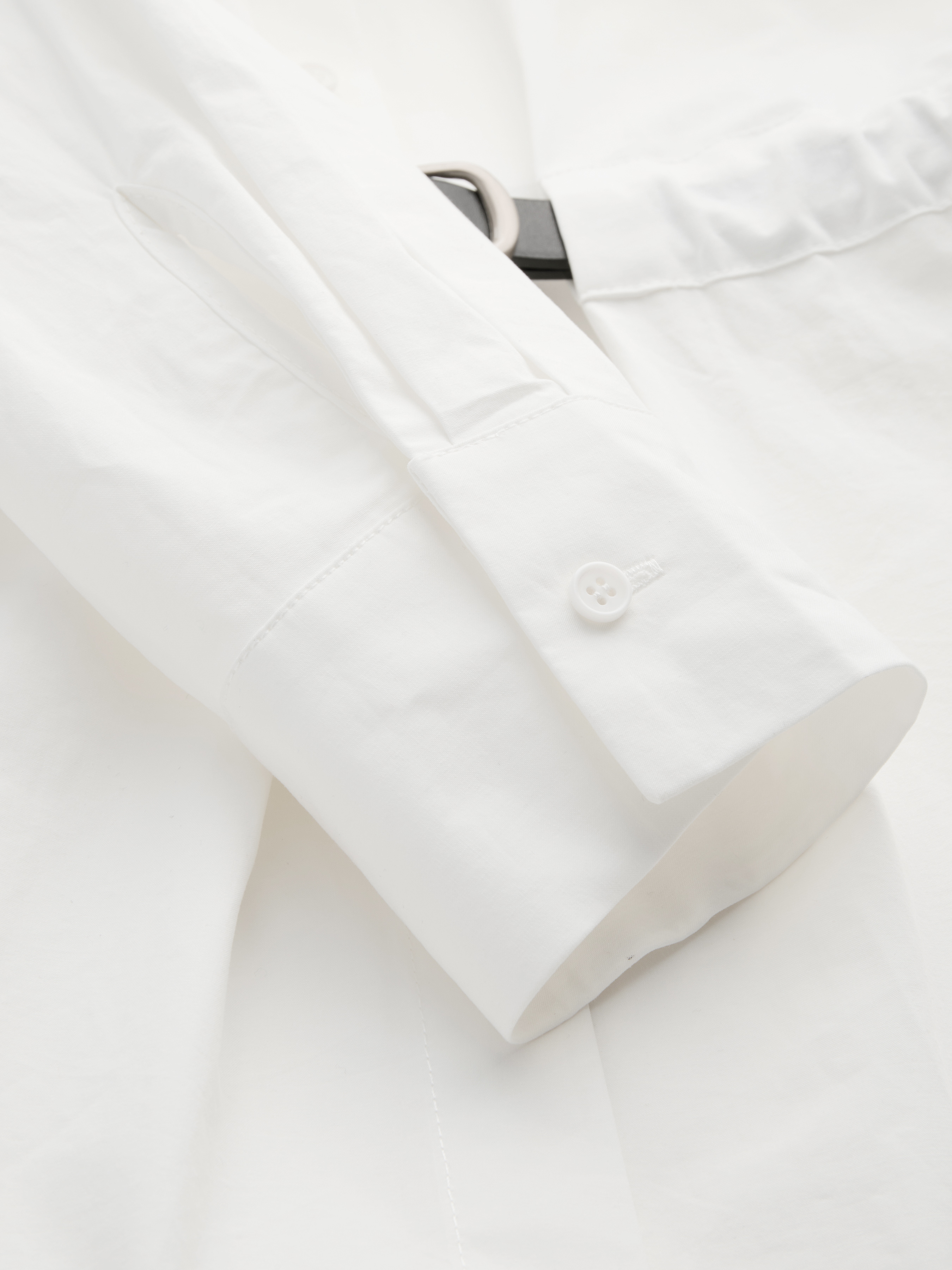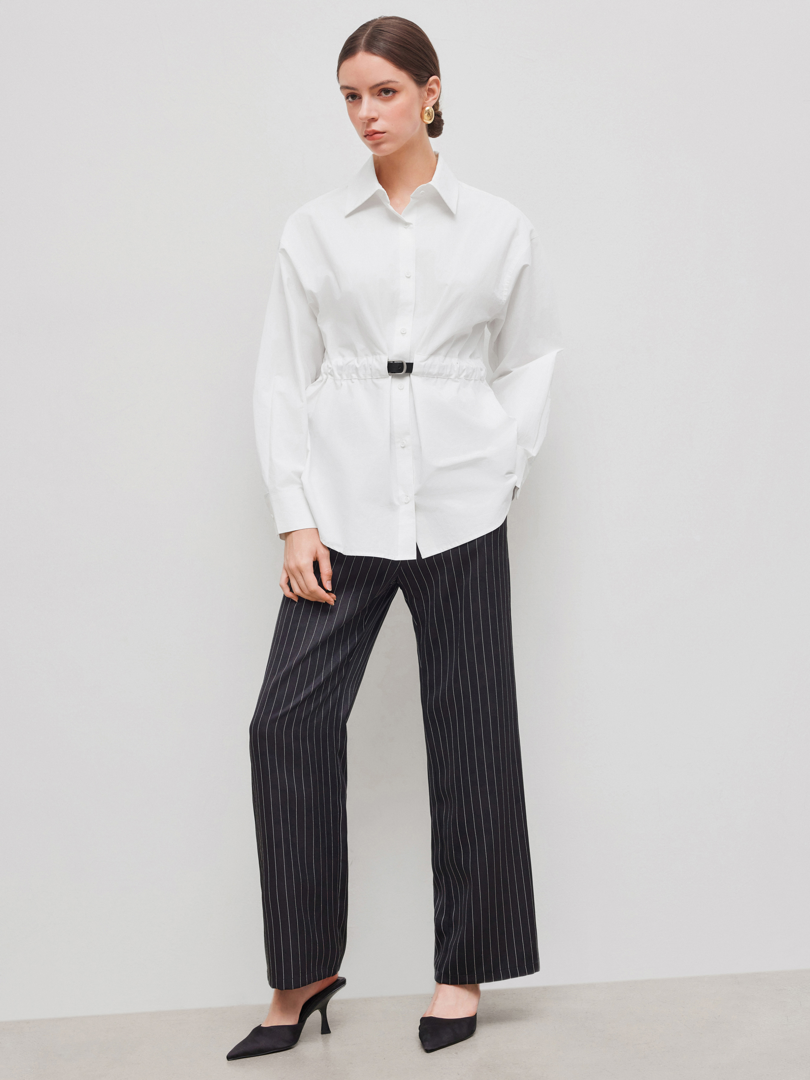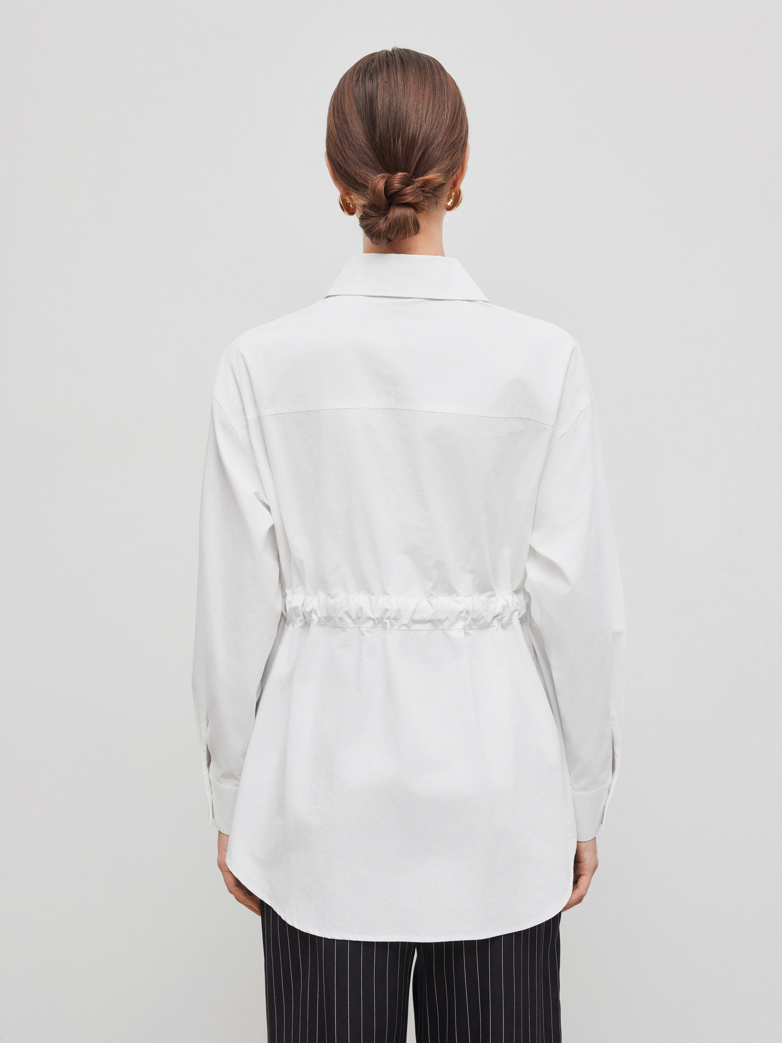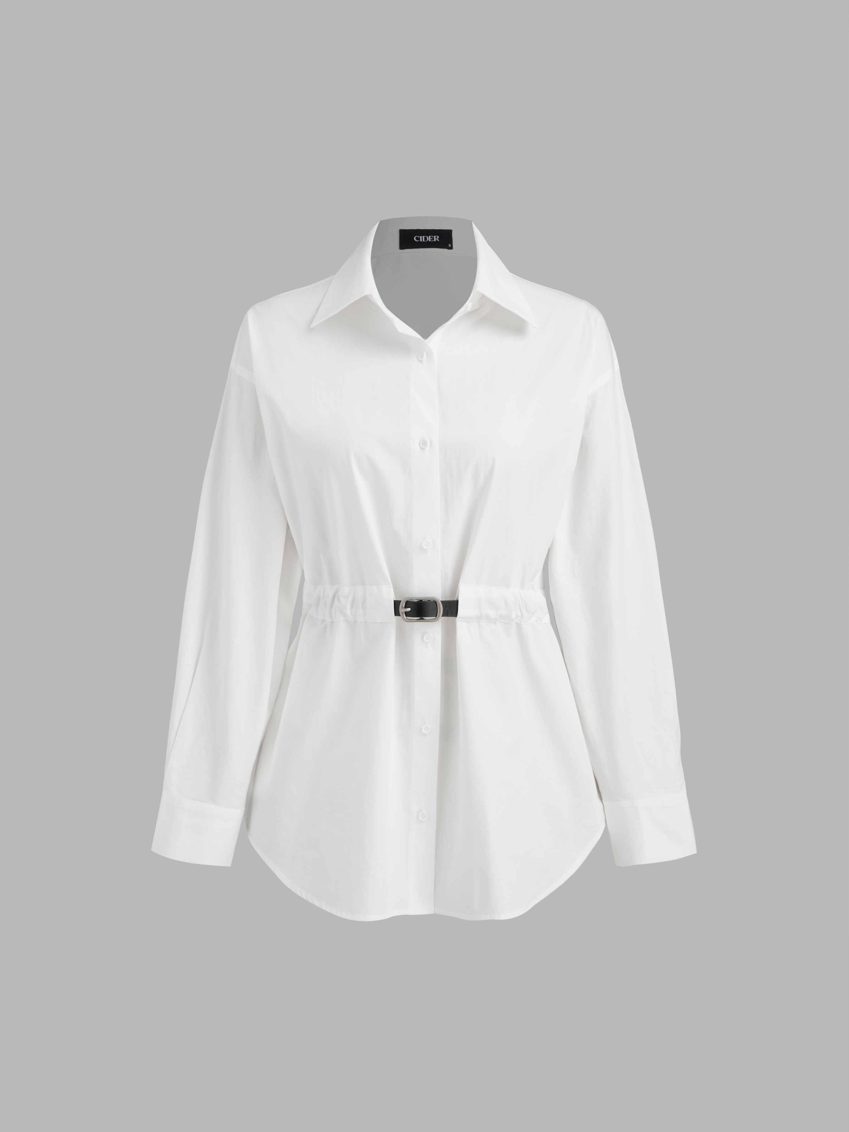 Camicia a maniche lunghe con cintura e arricciature, colletto e bottoni in tinta unita, 100% cotone