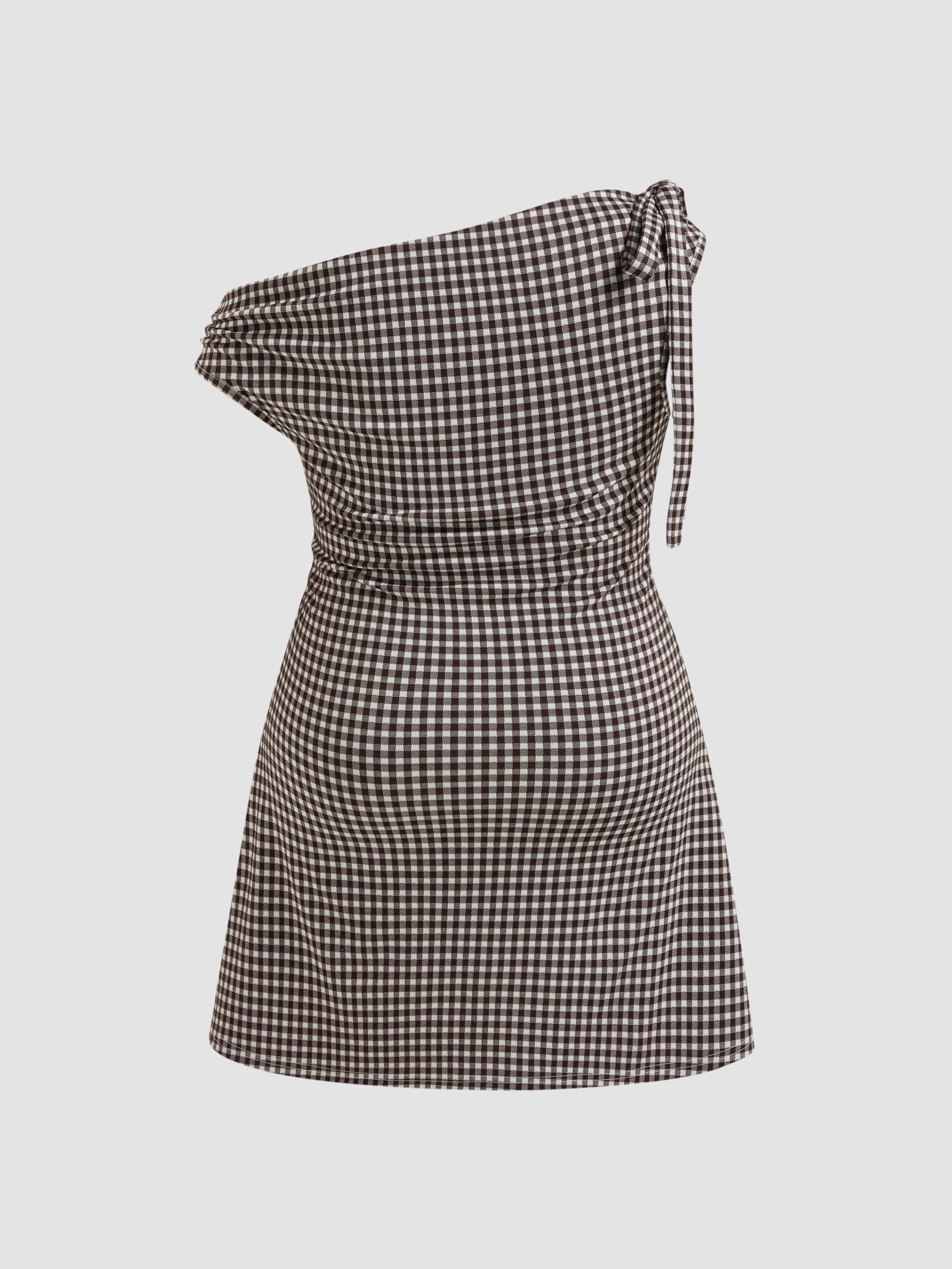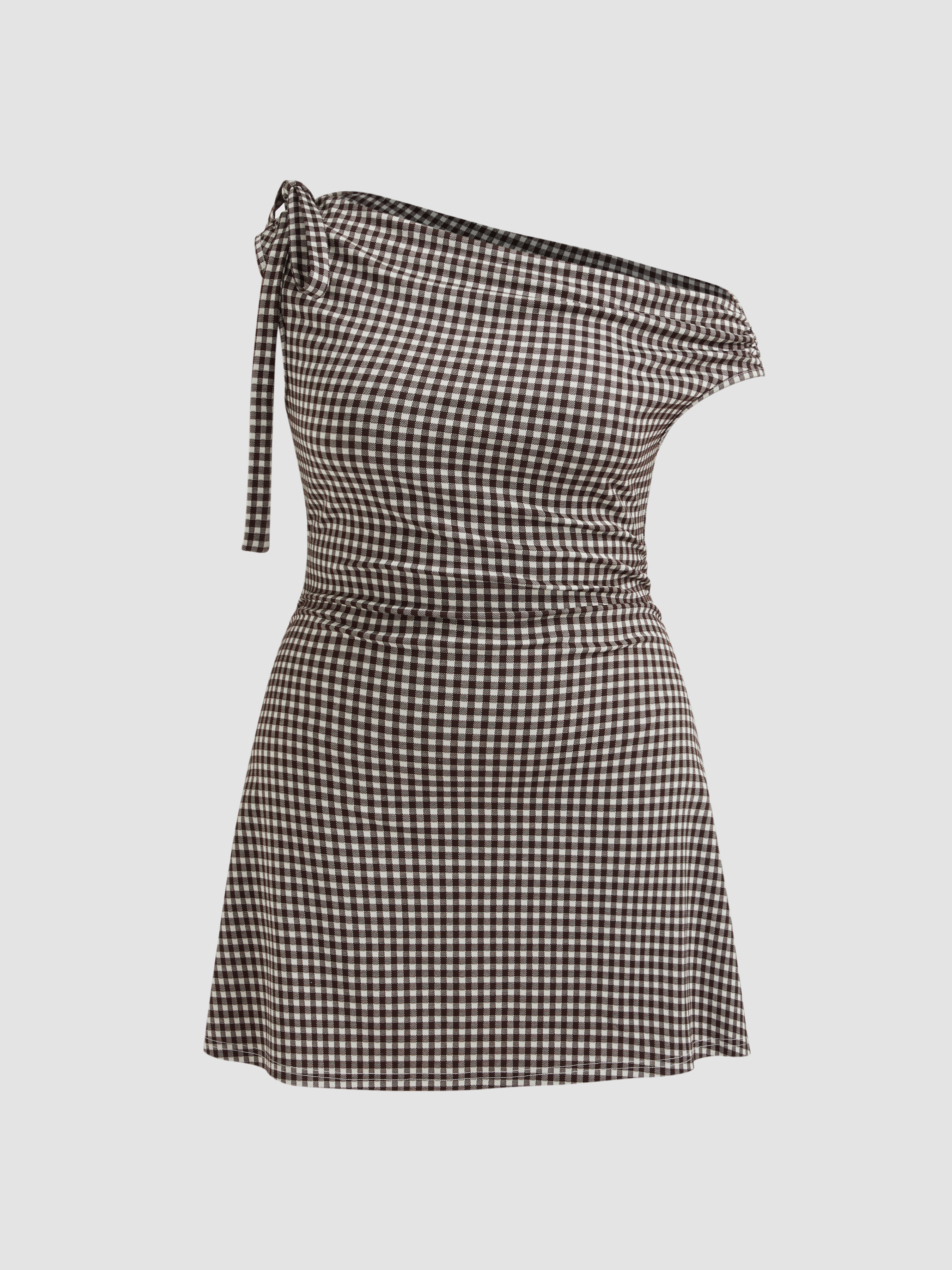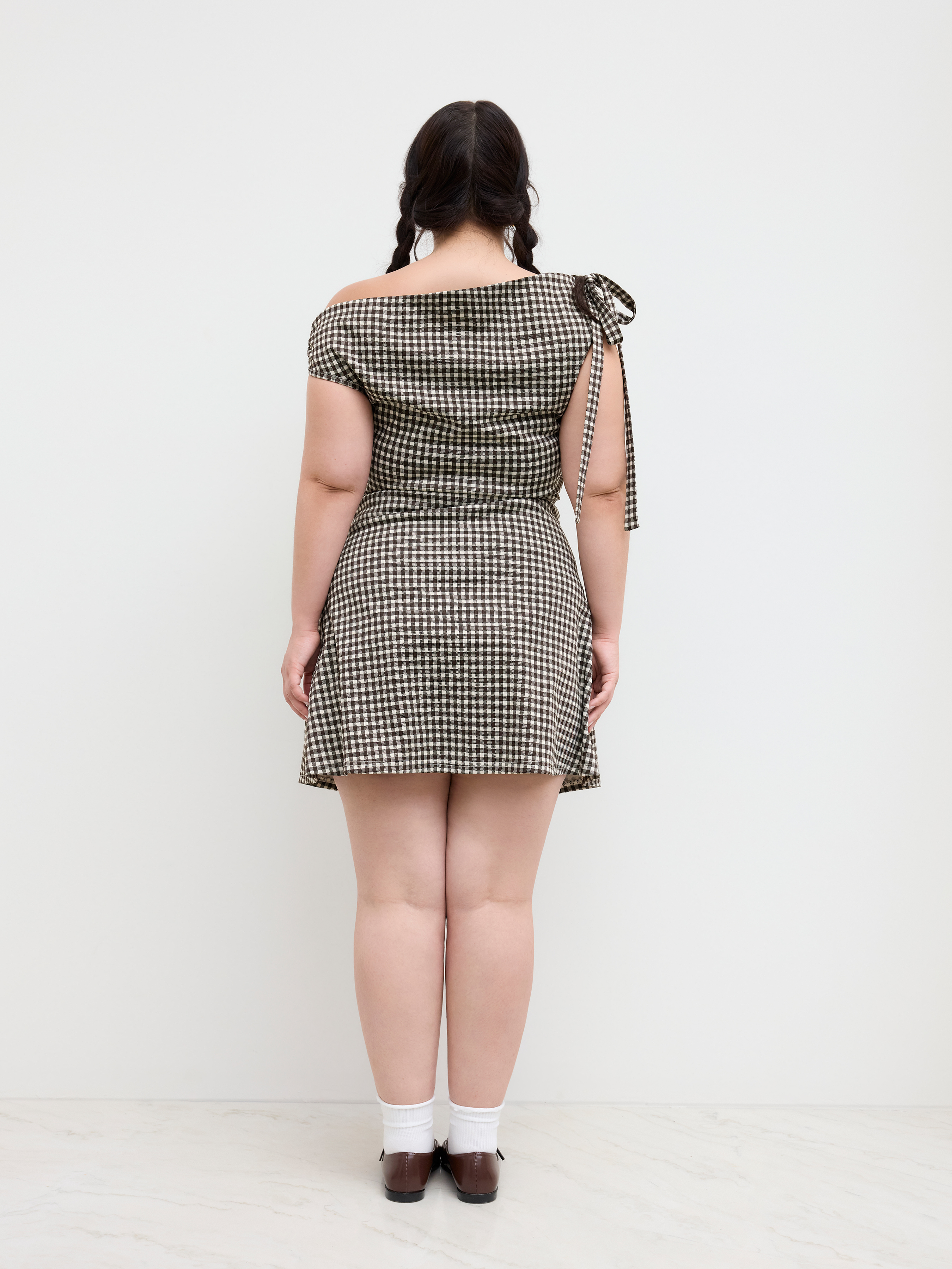 Abito Mini Curvy & Plus a Quadri Gingham con Scollo Asimmetrico Annodato e Arricciato