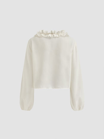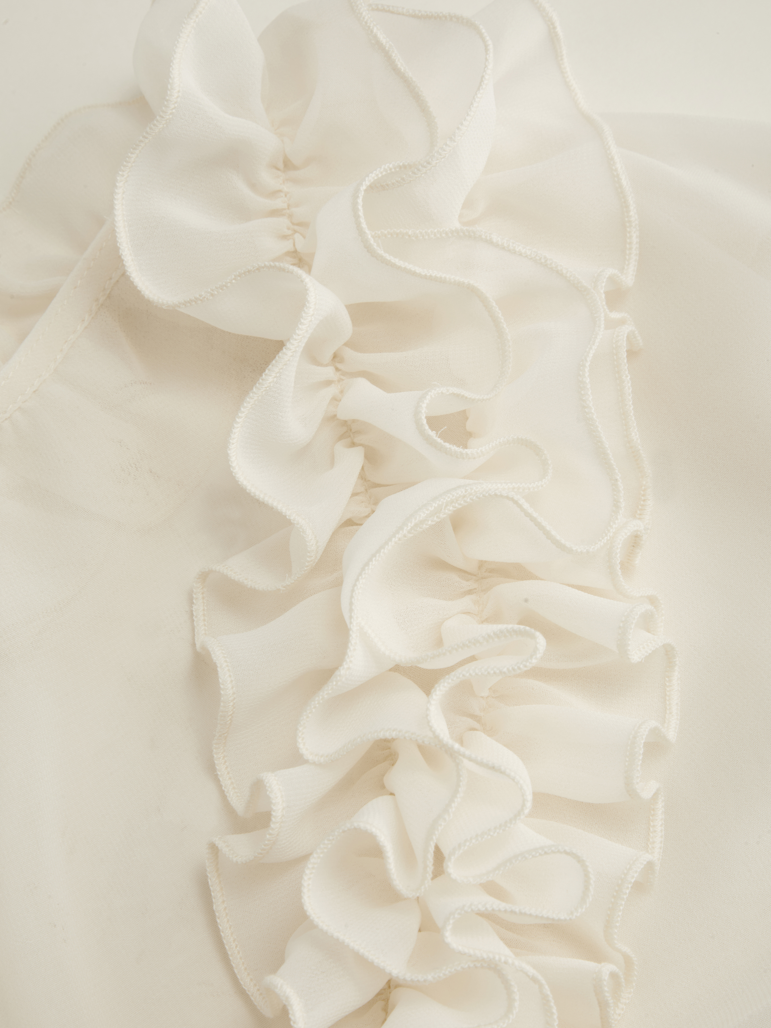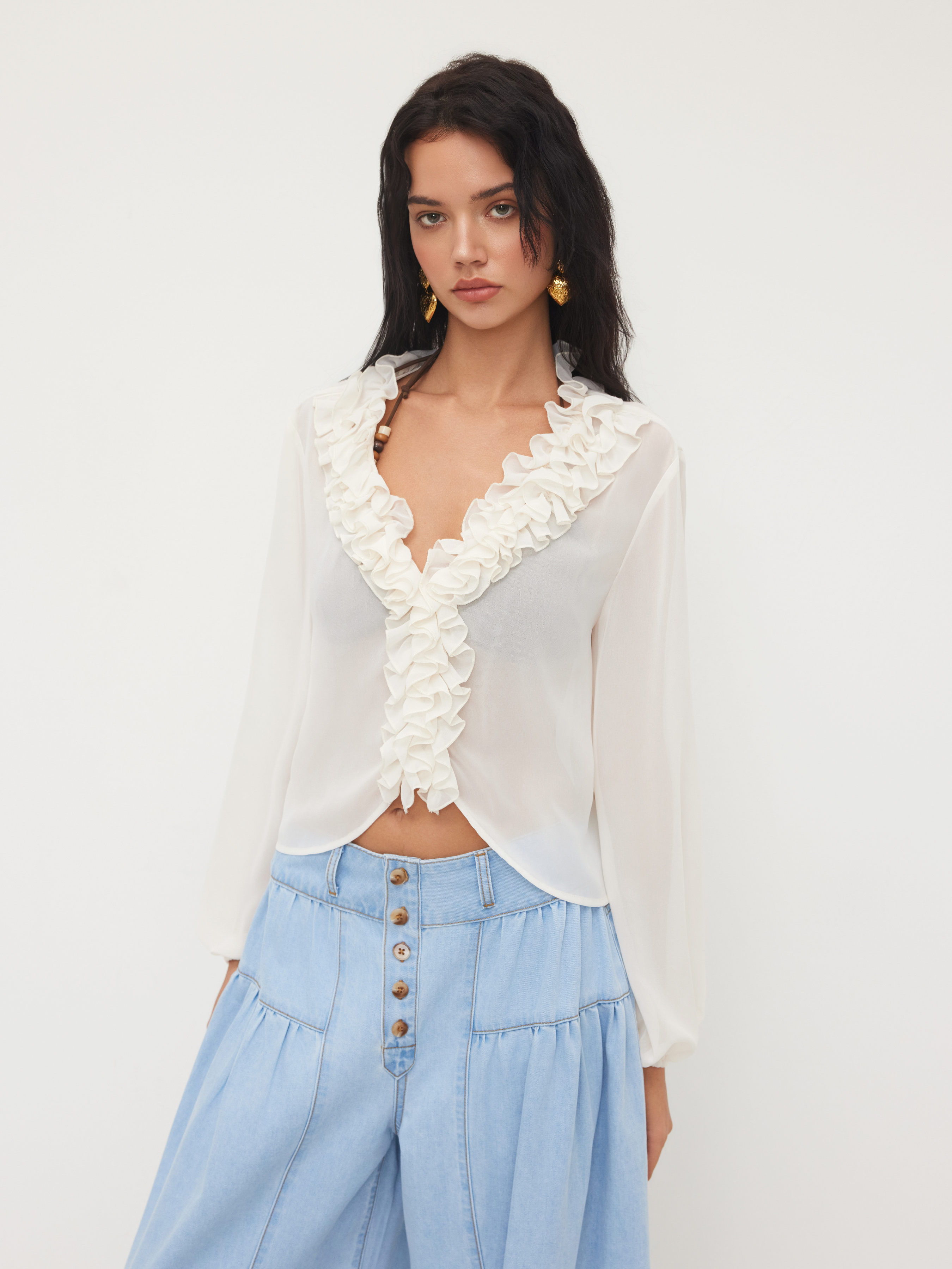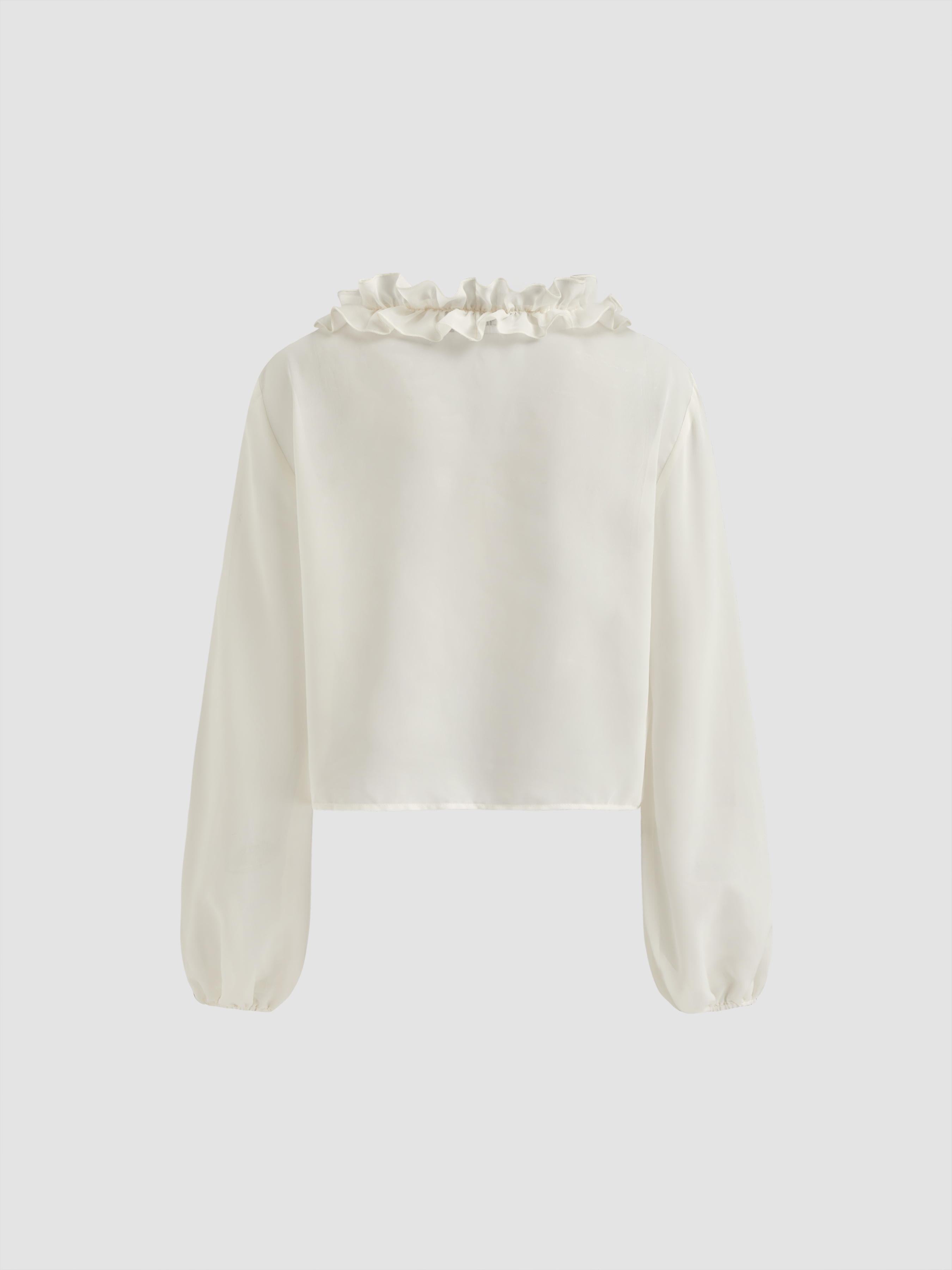Camicetta in chiffon con scollo a V, orlo a lattuga, volant e maniche a lanterna con ruches