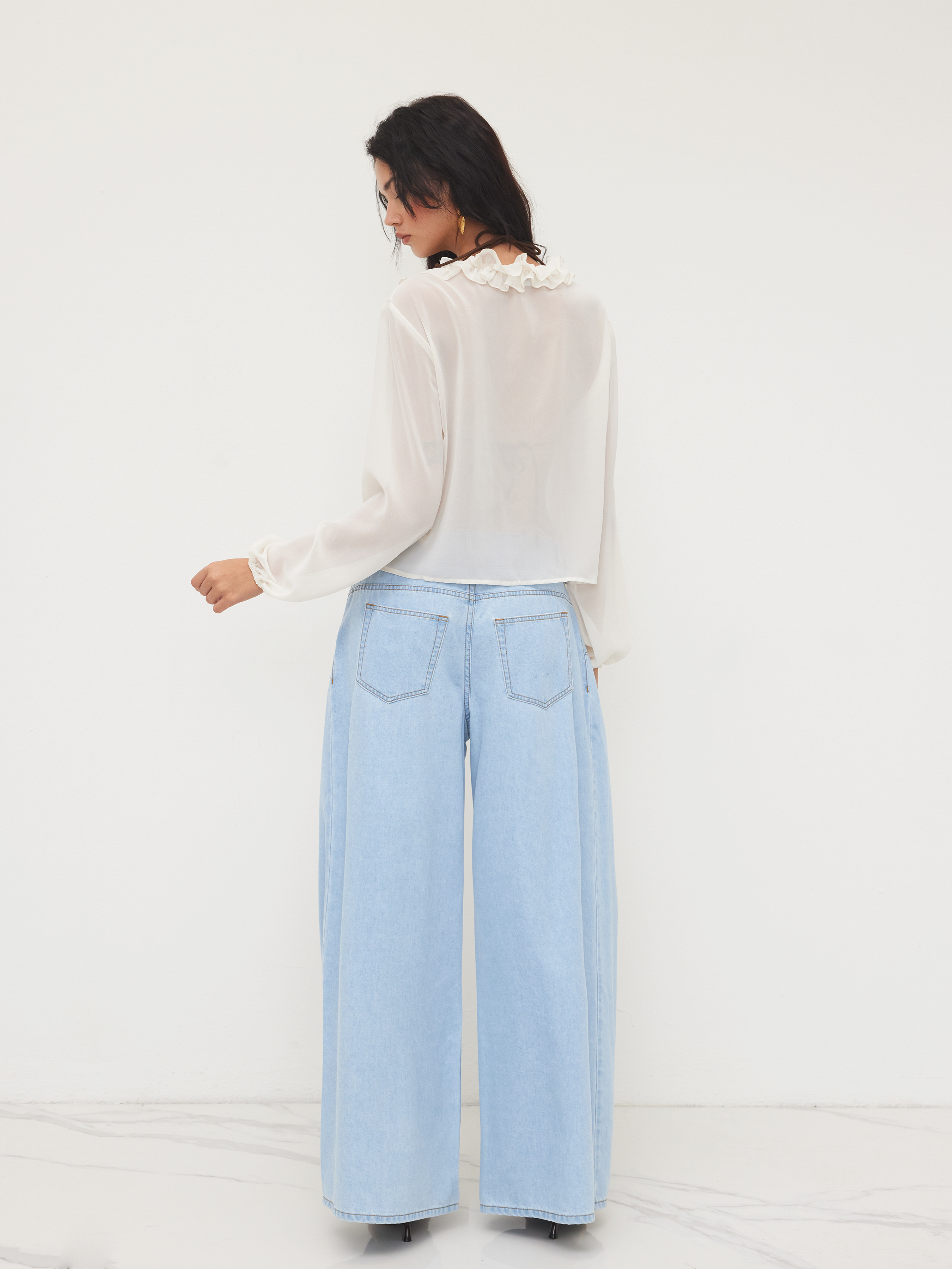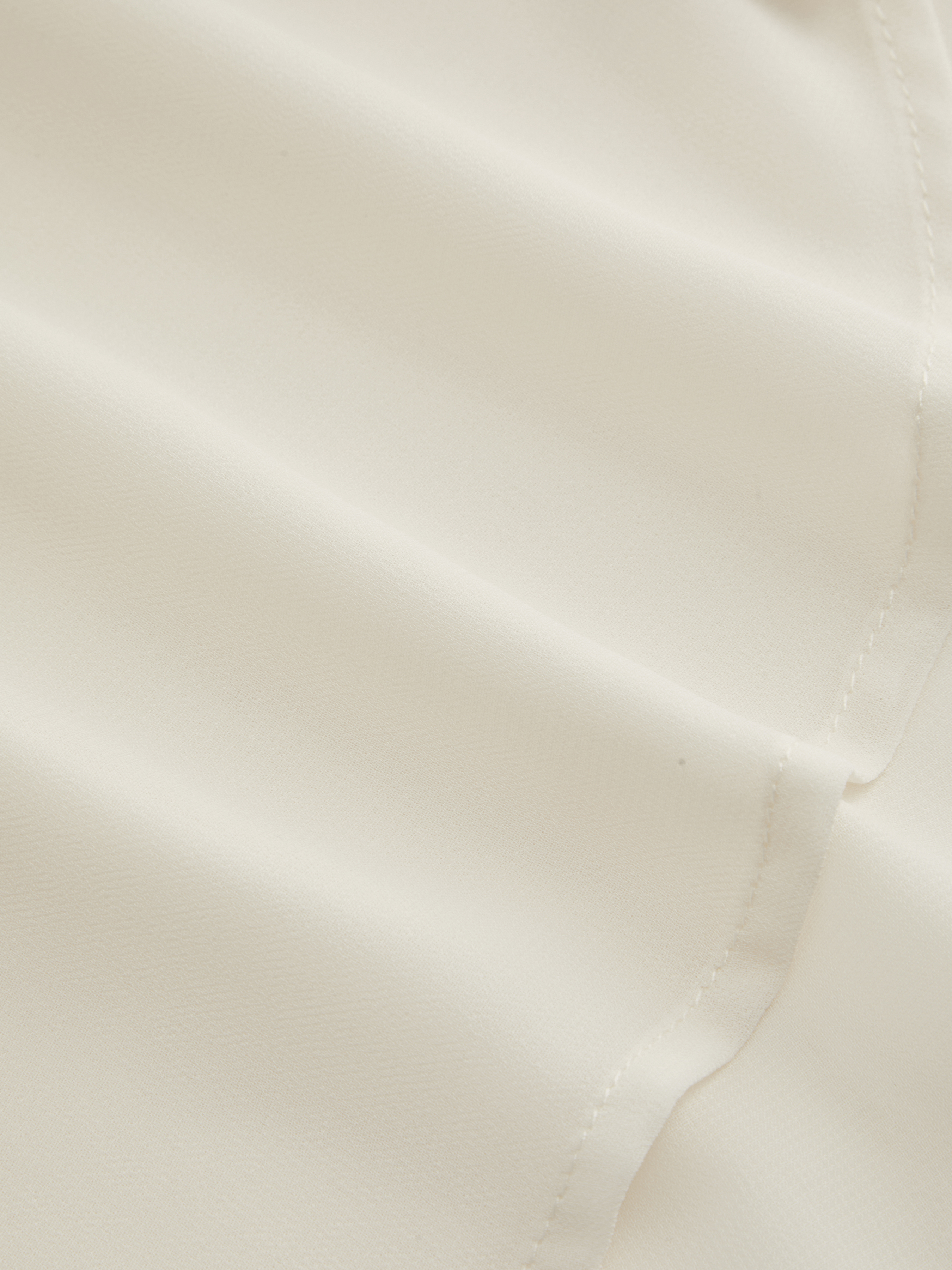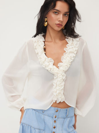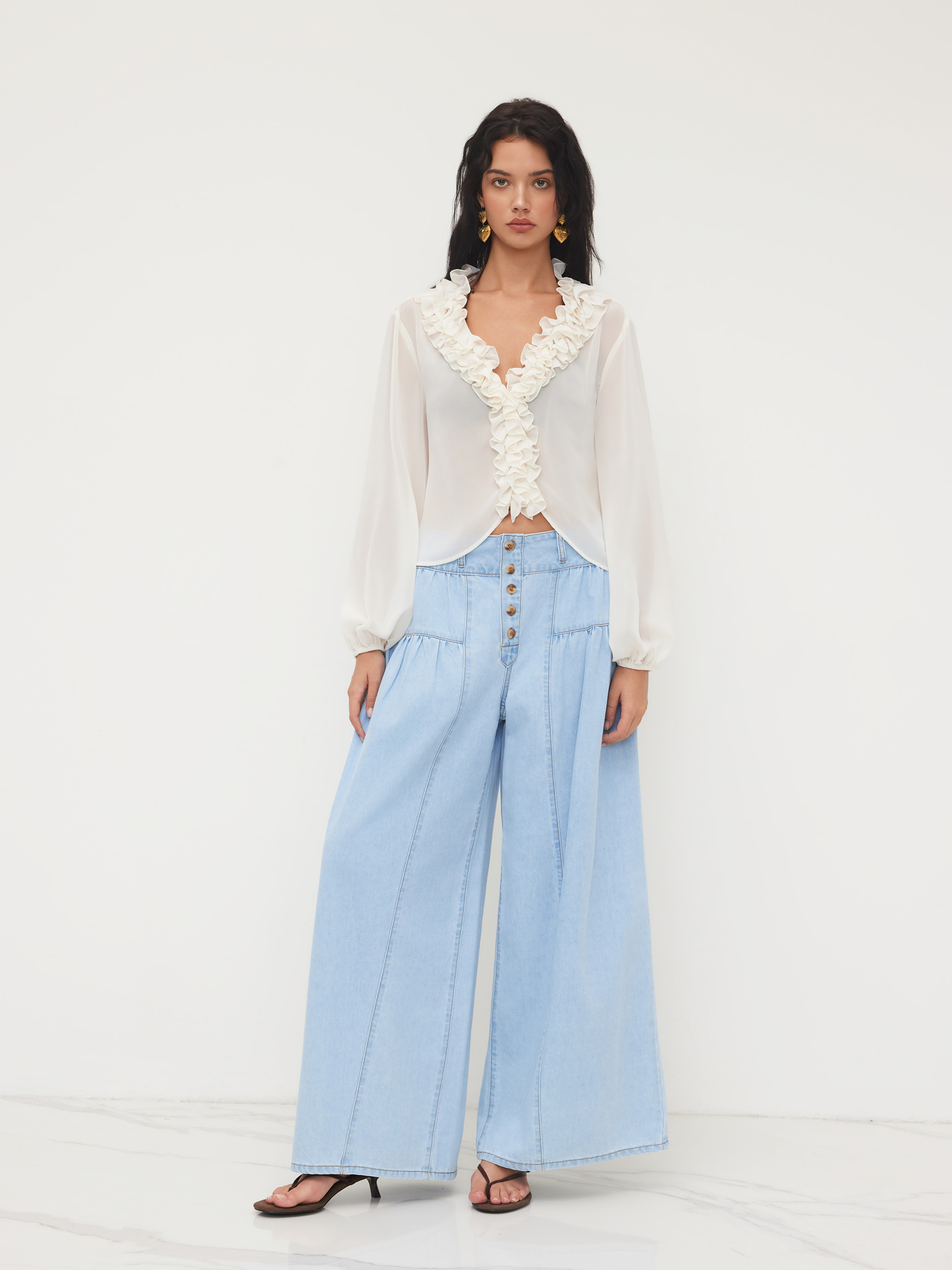 Camicetta in chiffon con scollo a V, orlo a lattuga, volant e maniche a lanterna con ruches