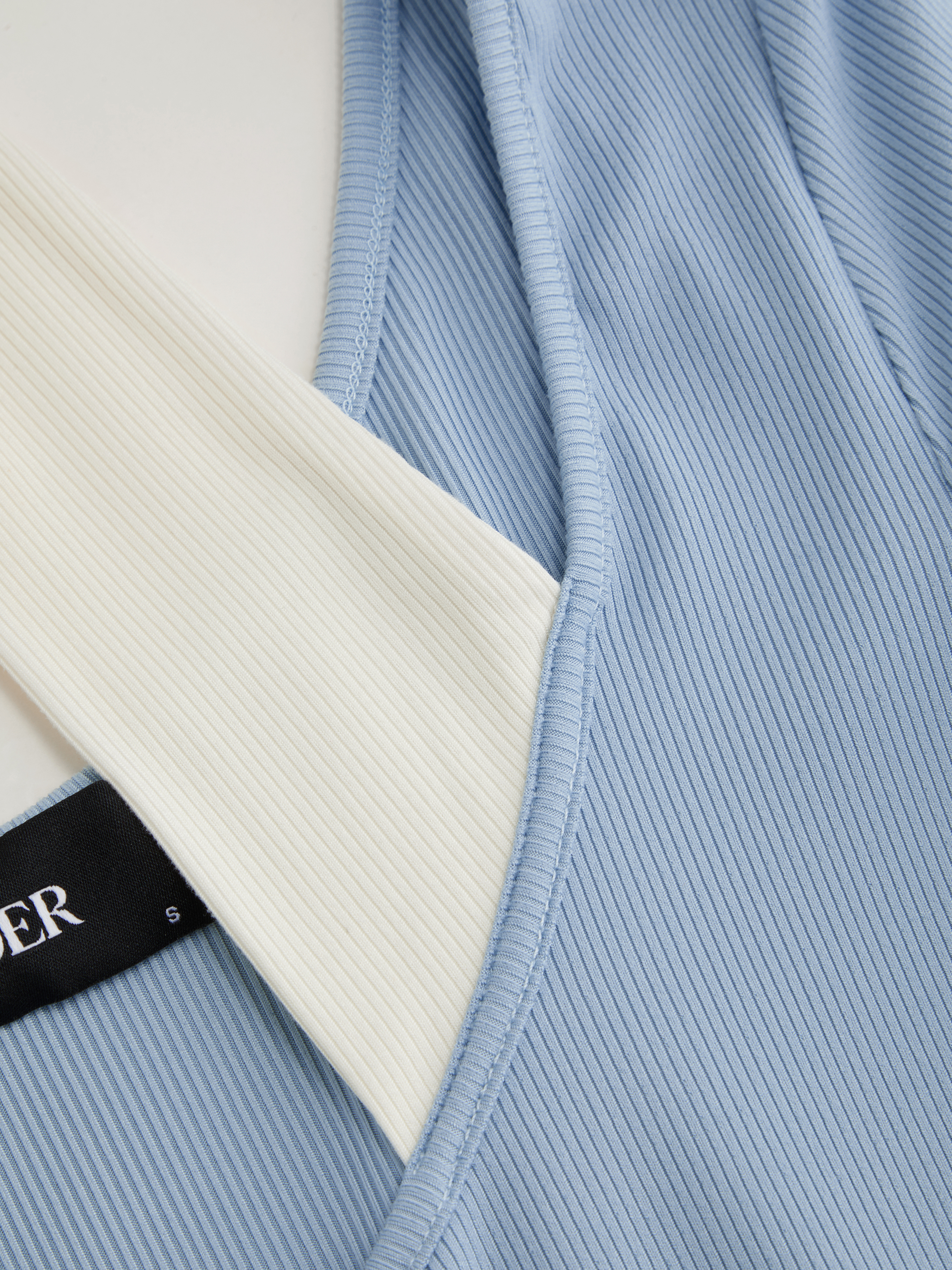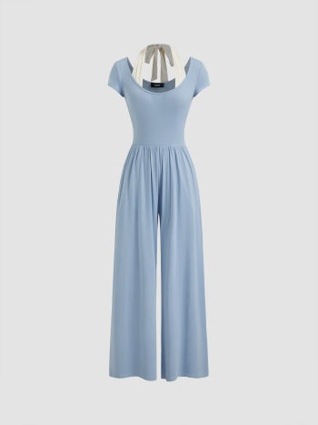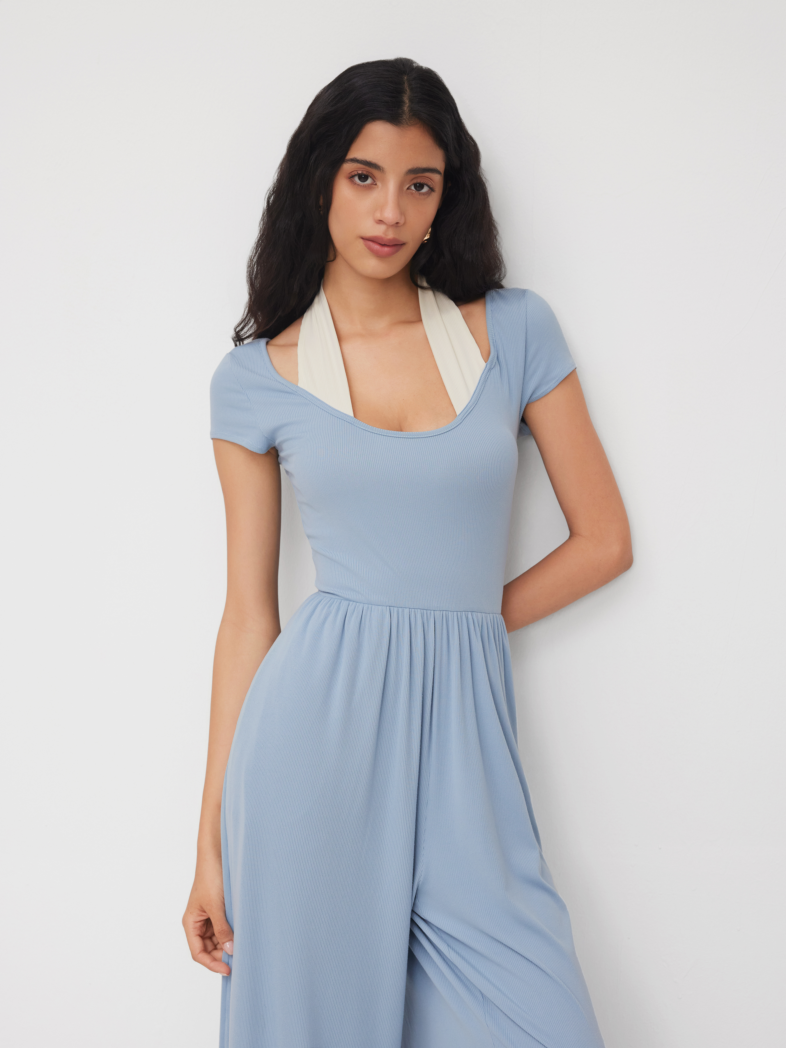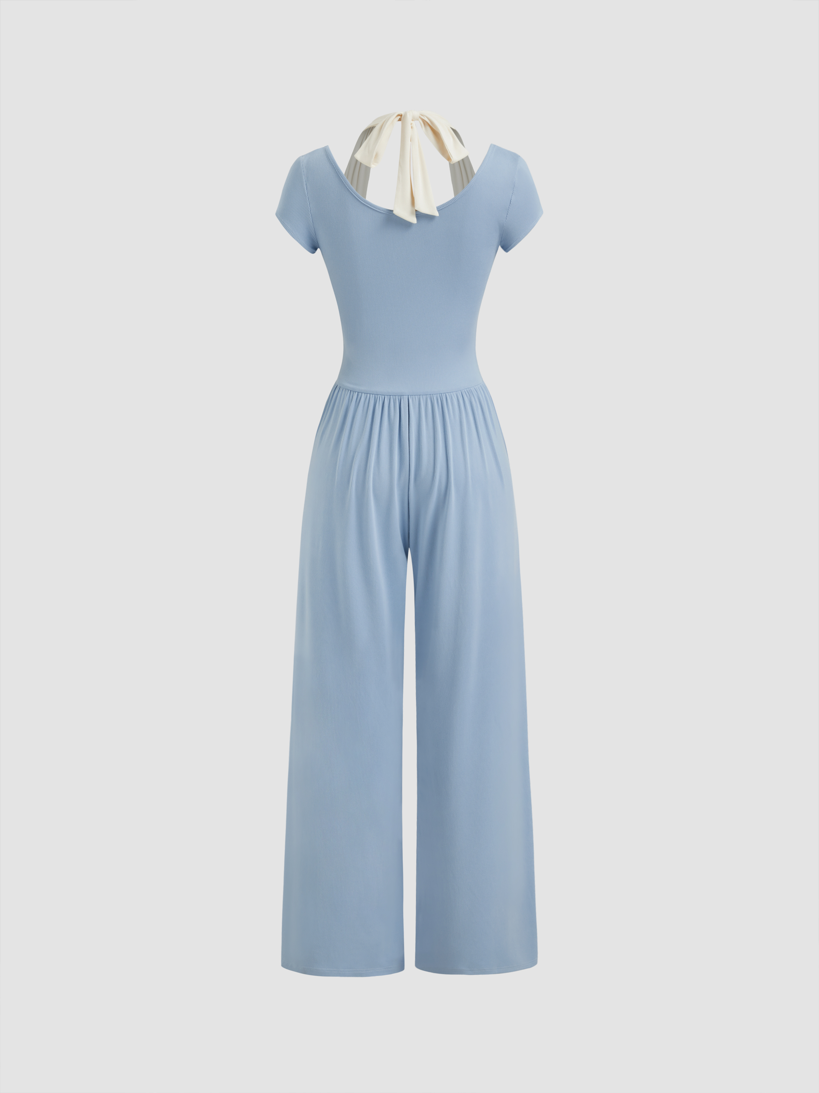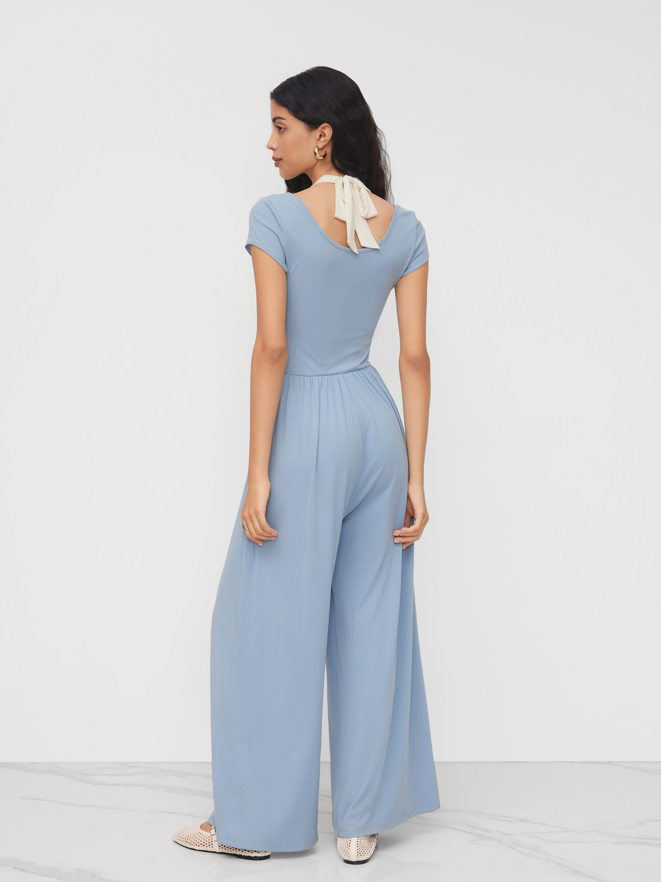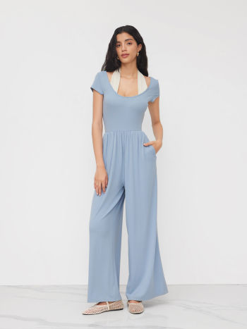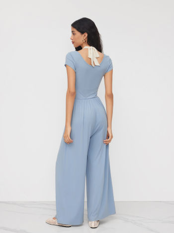 Tuta jumpsuit a gamba larga annodata bicolore con scollo a U