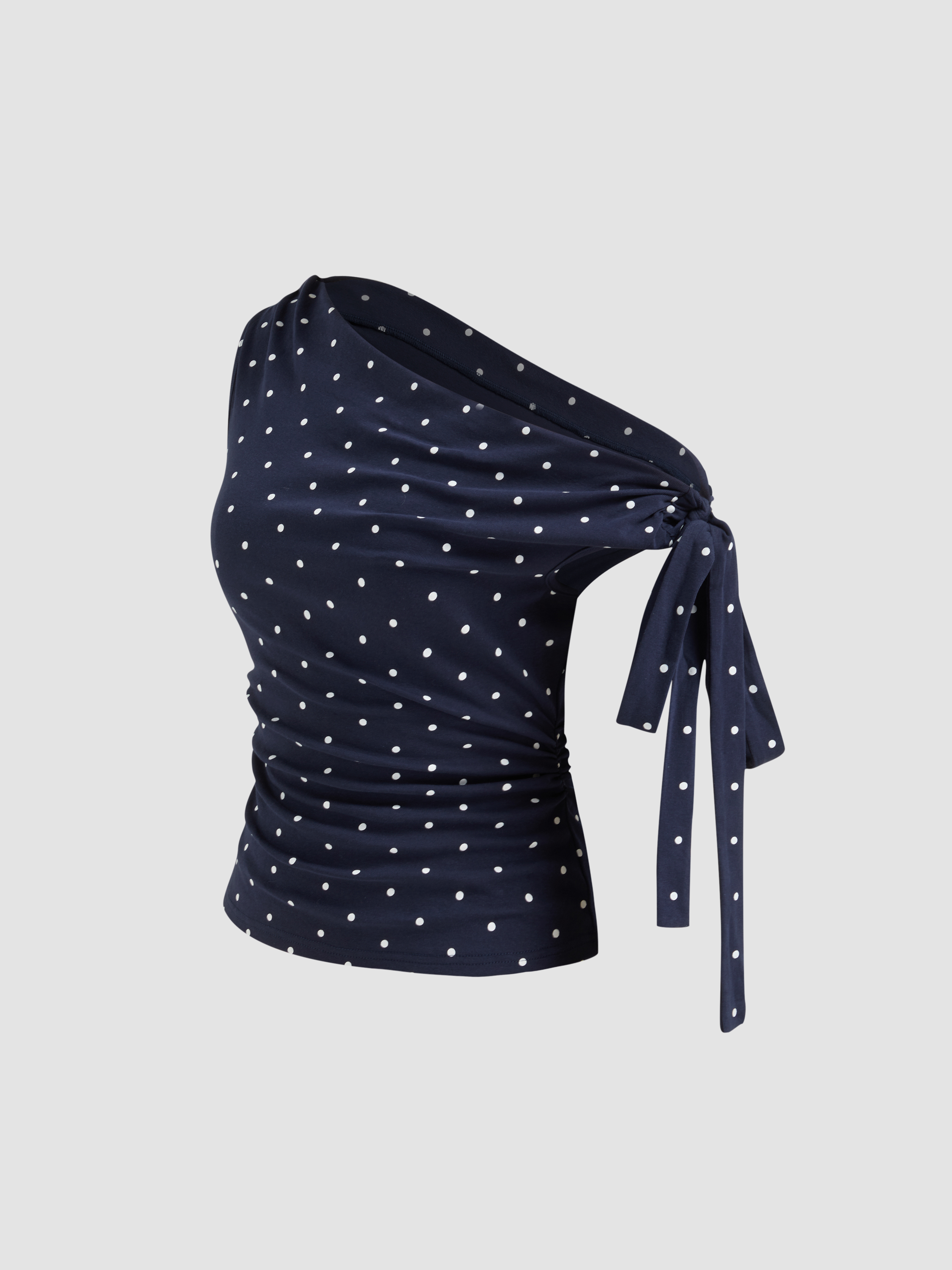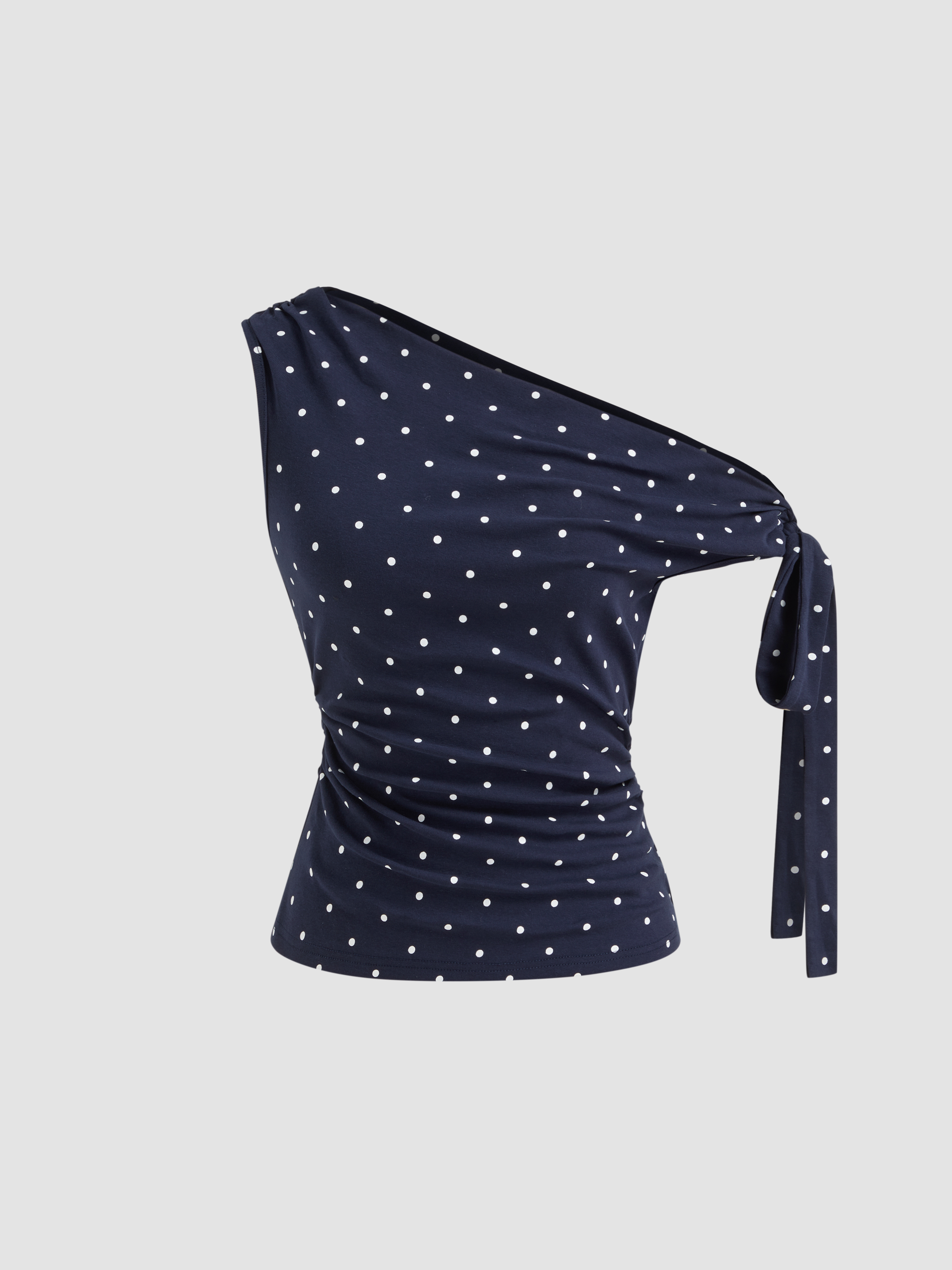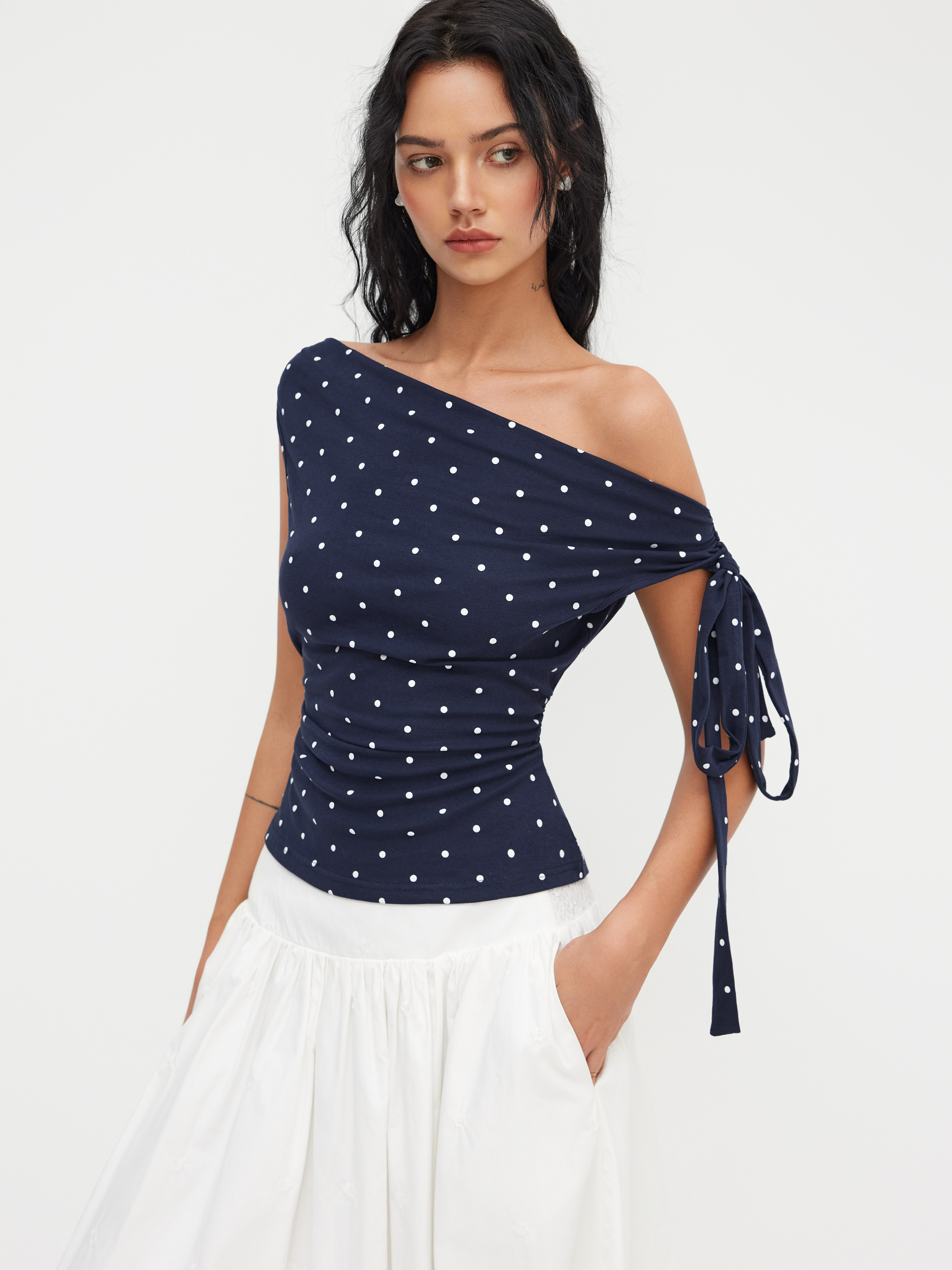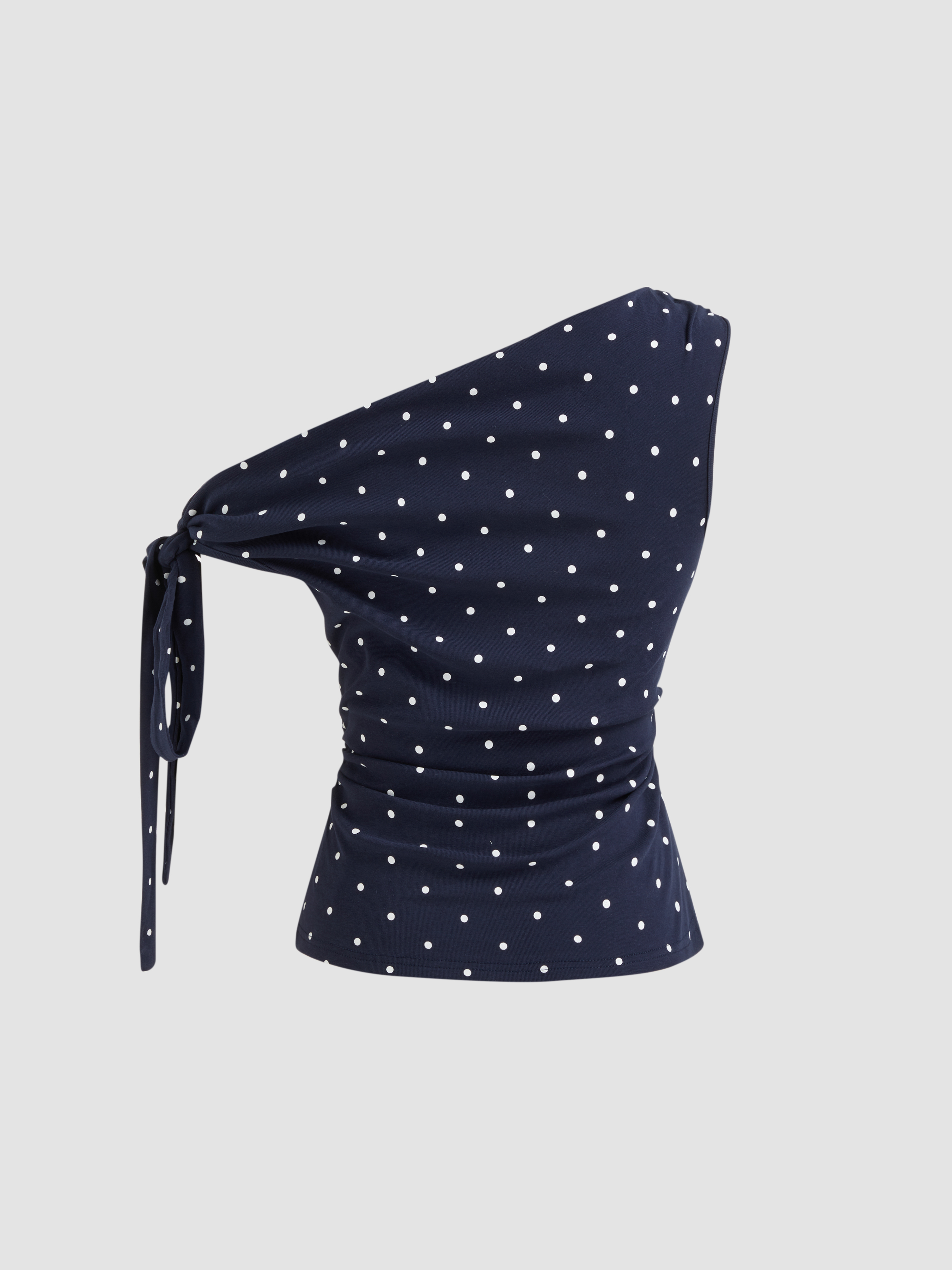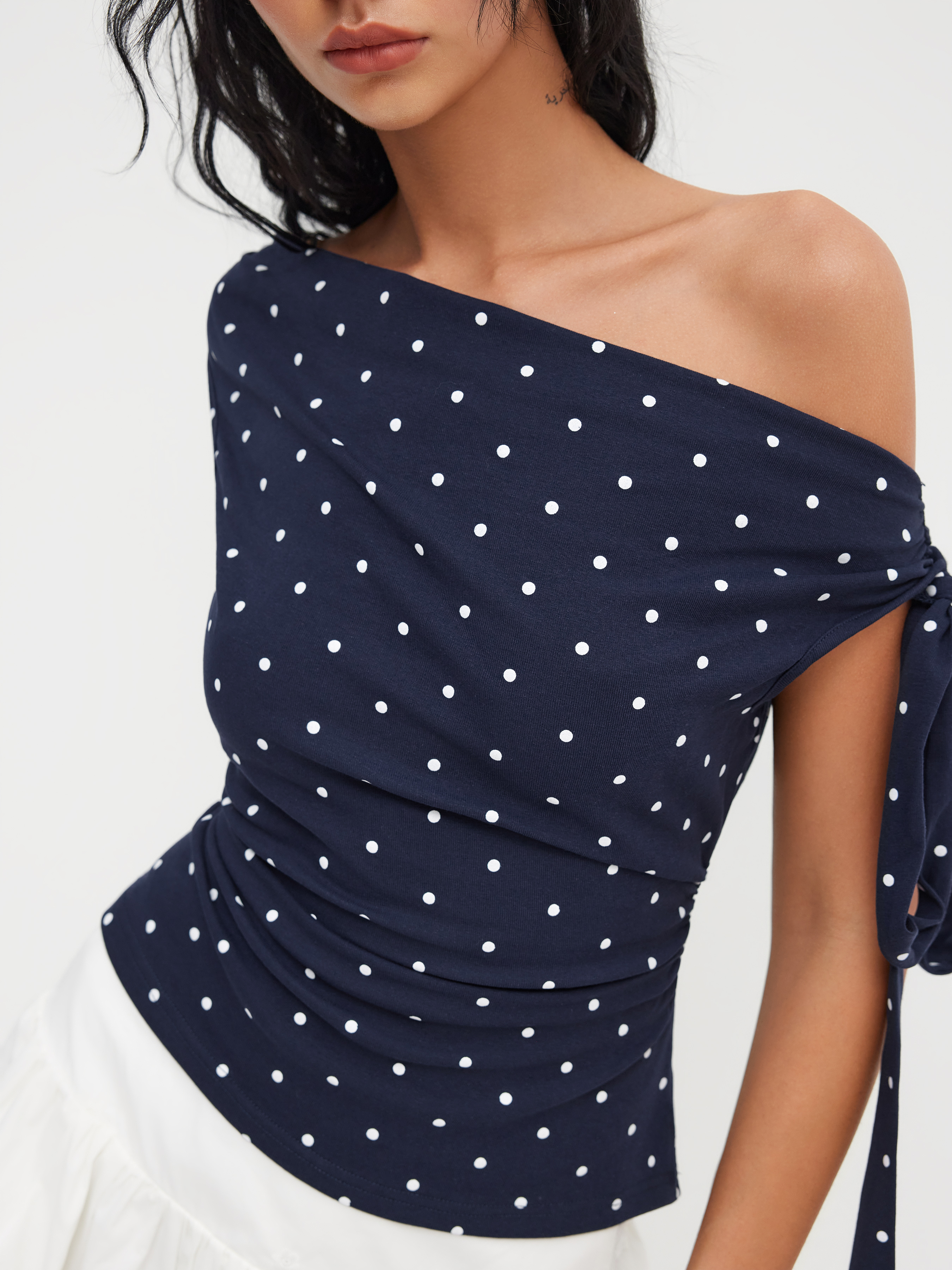 Top asimmetrico in misto cotone con pois arricciato e nodo sul collo