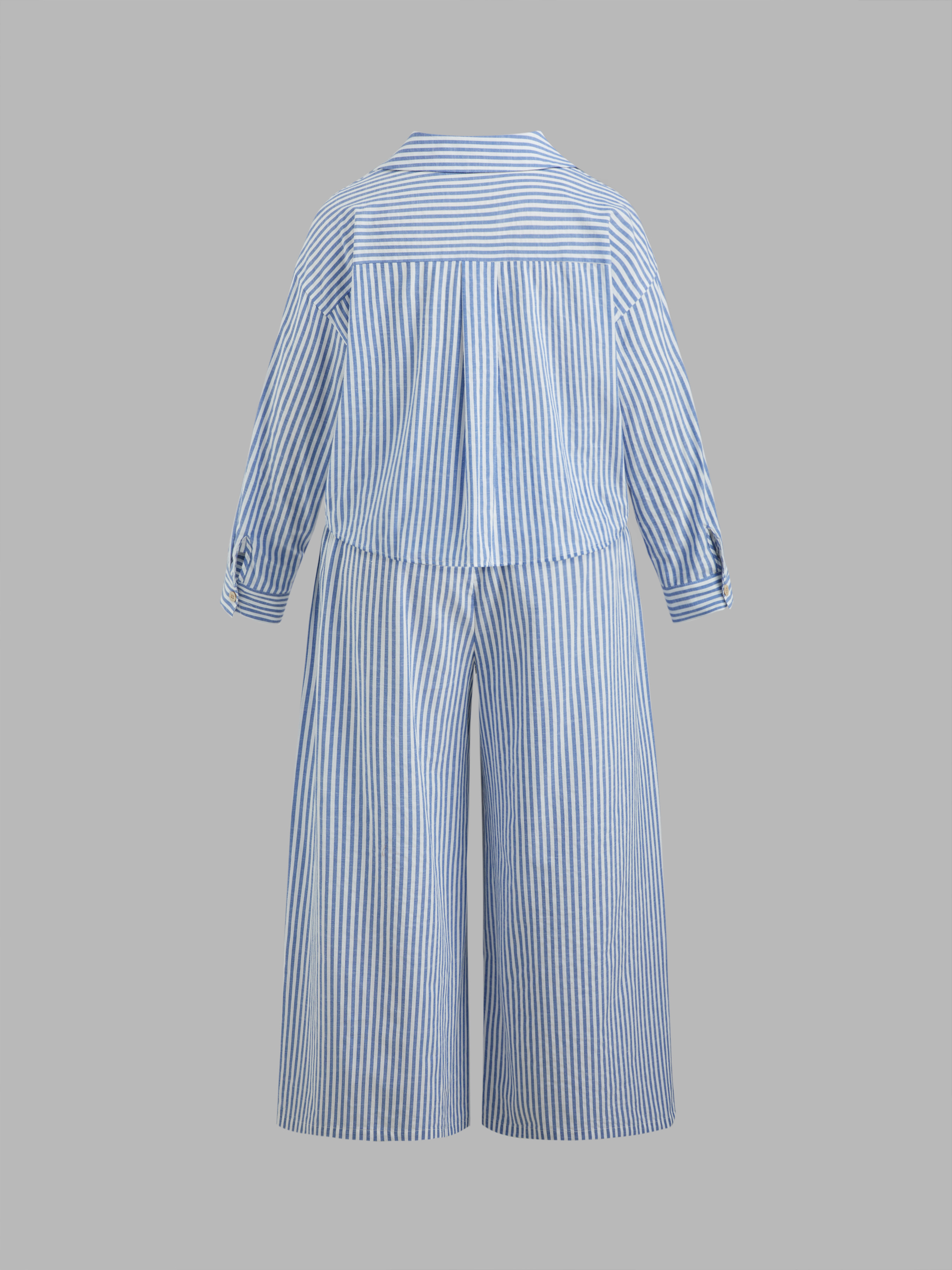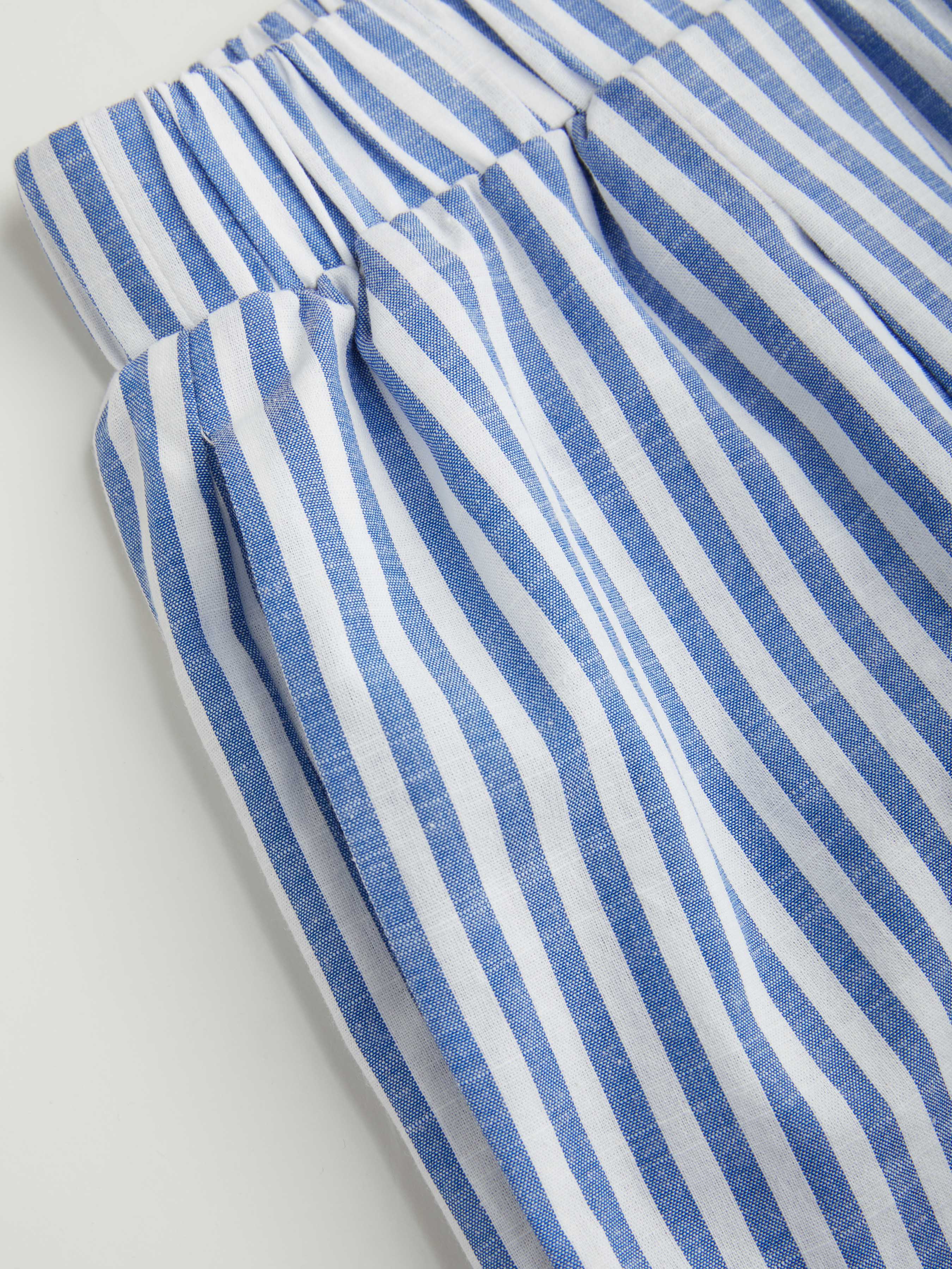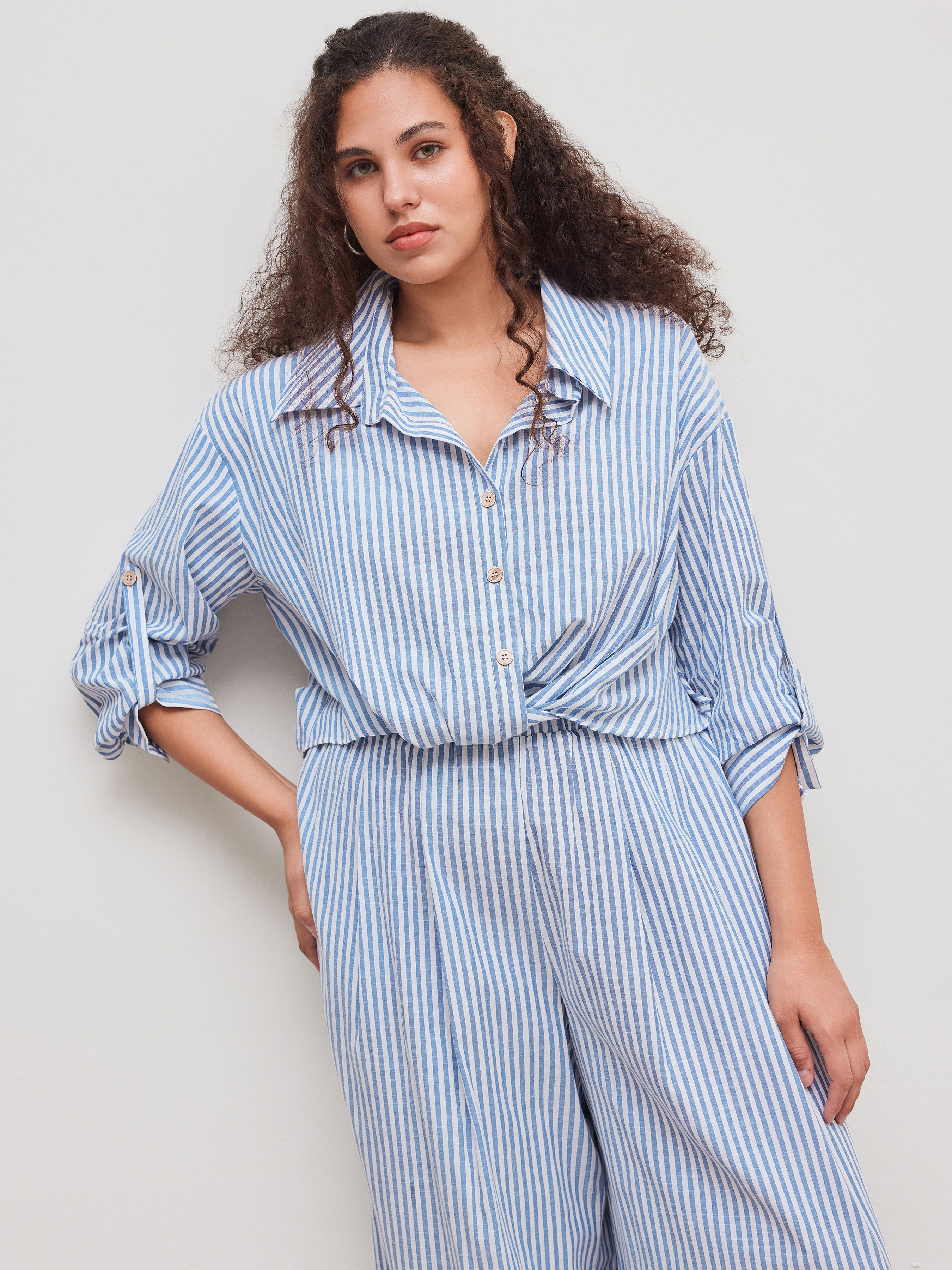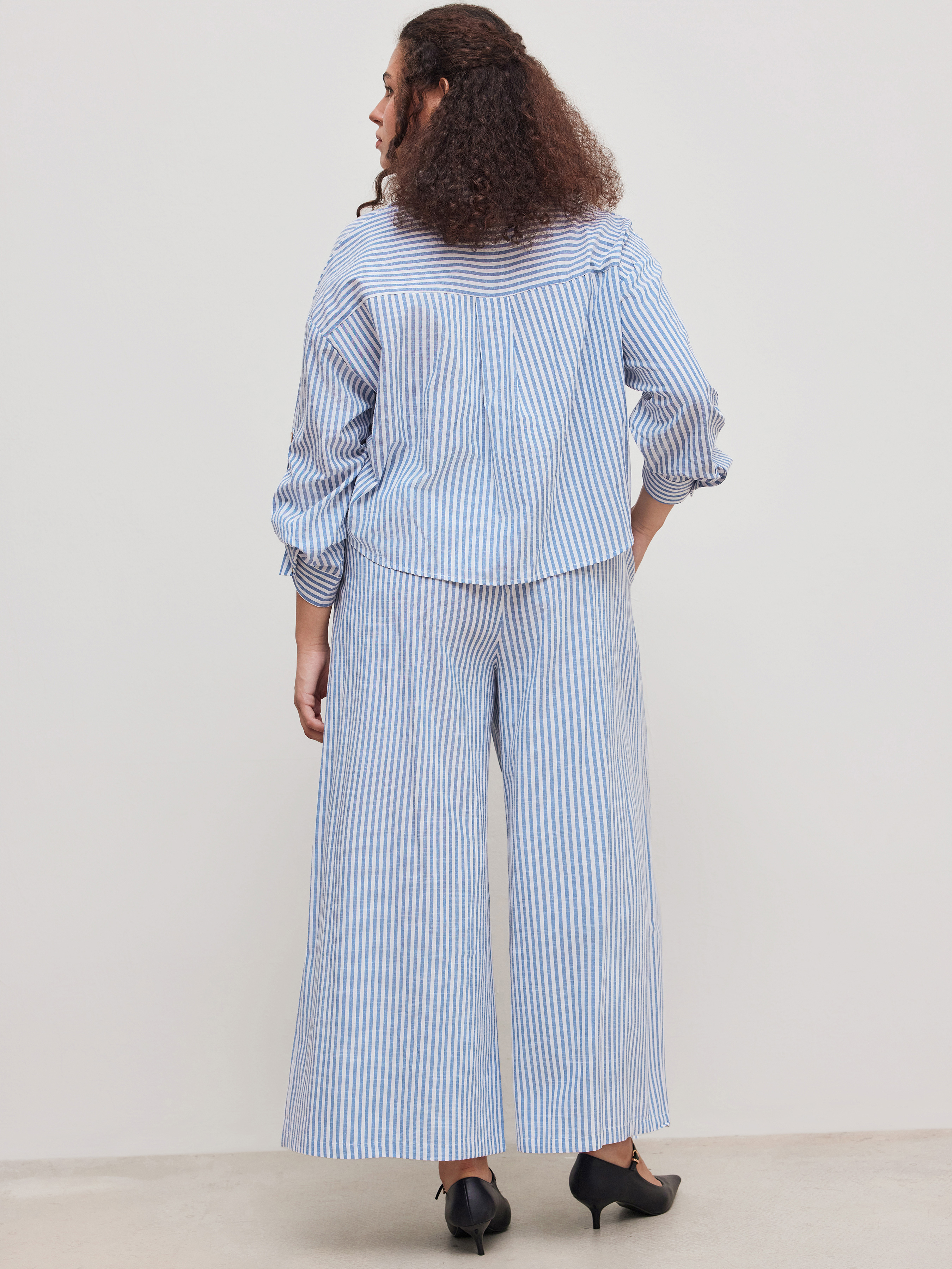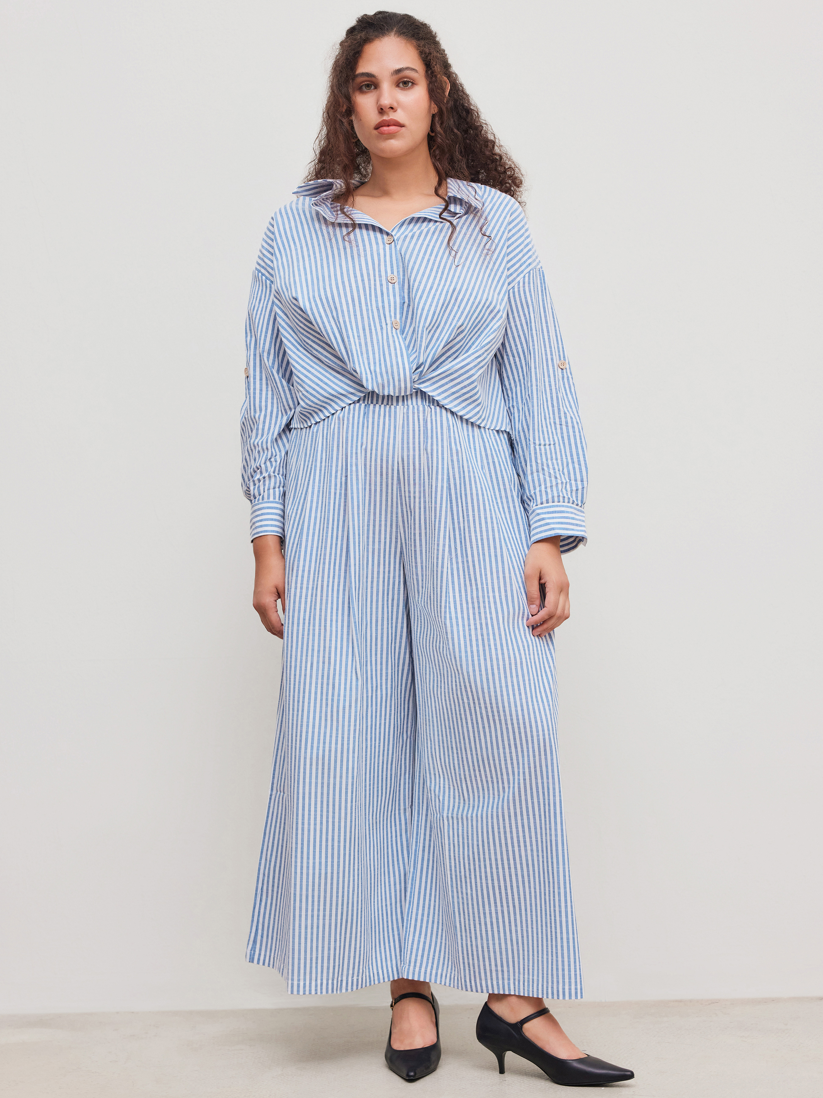 Camicia a maniche lunghe con colletto a righe e bottoni in misto cotone e pantaloni a gamba larga a righe a vita media Set Curve & Plus