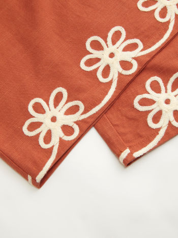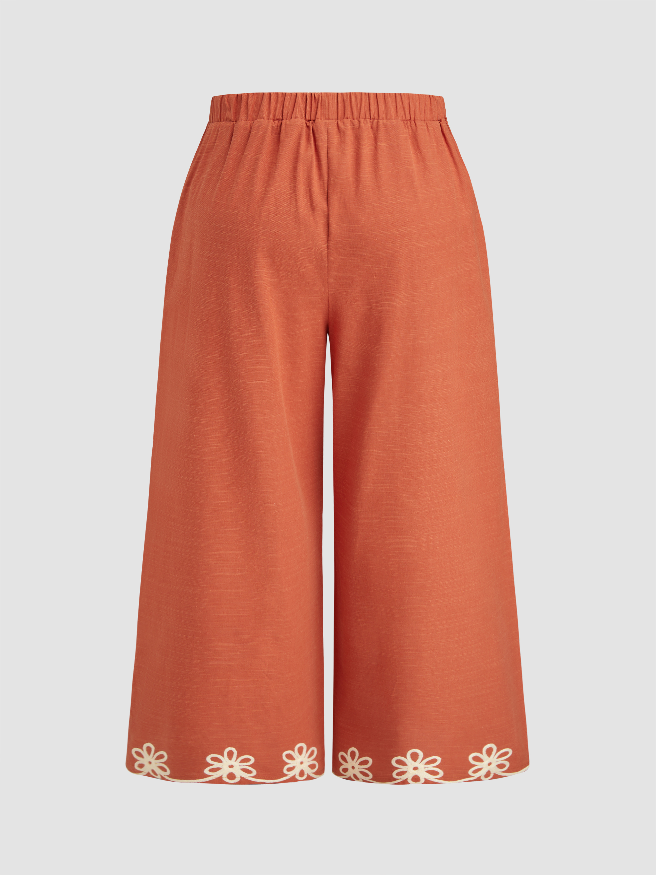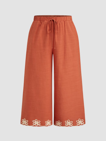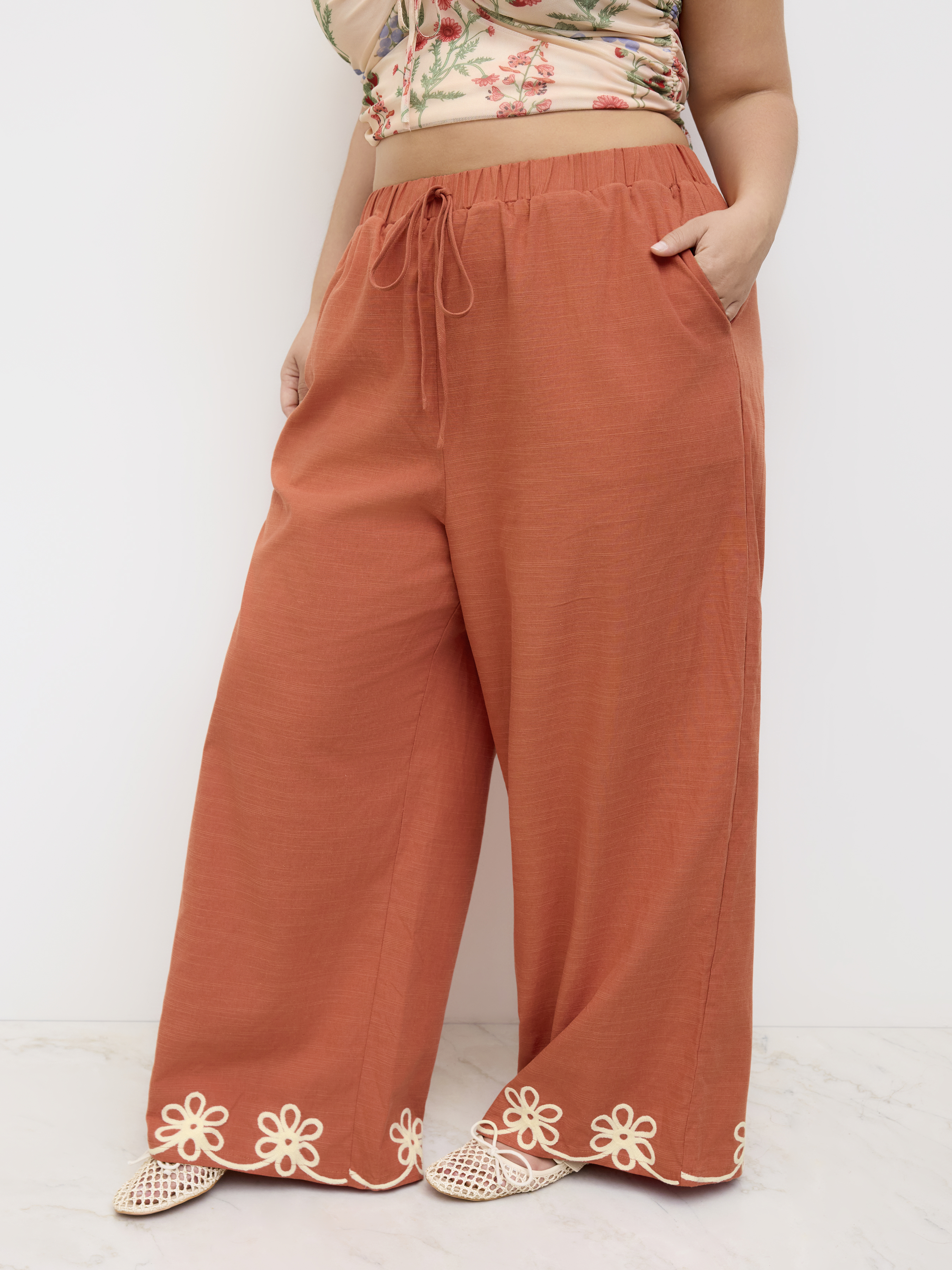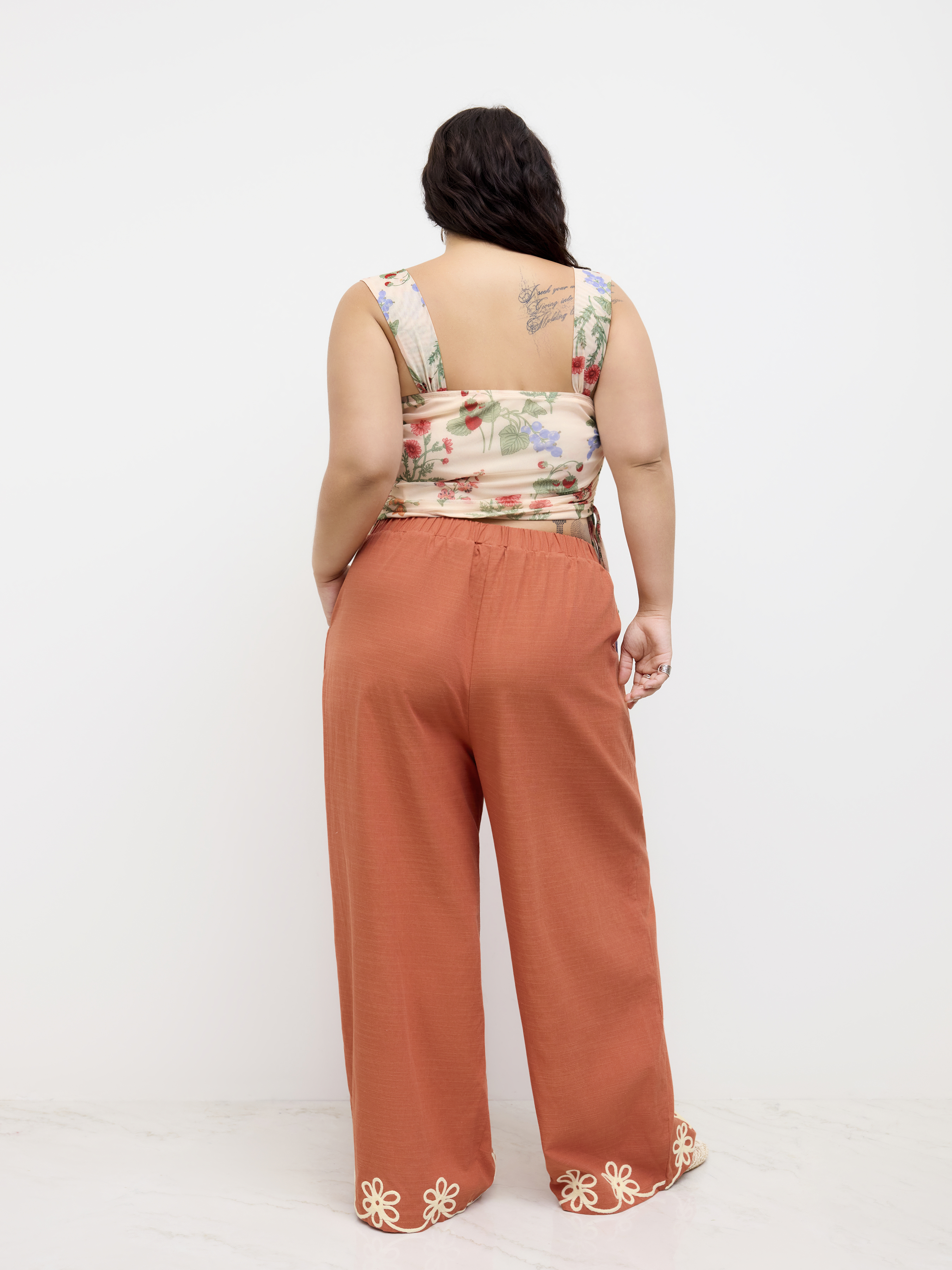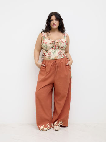 Pantaloni ampi a gamba larga con elastico in vita a fiori a vita media in misto cotone Curve & Plus