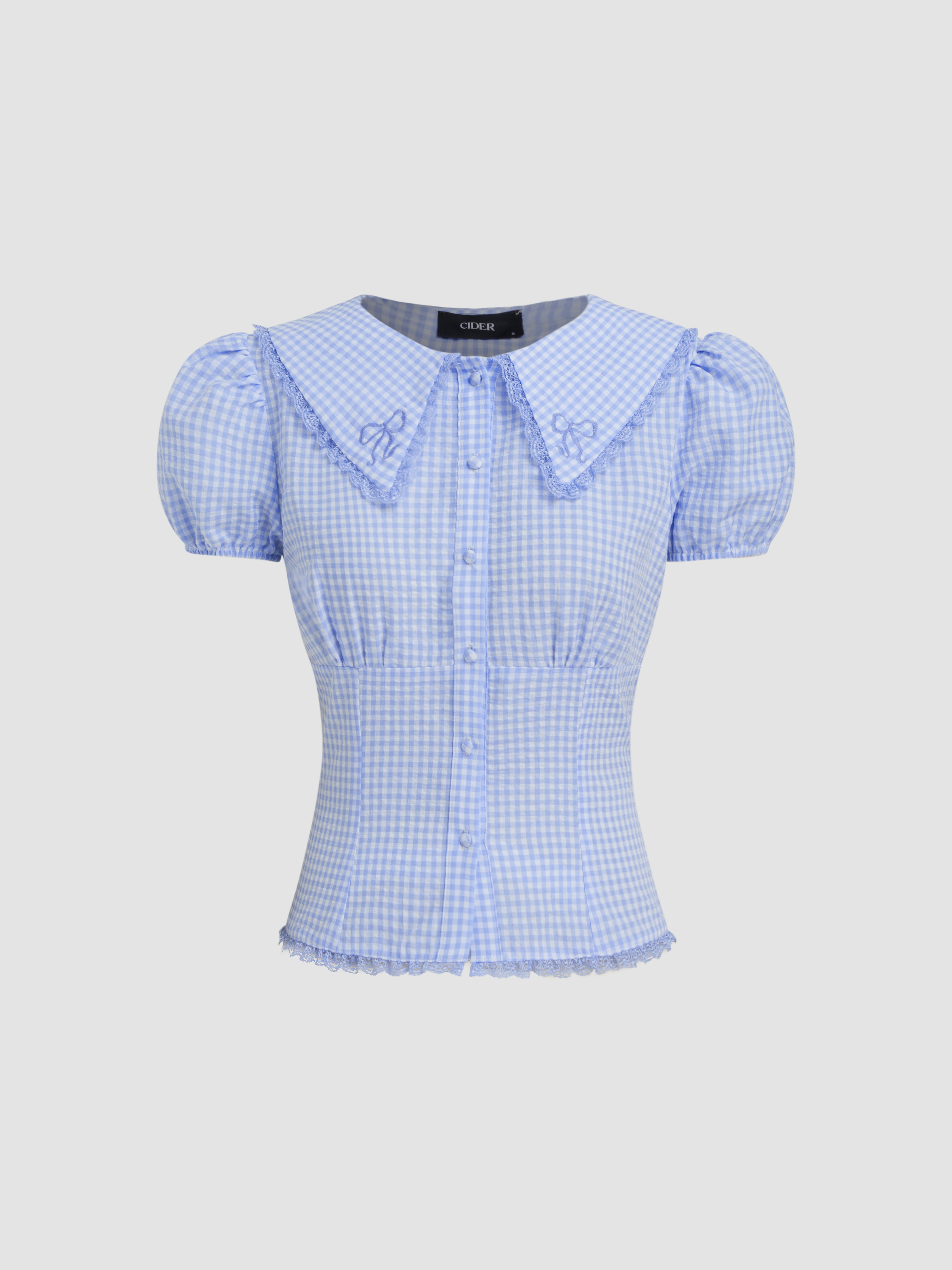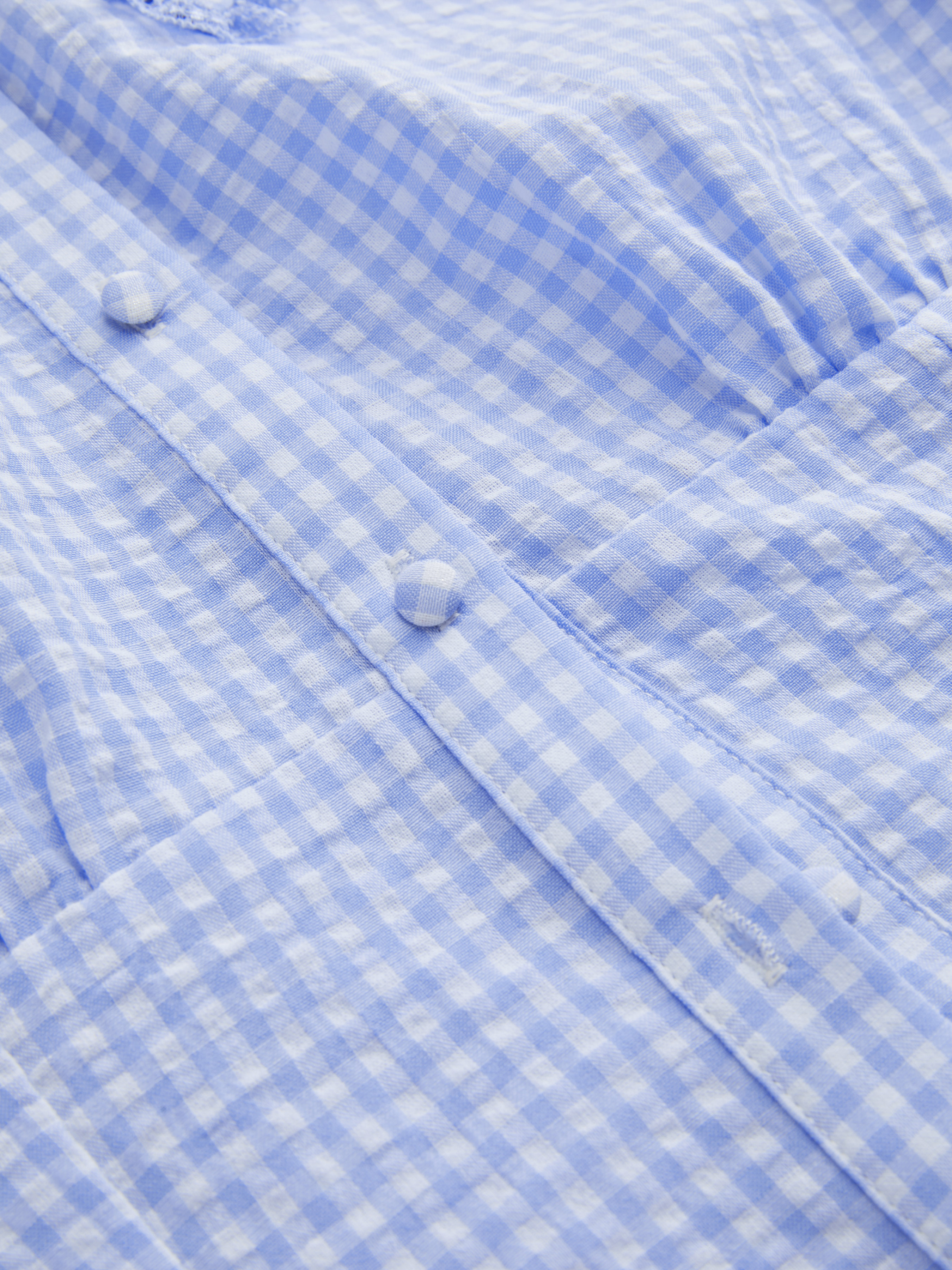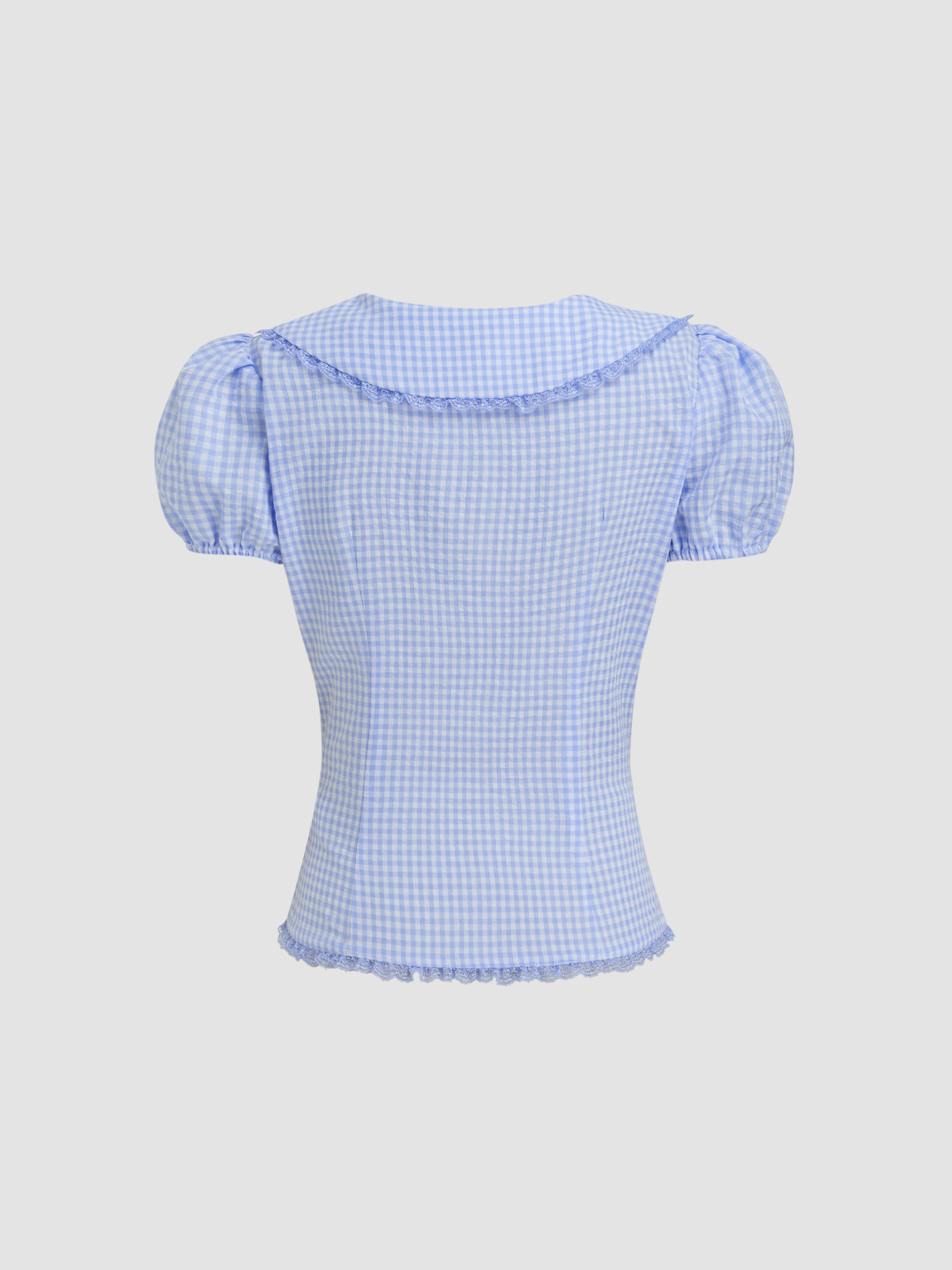 Camicette a maniche a sbuffo con colletto Peter Pan in misto cotone, motivo gingham e finiture in pizzo