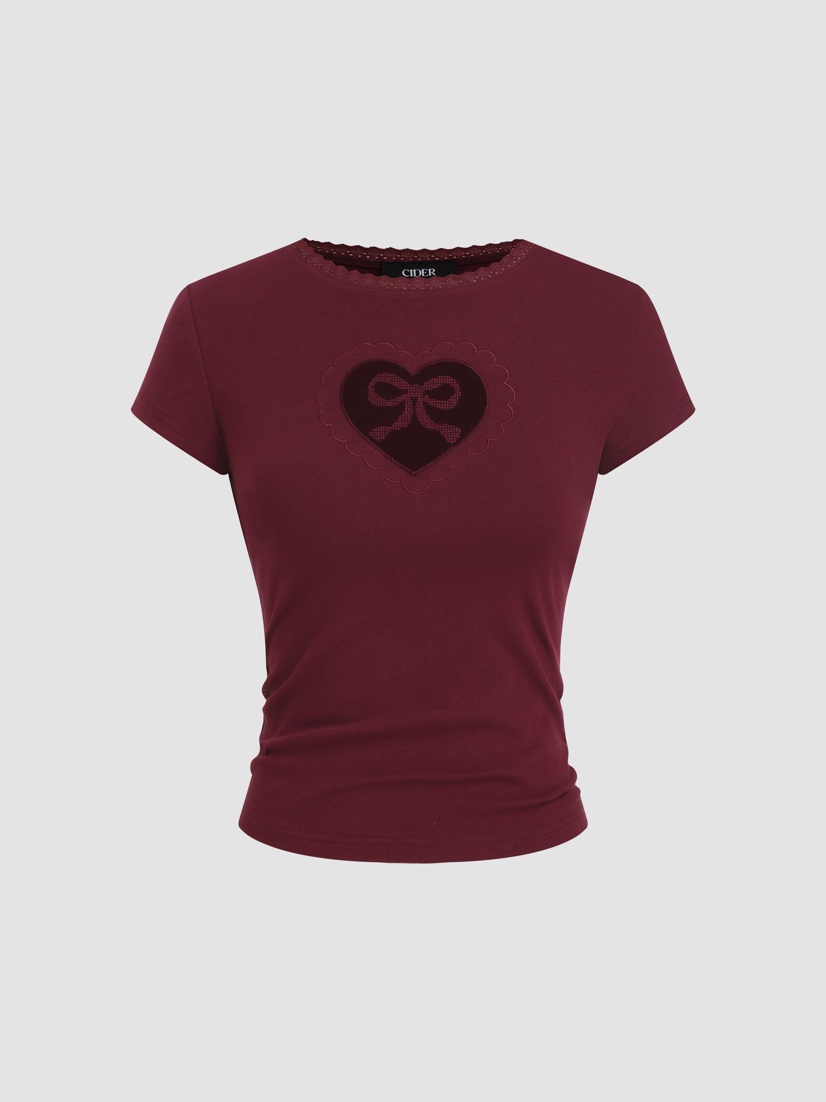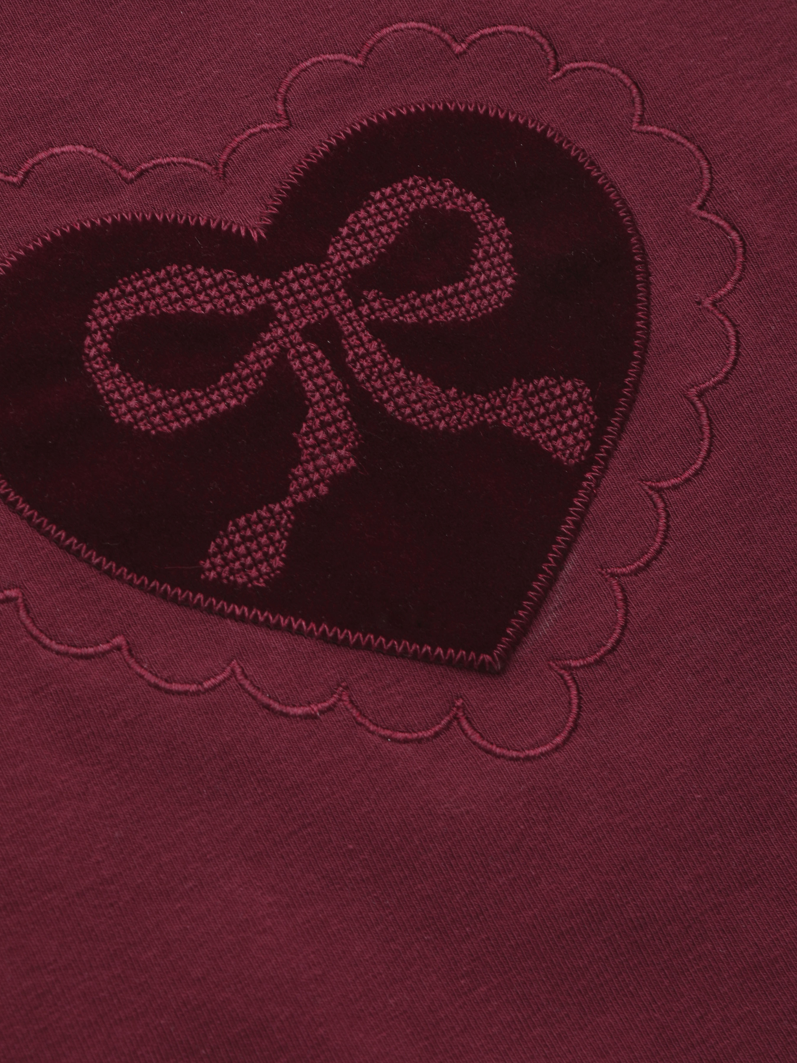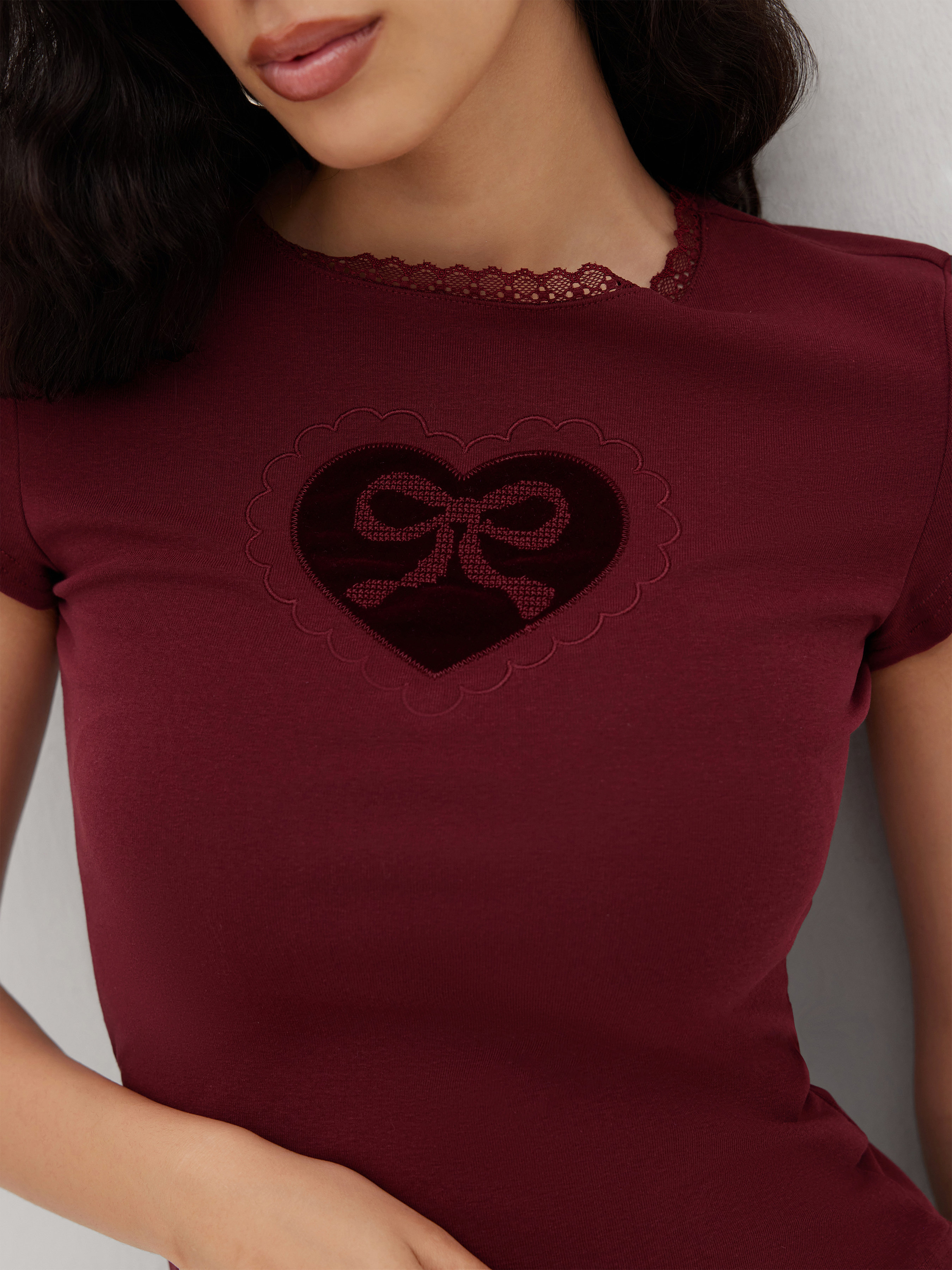 Tee in misto cotone con fiocco e cuore in pizzo con increspatura