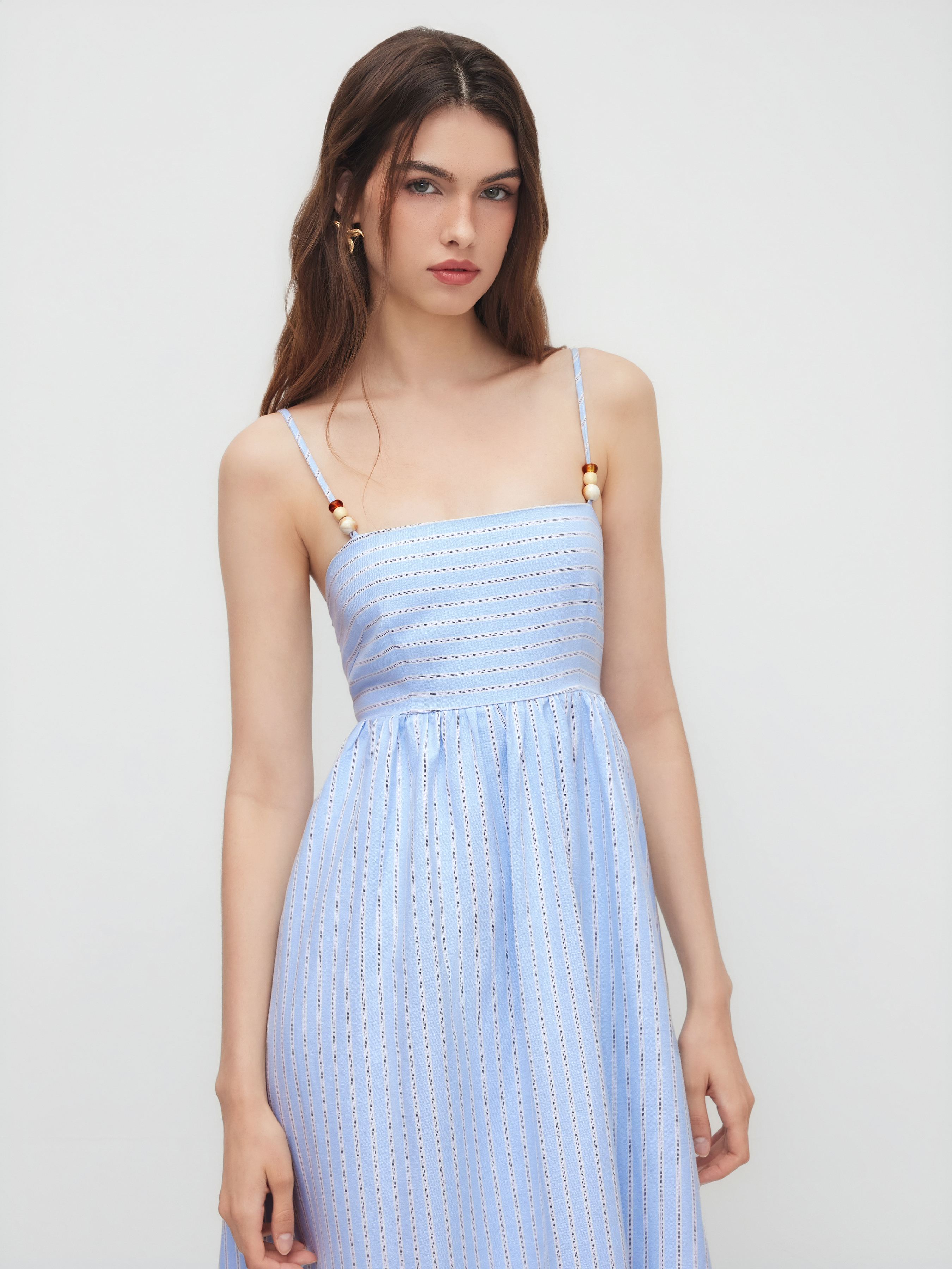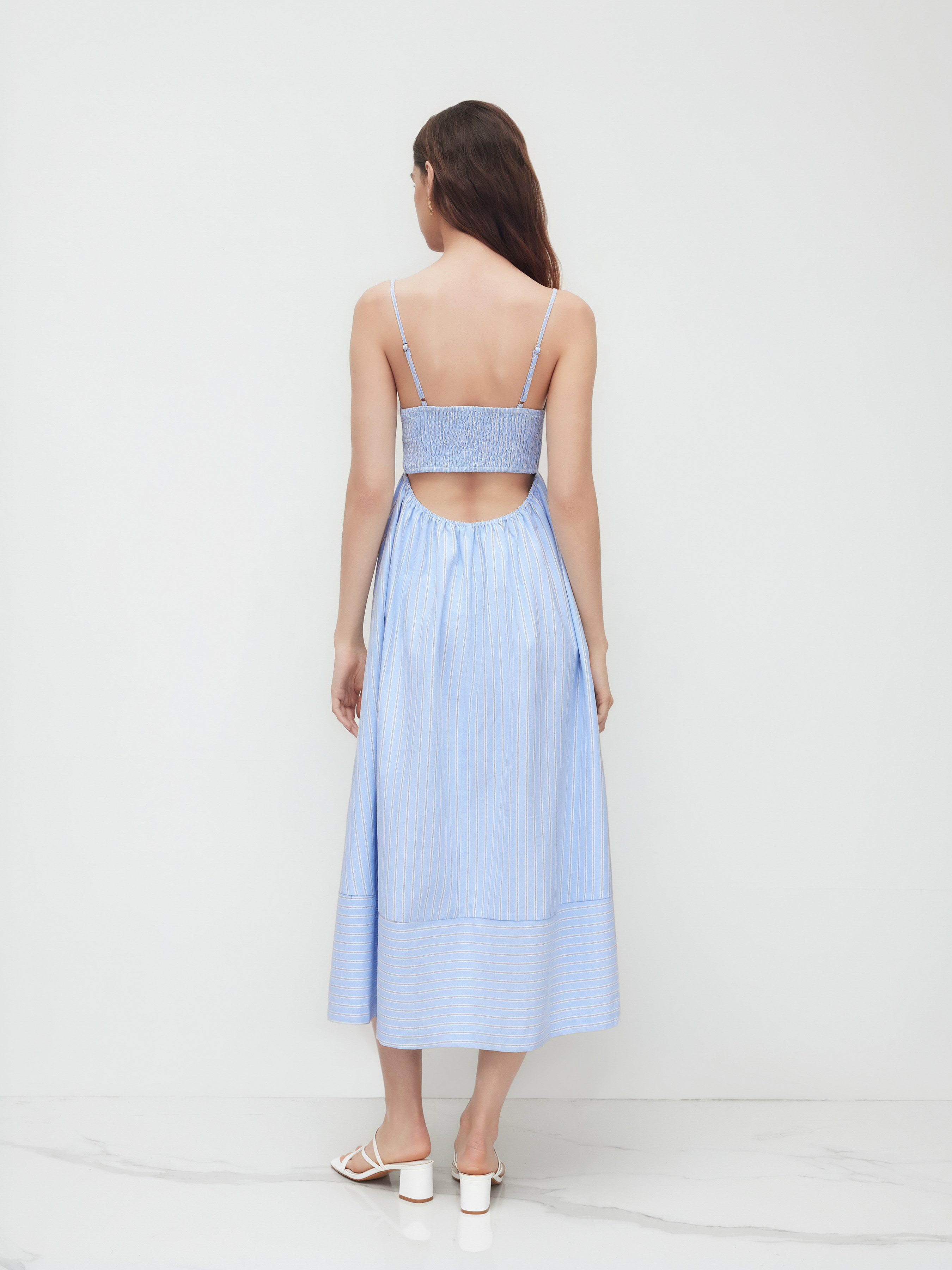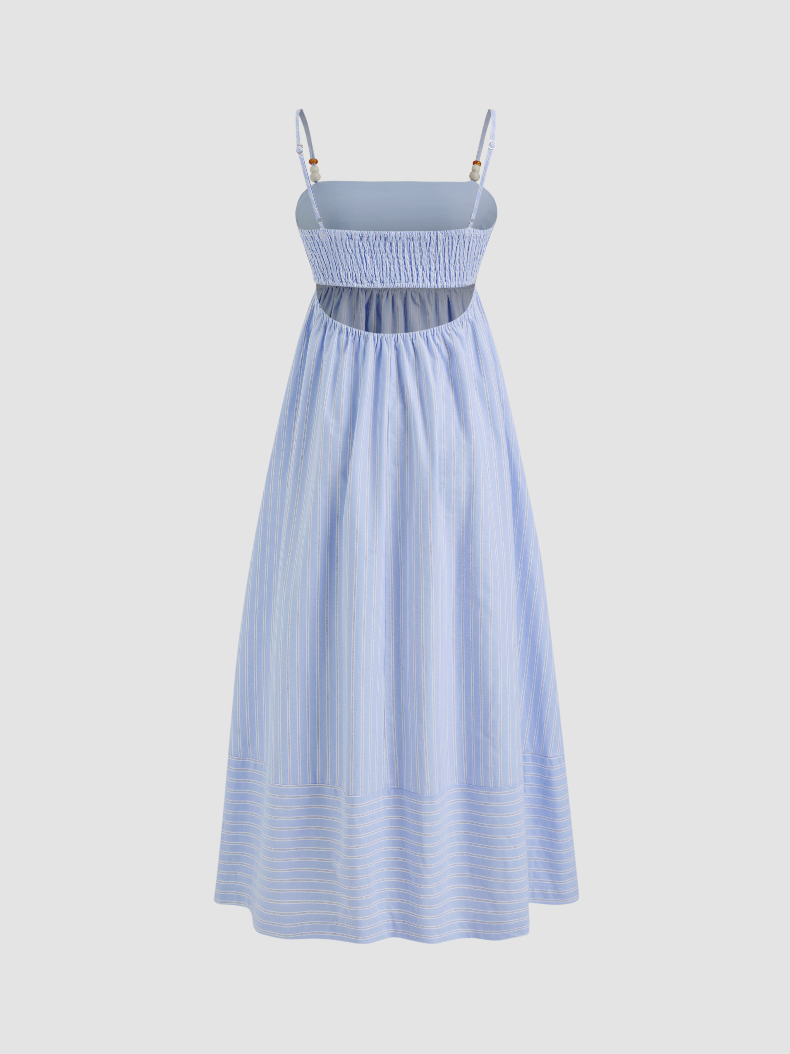 Abito Maxi a Righe con Arricciature, Perline e Cut-Out in Misto Cotone