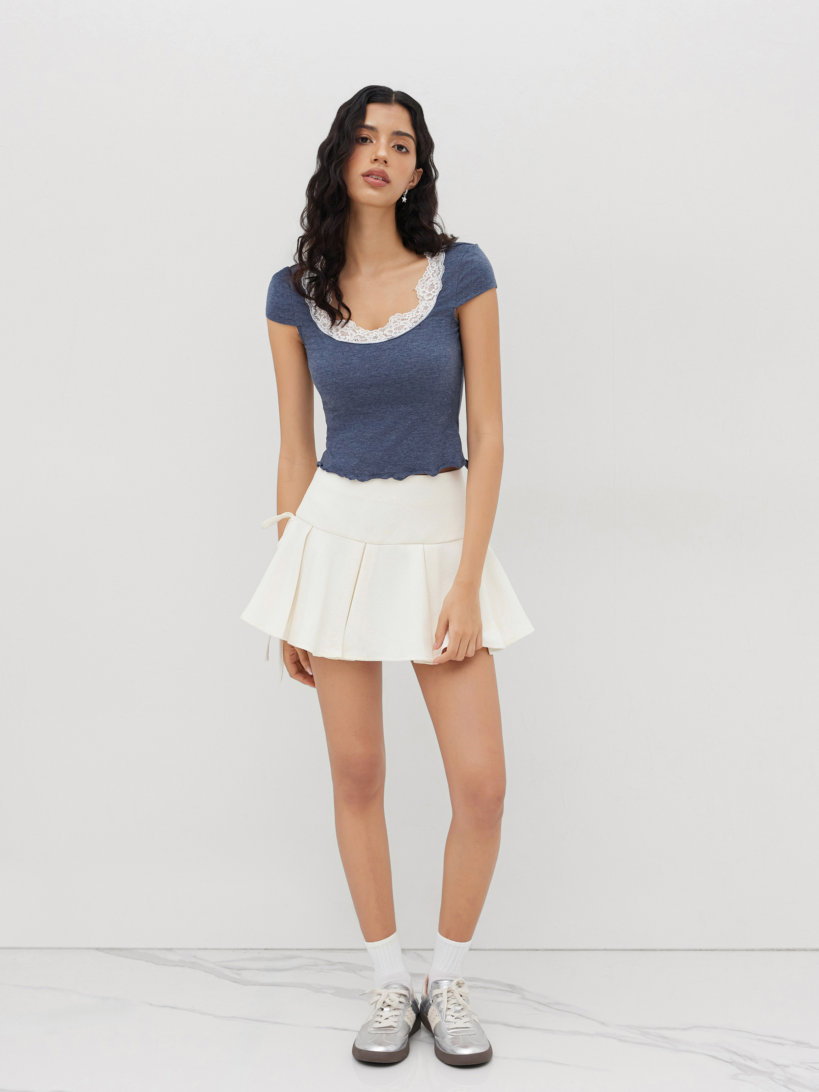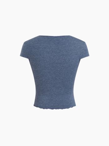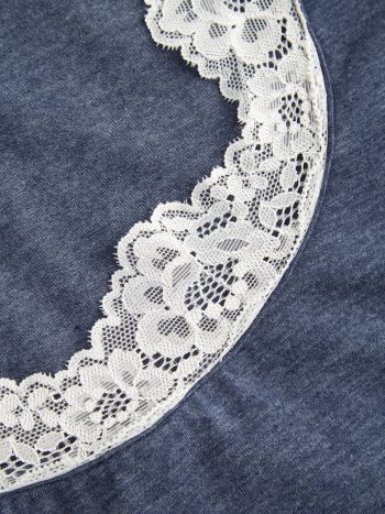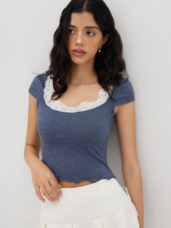 Maglietta in misto cotone con scollo a U e finiture in pizzo a lattuga