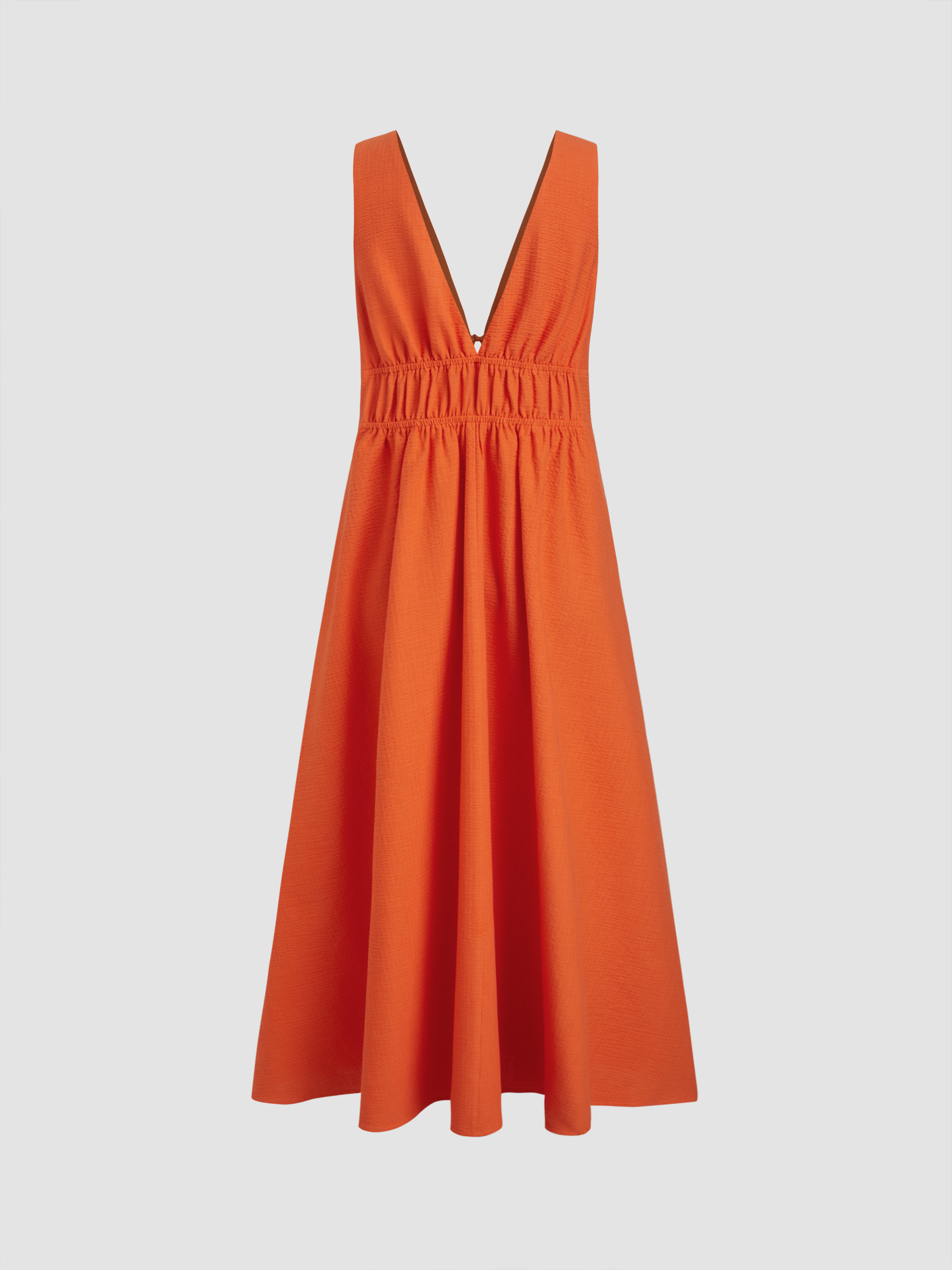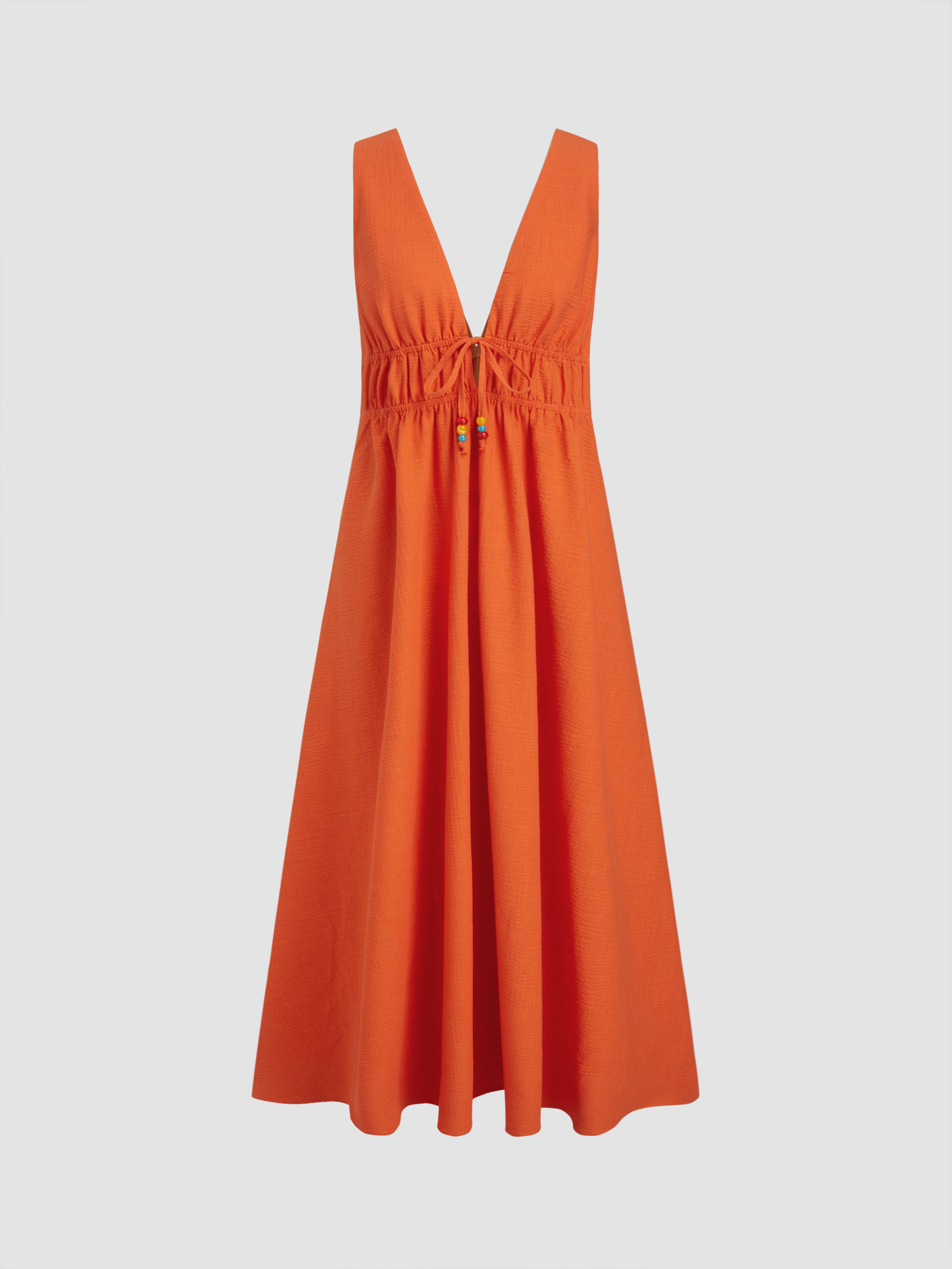 Abito lungo con volant arricciato e perline con scollo a V in misto cotone