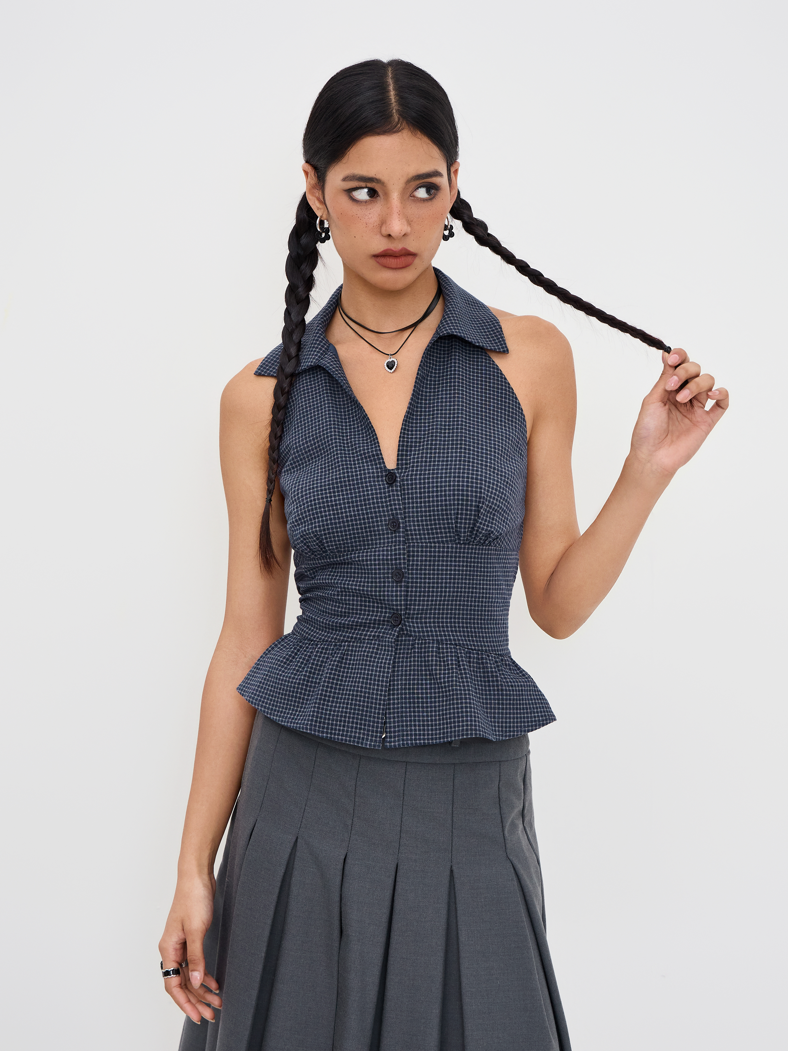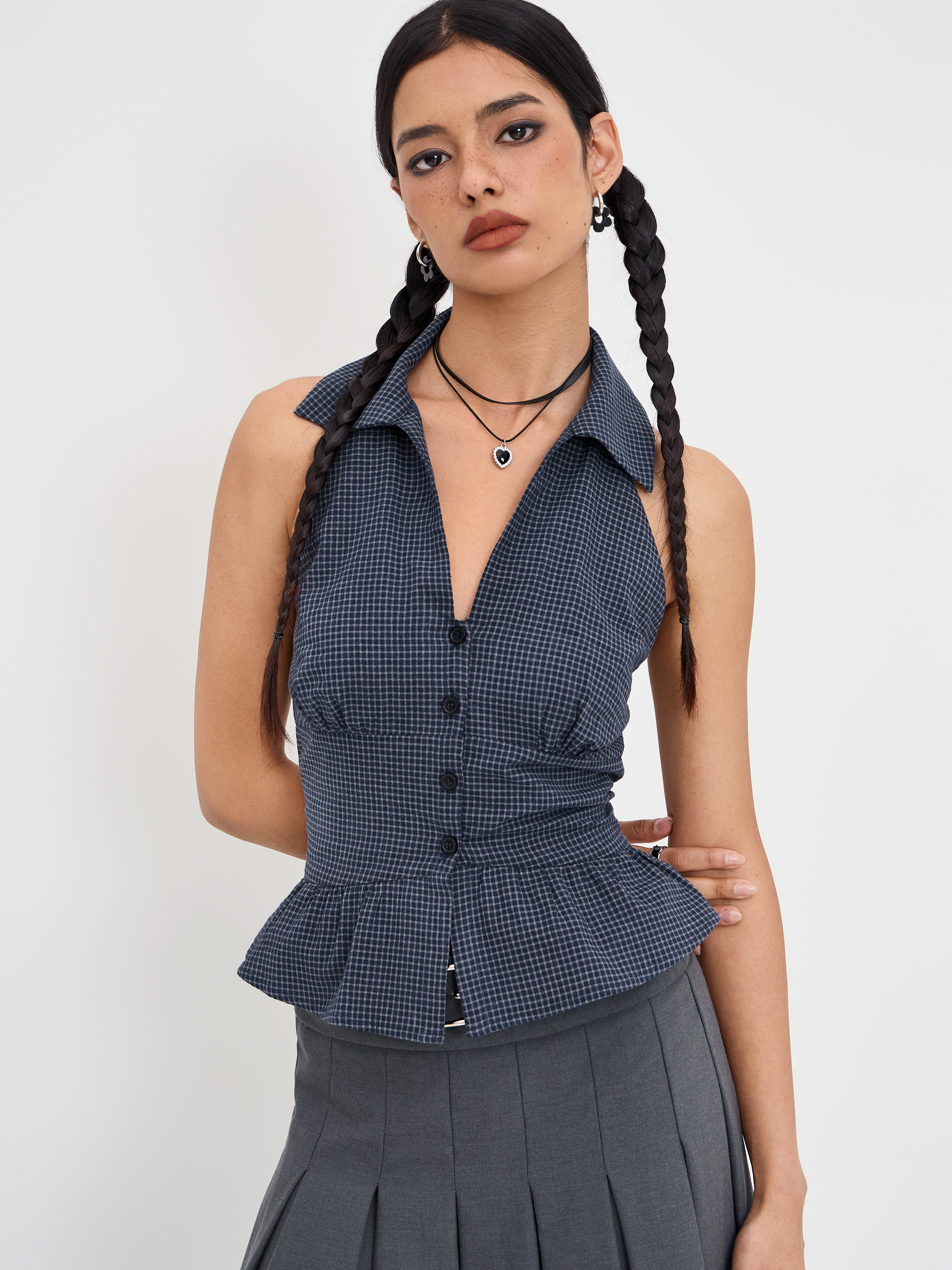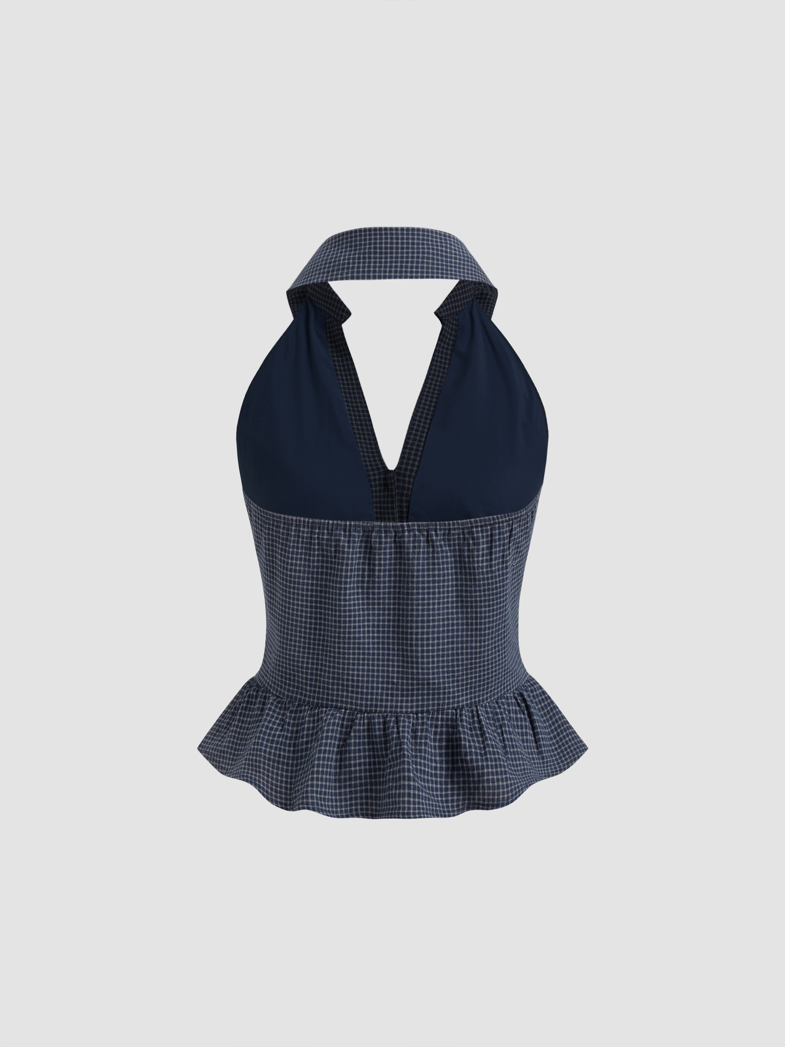 Top senza schienale con scollo a V in cotone a quadri con orlo a volant