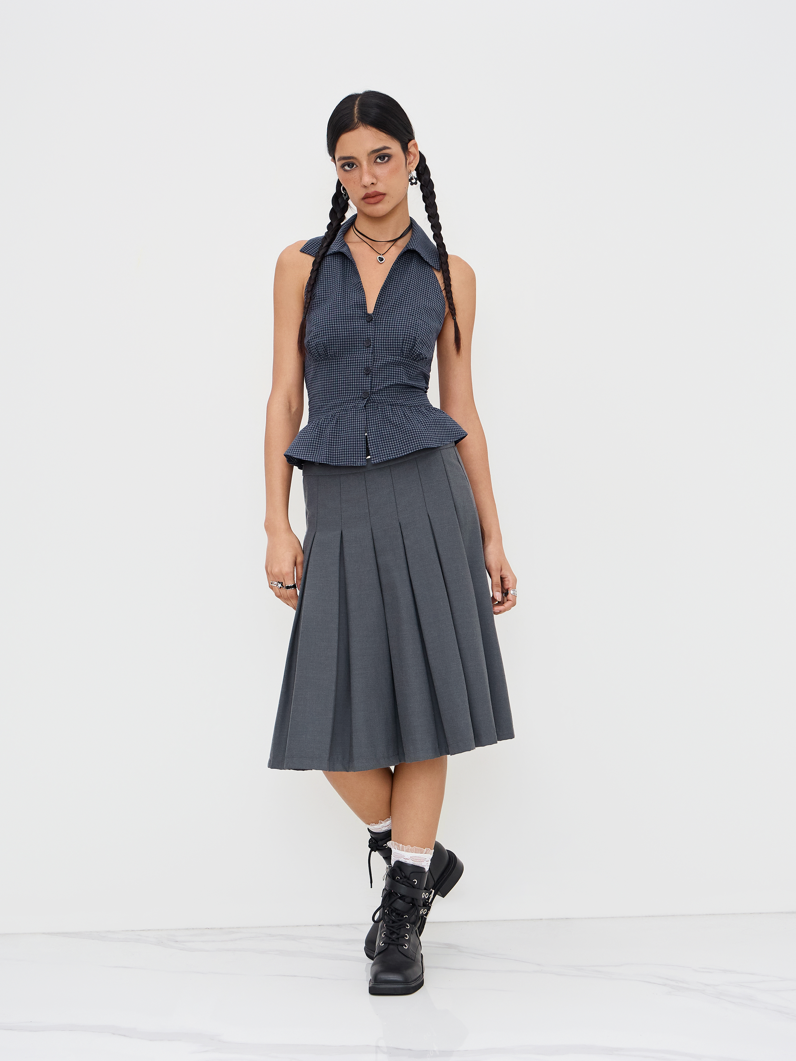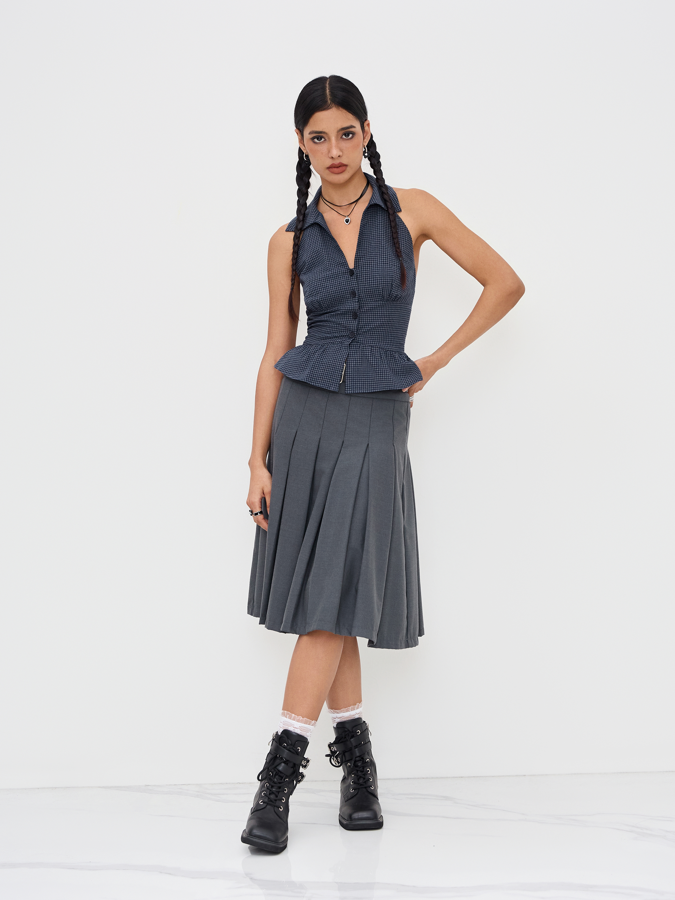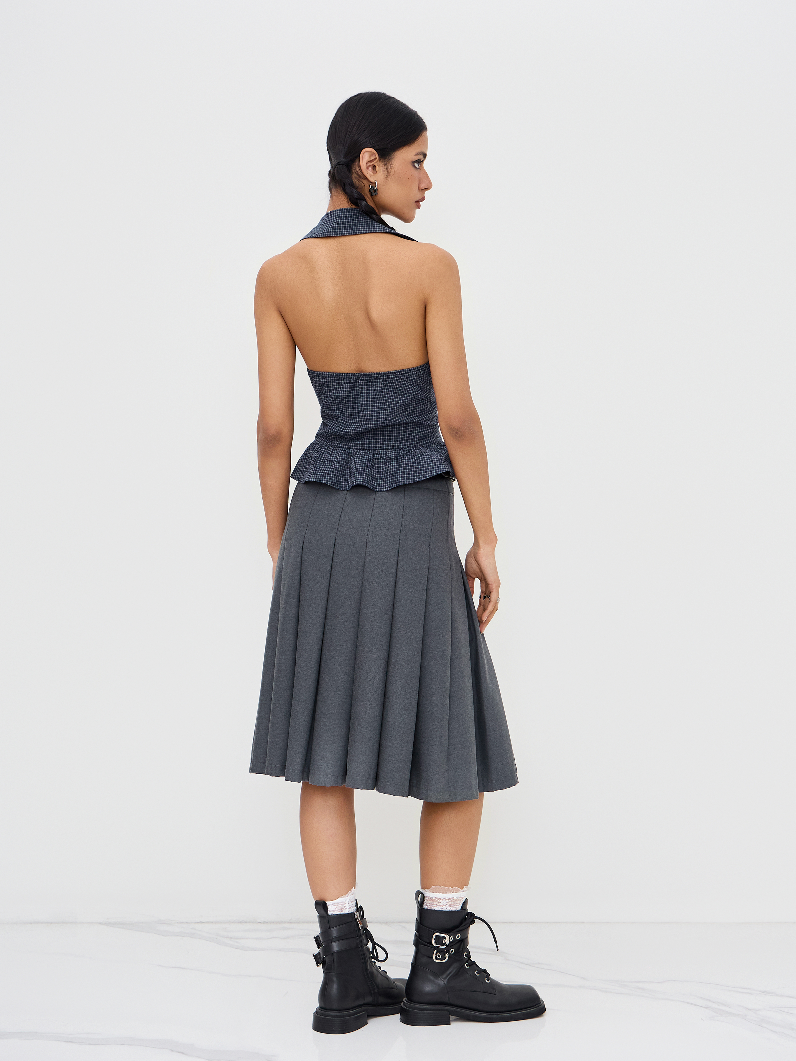 Top senza schienale con scollo a V in cotone a quadri con orlo a volant