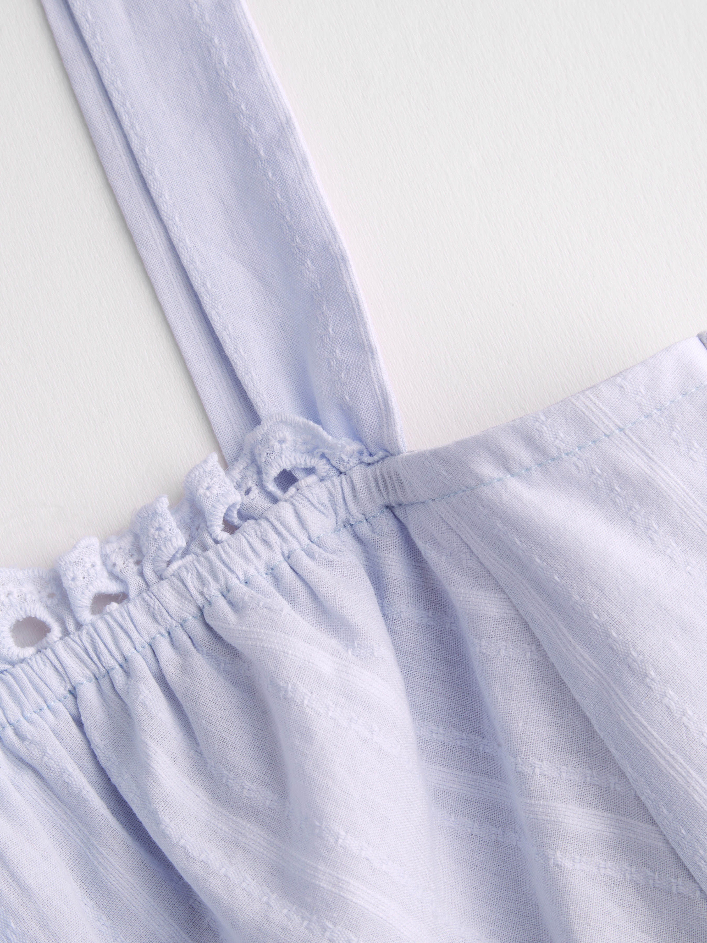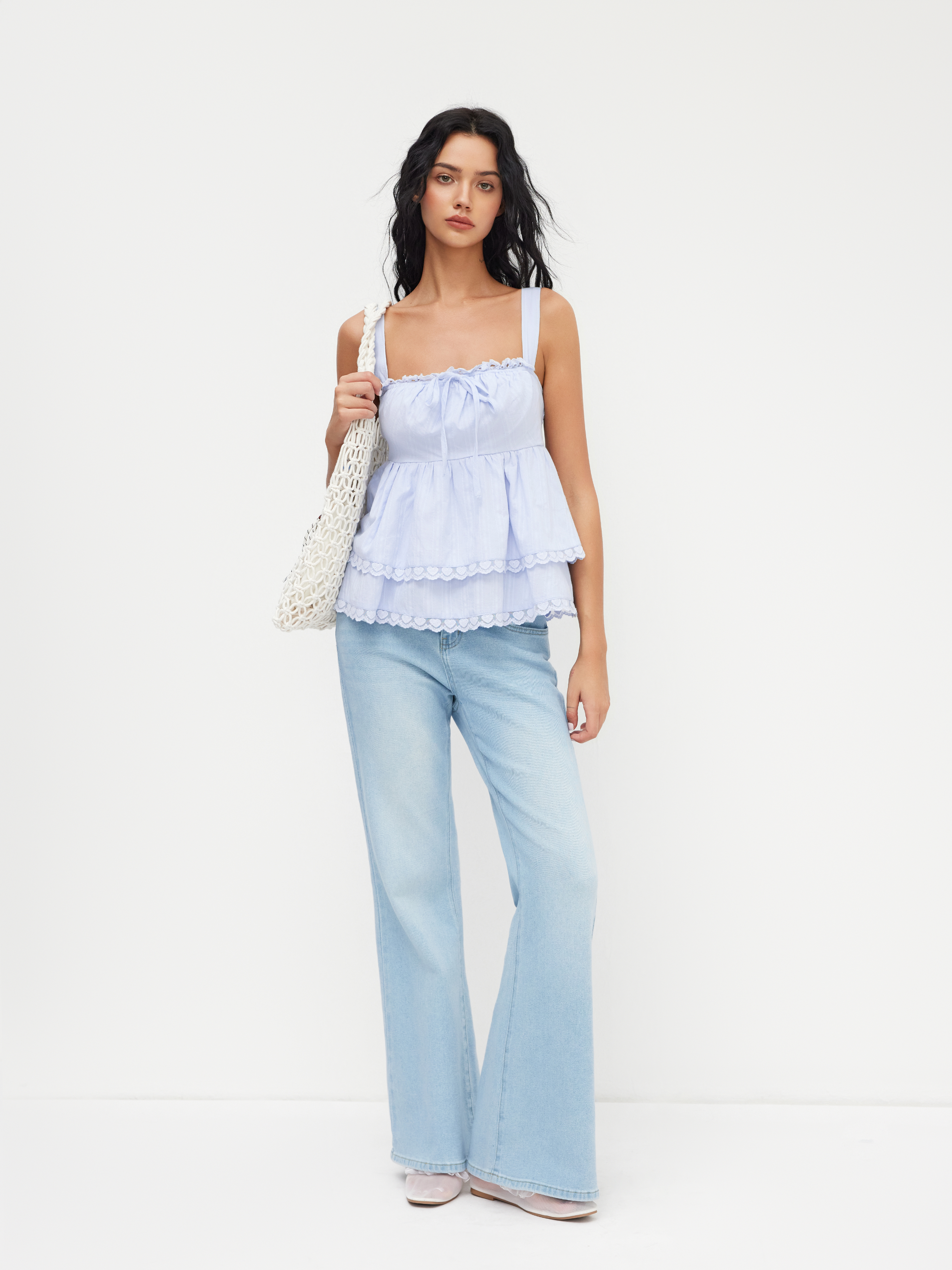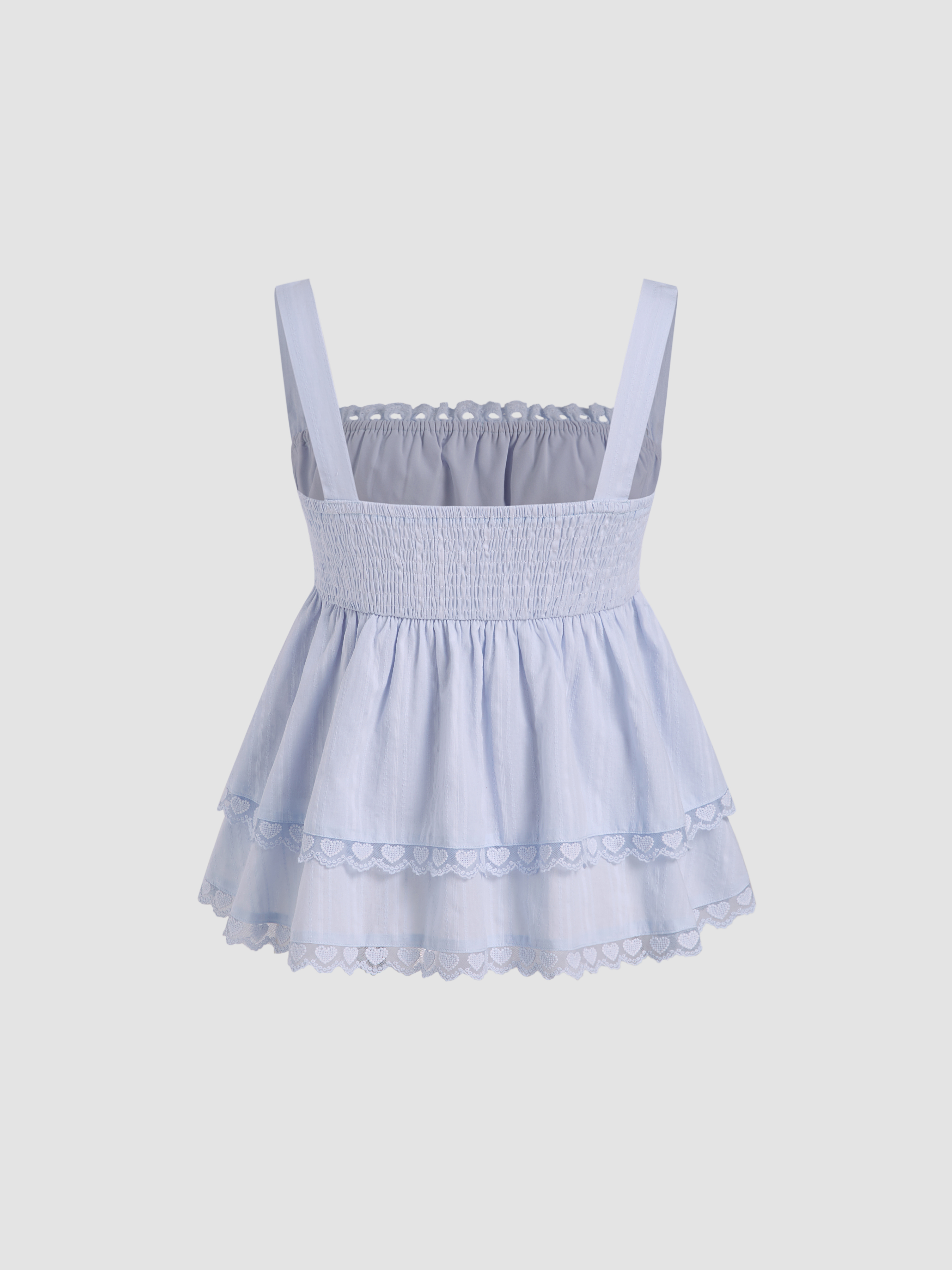 Top Cami in Cotone Annodato con Smock, Ricami, Bordi in Pizzo e Orlo Arricciato con Volant