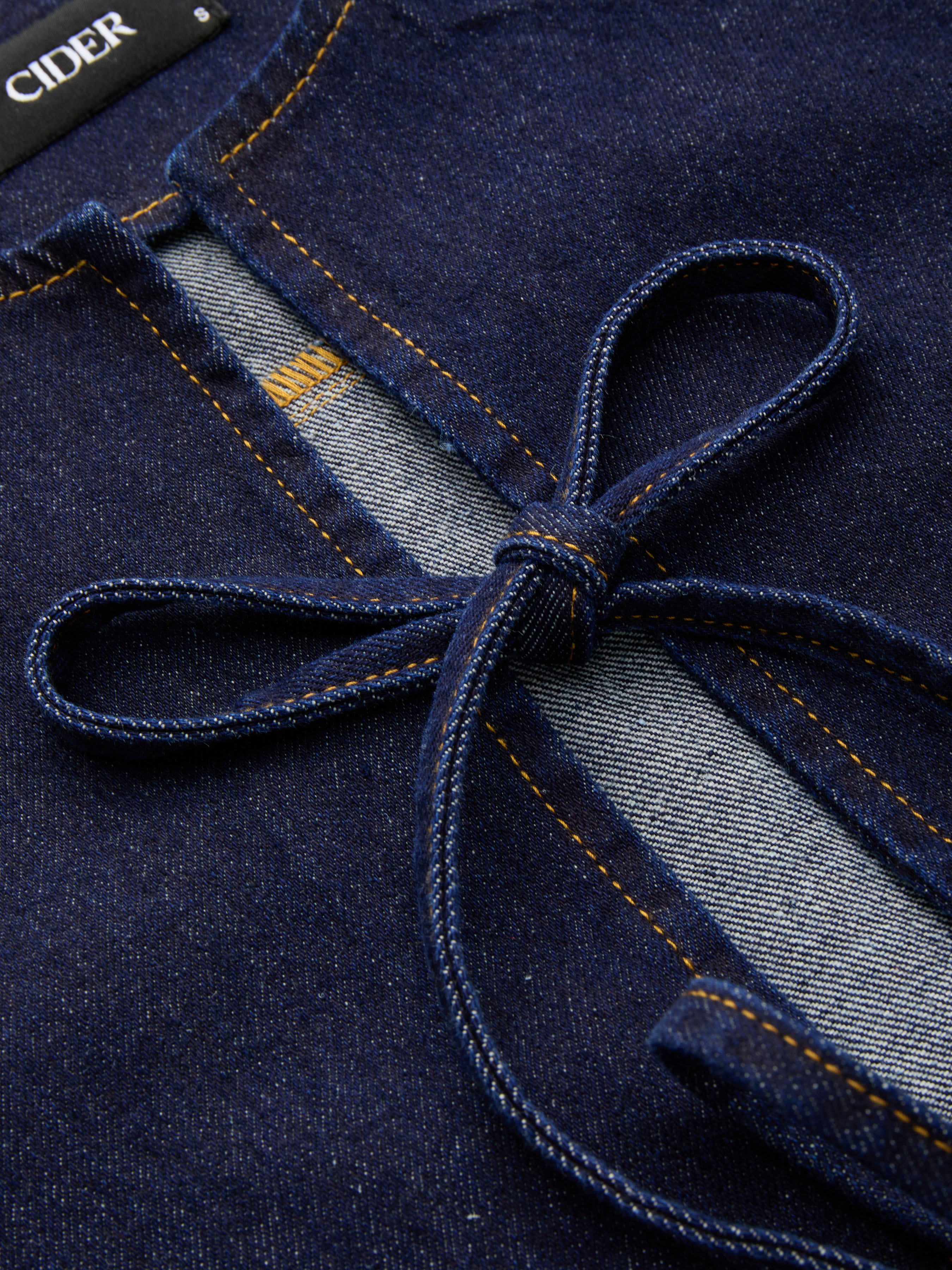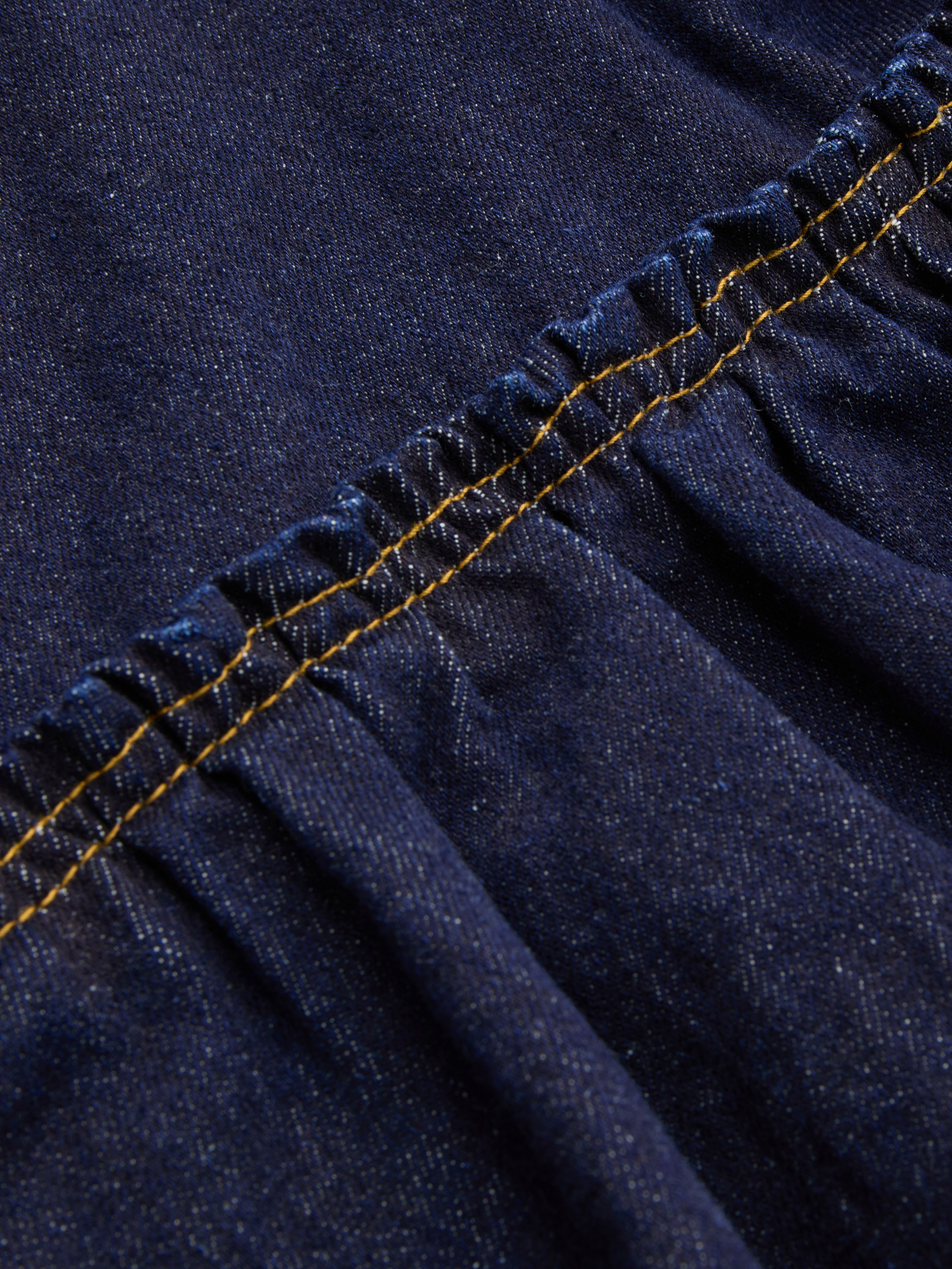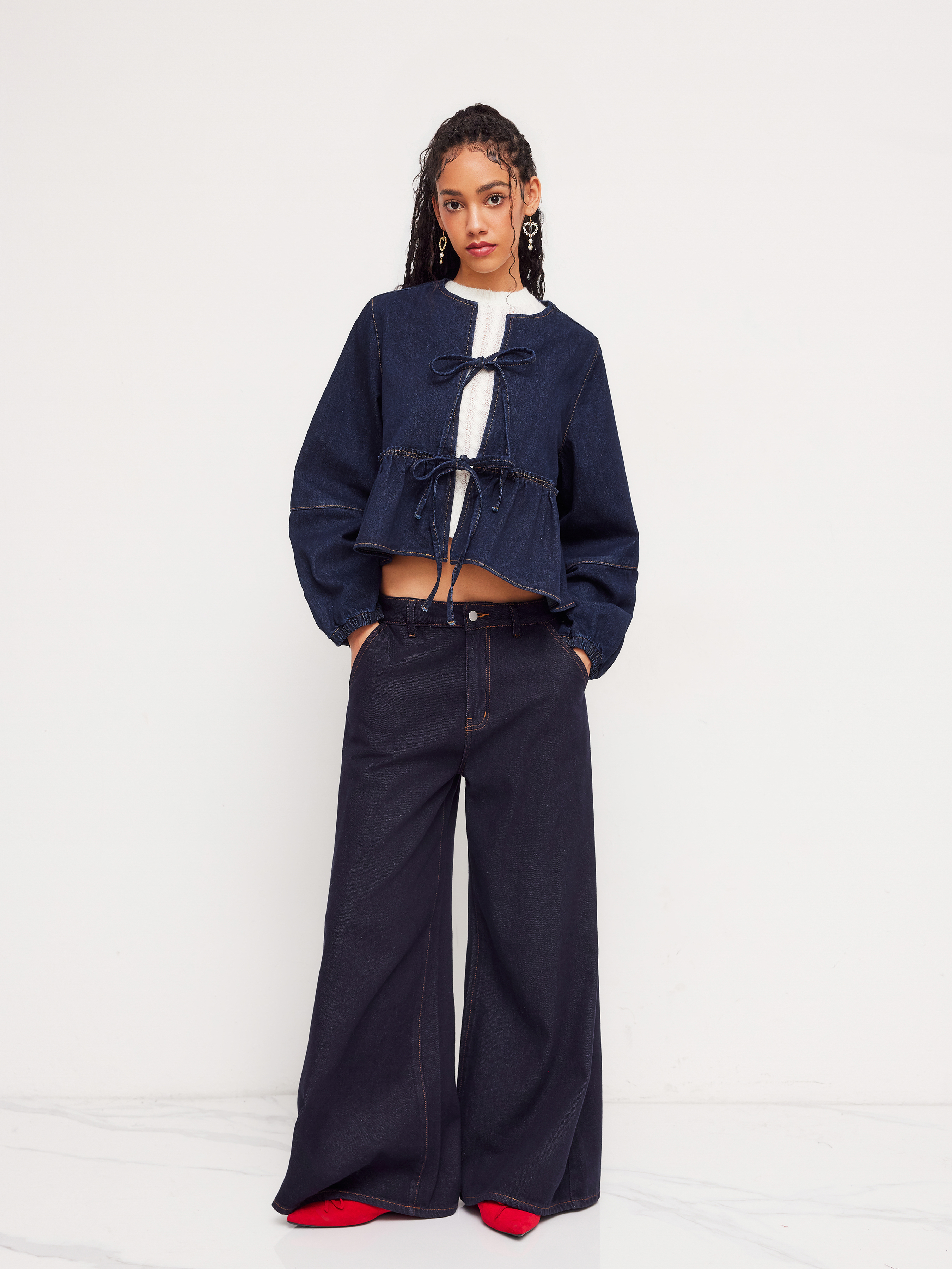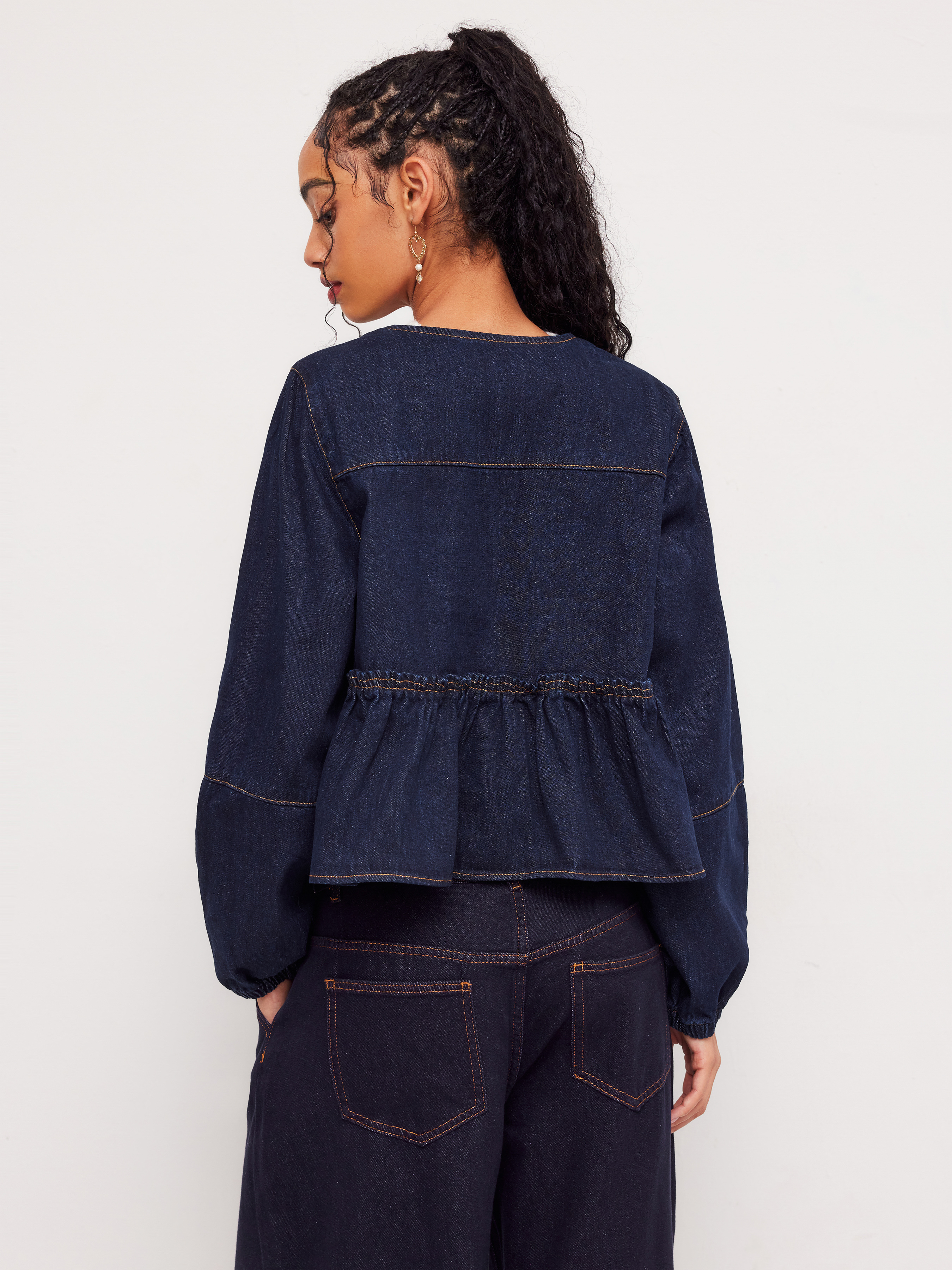 Giacca in denim con scollo rotondo e orlo increspato sul davanti