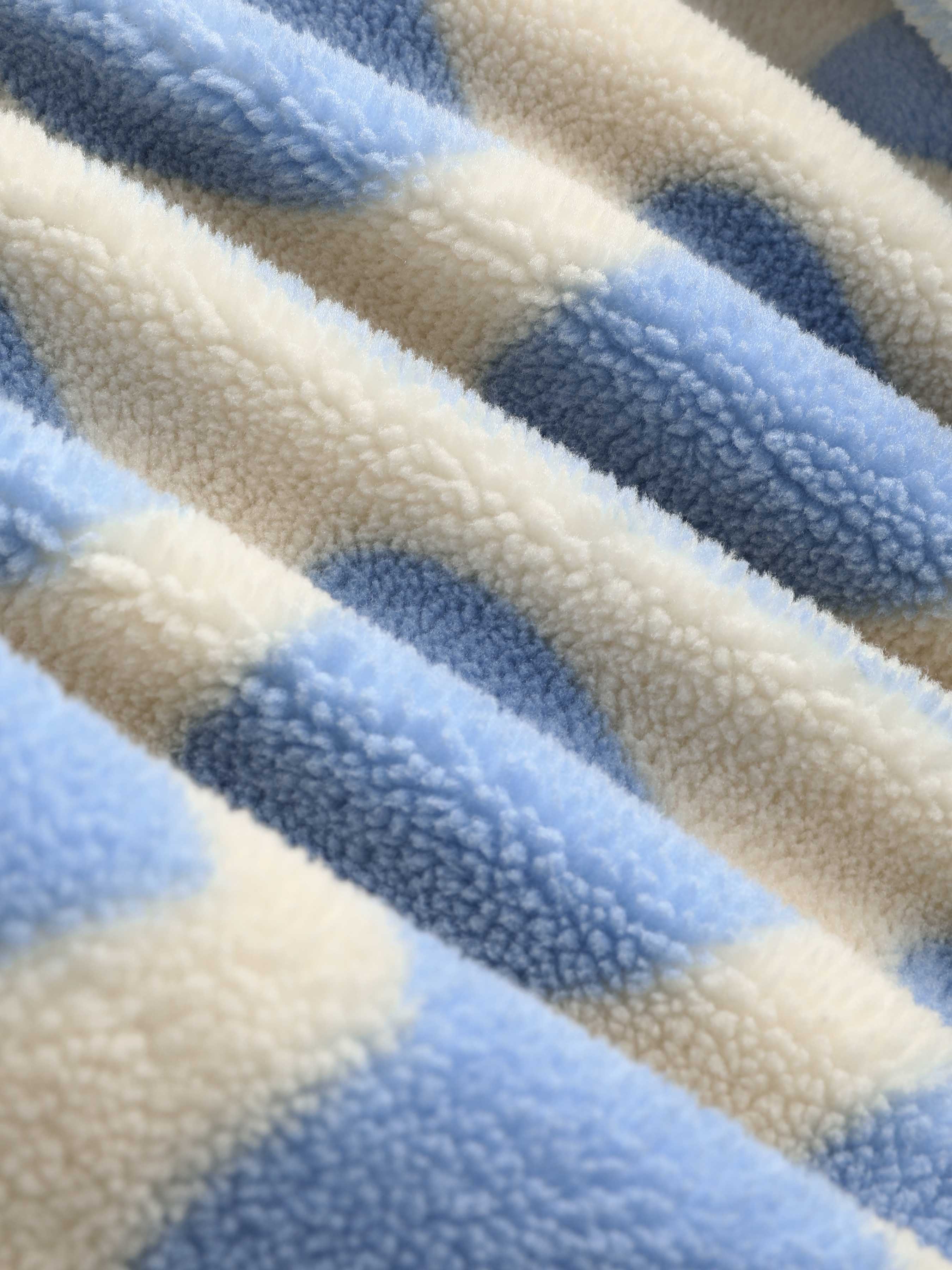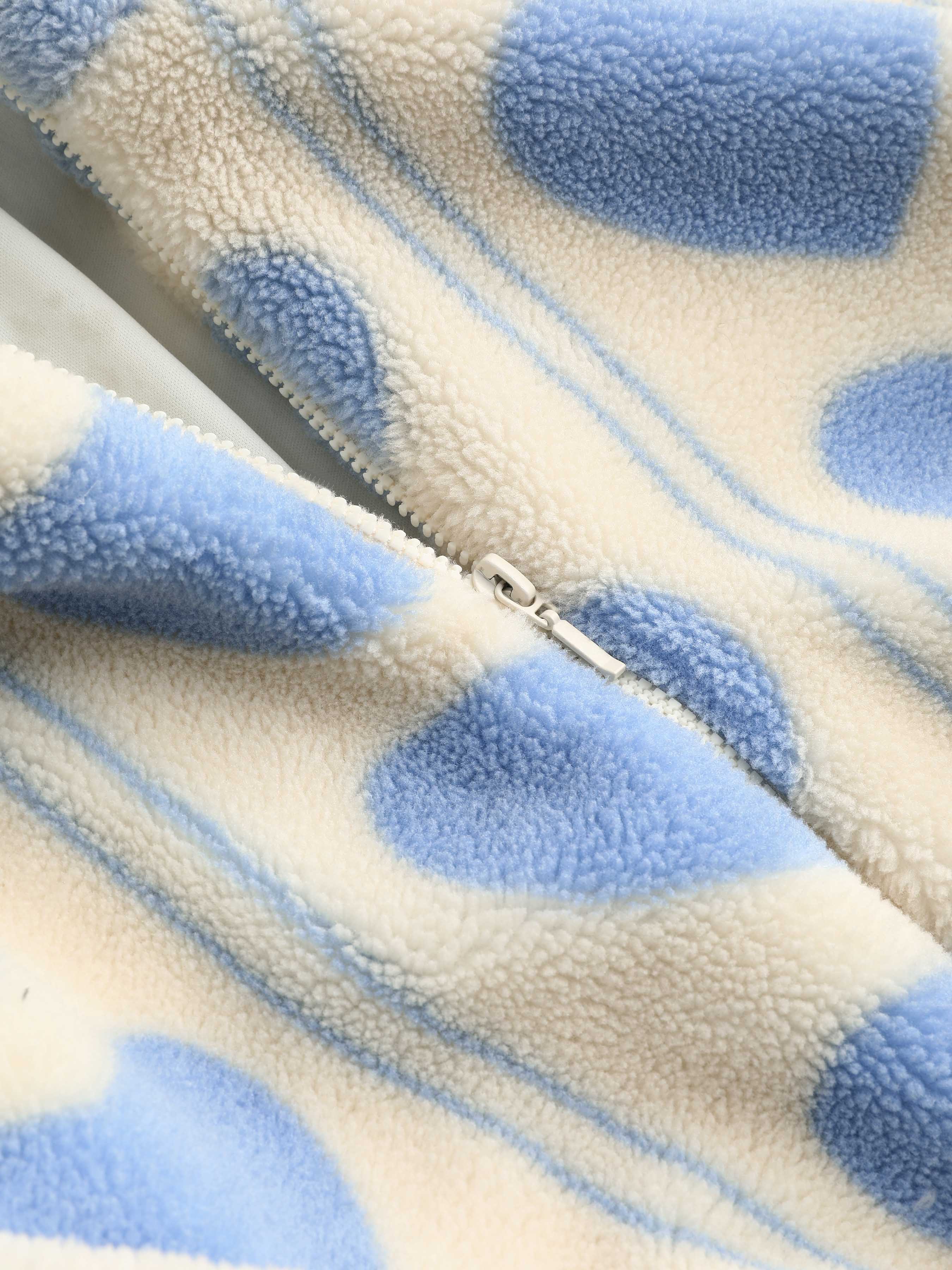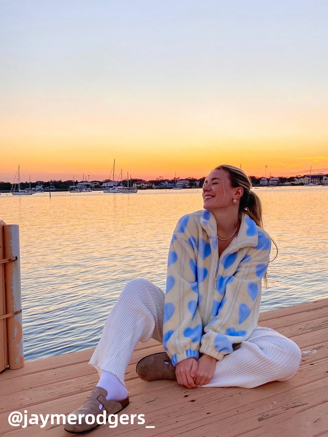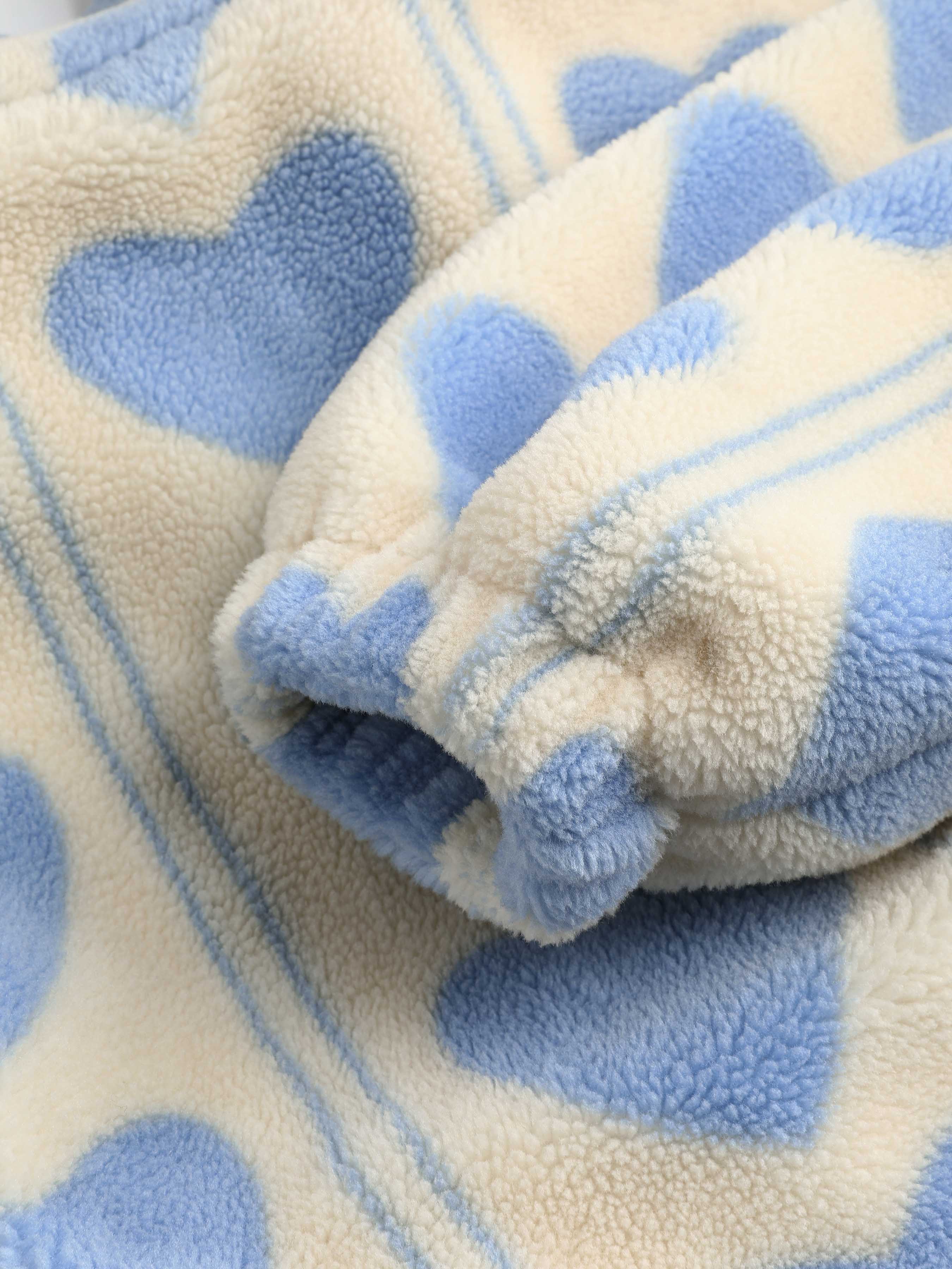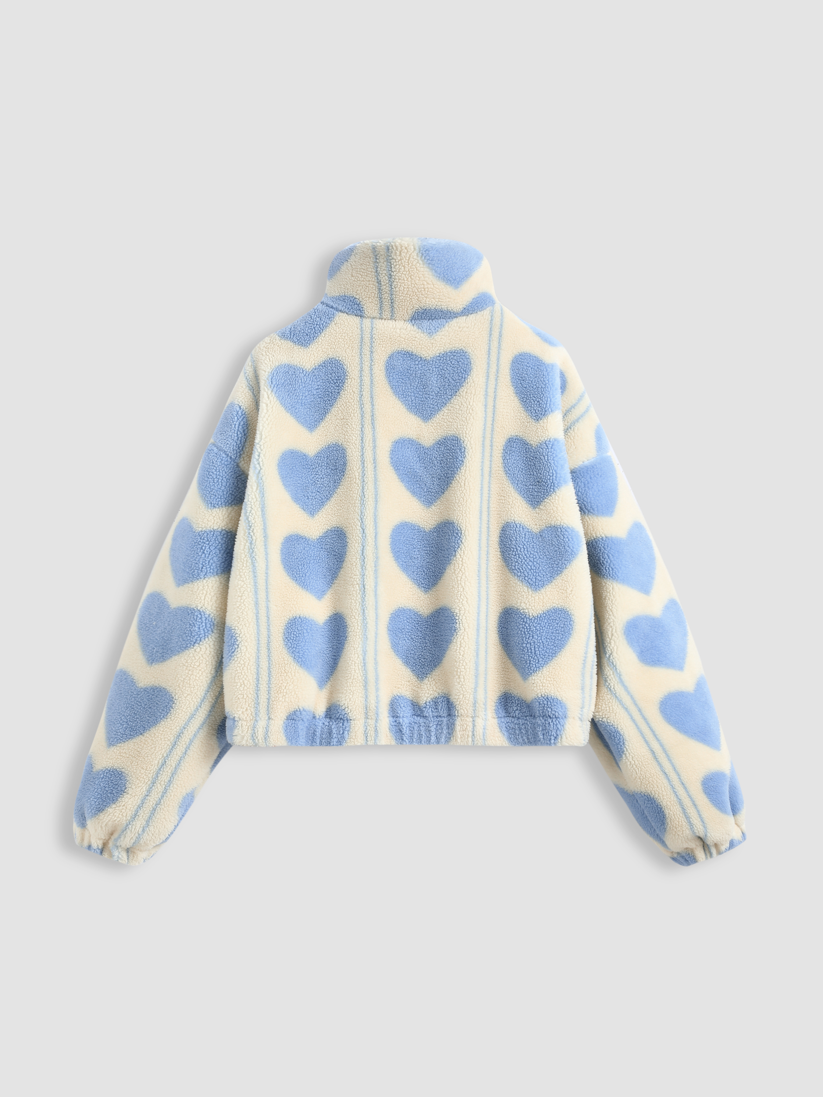 Our Love And Sherpa Heart Patterned Jacket features a drop shoulder with a thick, collared neckline and a classic, zip-up front design. With a light blue heart pattern and a warm, cozy material, this jacket is perfect for showing off your sweet personality in the fall/winter months. Pair with your favorite turtleneck sweater and denim trousers to complete the look.