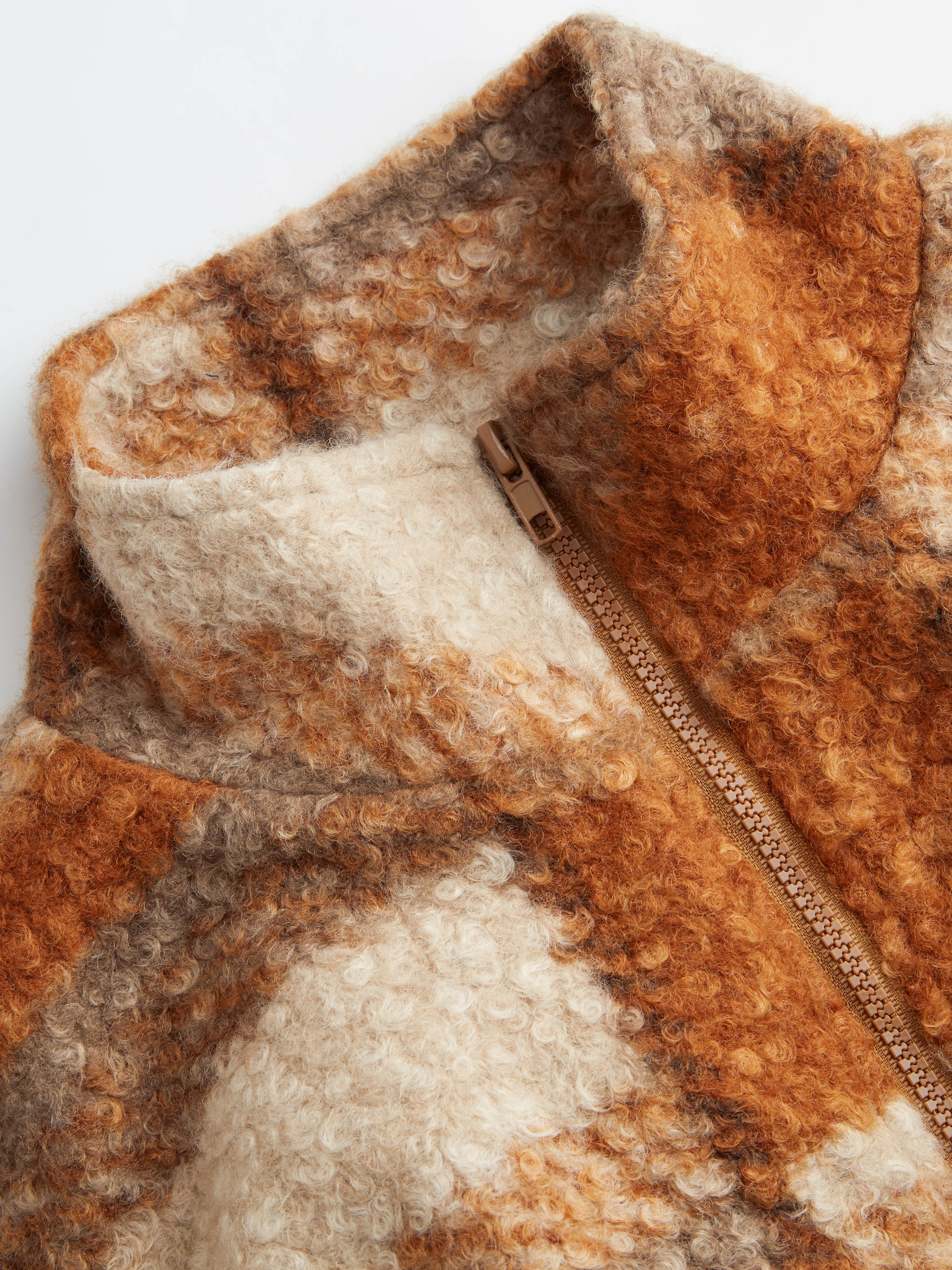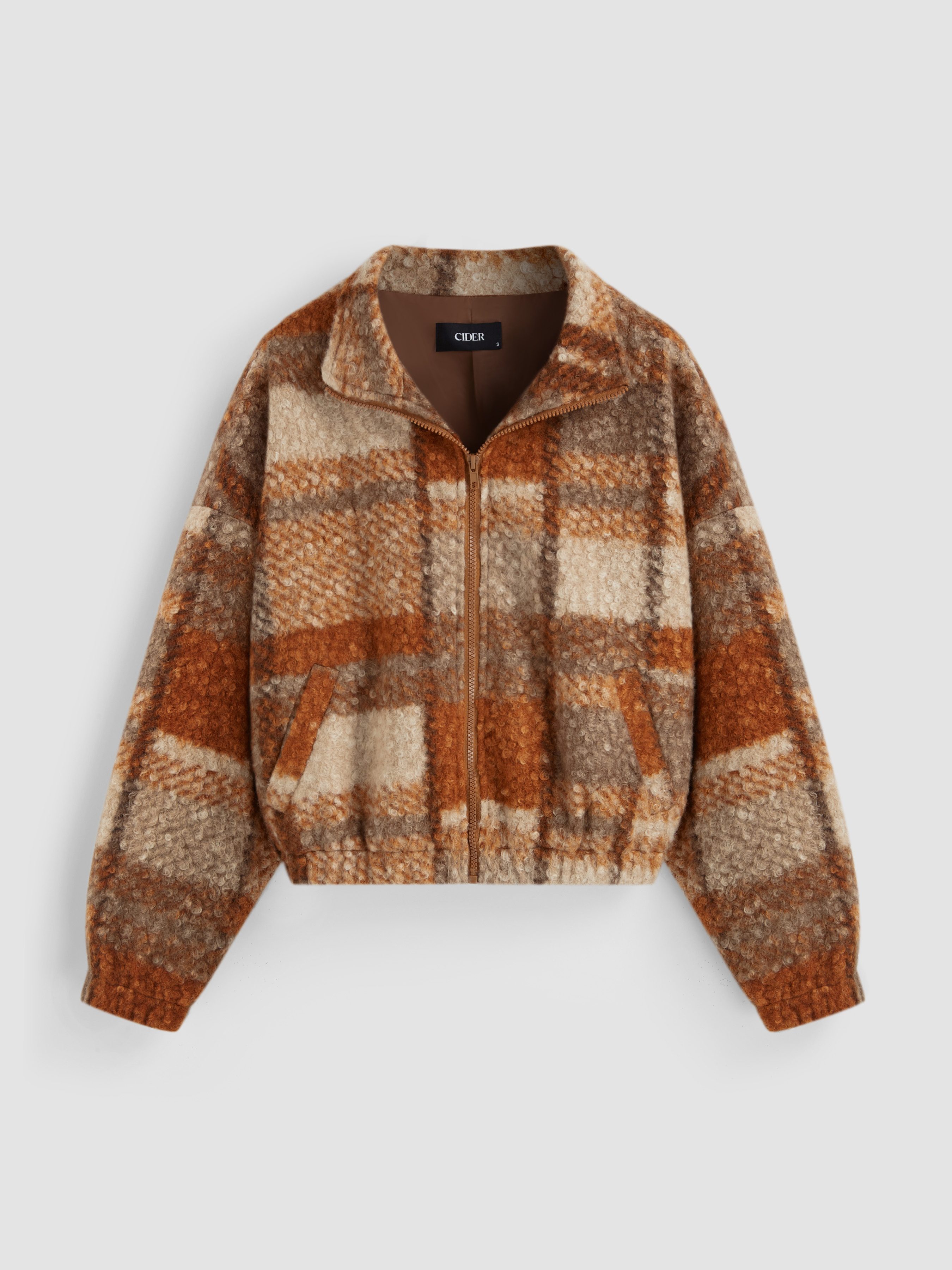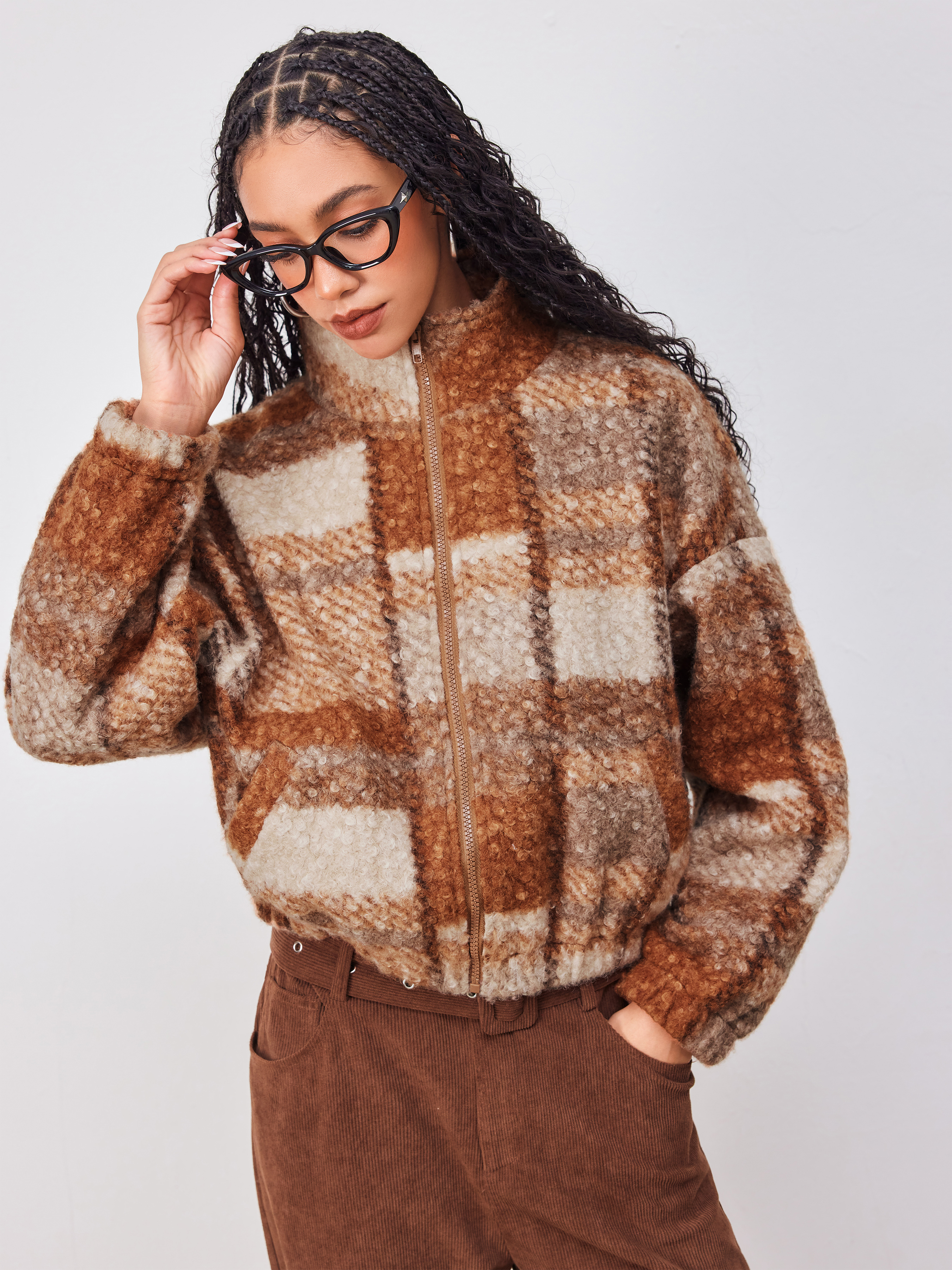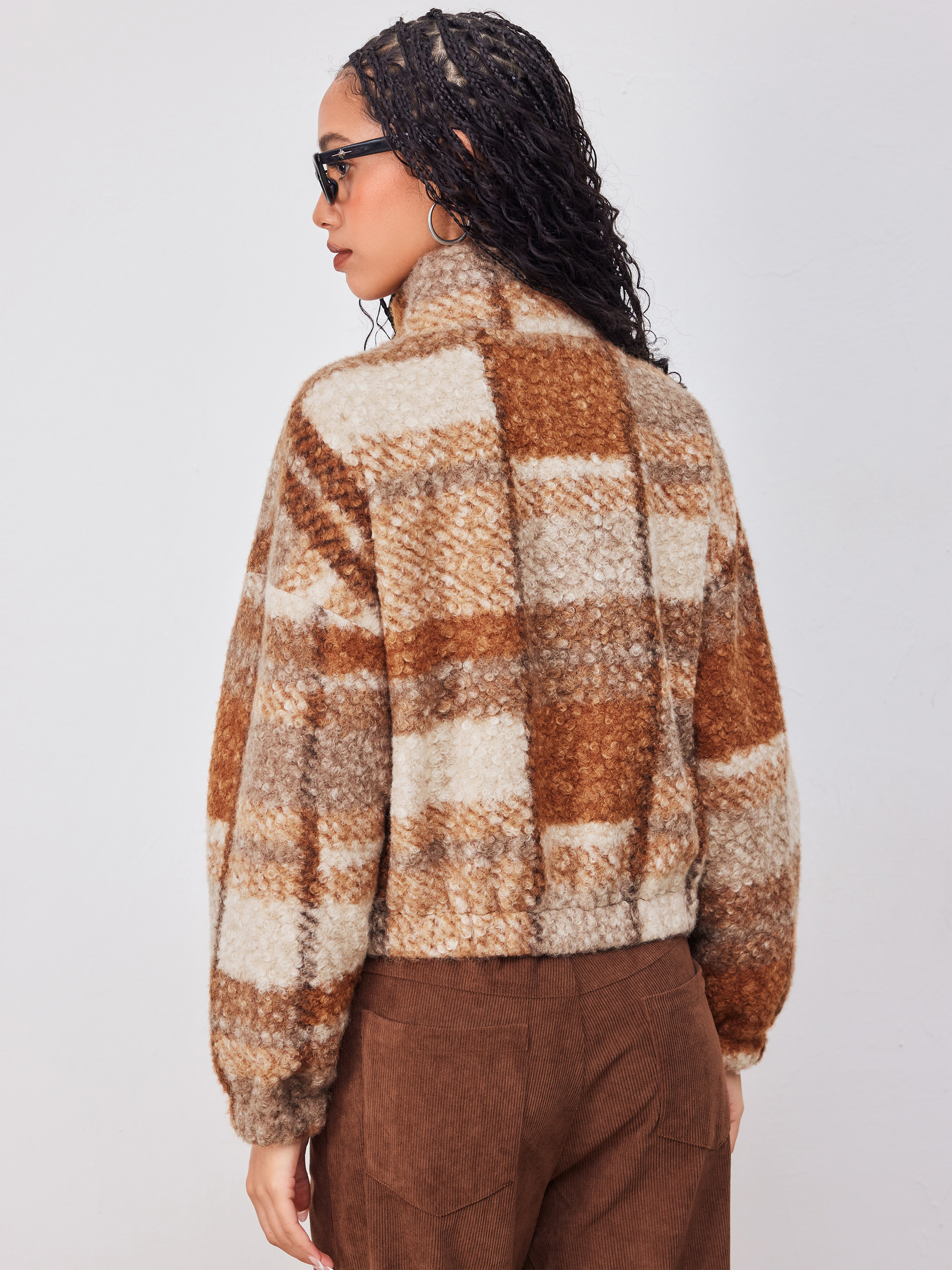 Giacca in pile Stand Collar Checks Pocket Oversize