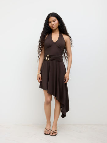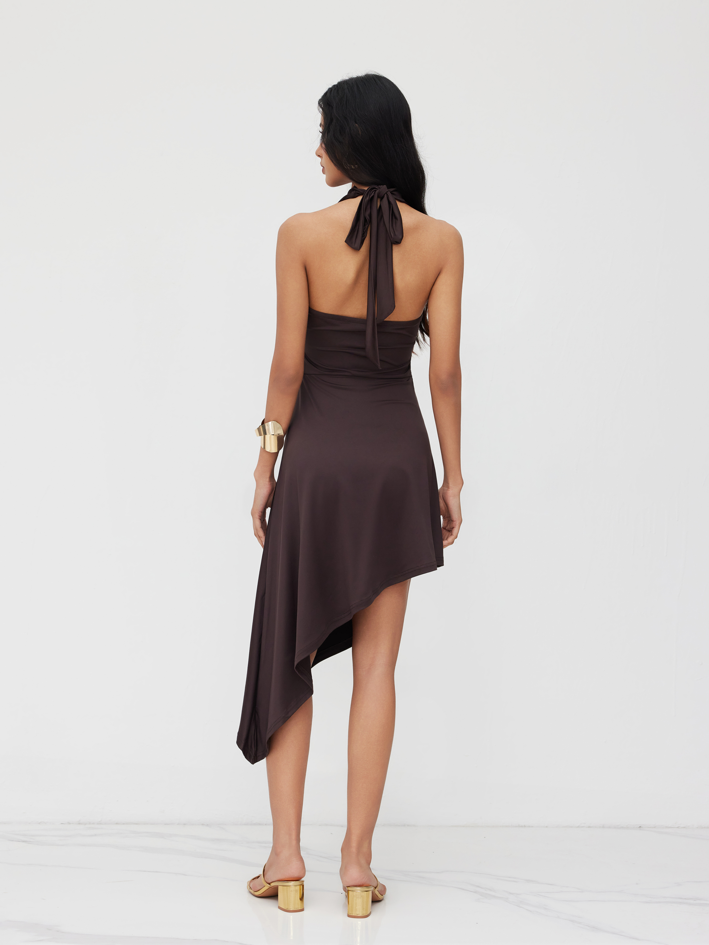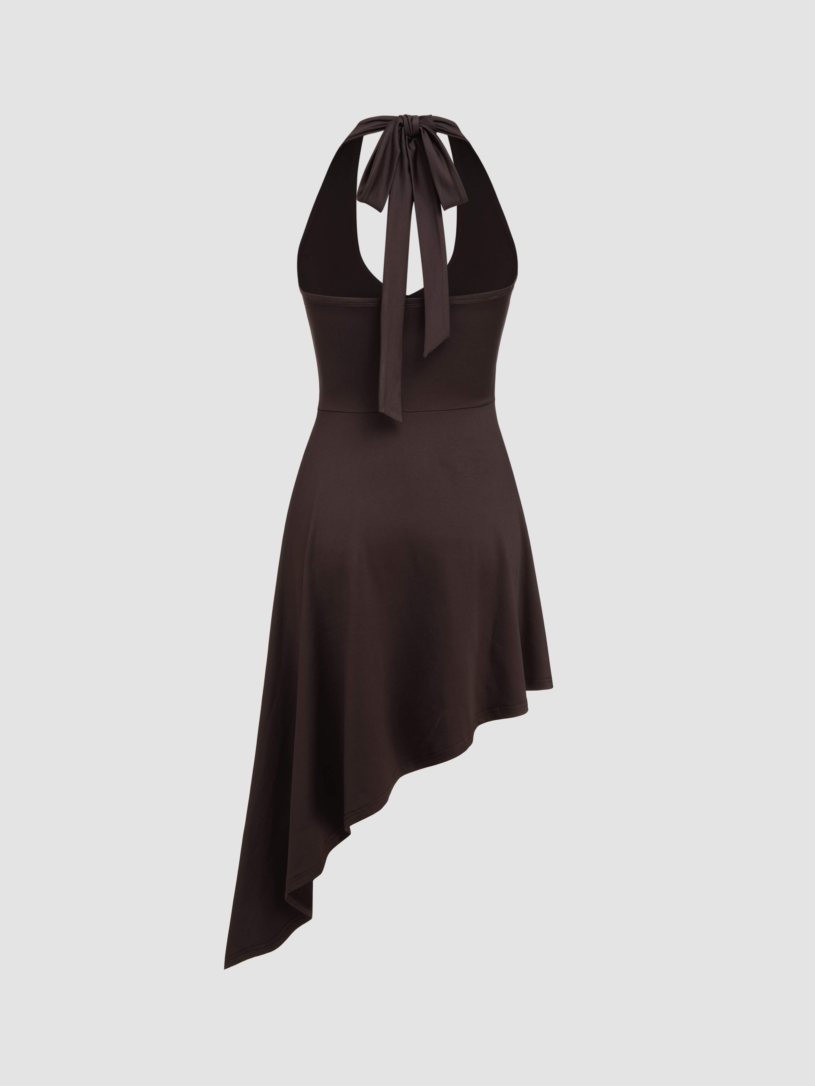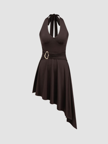 Abito Lungo Maxi con Scollo Halter, Fibbia, Arricciature, Volant e Orlo Asimmetrico