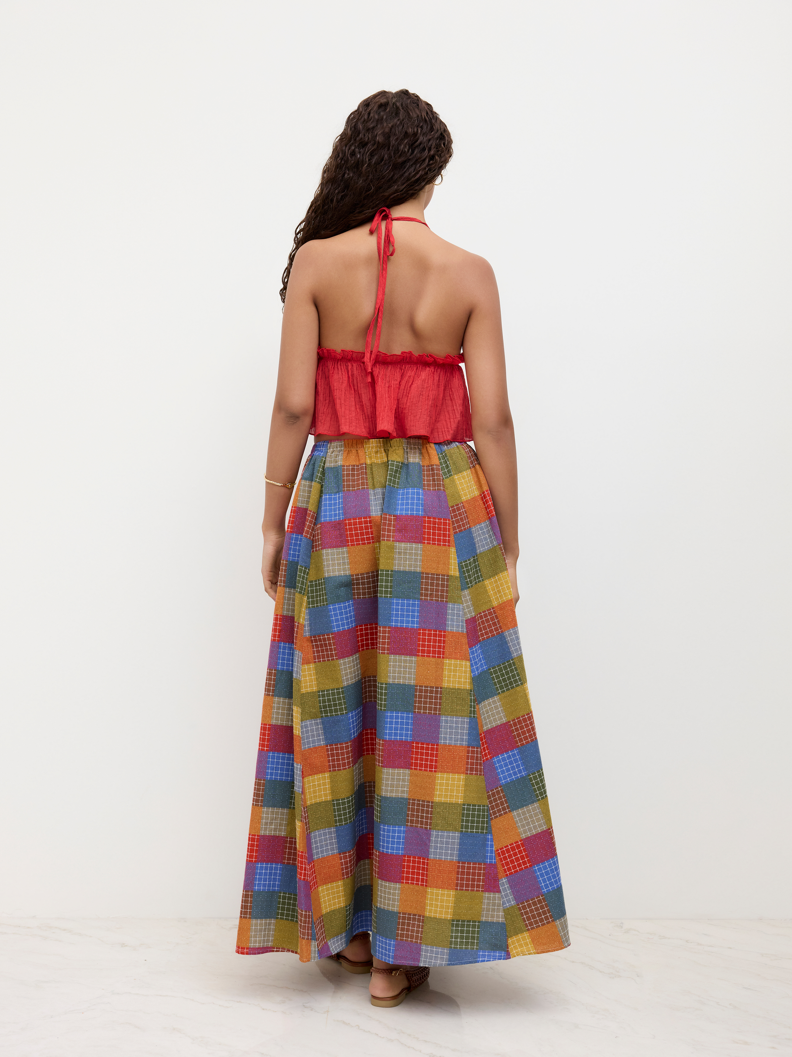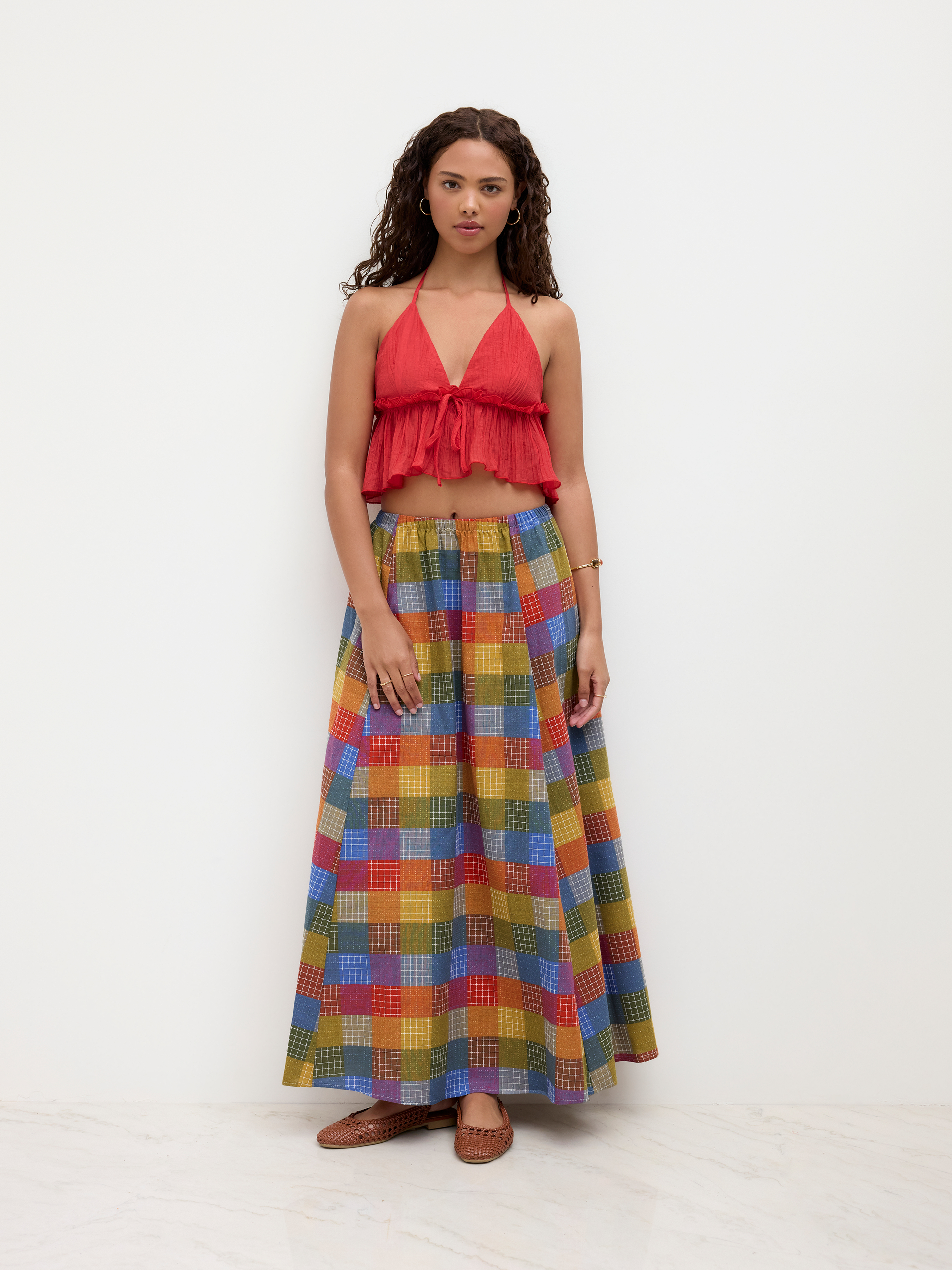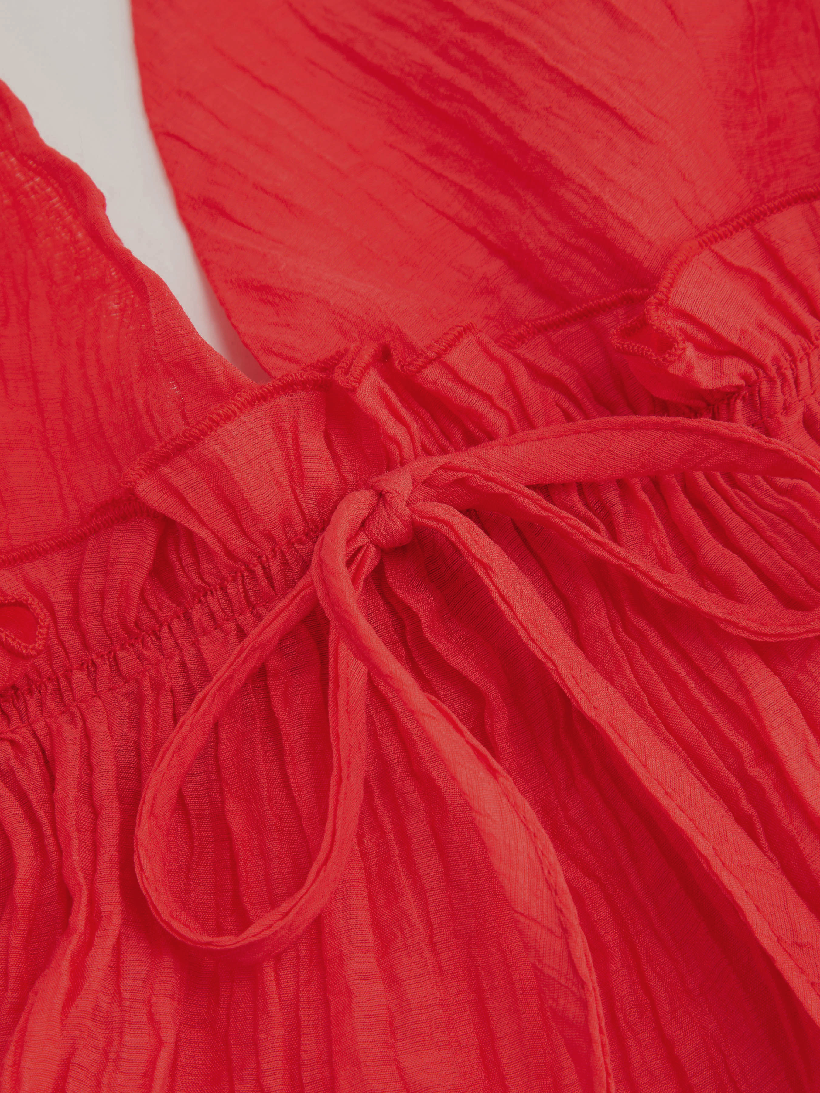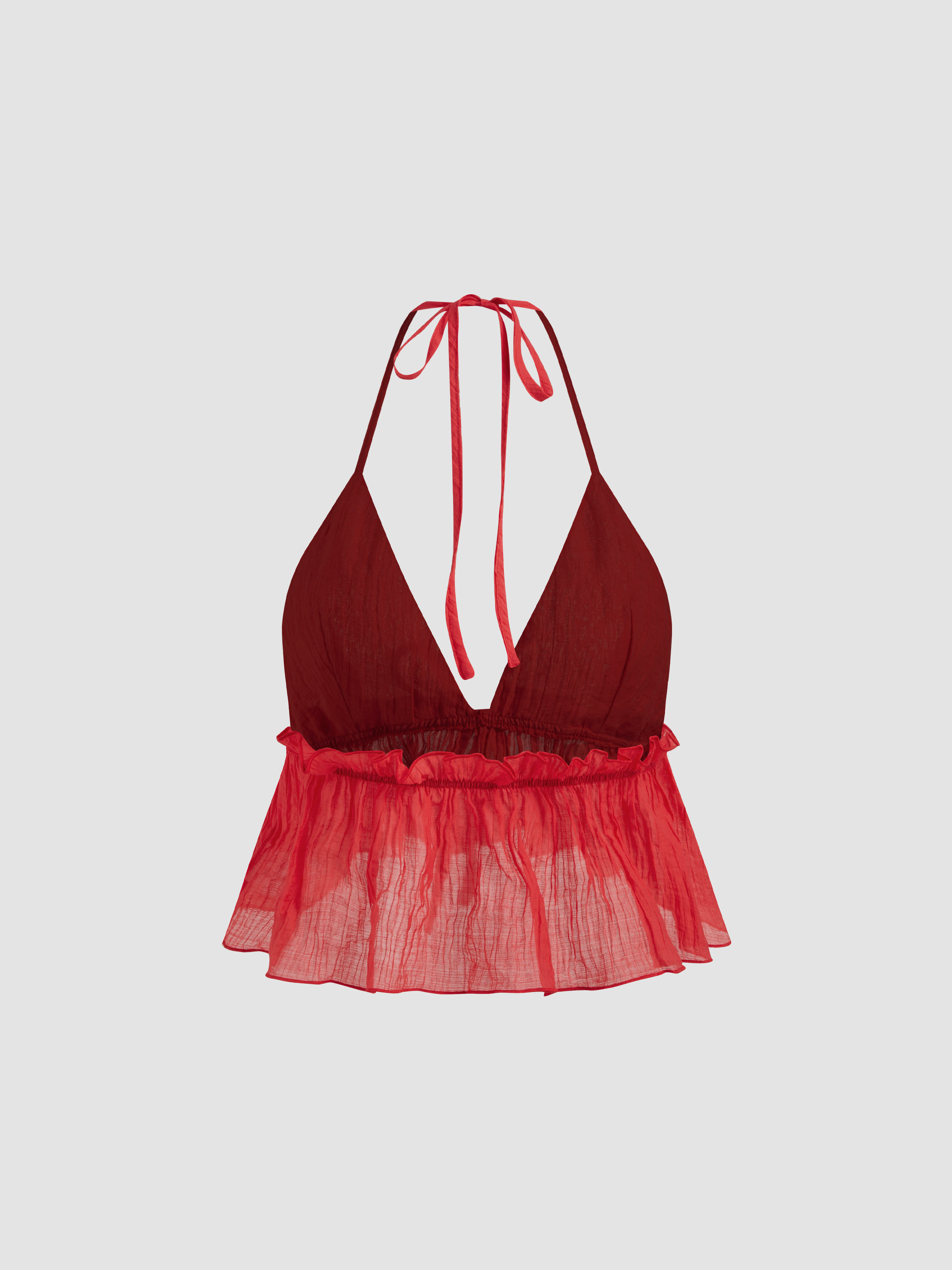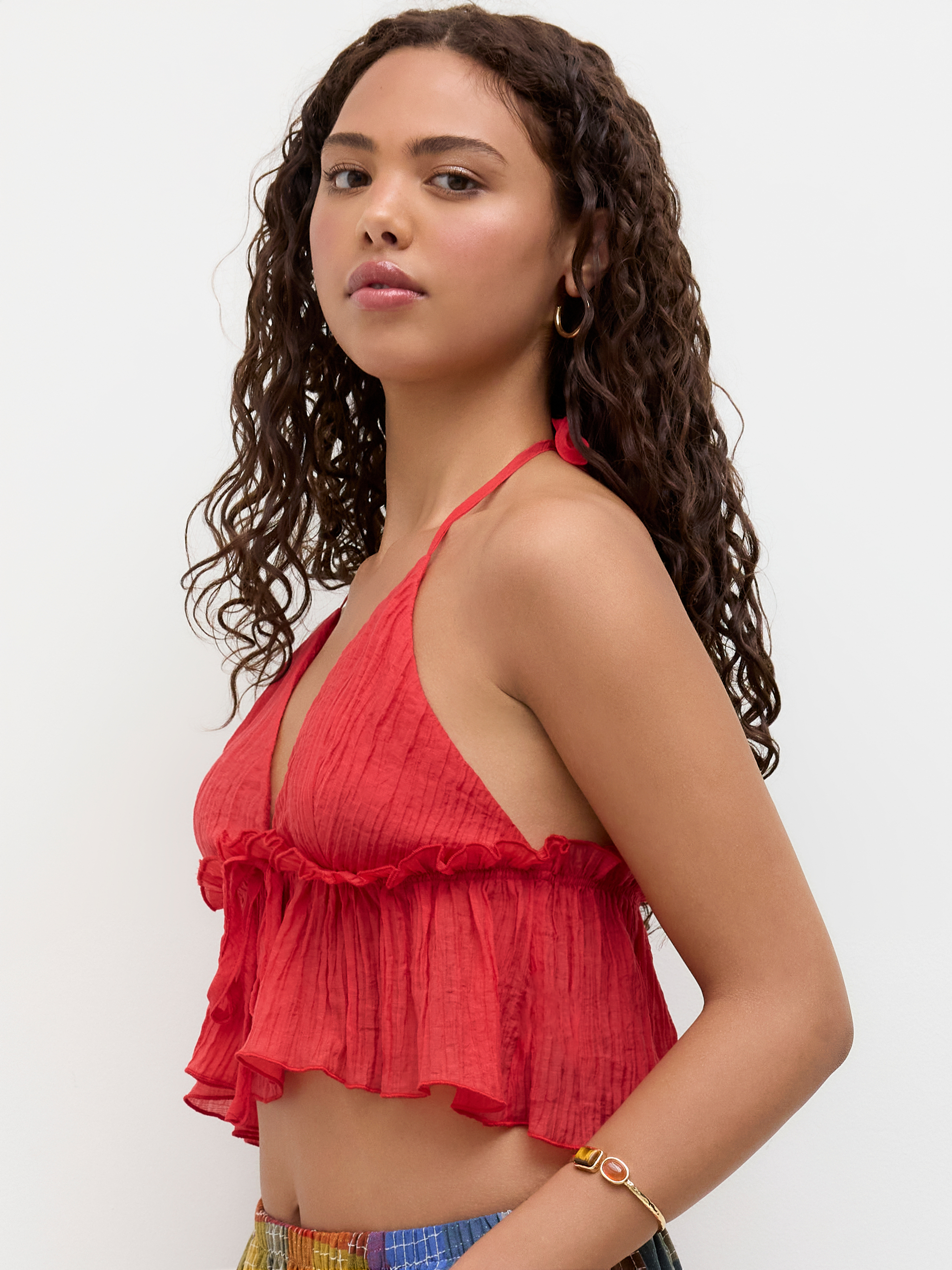 Top corto annodato con scollo all'americana e bordo a lattuga