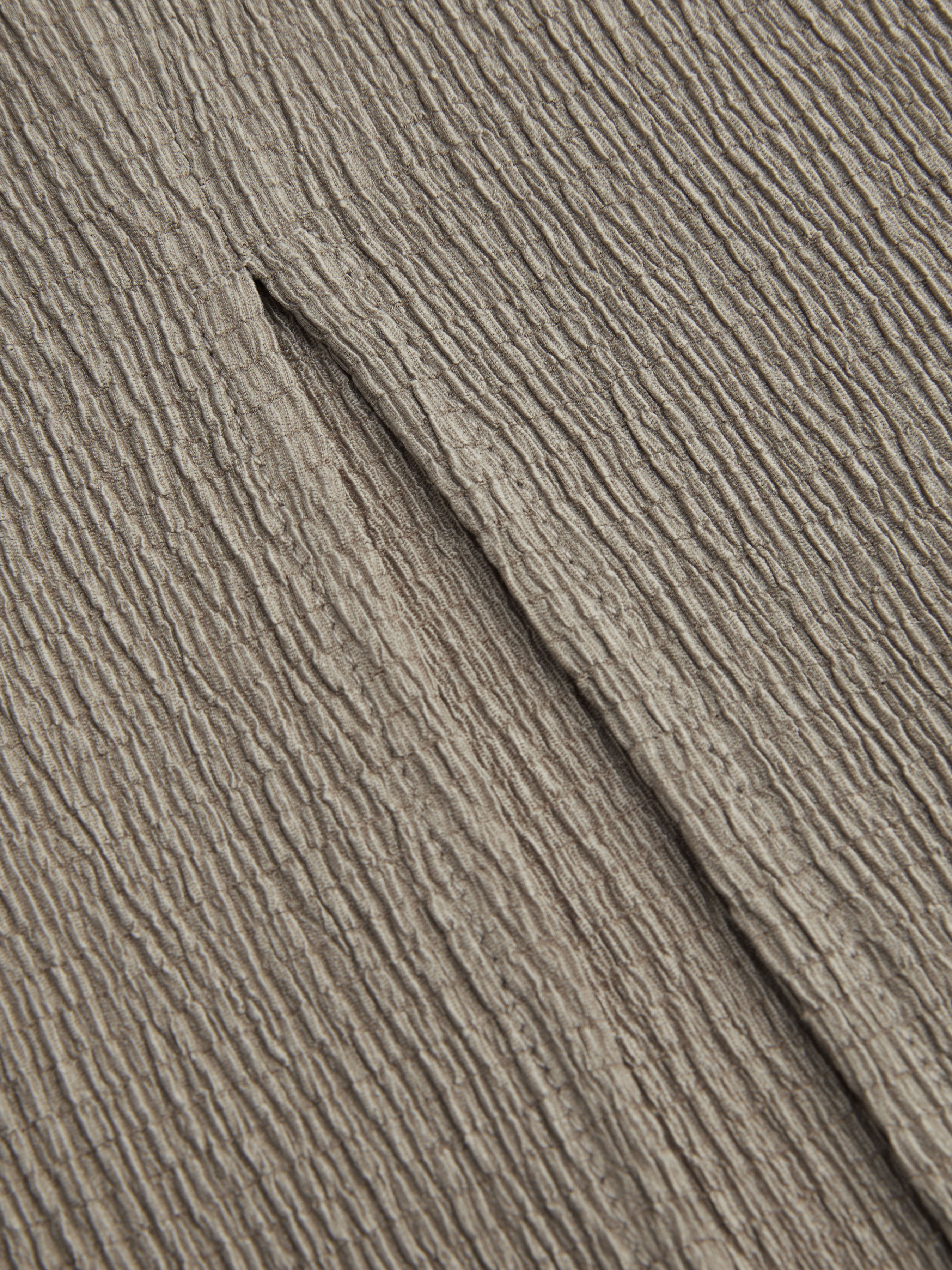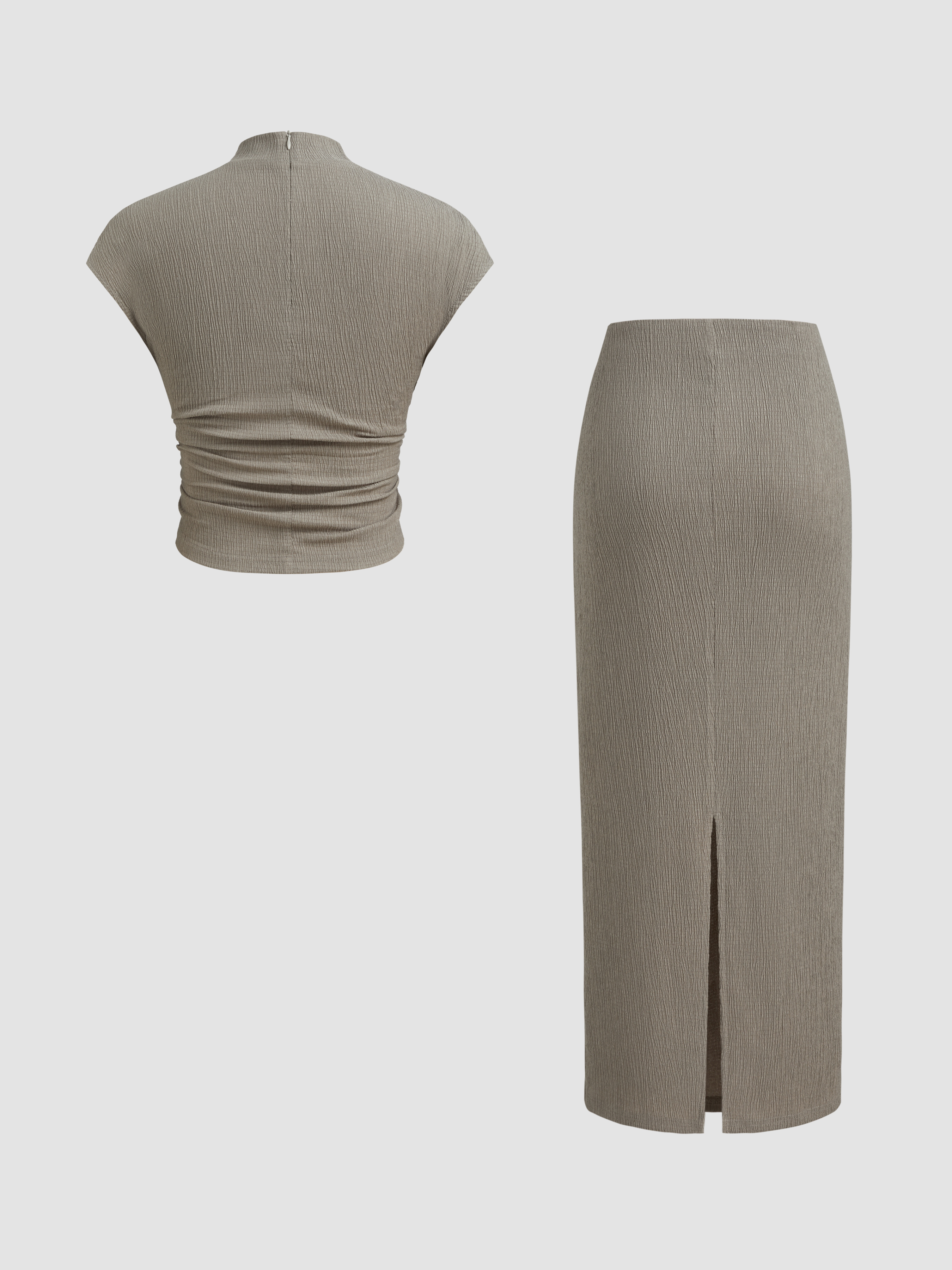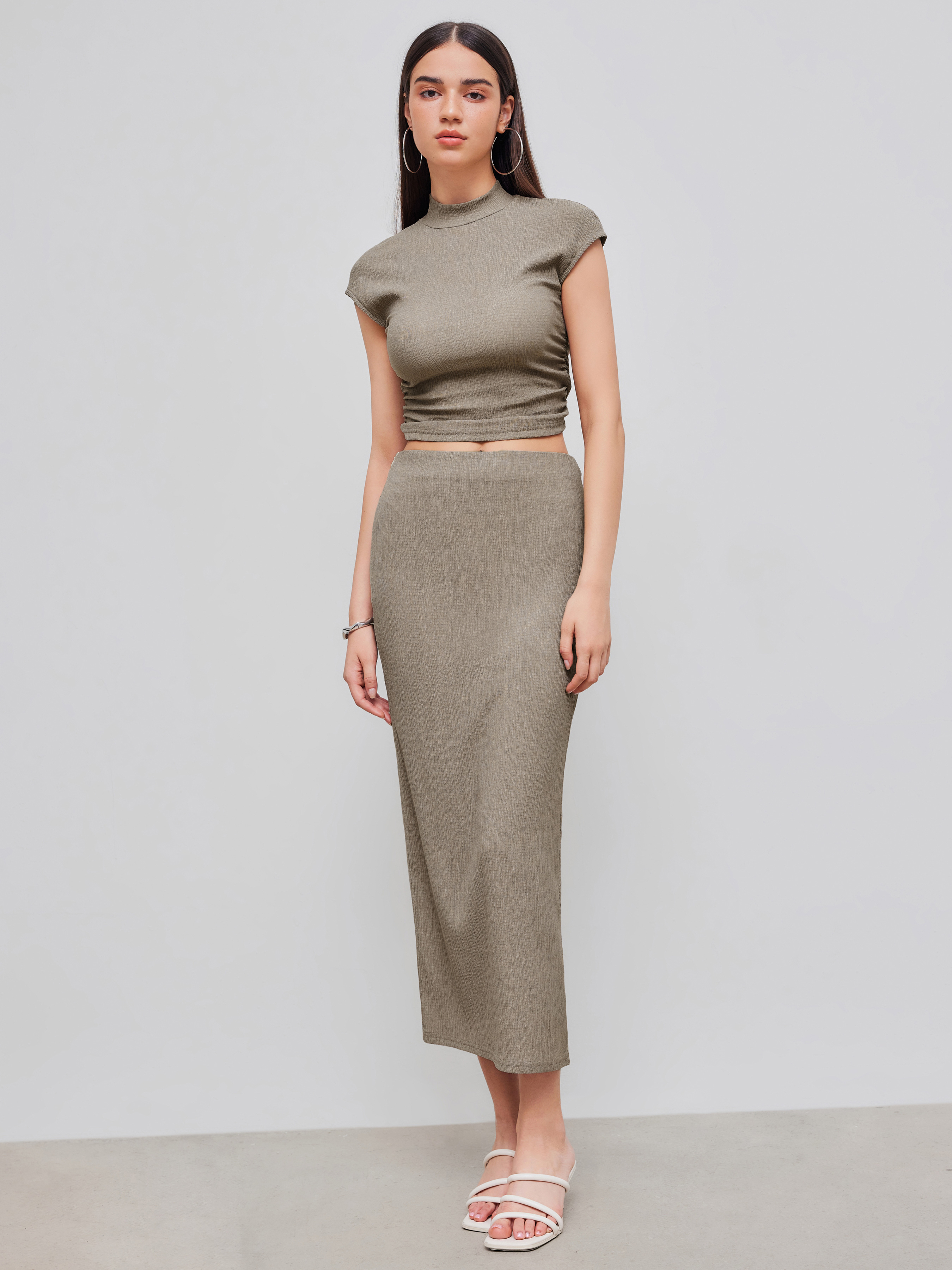 Canotta a collo alto con increspatura a tinta unita e maxi gonna a mezza altezza con spacco a tinta unita