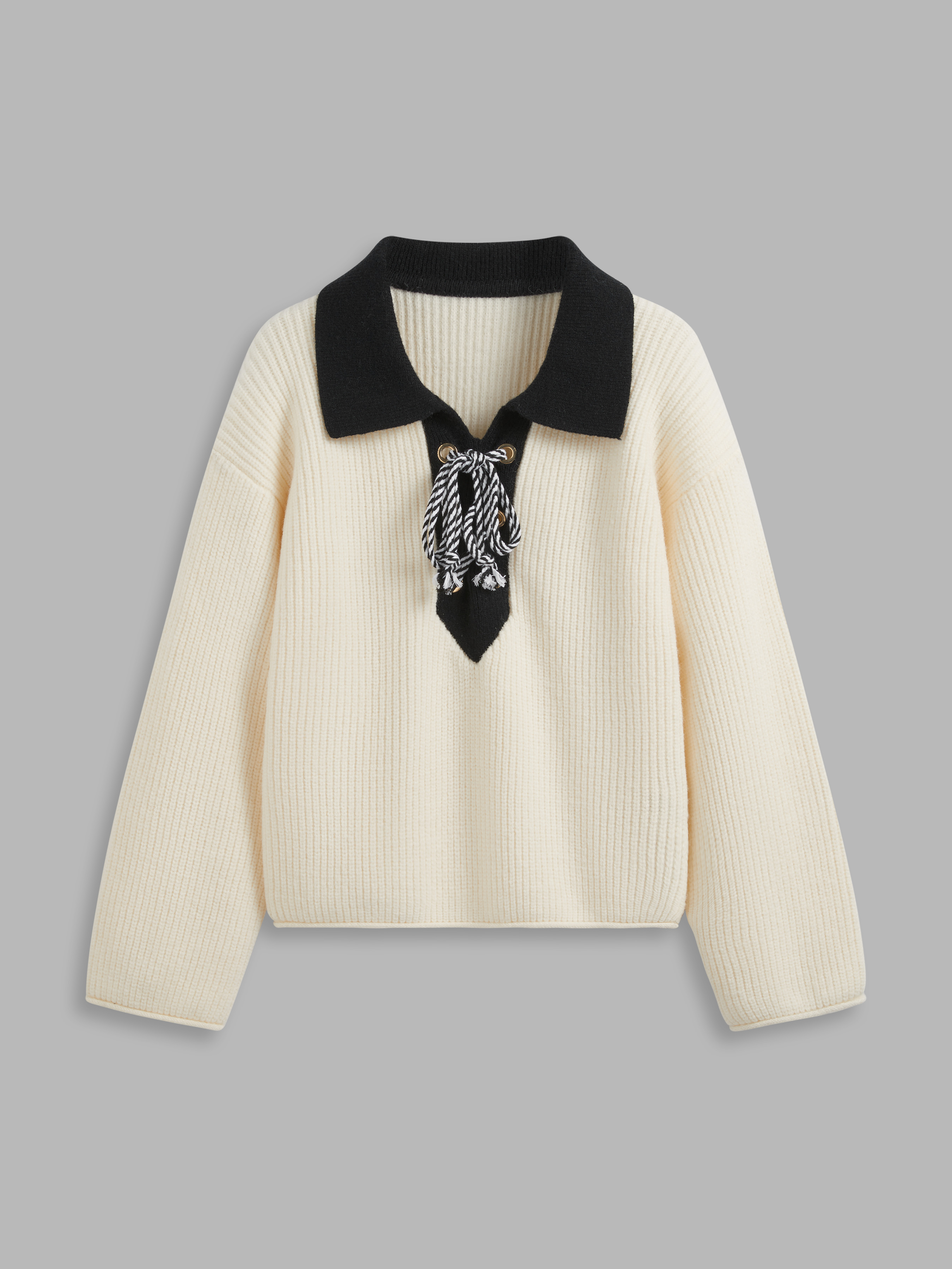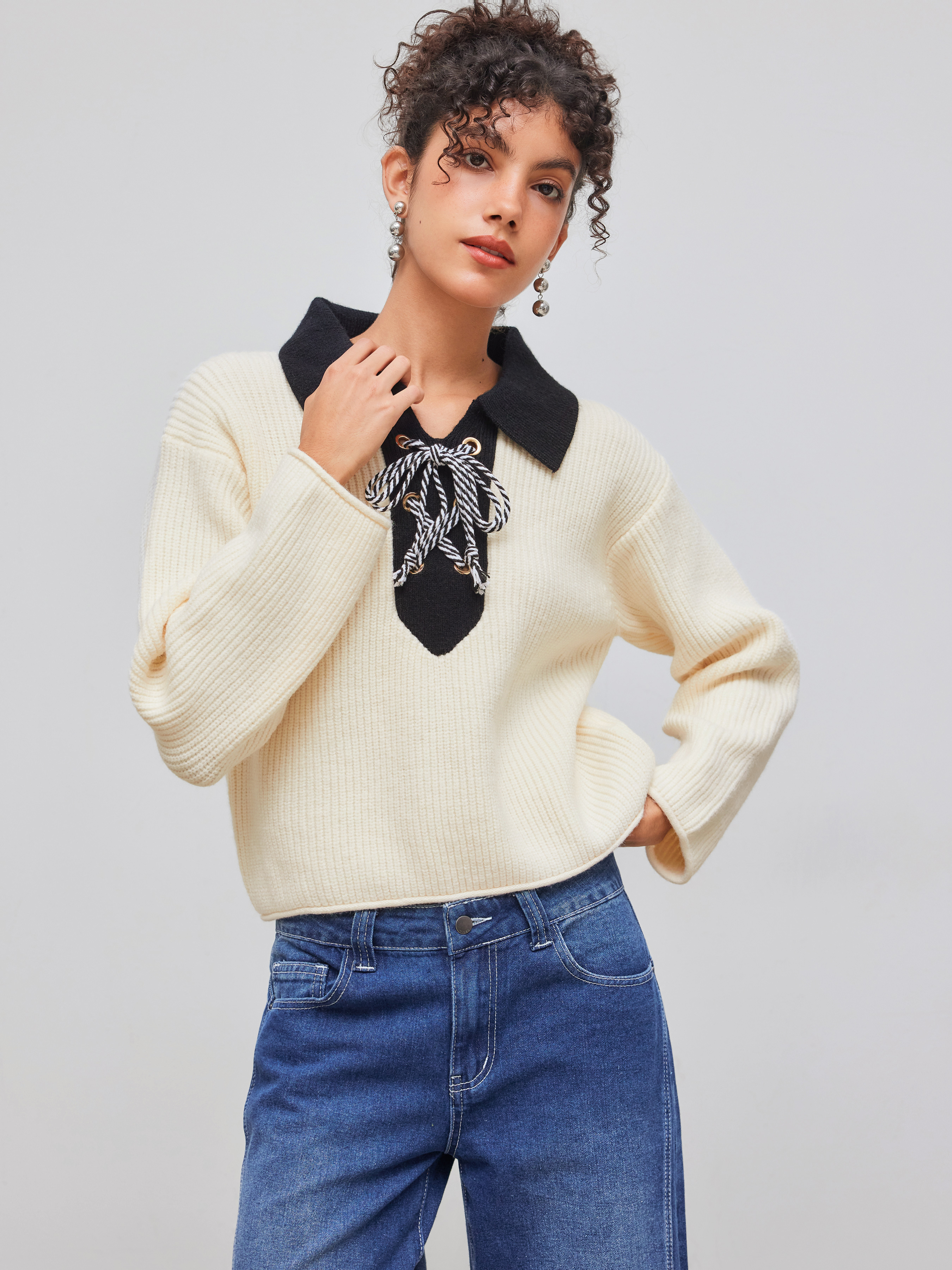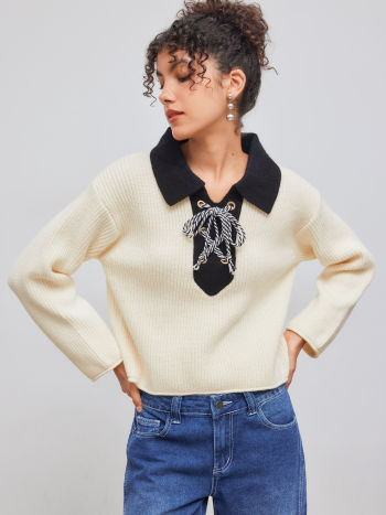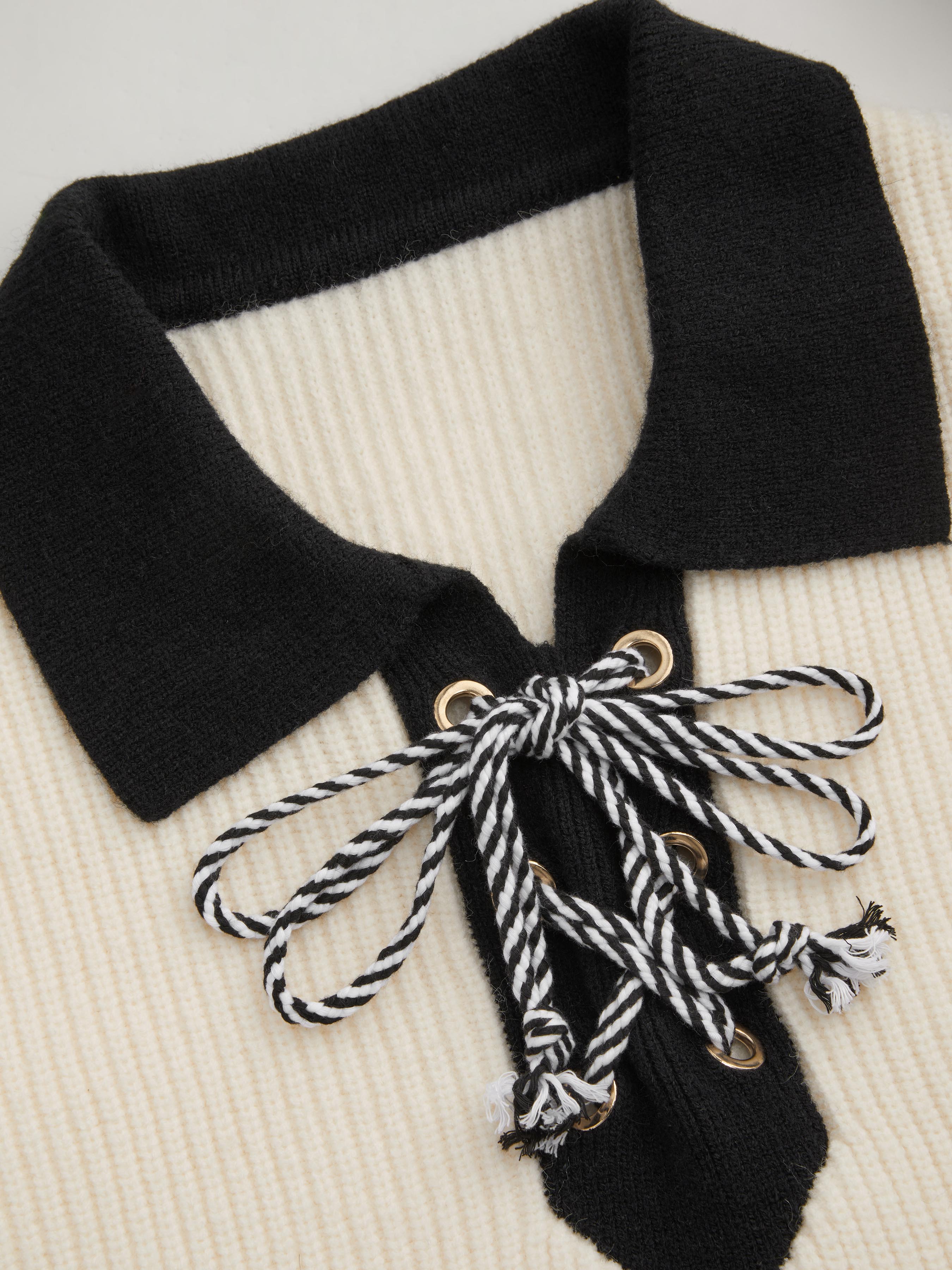 Top a maniche lunghe in maglia con colletto solido e pizzo