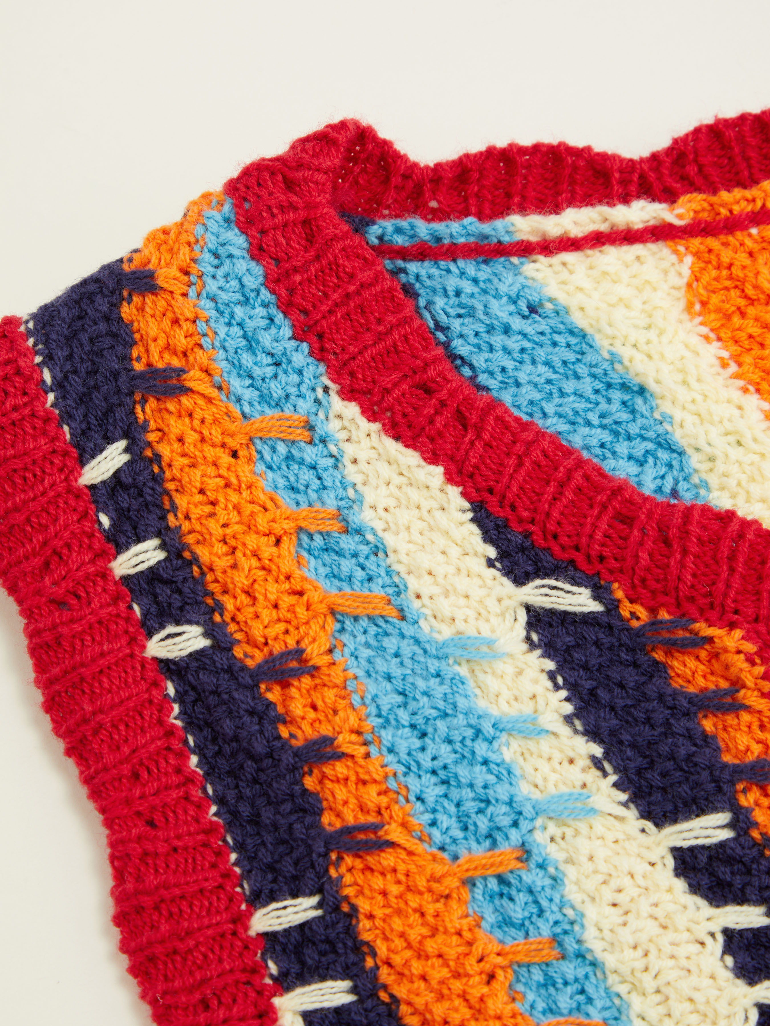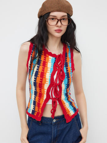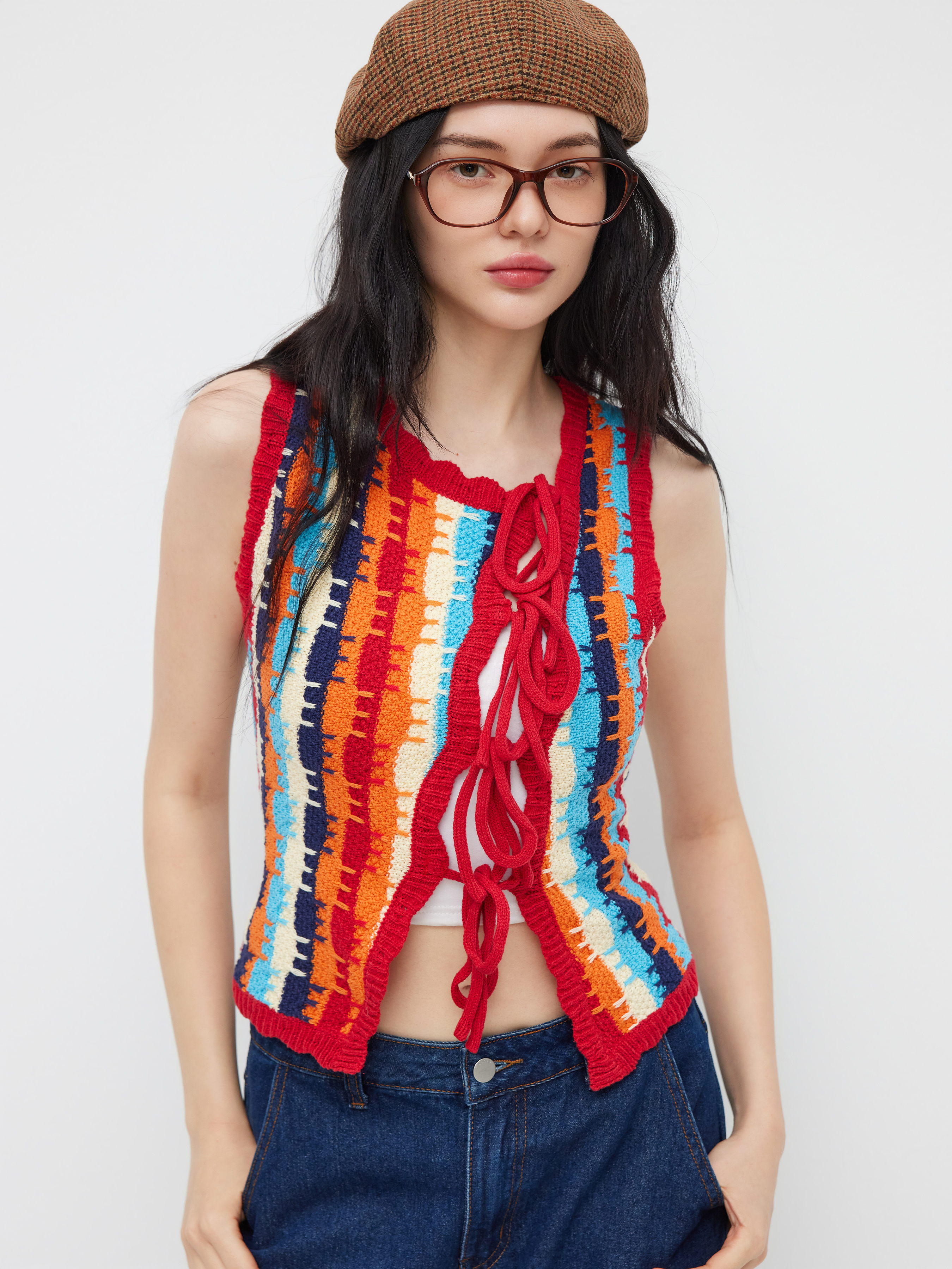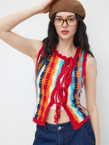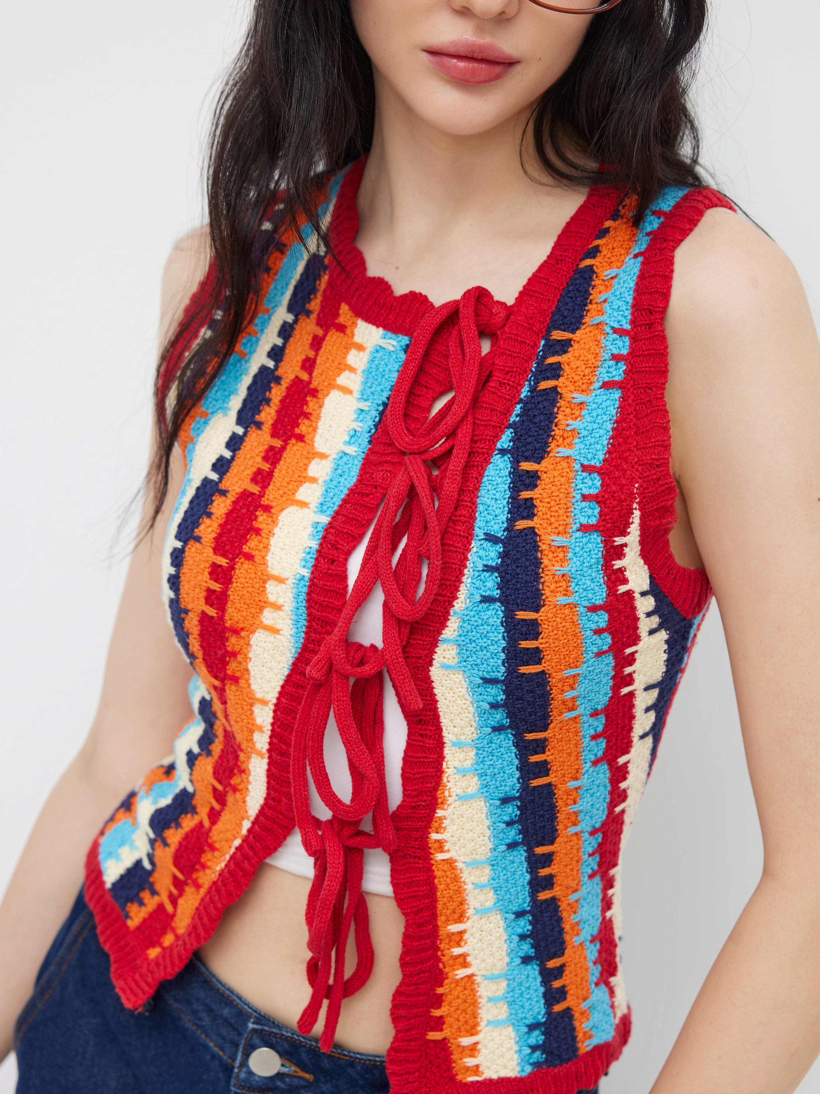 Gilet asimmetrico lavorato a maglia all'uncinetto con scollo asimmetrico, motivo a righe color block e chiusura frontale con lacci