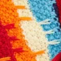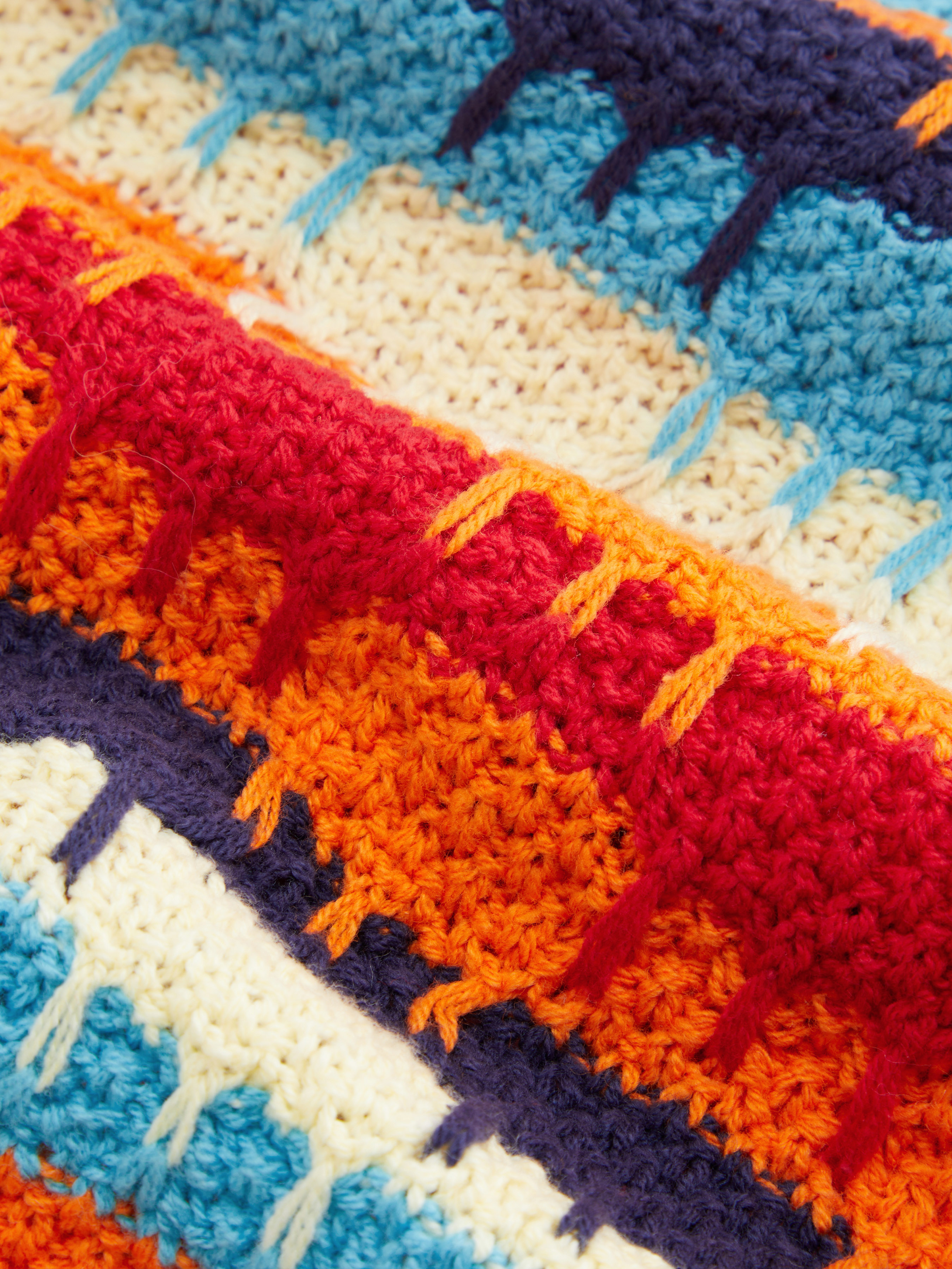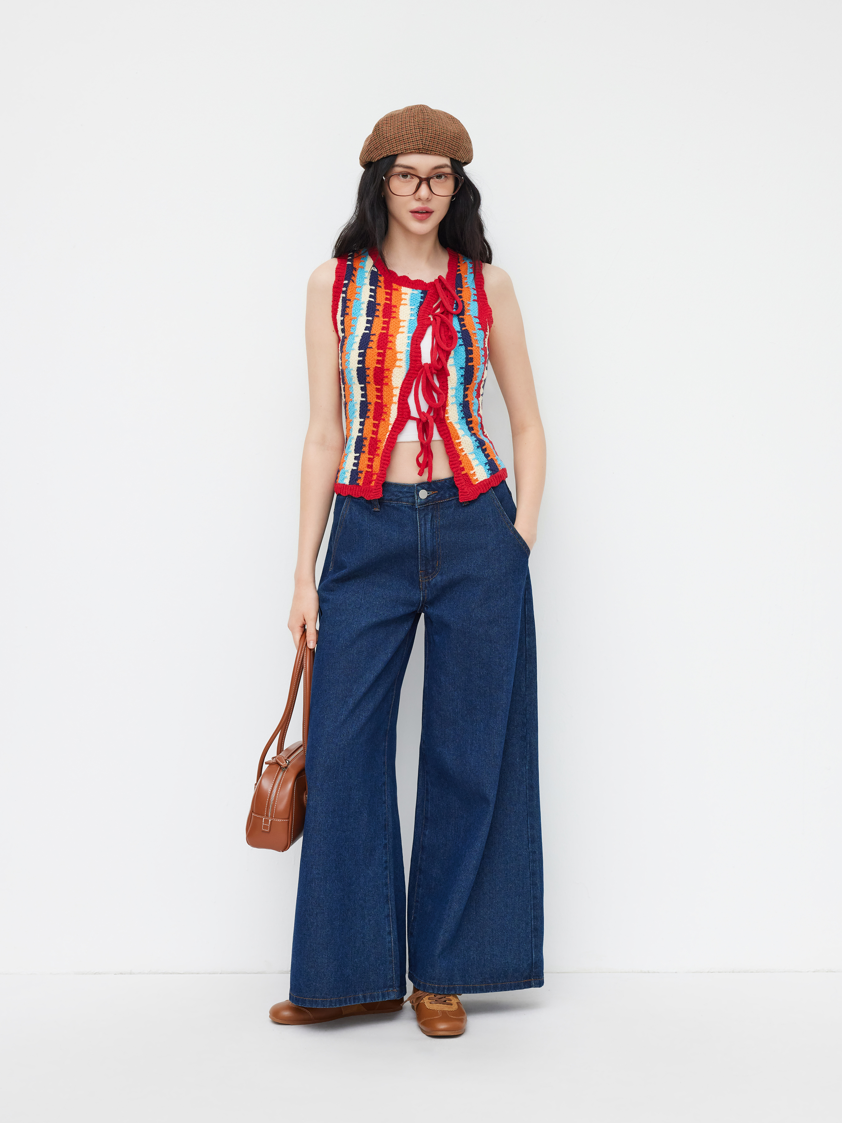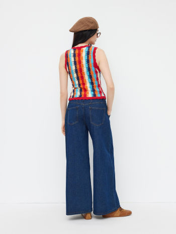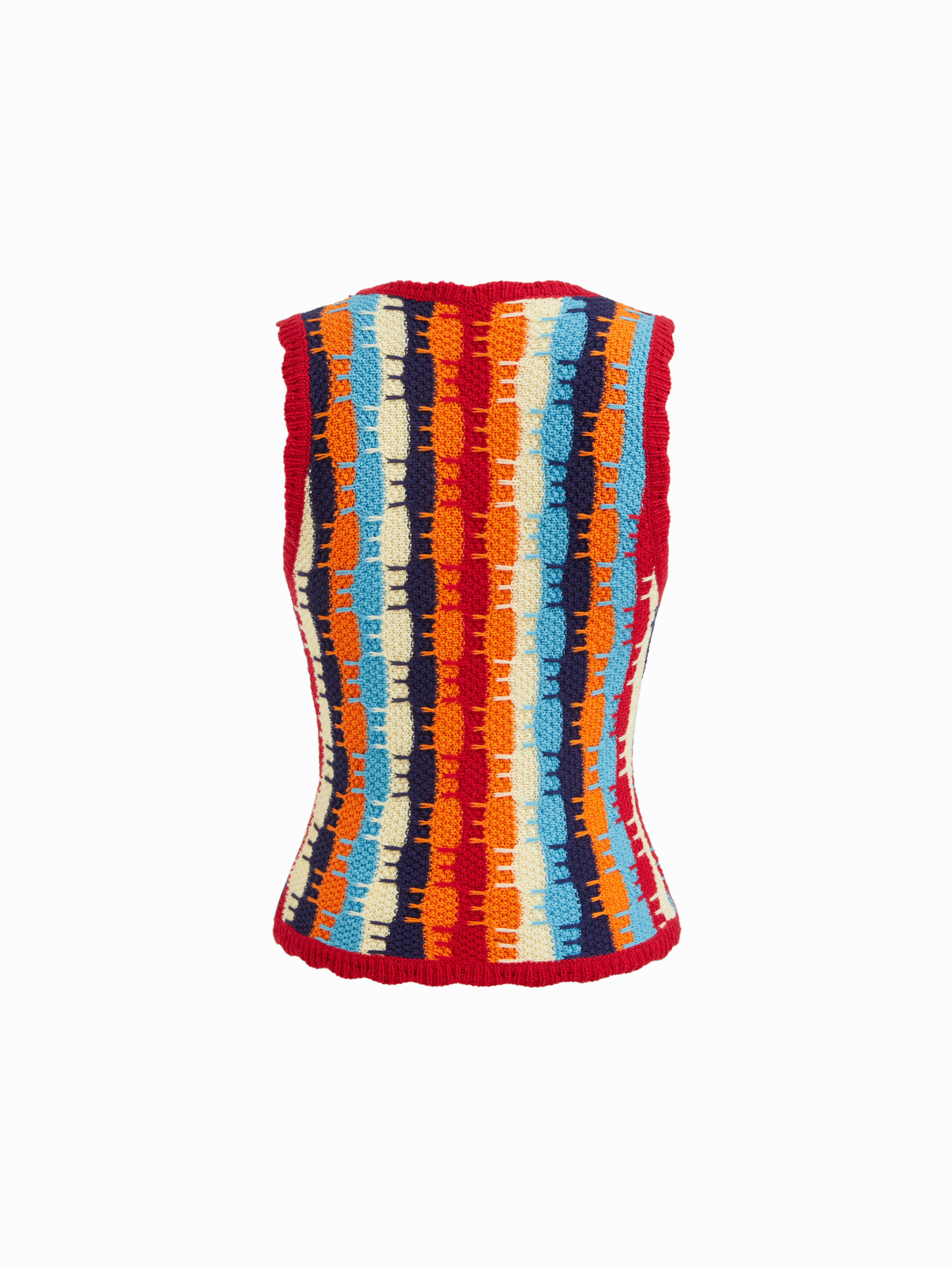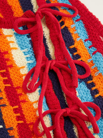 Gilet asimmetrico lavorato a maglia all'uncinetto con scollo asimmetrico, motivo a righe color block e chiusura frontale con lacci