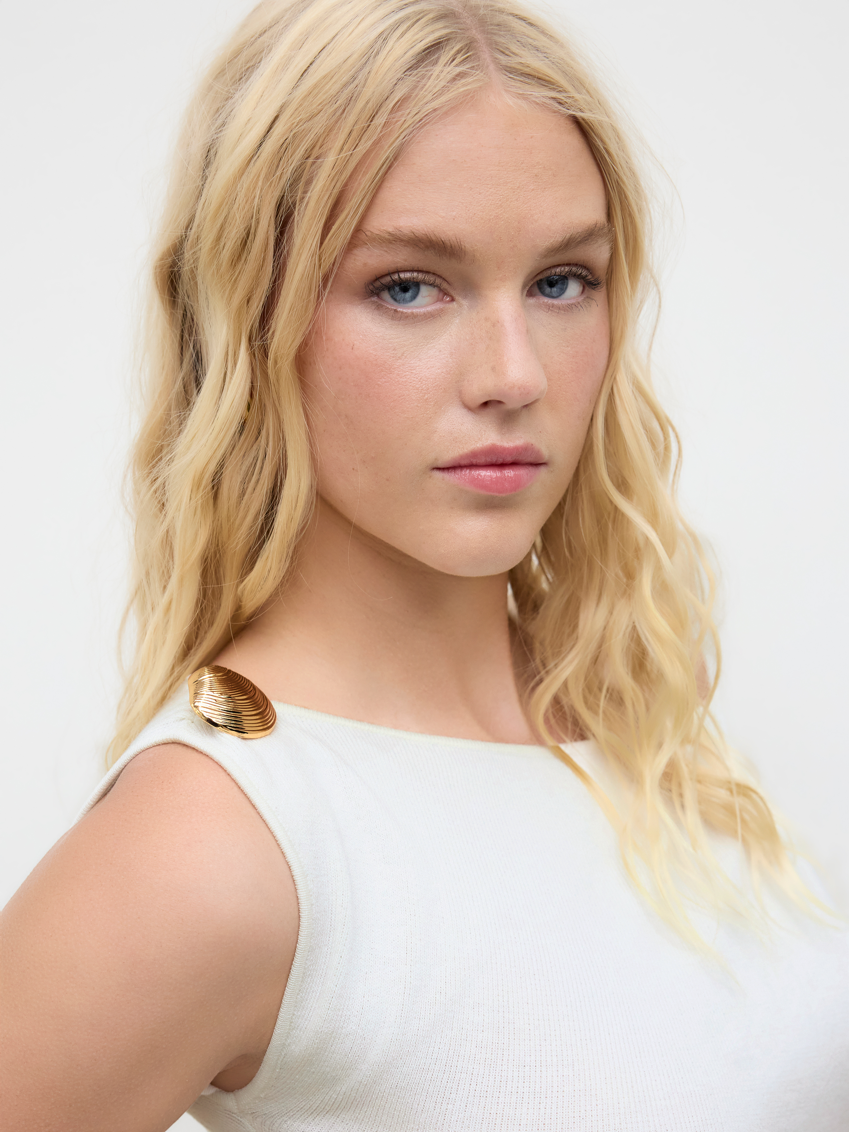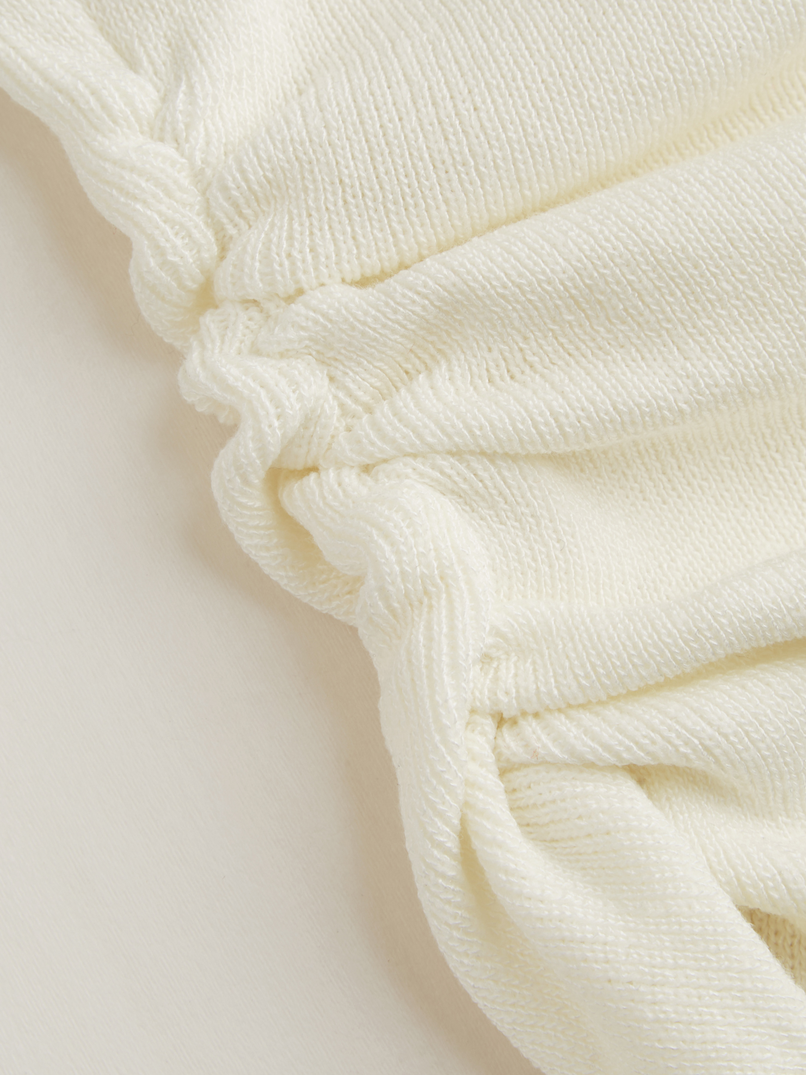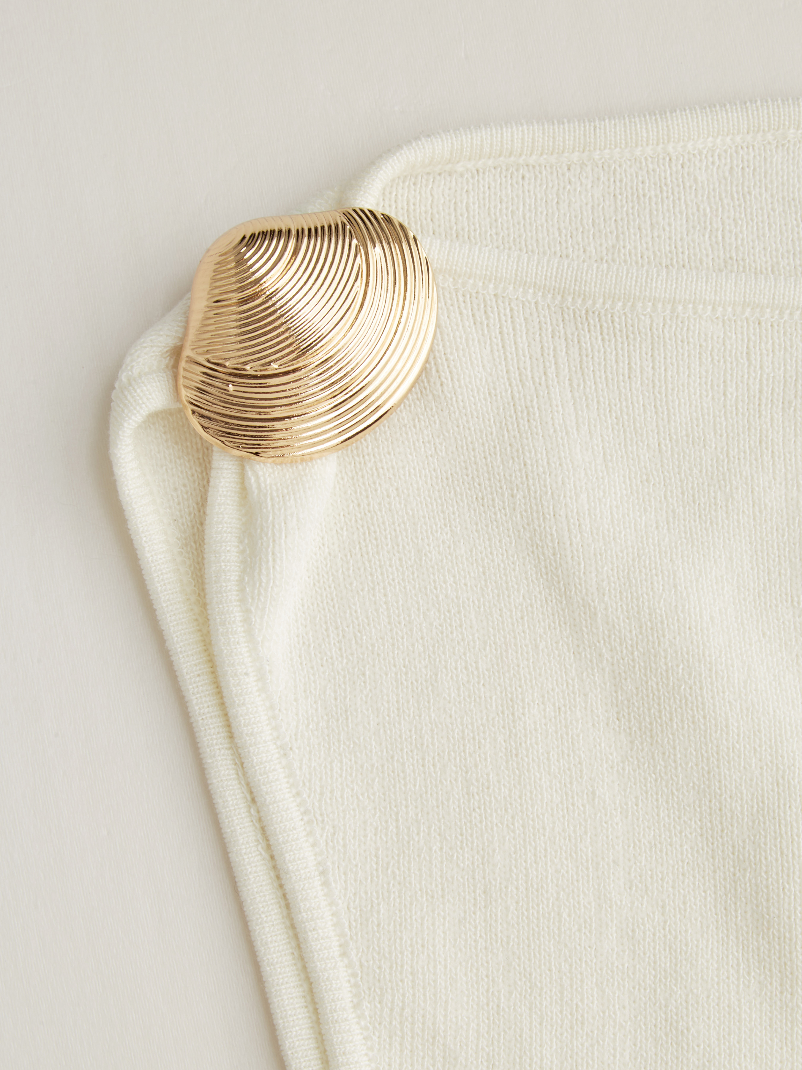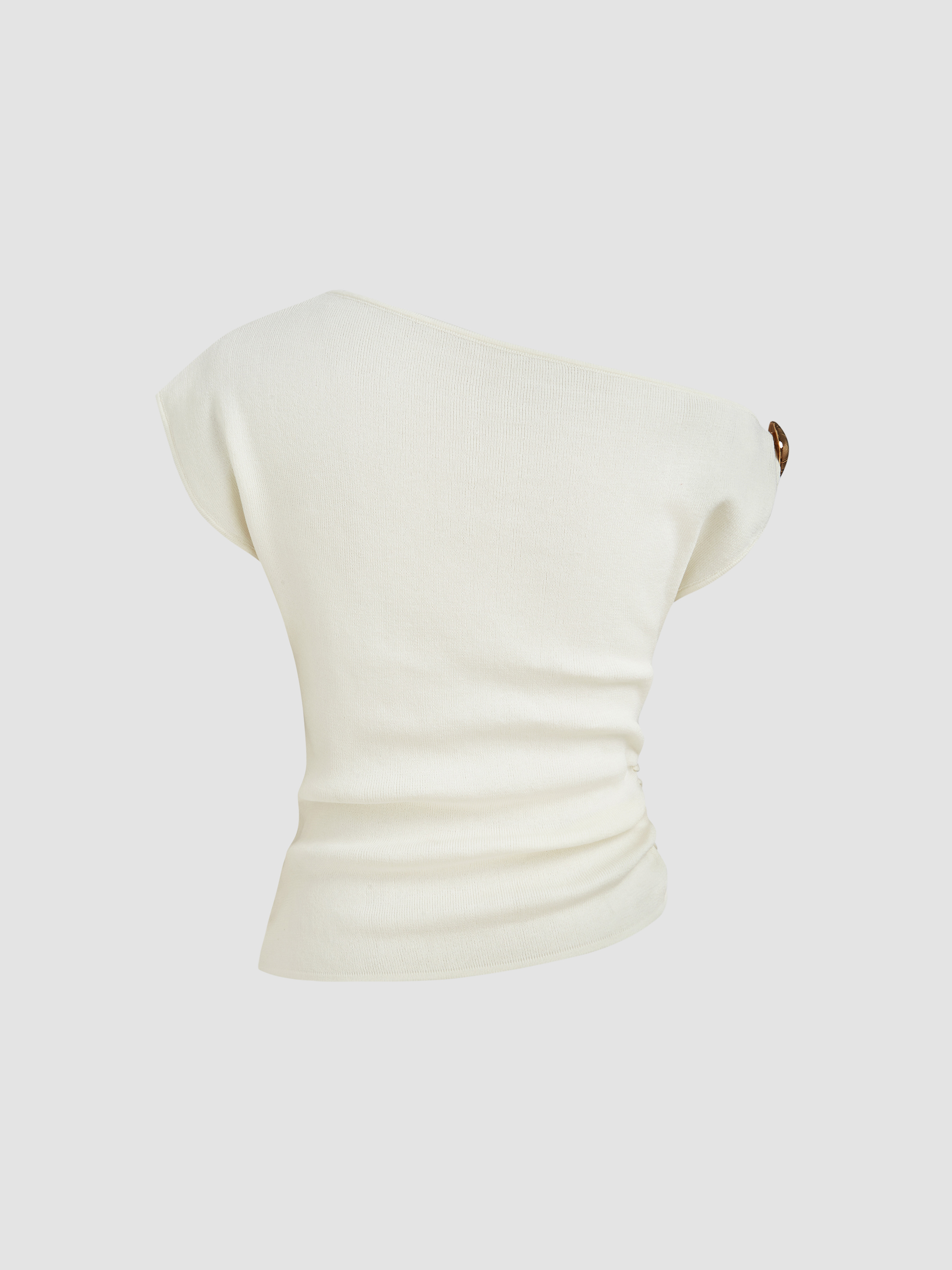Top lavorato a maglia asimmetrico con scollo a conchiglia, bottone in metallo e dettaglio arricciato