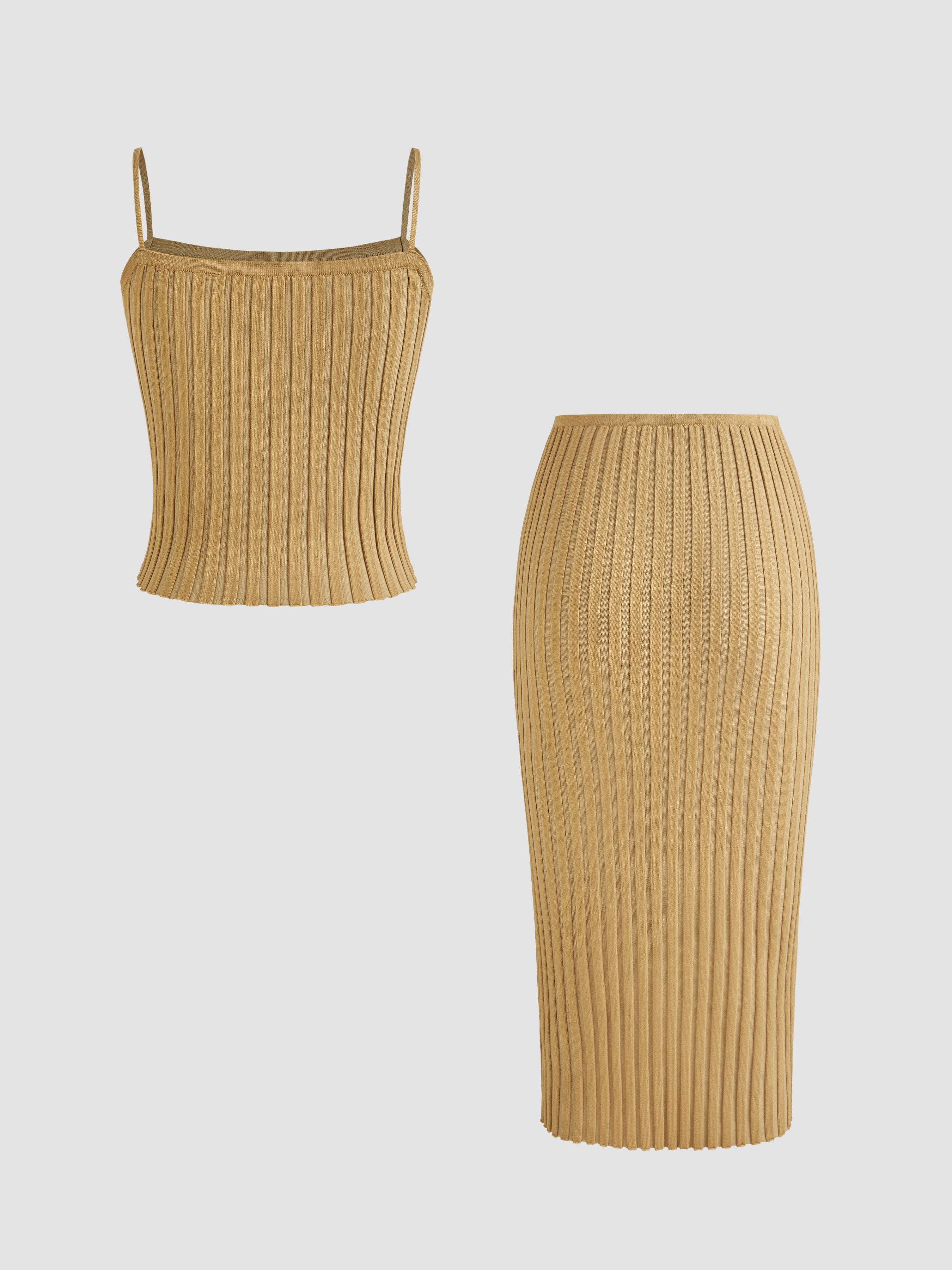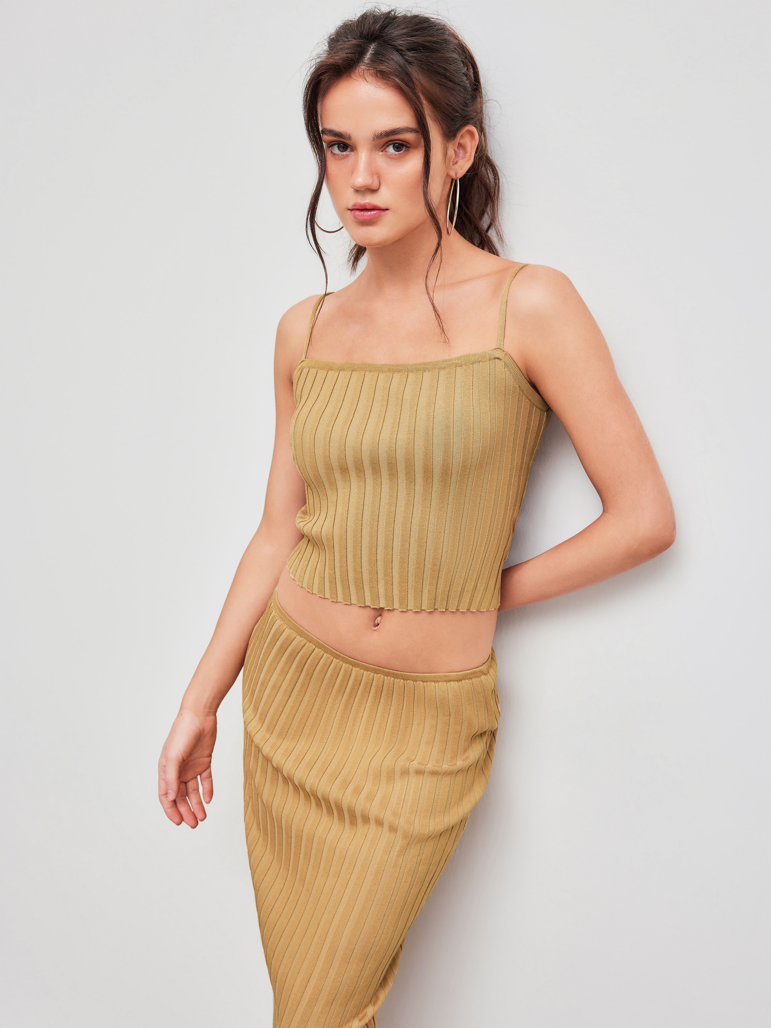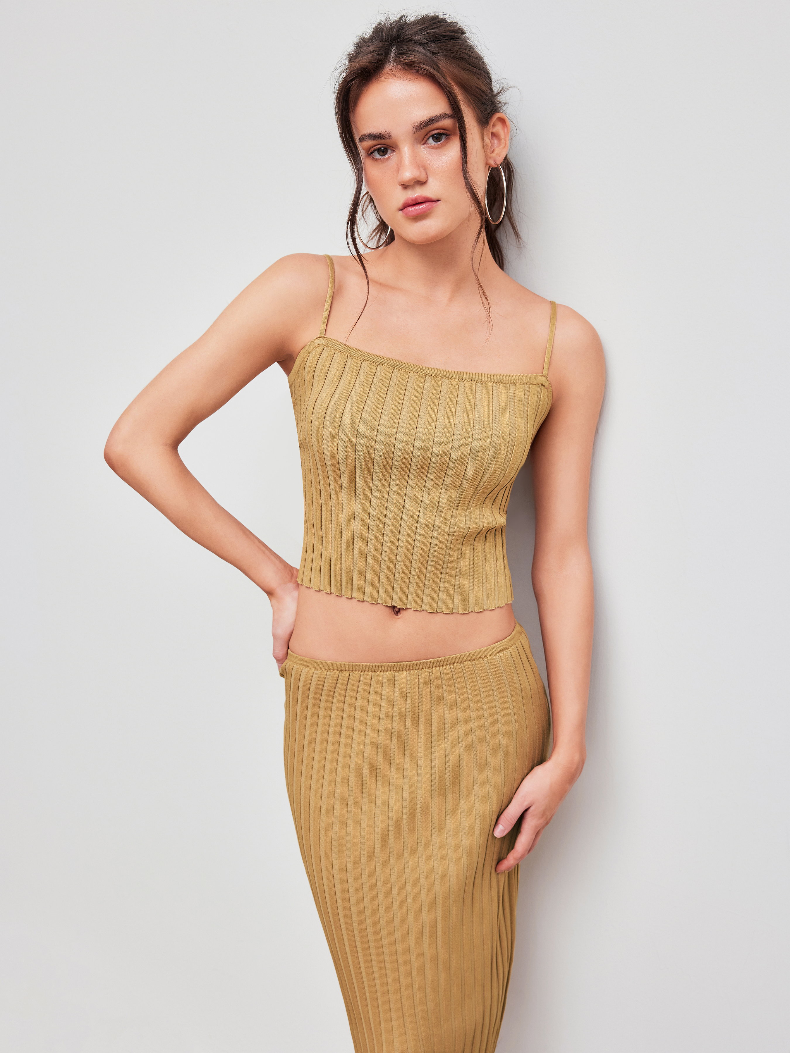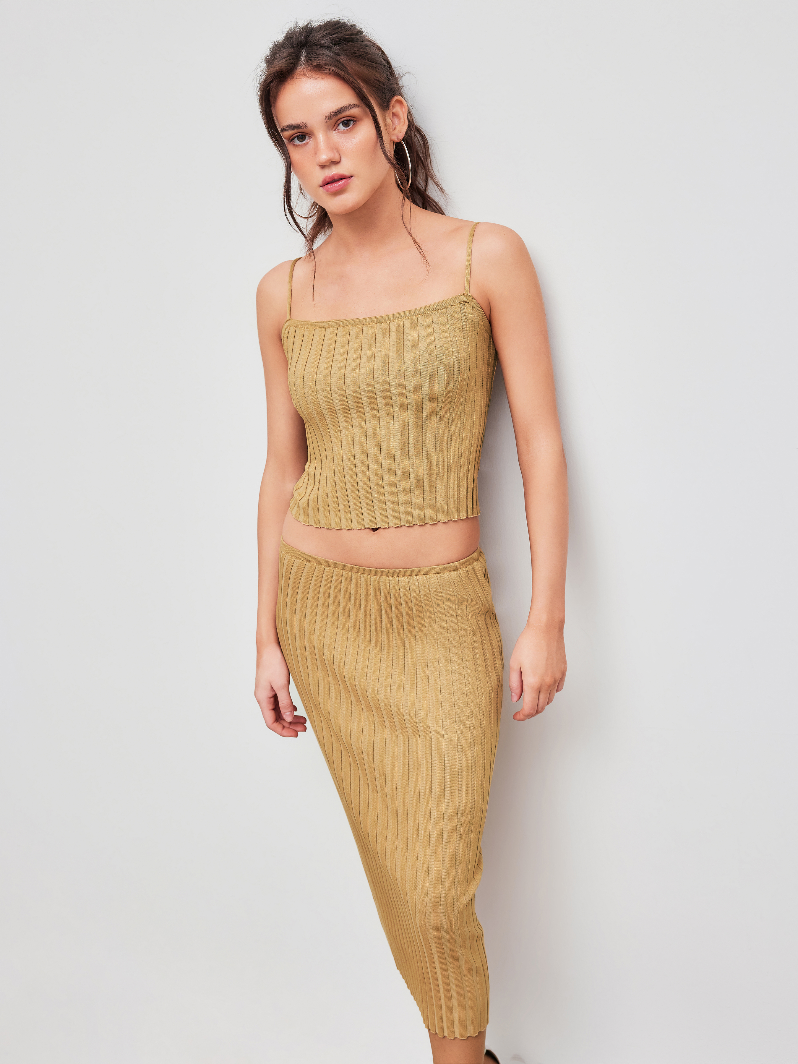 Top cami solido a collo quadrato in maglia con gonna midi solida a mezza vita in maglia