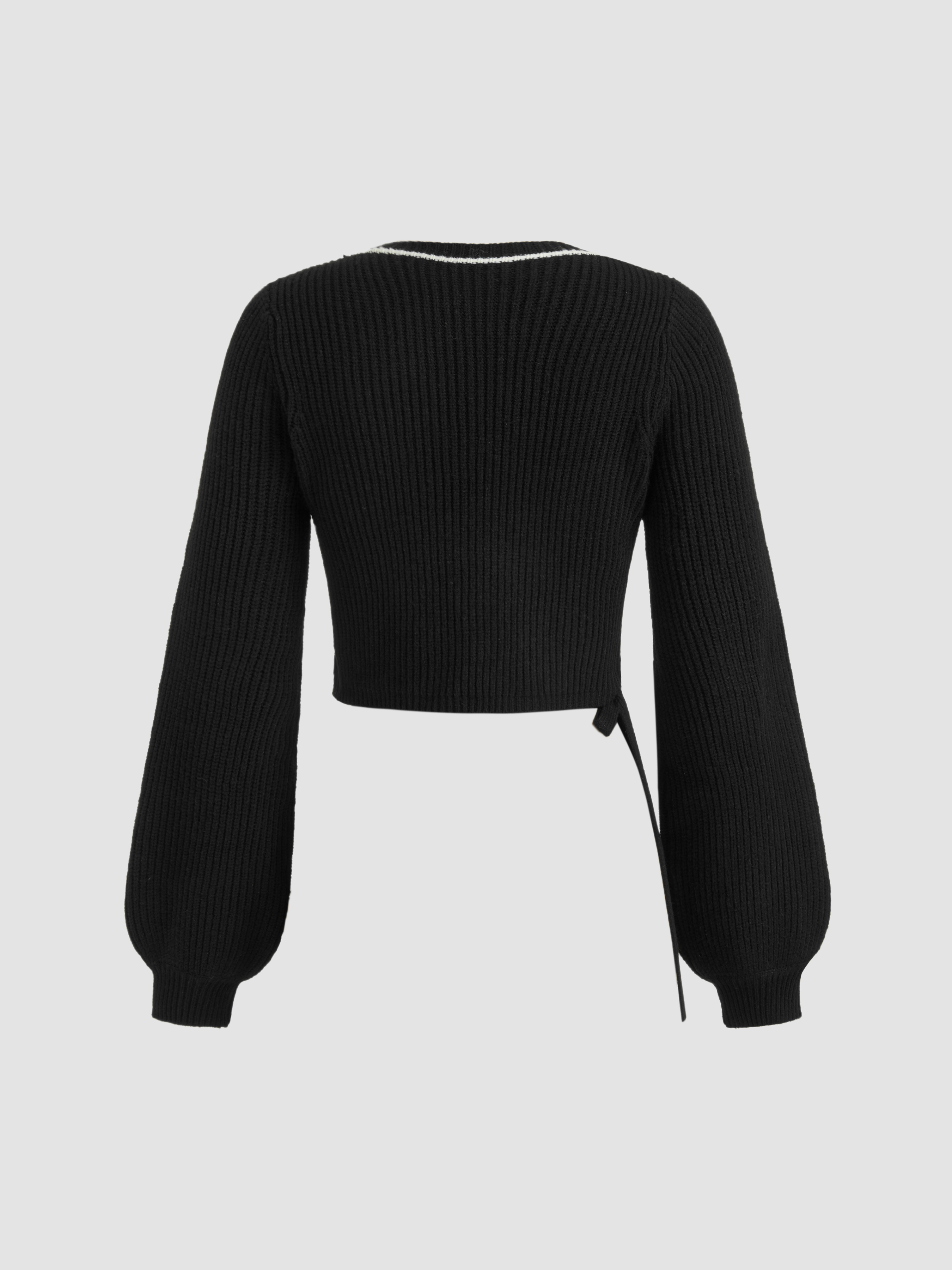 Top a maniche lunghe in maglia con scollo a V e legatura a contrasto