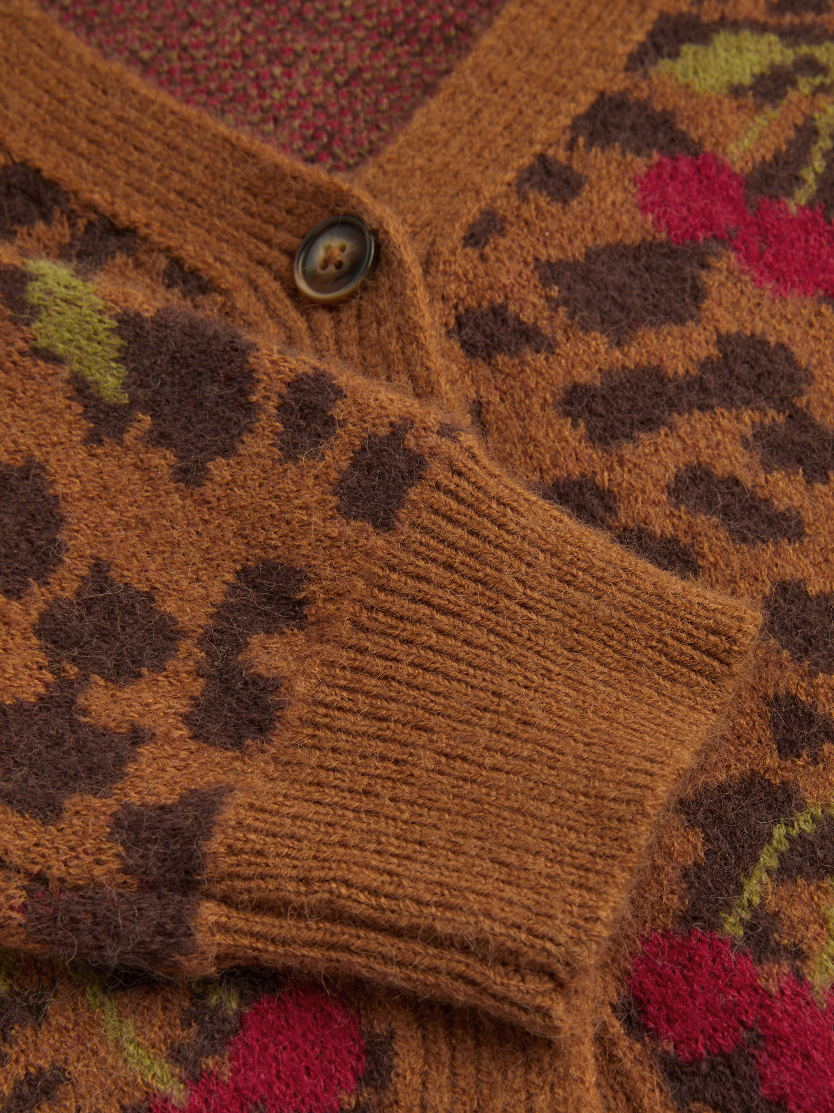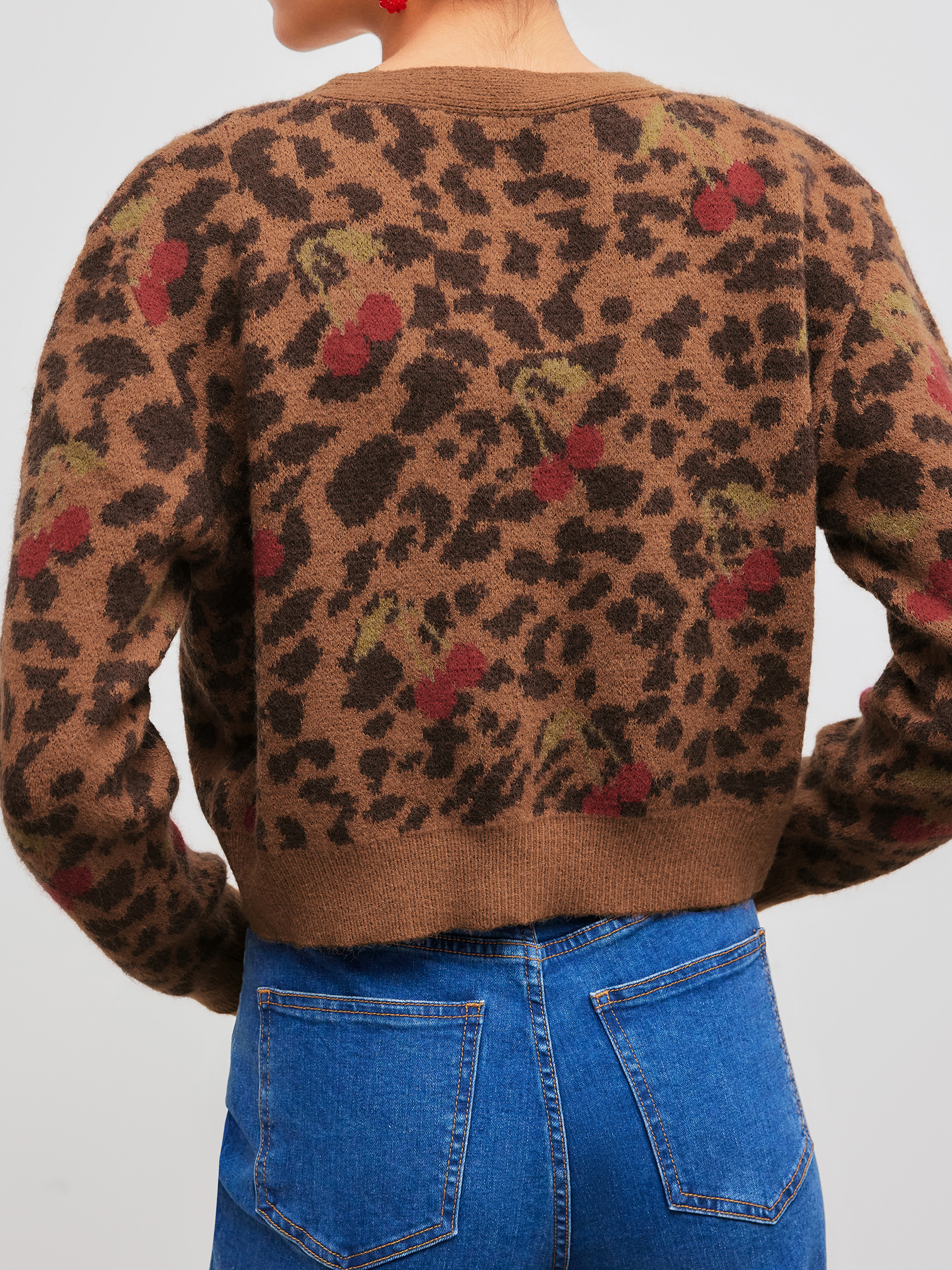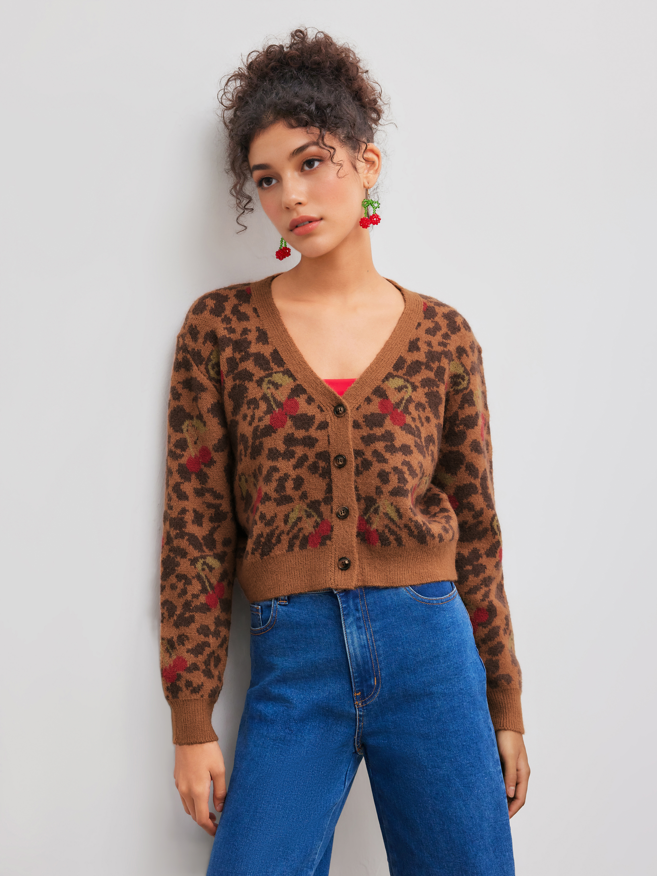 Cardigan in maglia con scollo a V e bottoni a forma di ciliegia leopardata