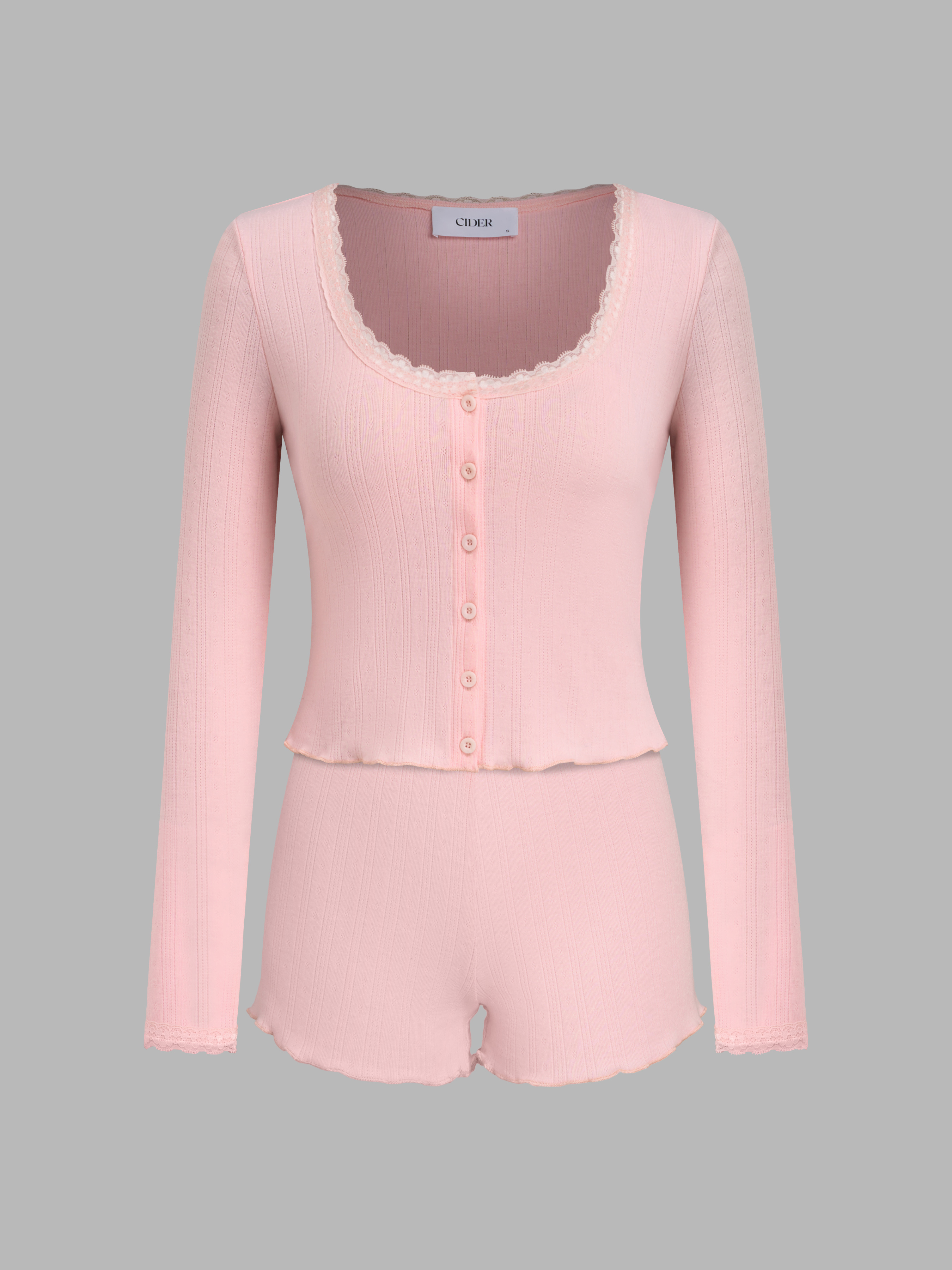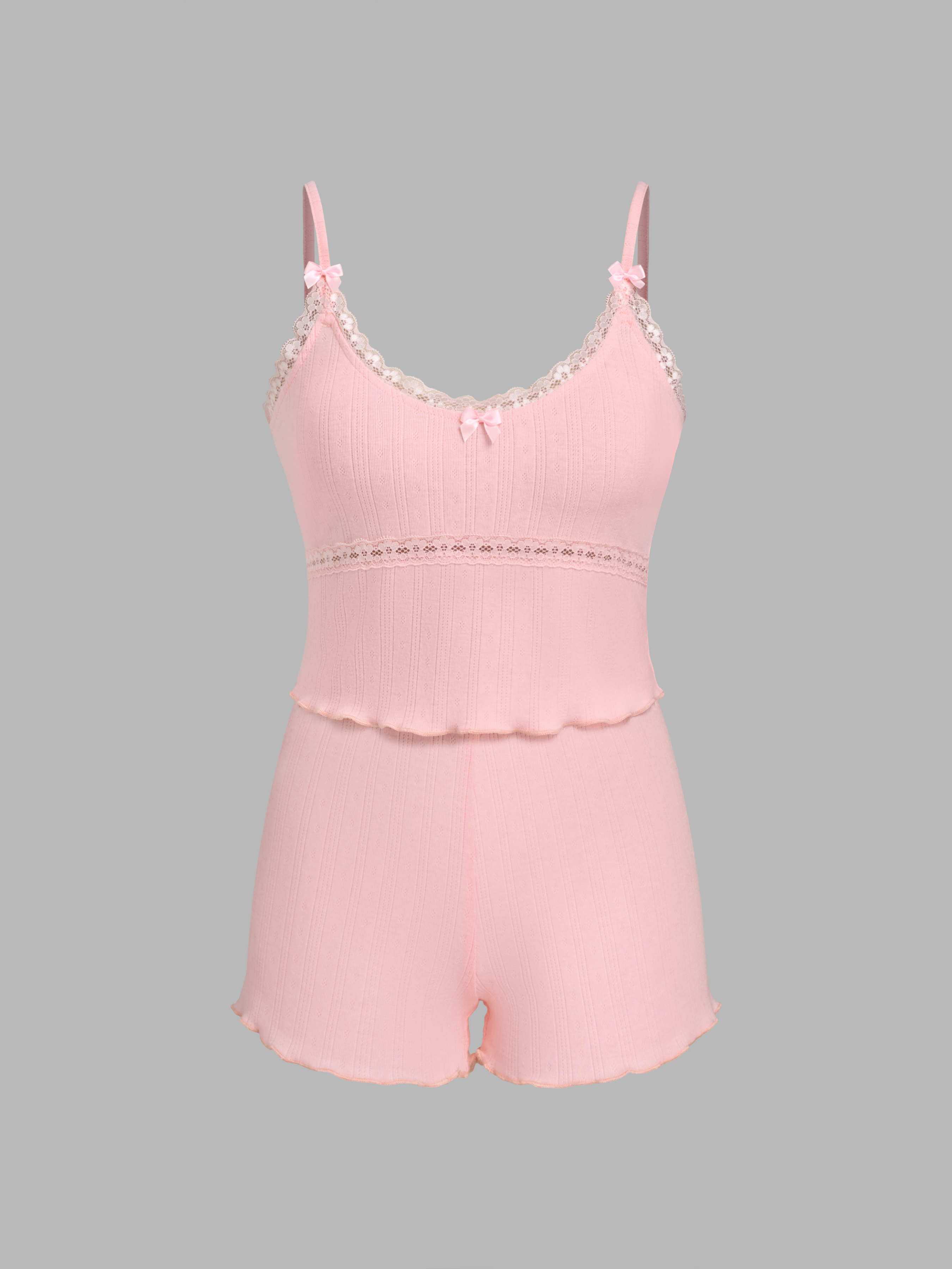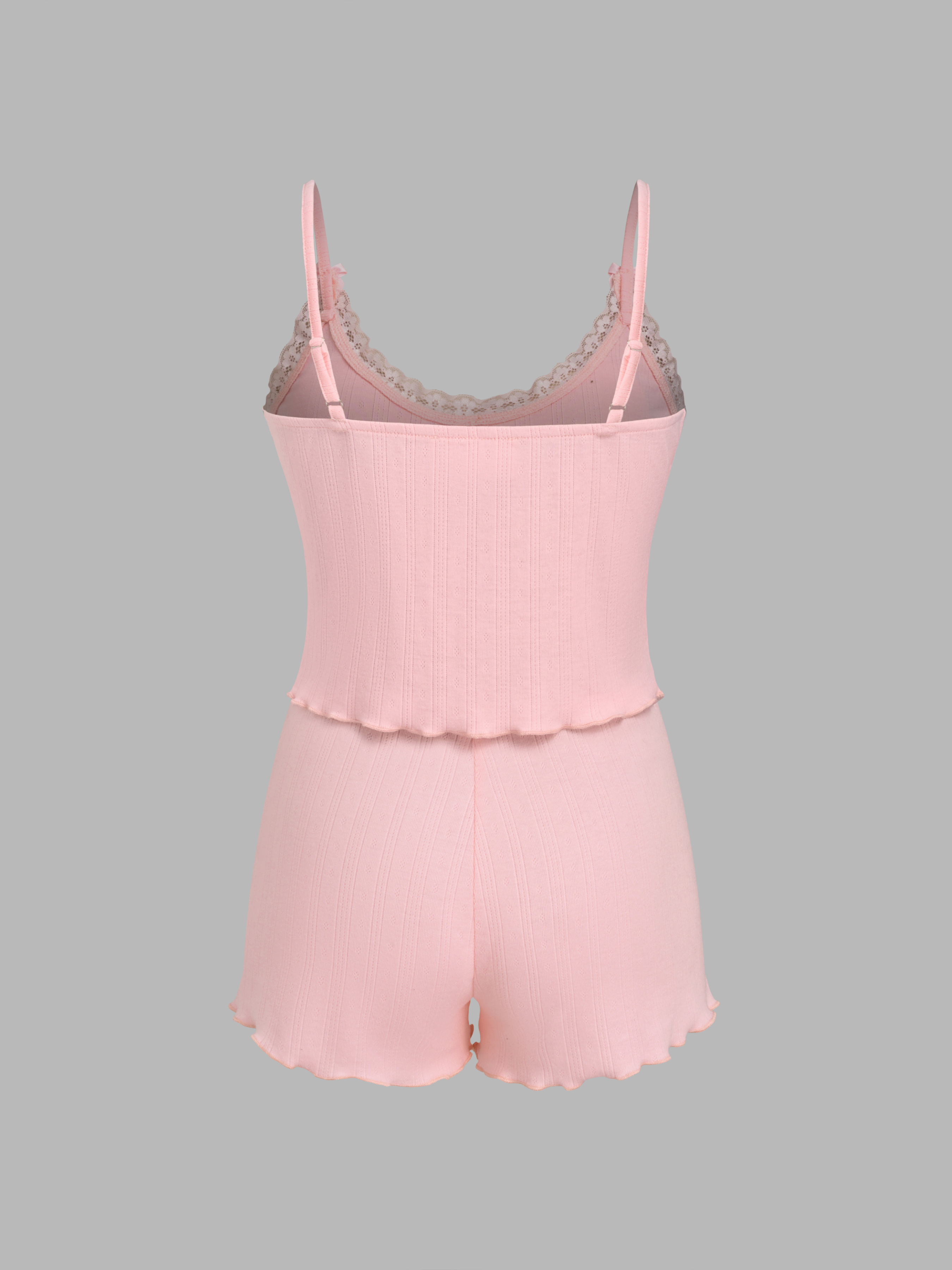 Top cami cropped con bordi in pizzo, coprispalle e pantaloncini a vita media