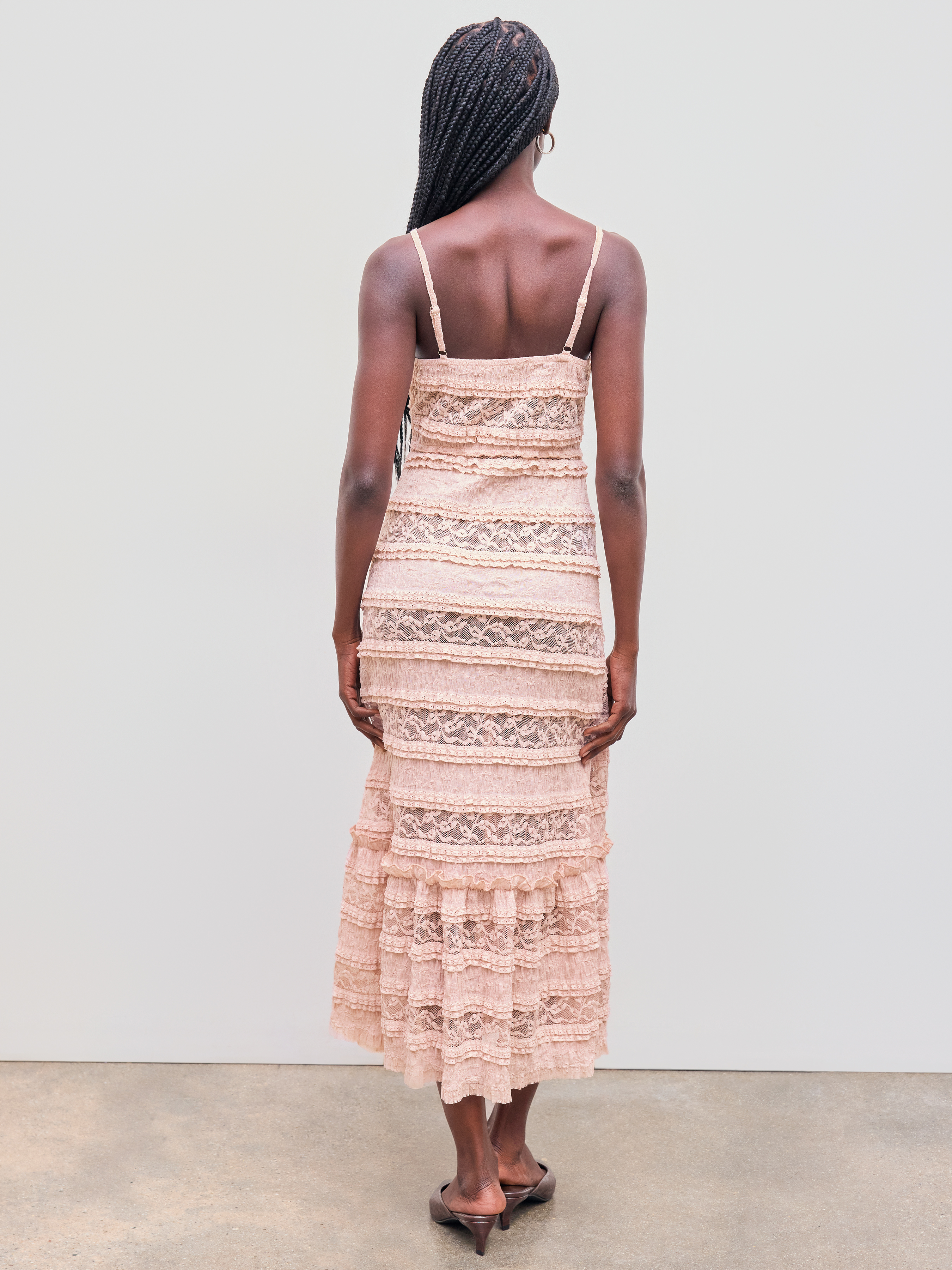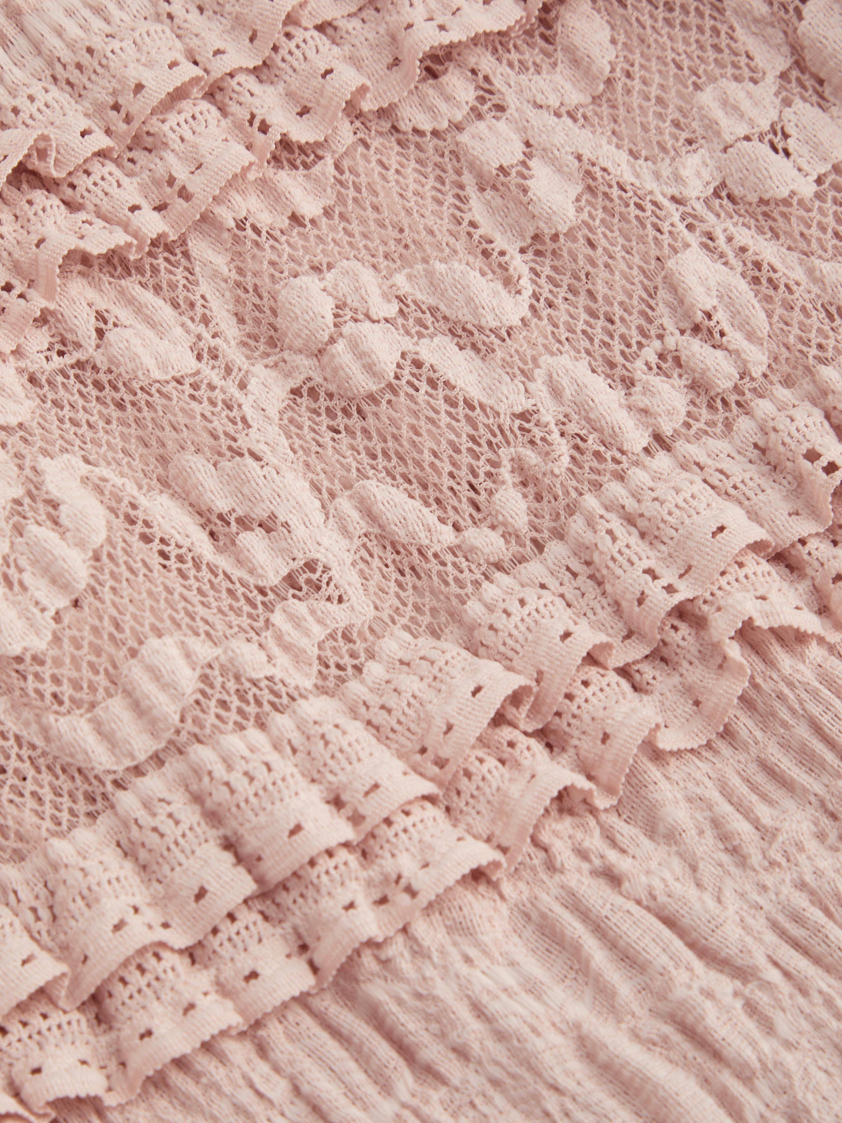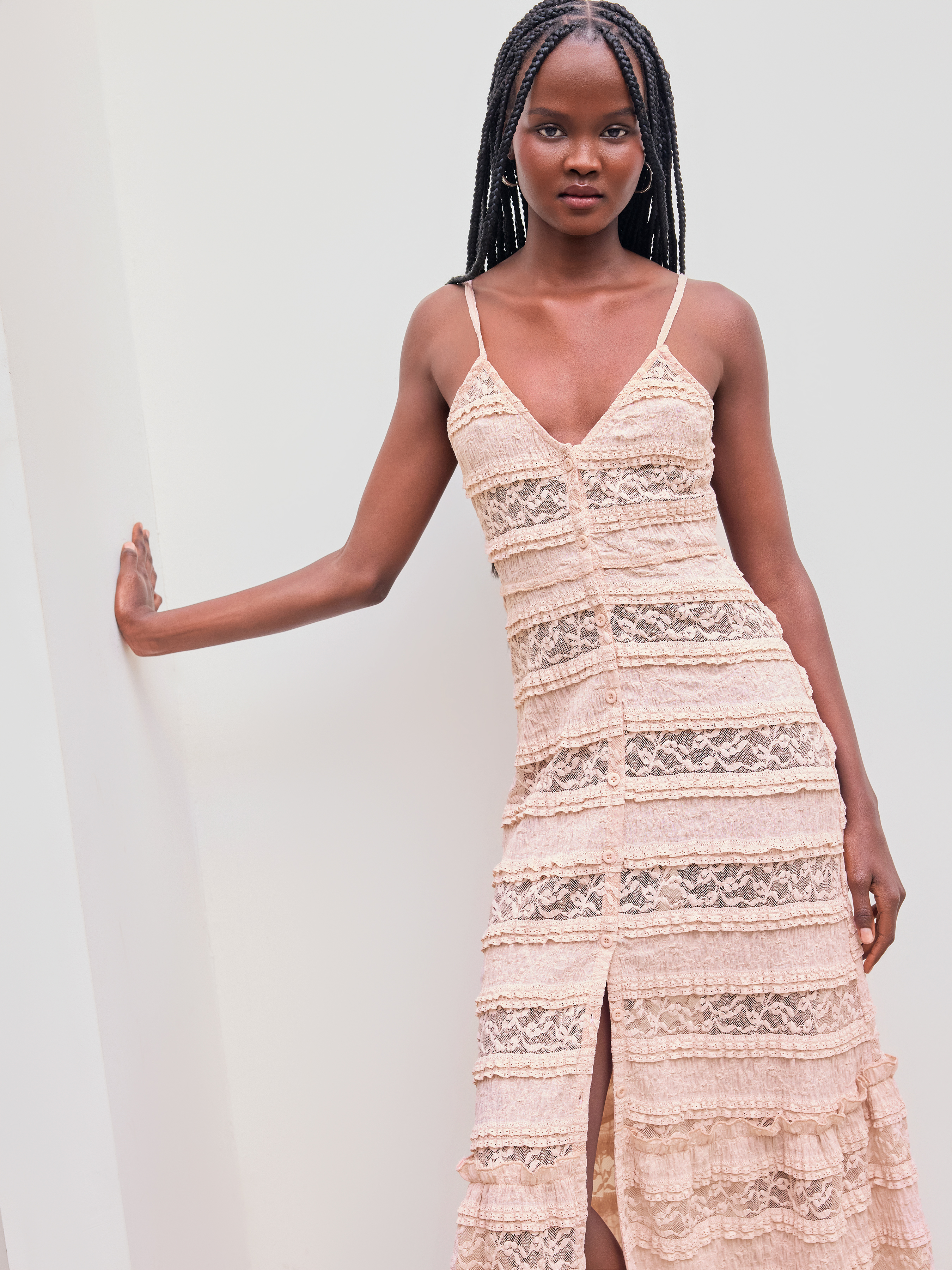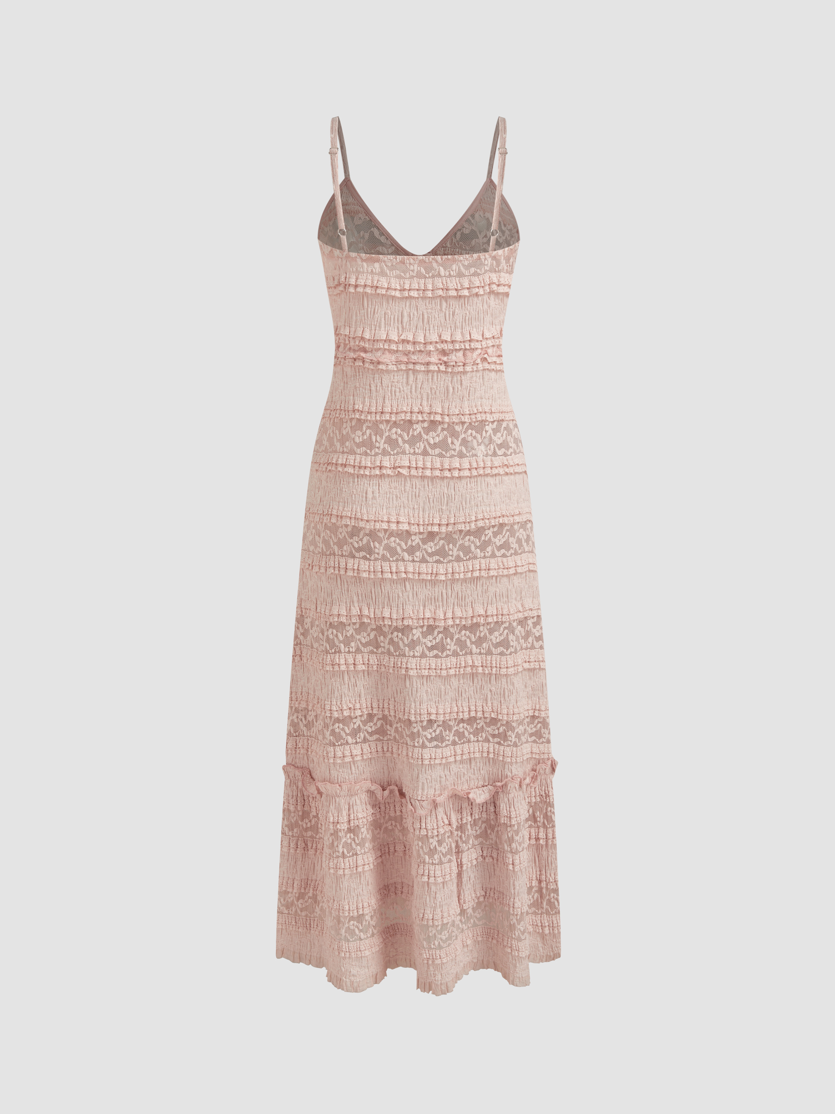 Maxi abito in pizzo con scollatura a V e bottoni a strati con bordo in lattuga