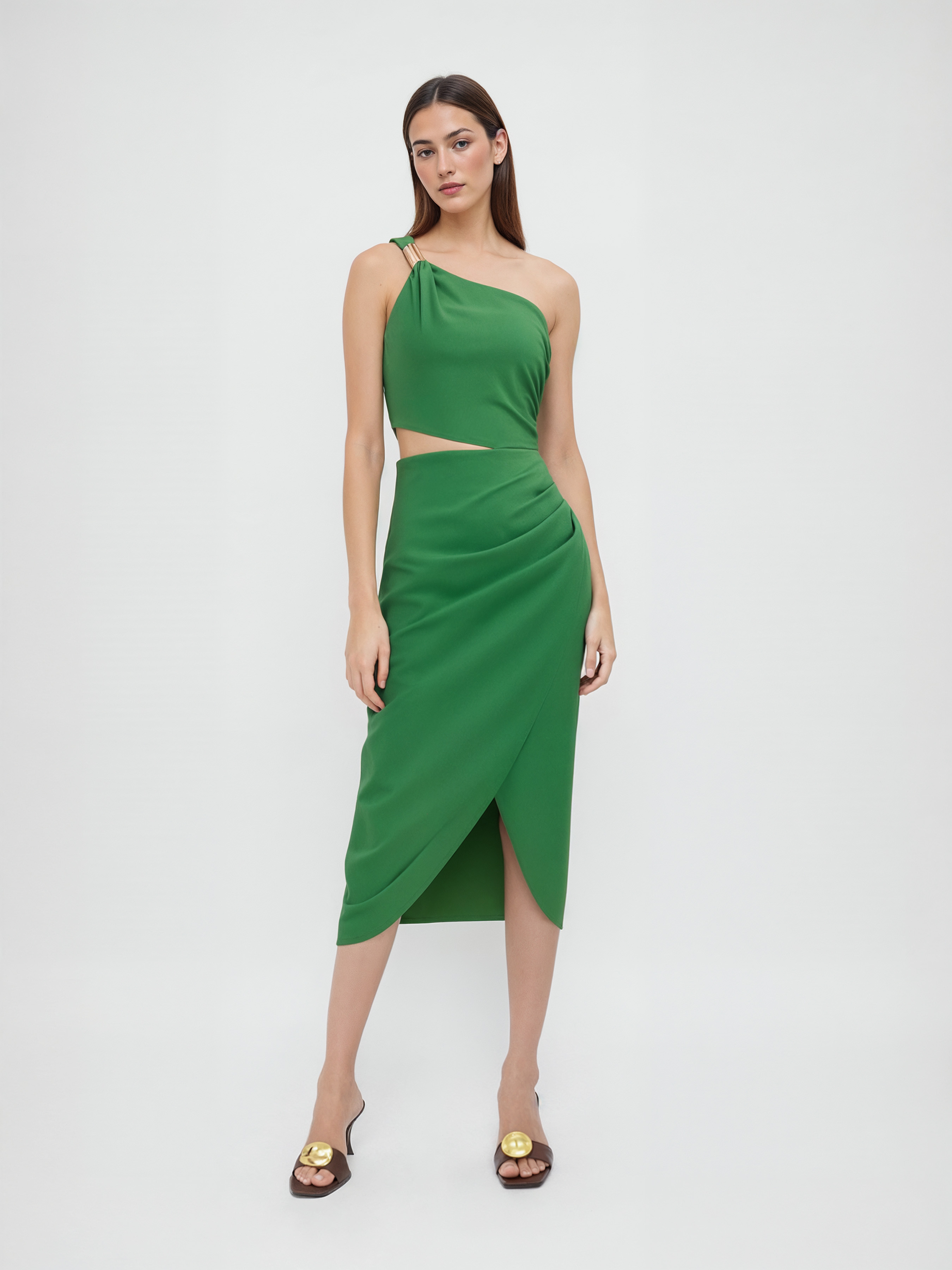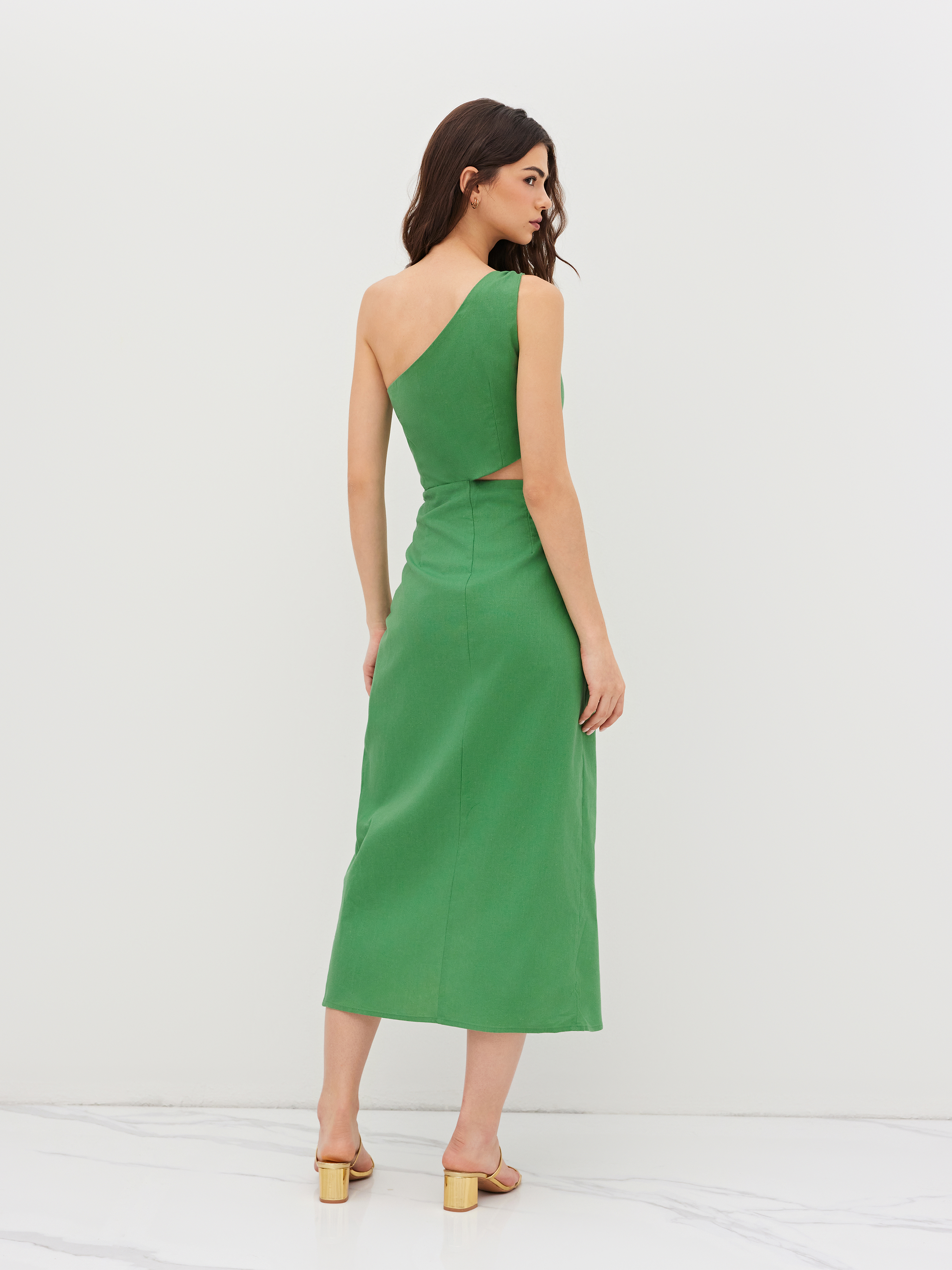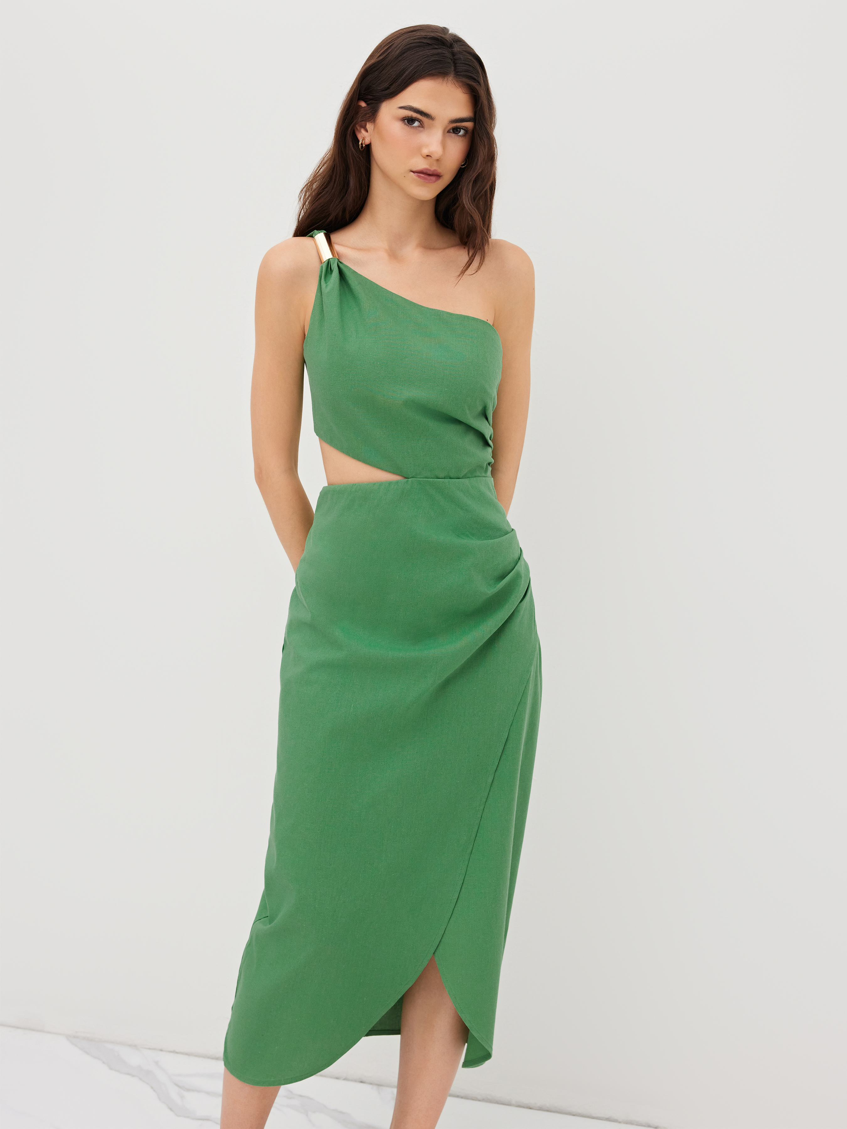 Abito midi asimmetrico in misto lino con dettaglio in metallo, cut-out e arricciature