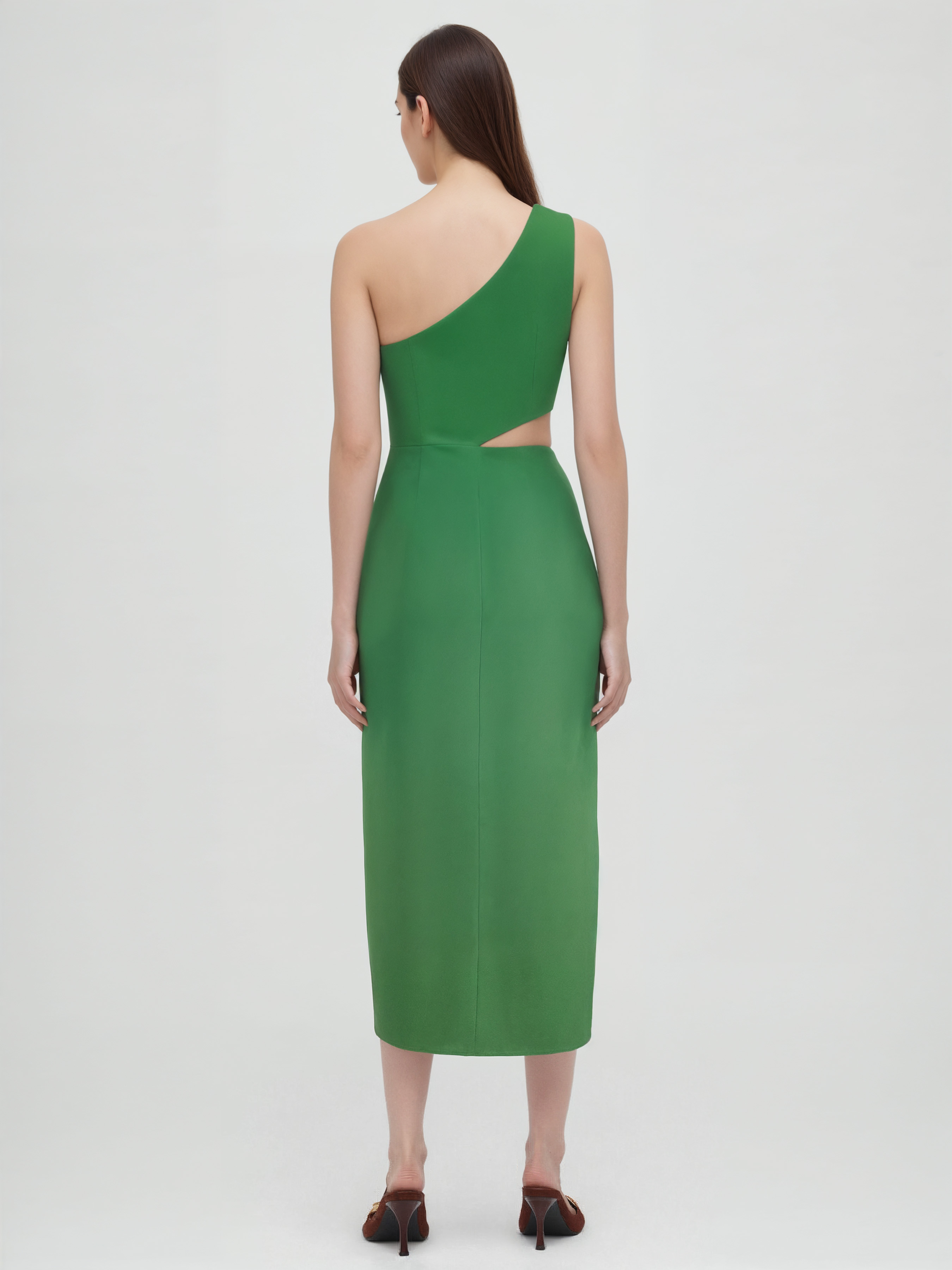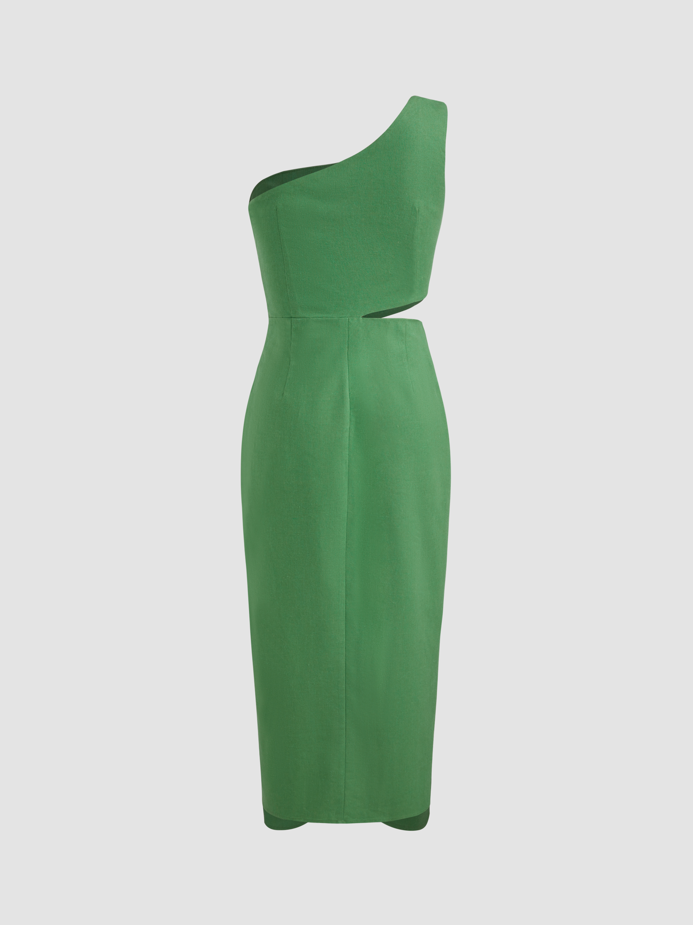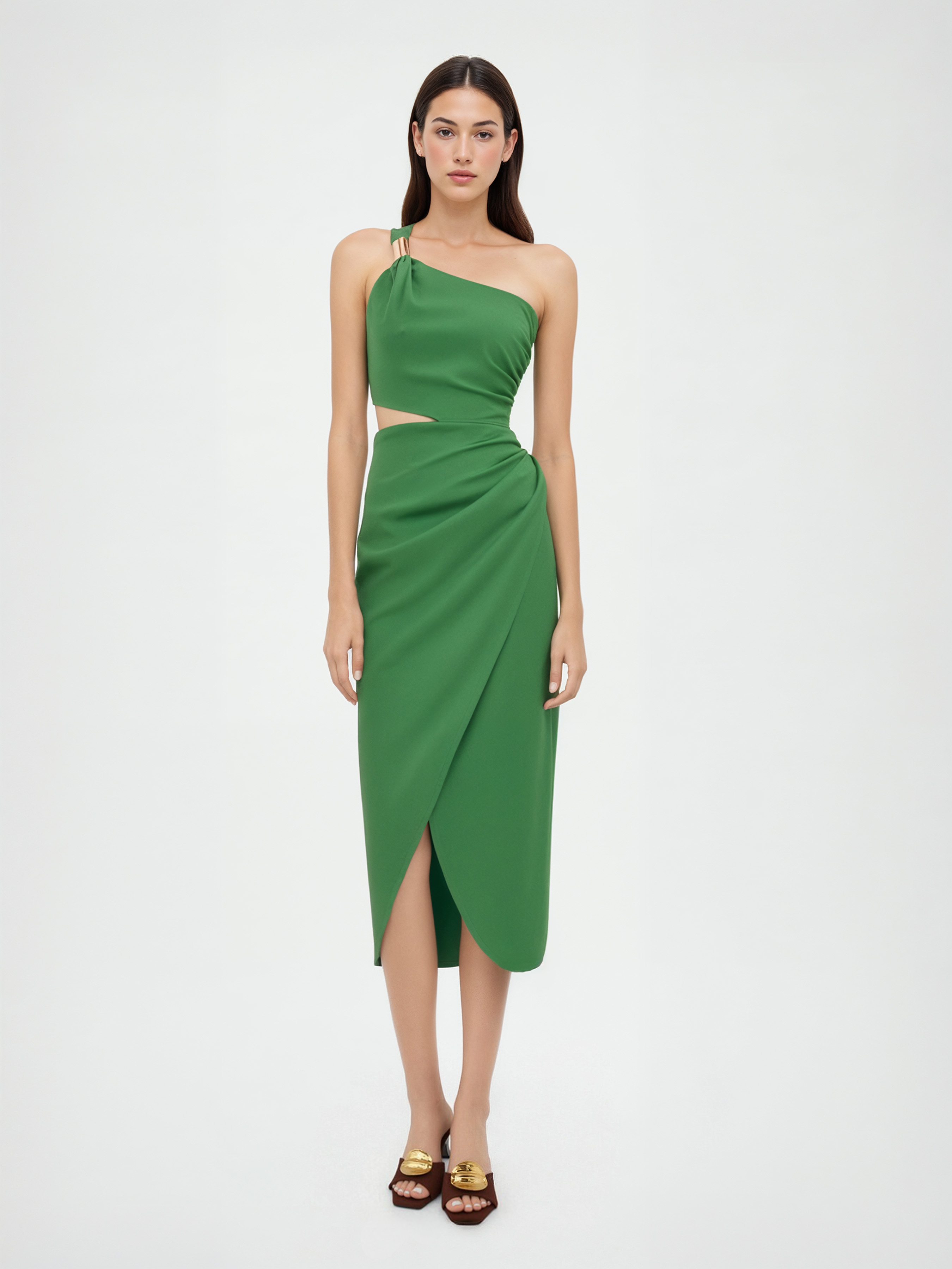 Abito midi asimmetrico in misto lino con dettaglio in metallo, cut-out e arricciature