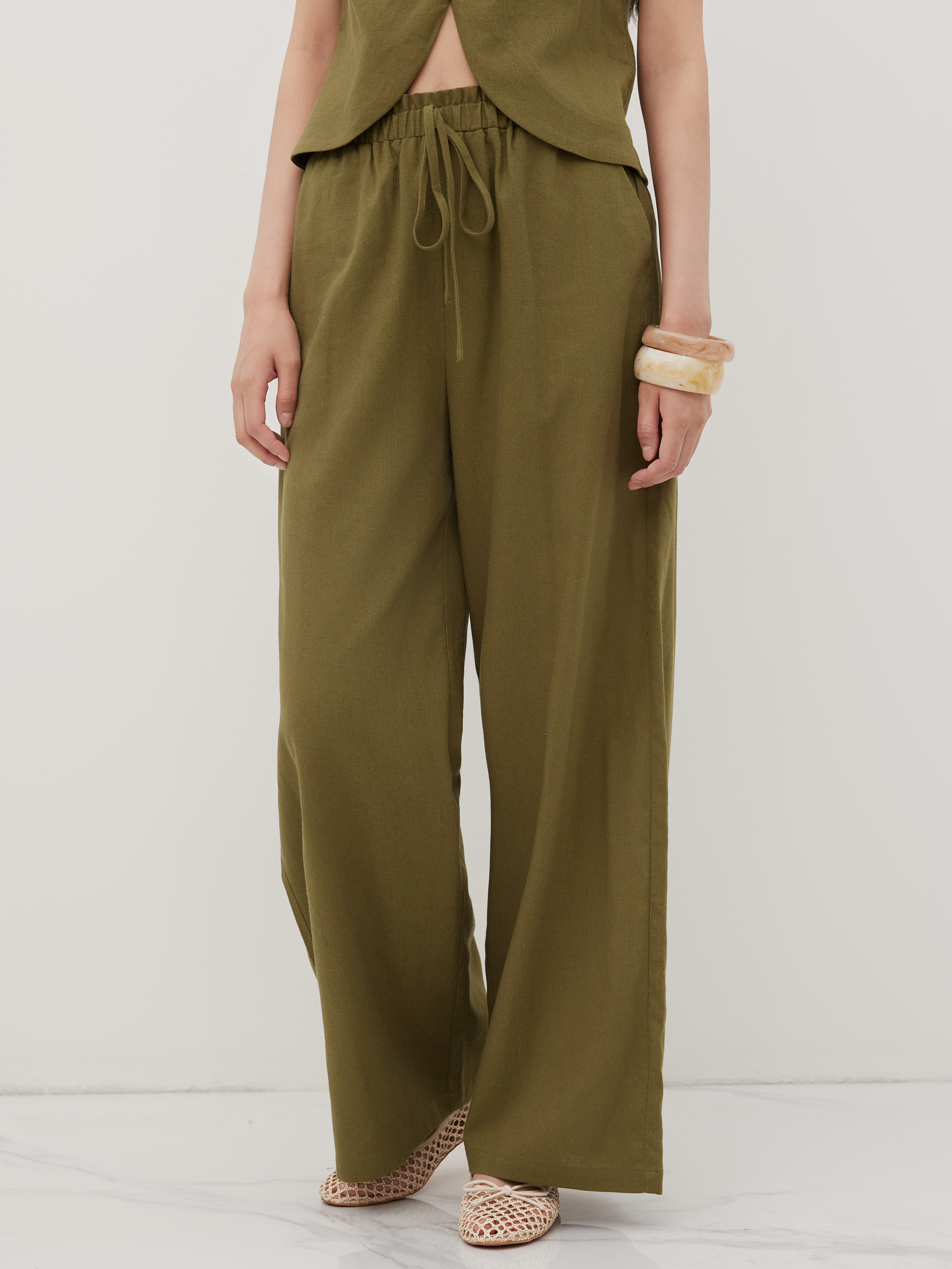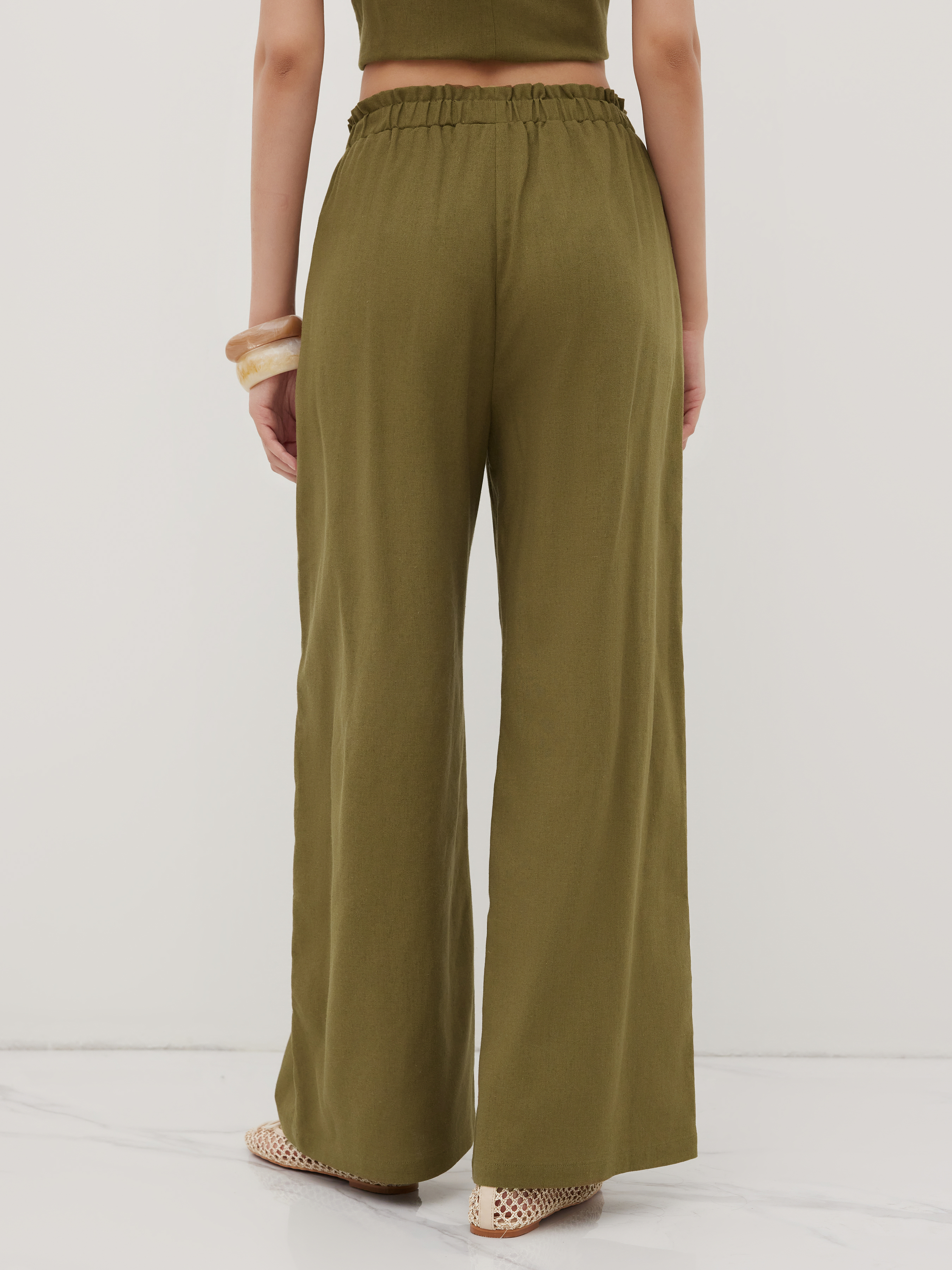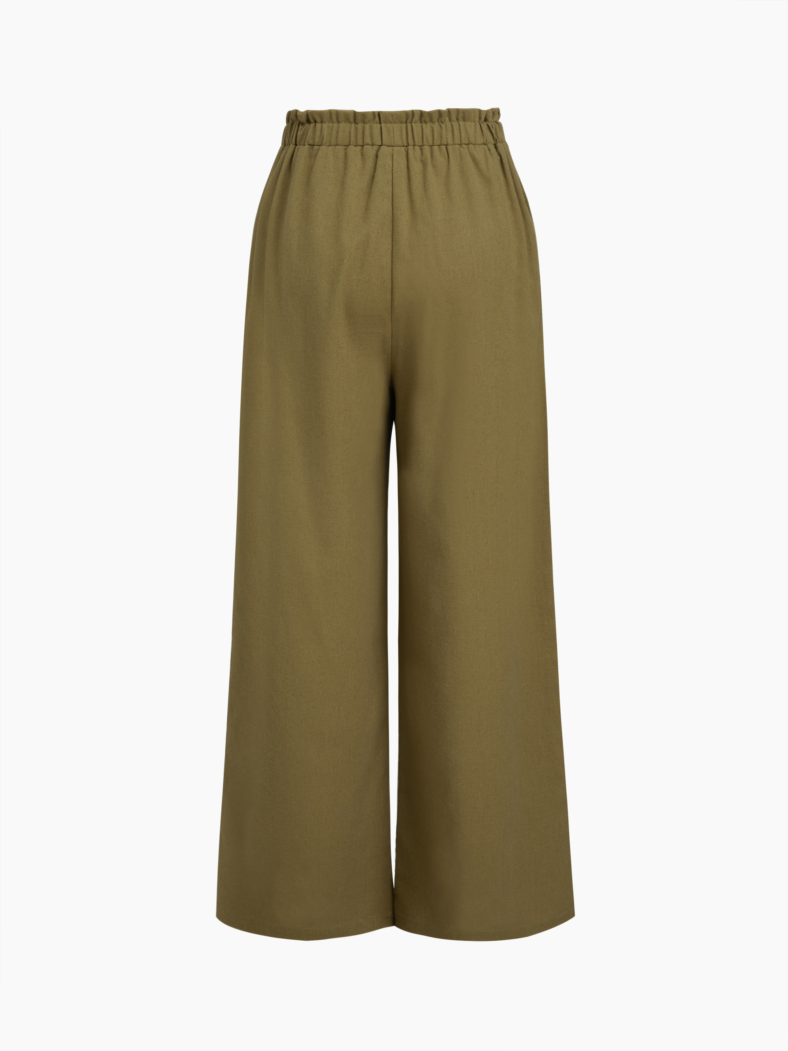 Pantaloni ampi a gamba larga a vita media con elastico in vita in misto lino