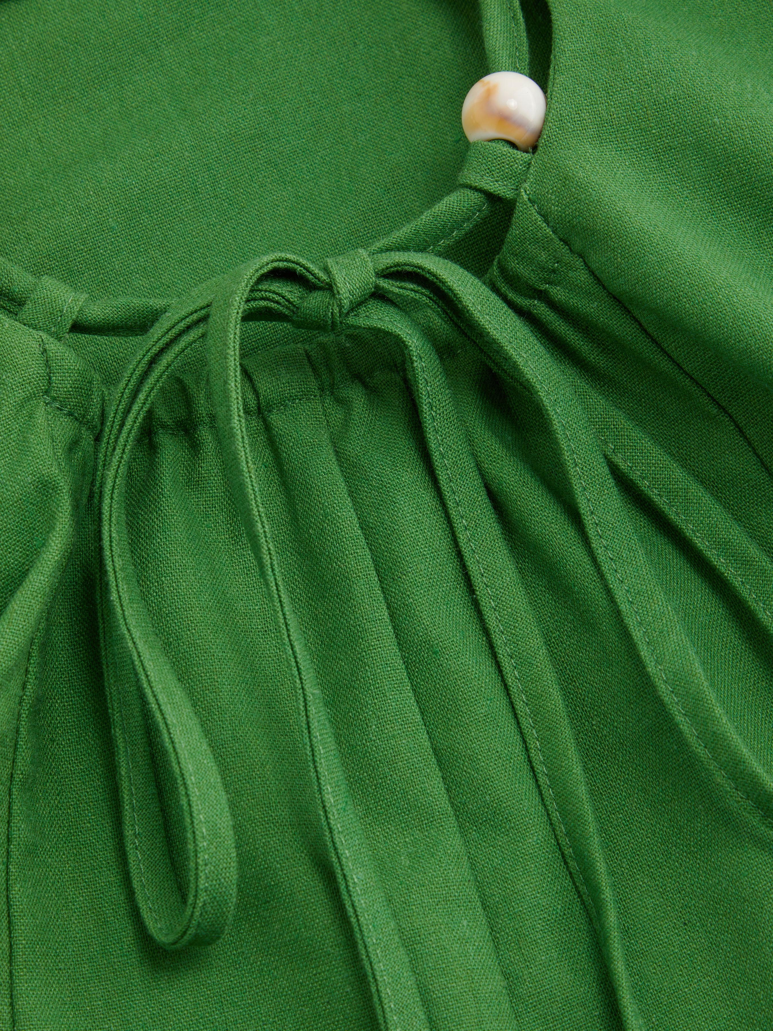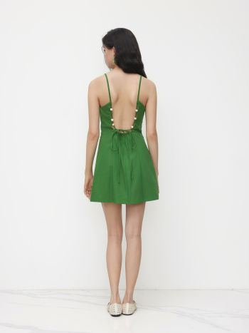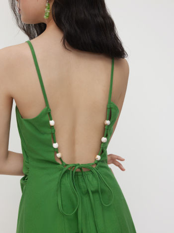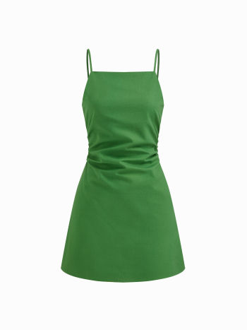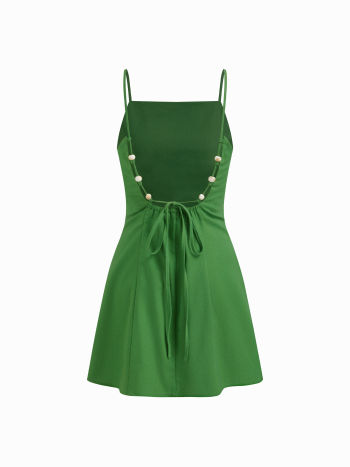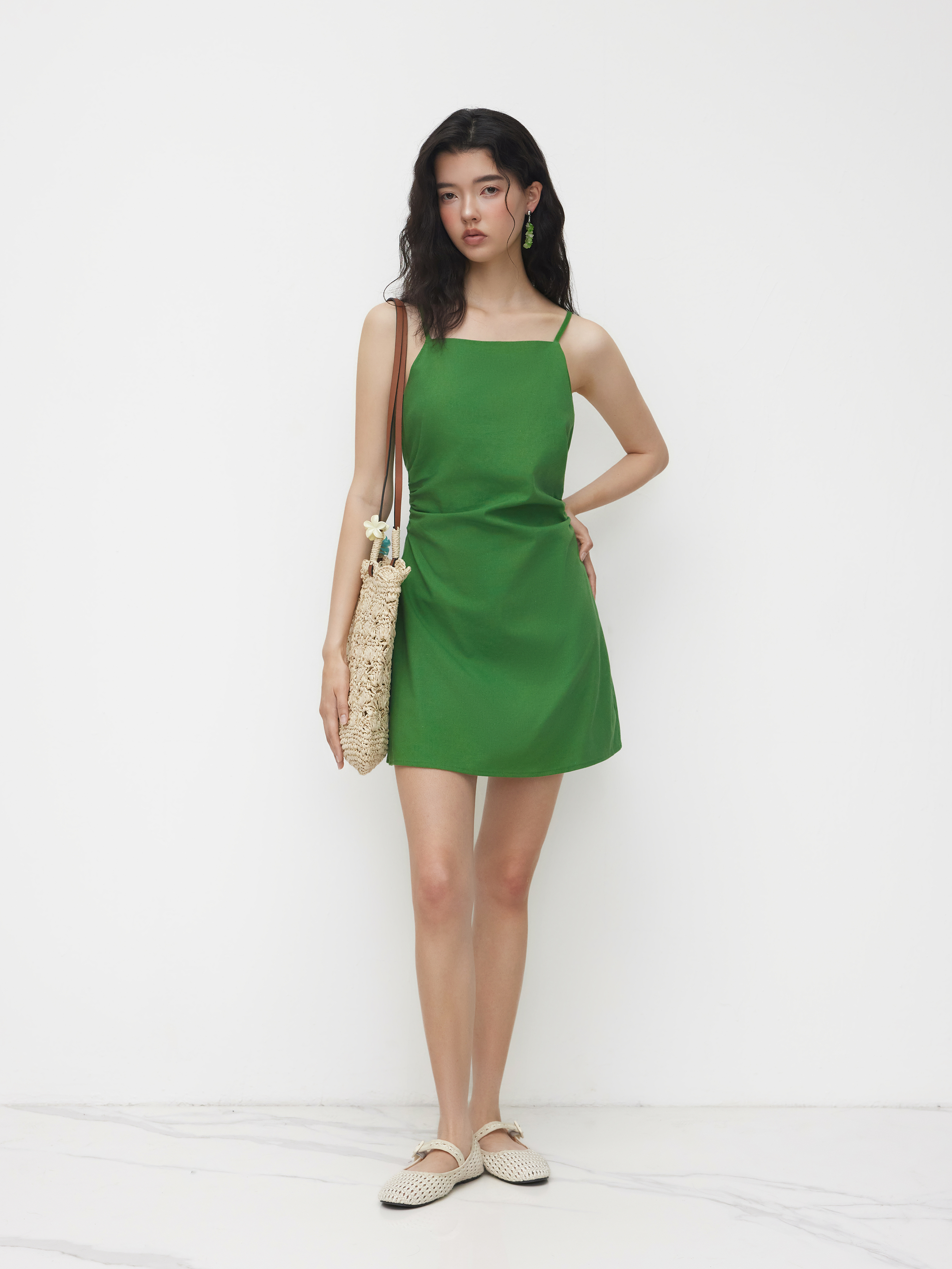 Mini abito senza schienale con ruches e perline, scollo quadrato in misto lino