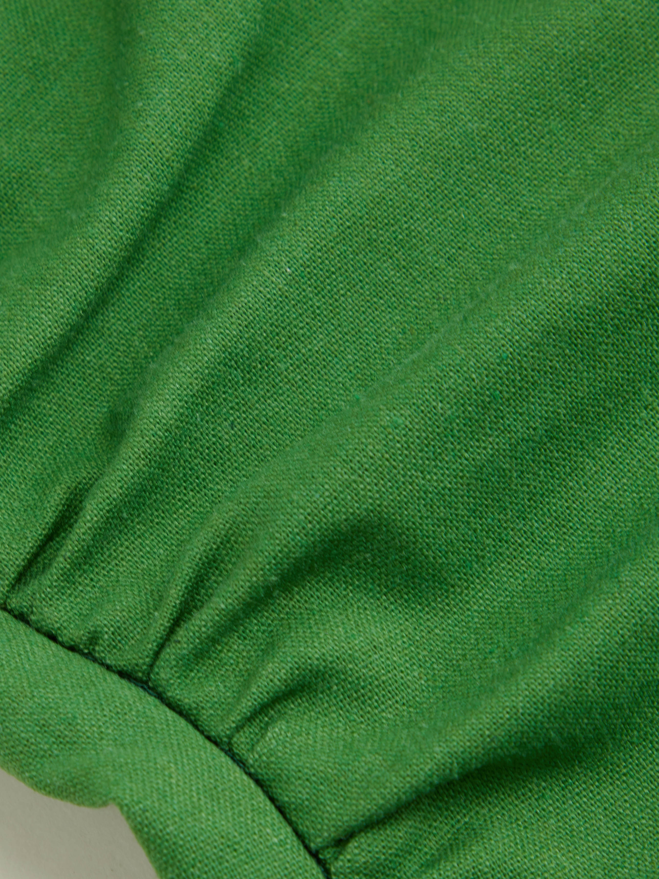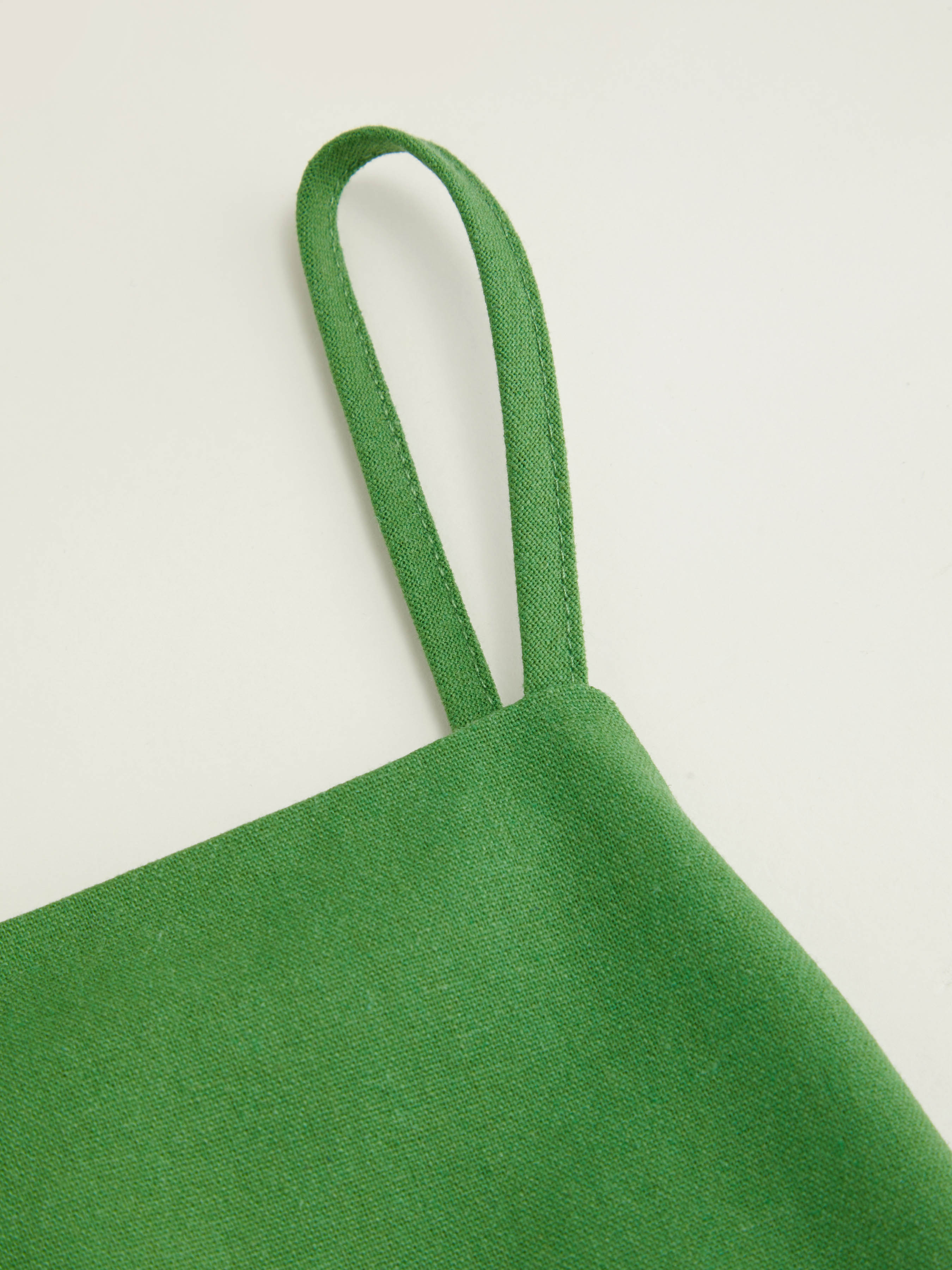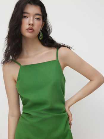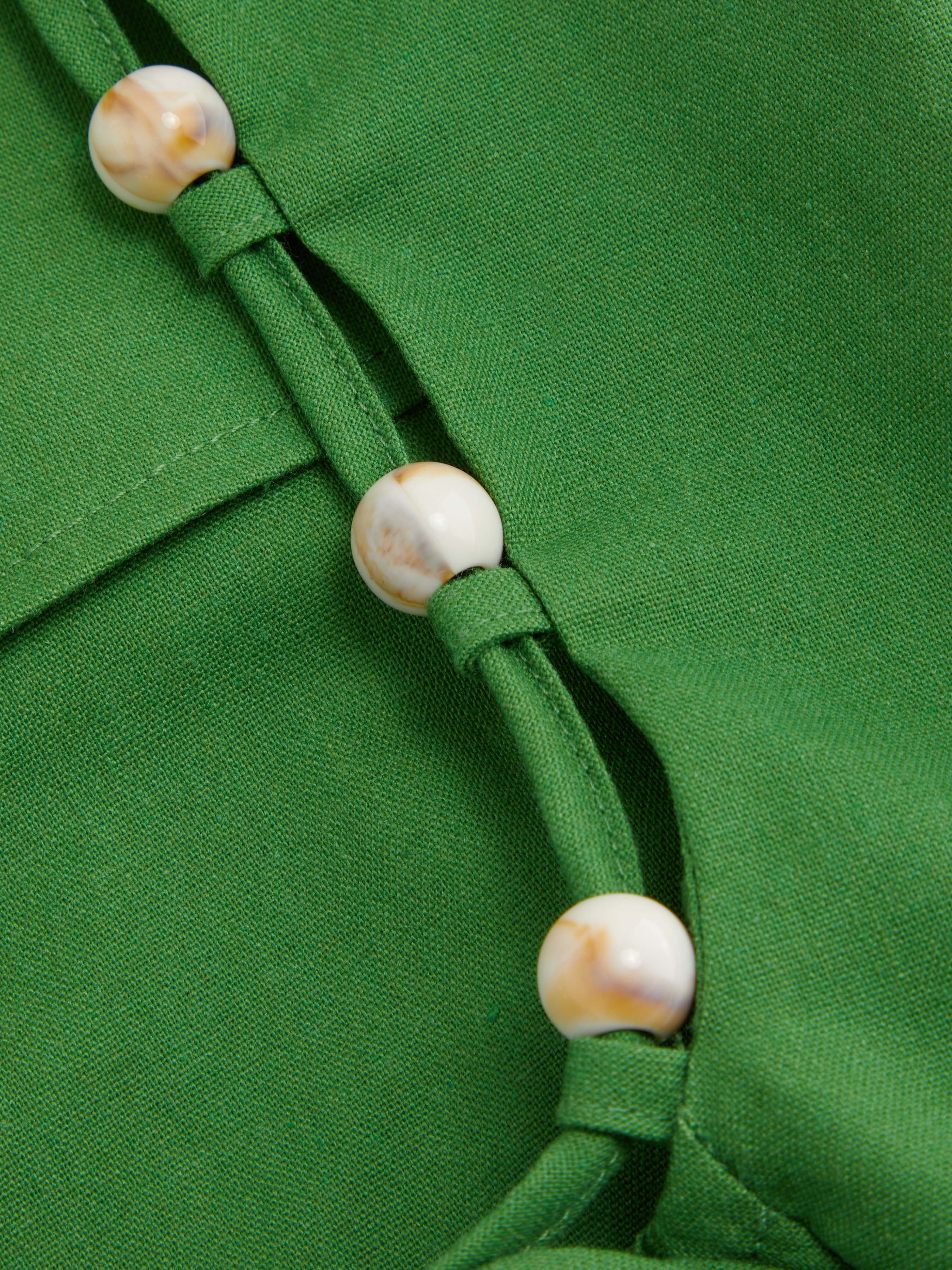 Mini abito senza schienale con ruches e perline, scollo quadrato in misto lino
