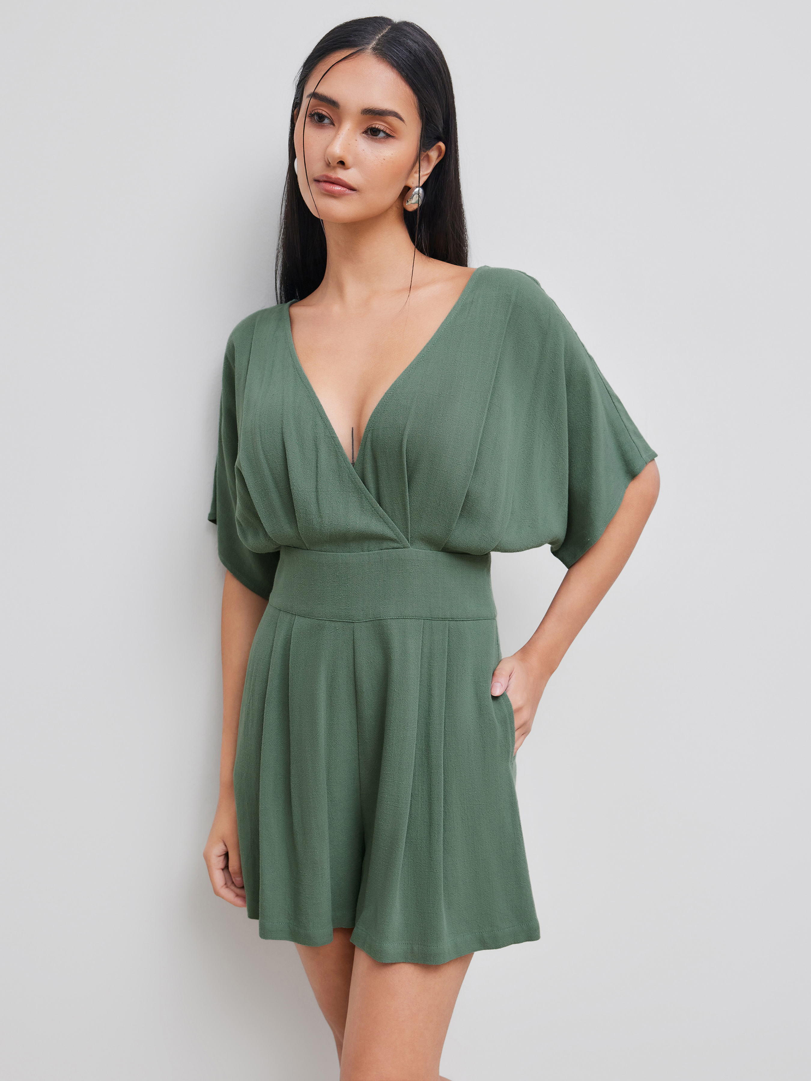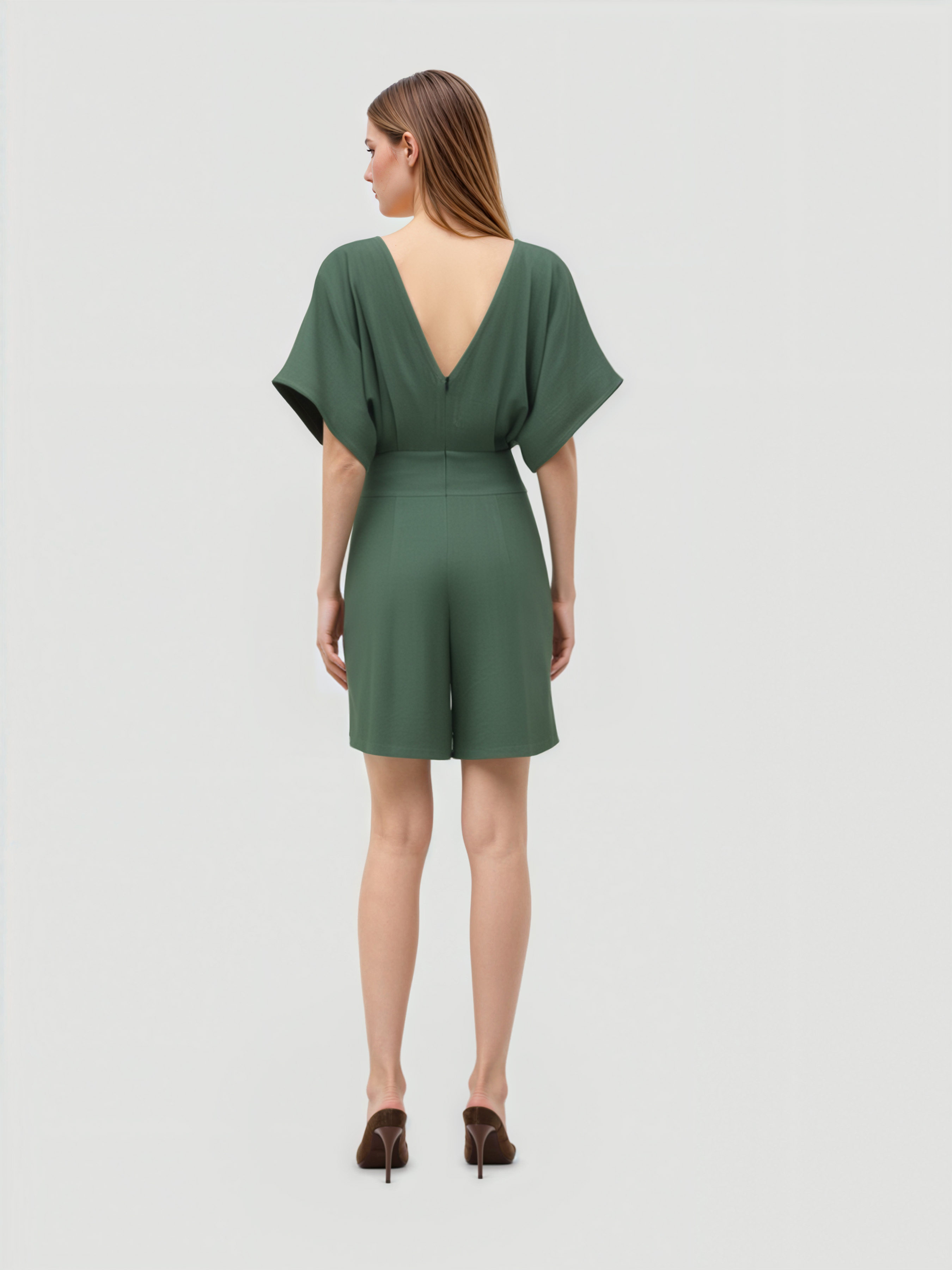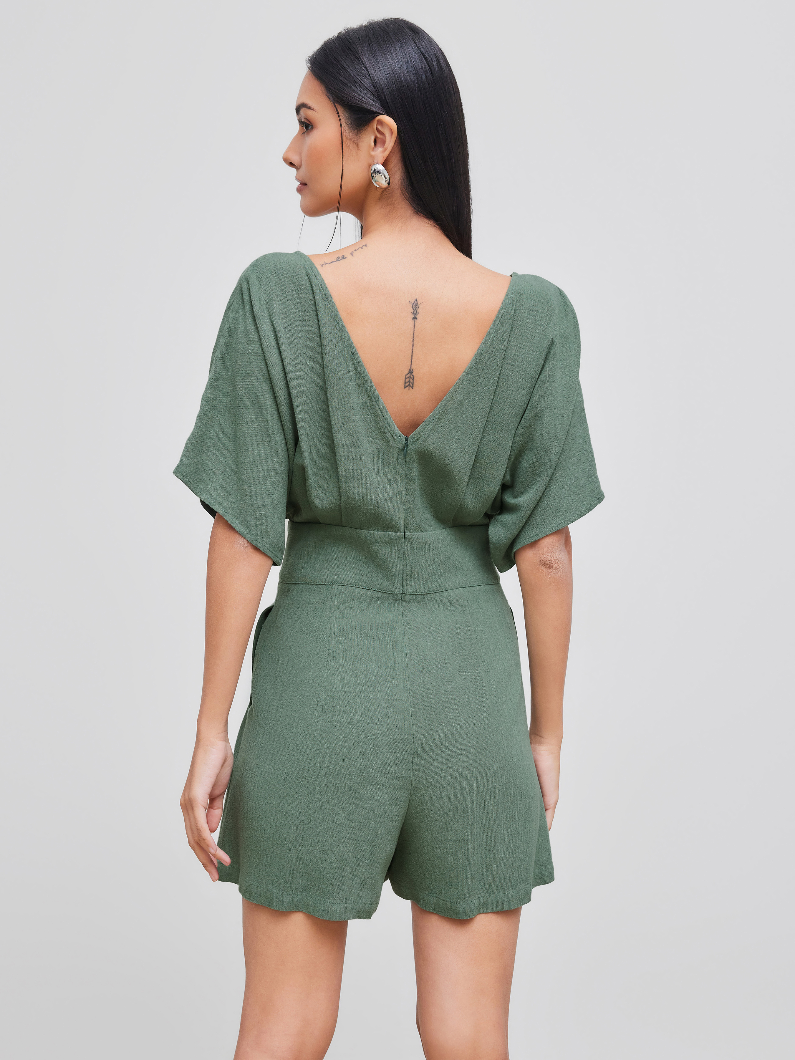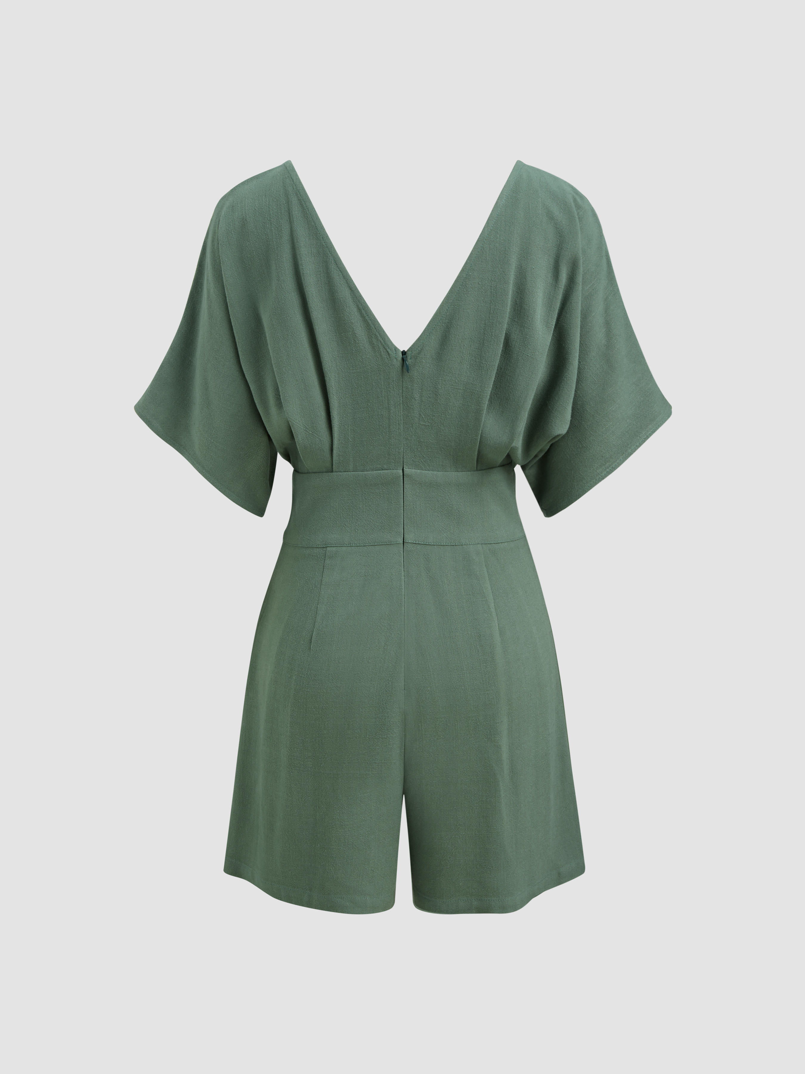 Romper in misto lino con scollo a V e tasca solida con cerniera
