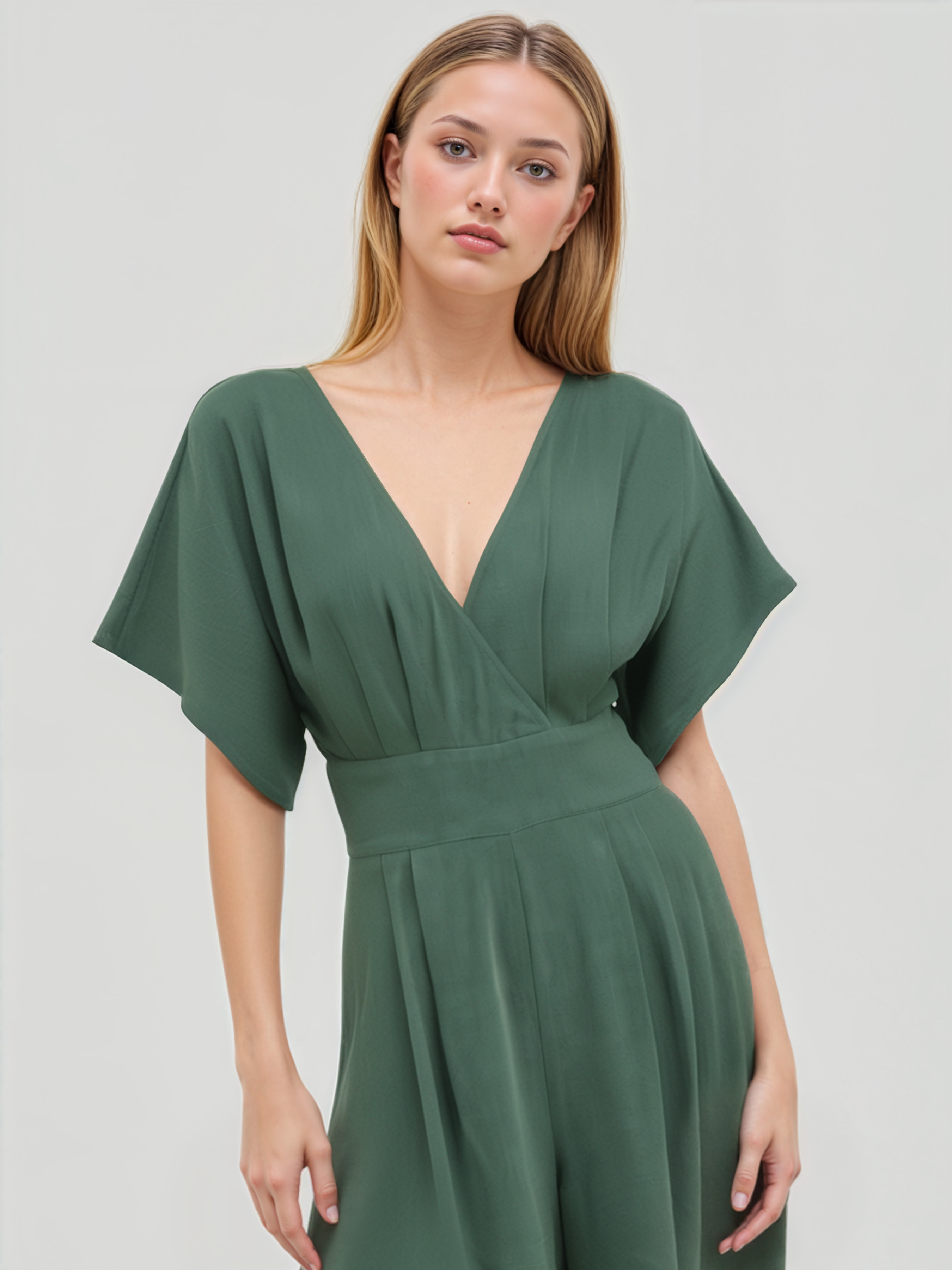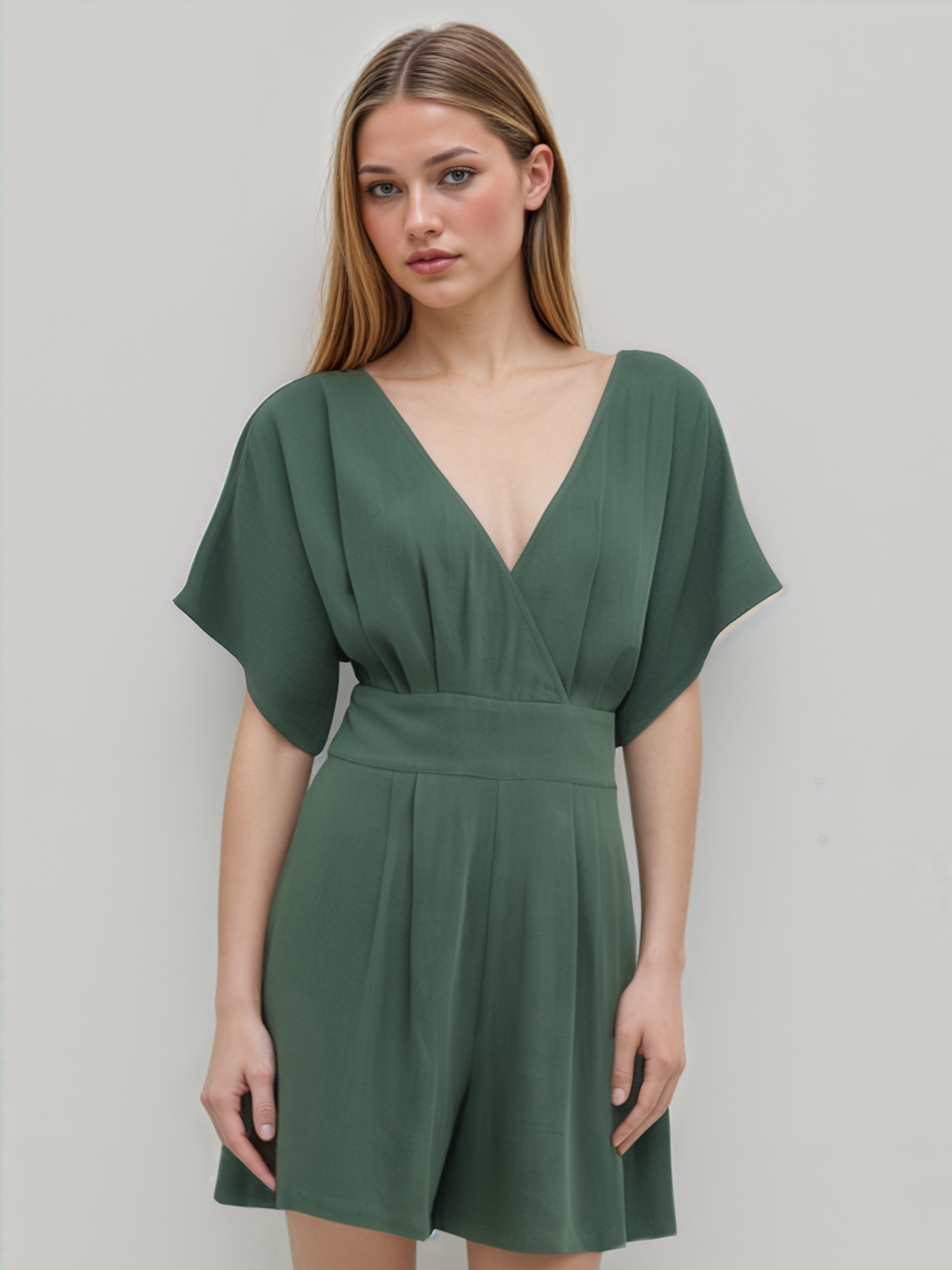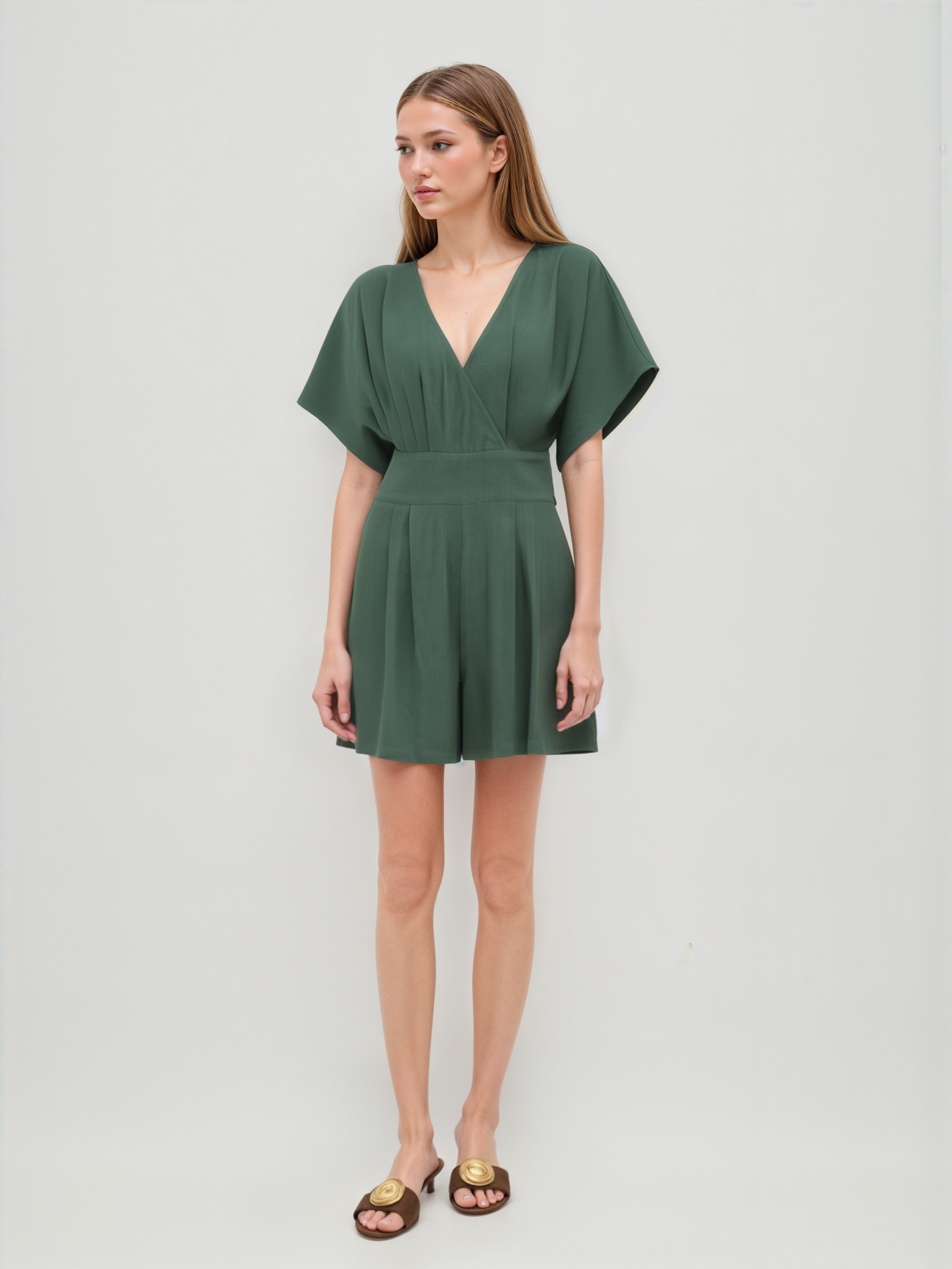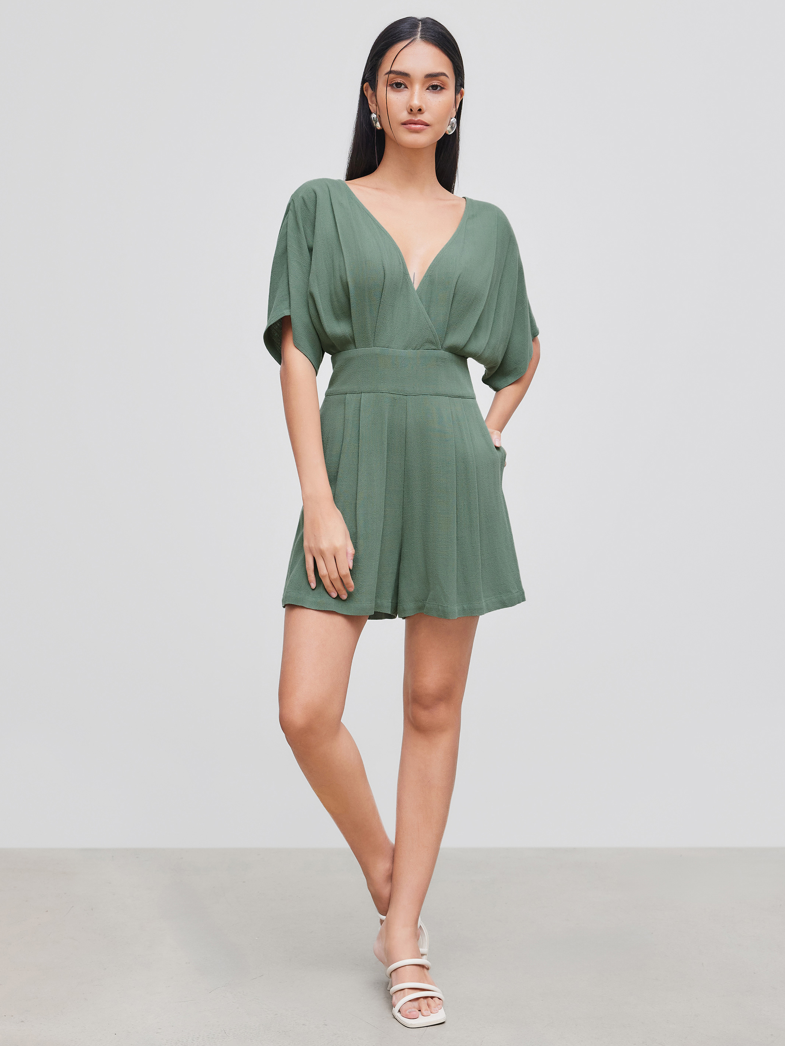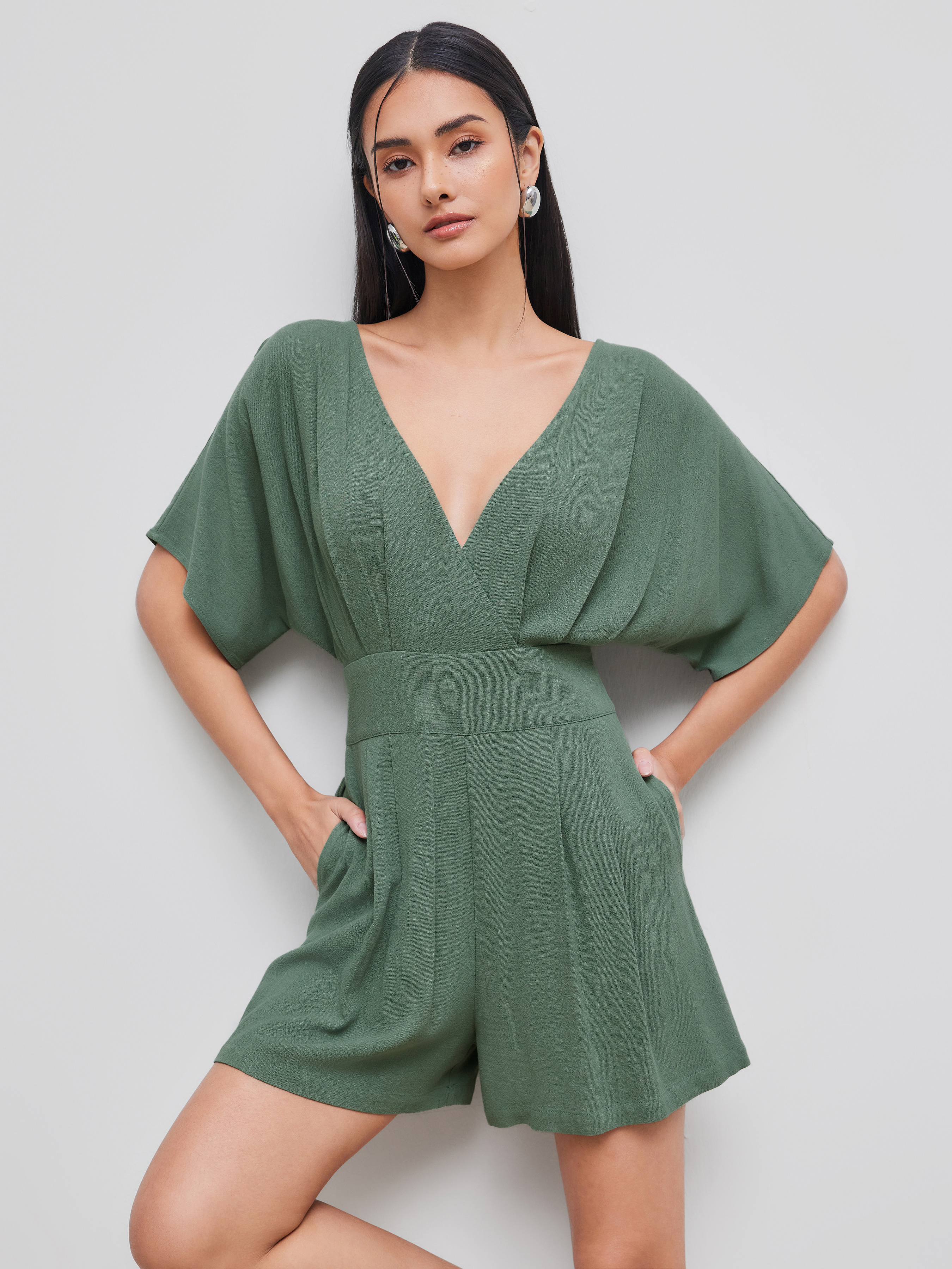 Romper in misto lino con scollo a V e tasca solida con cerniera