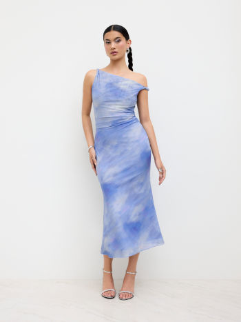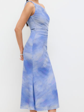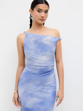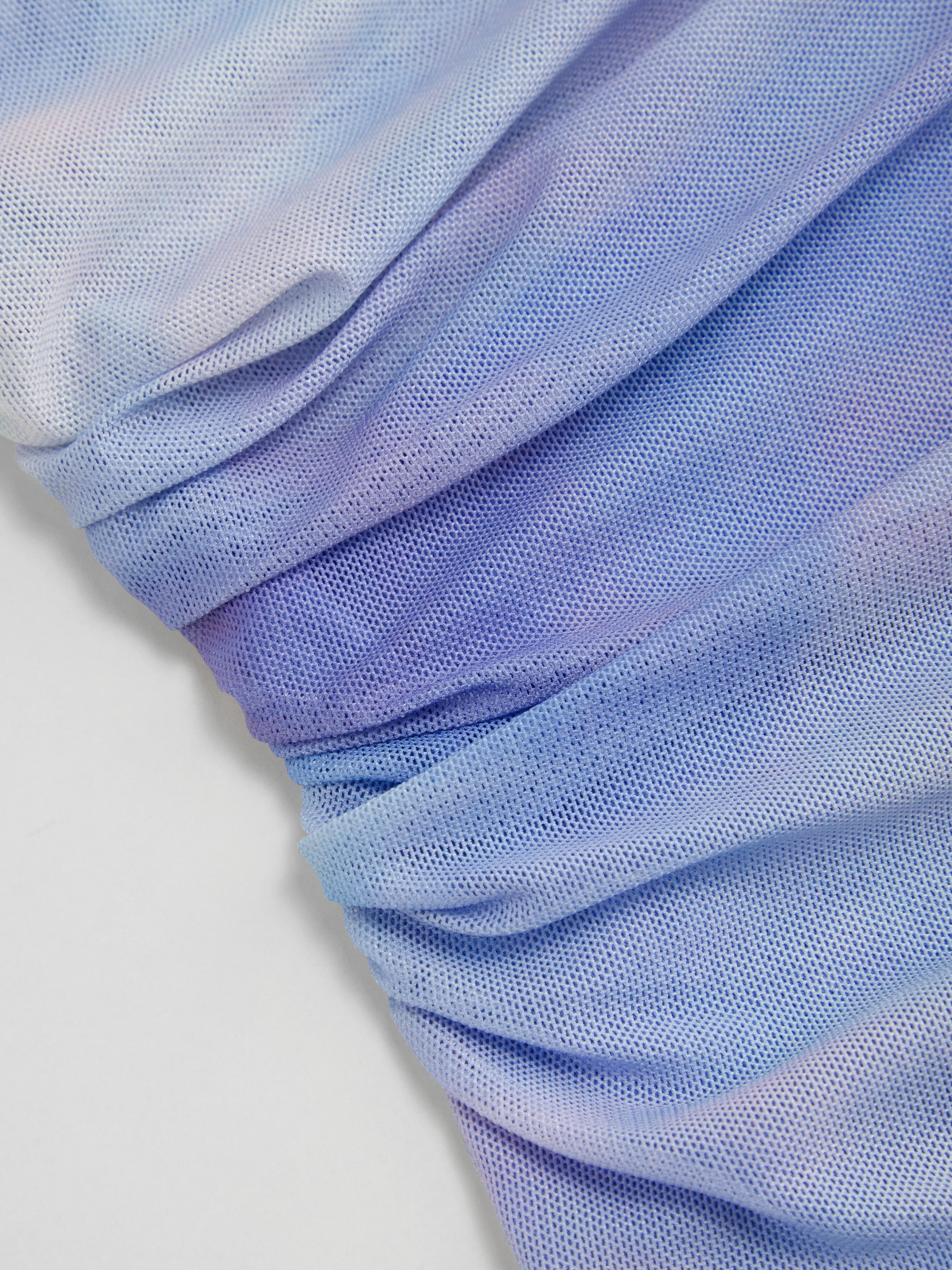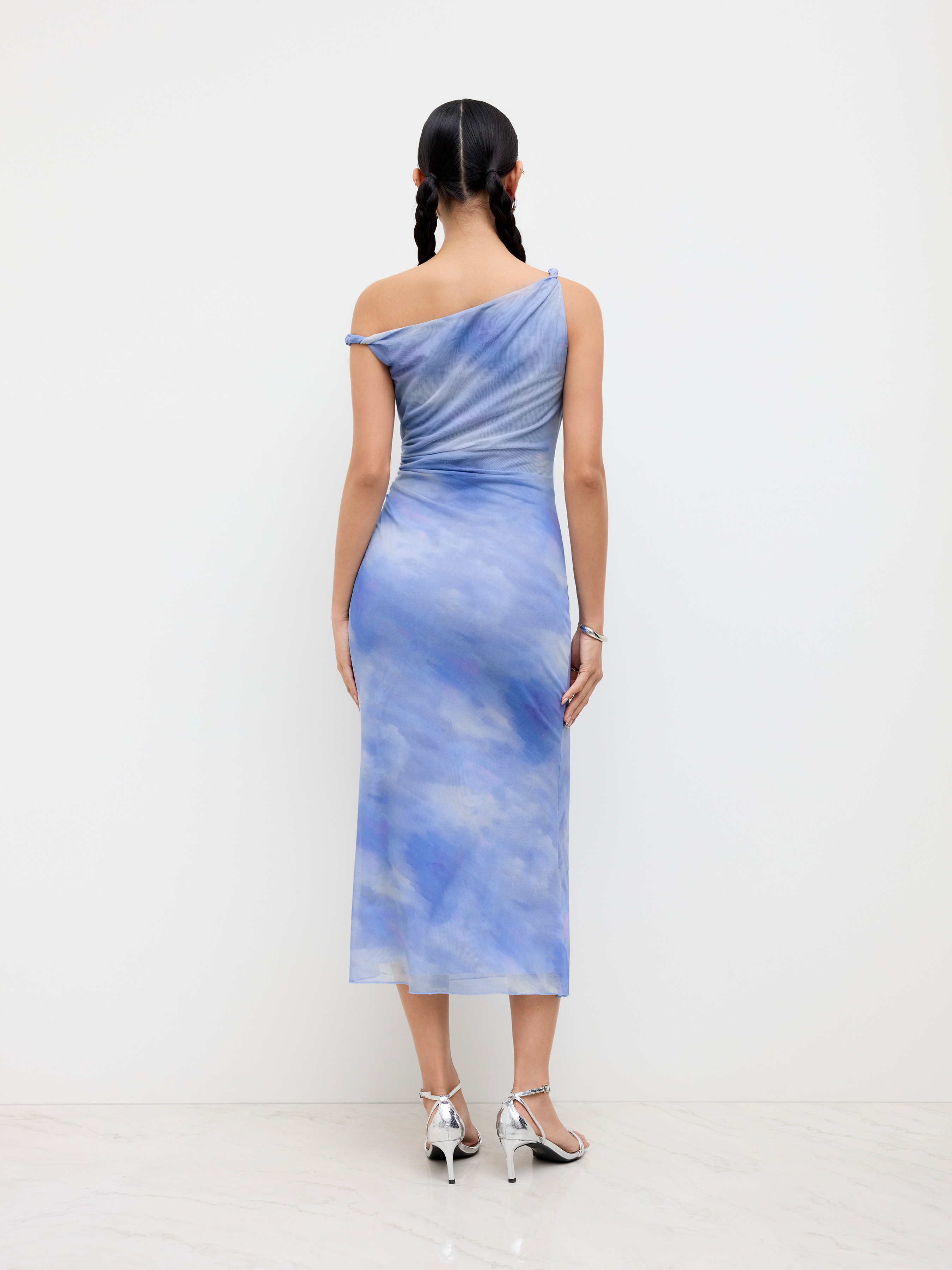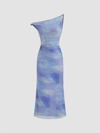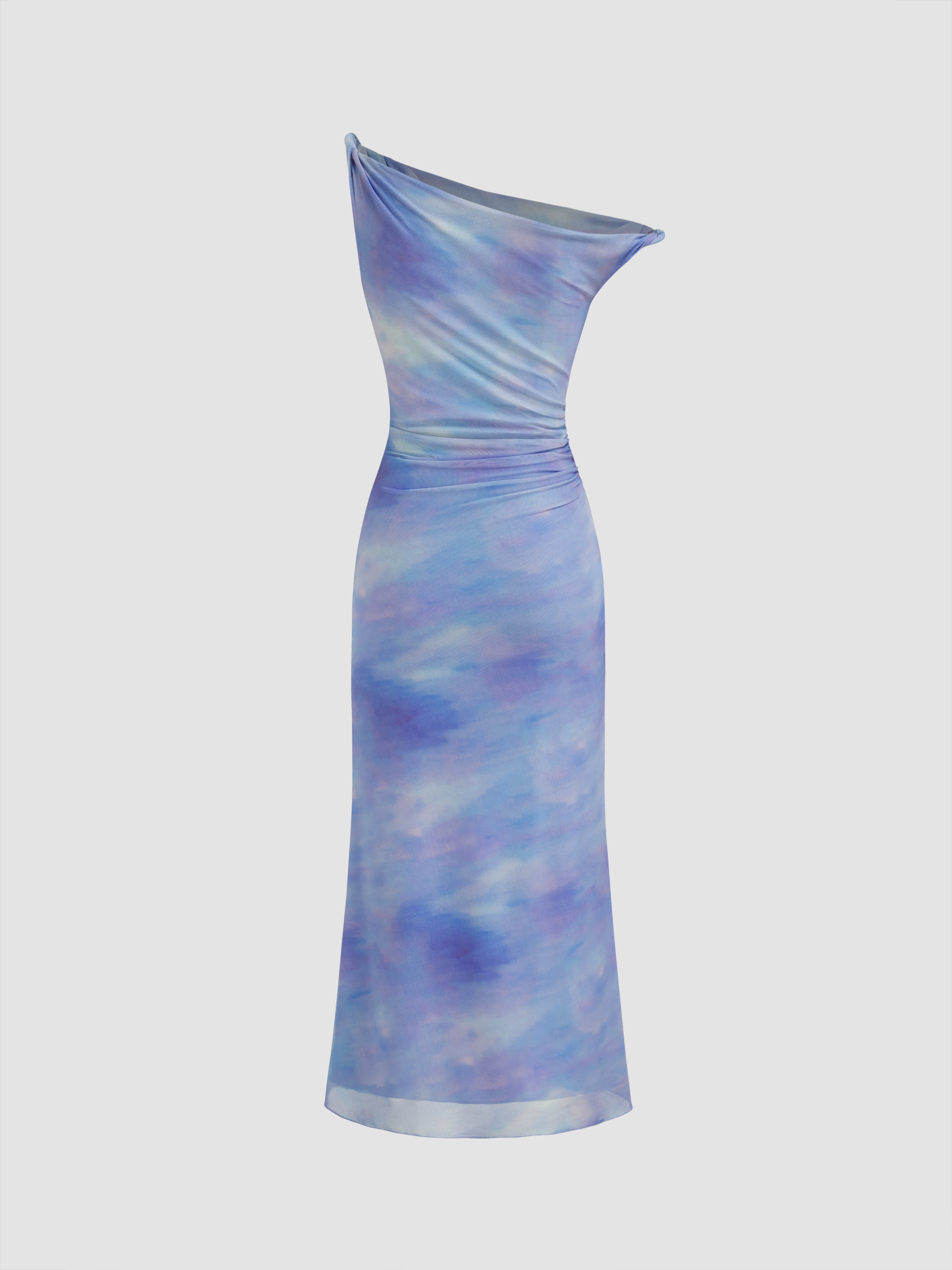Abito lungo maxi arricciato con illusione asimmetrica in rete sul collo