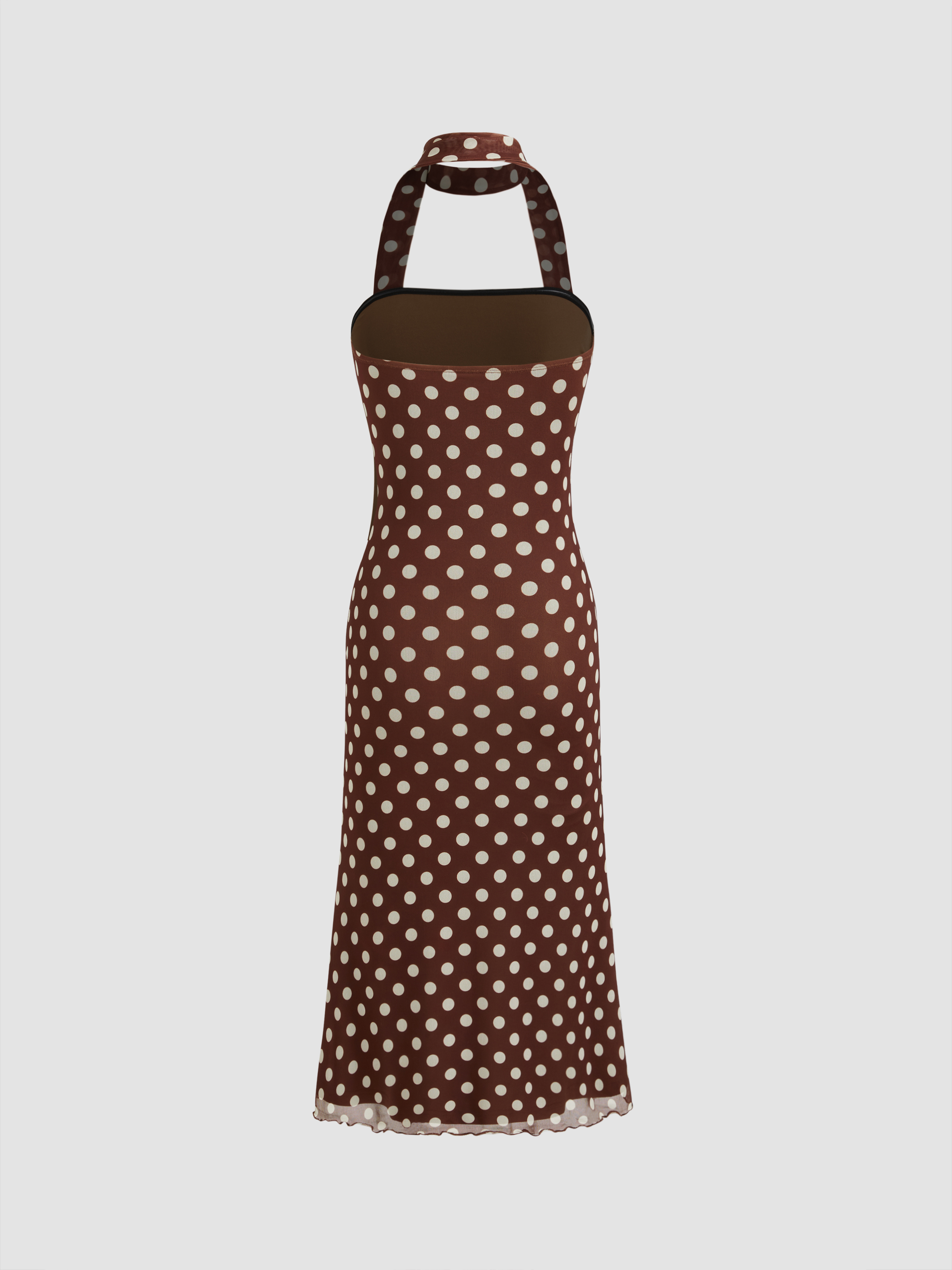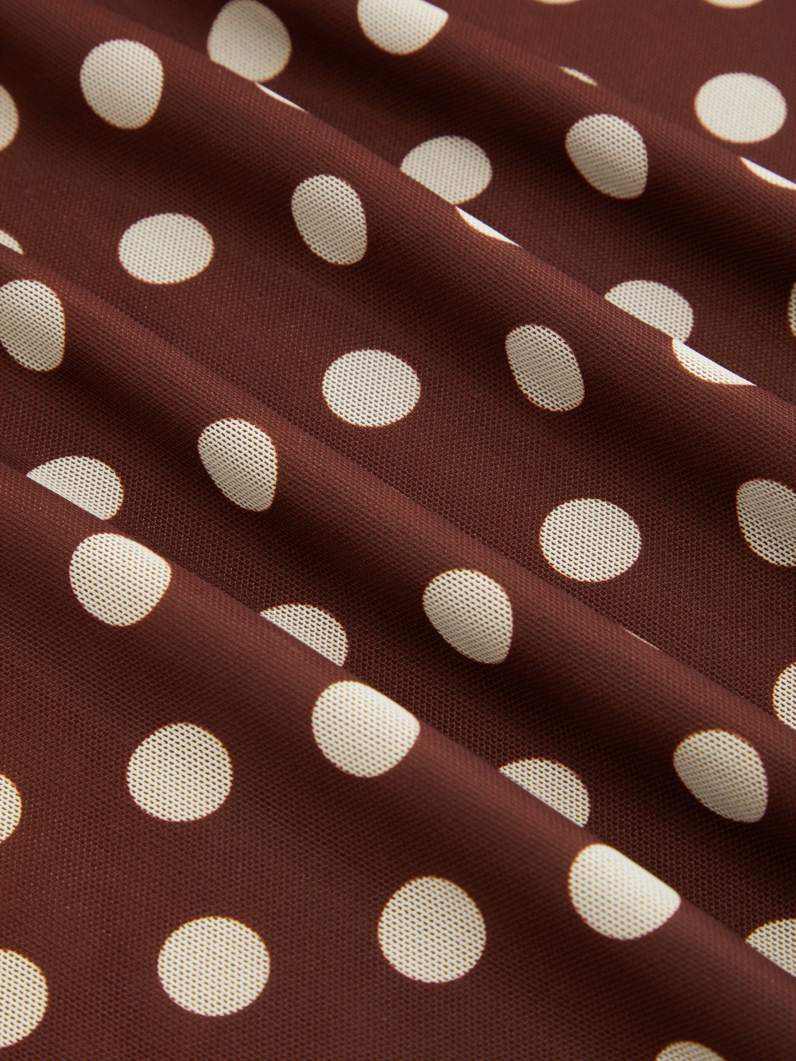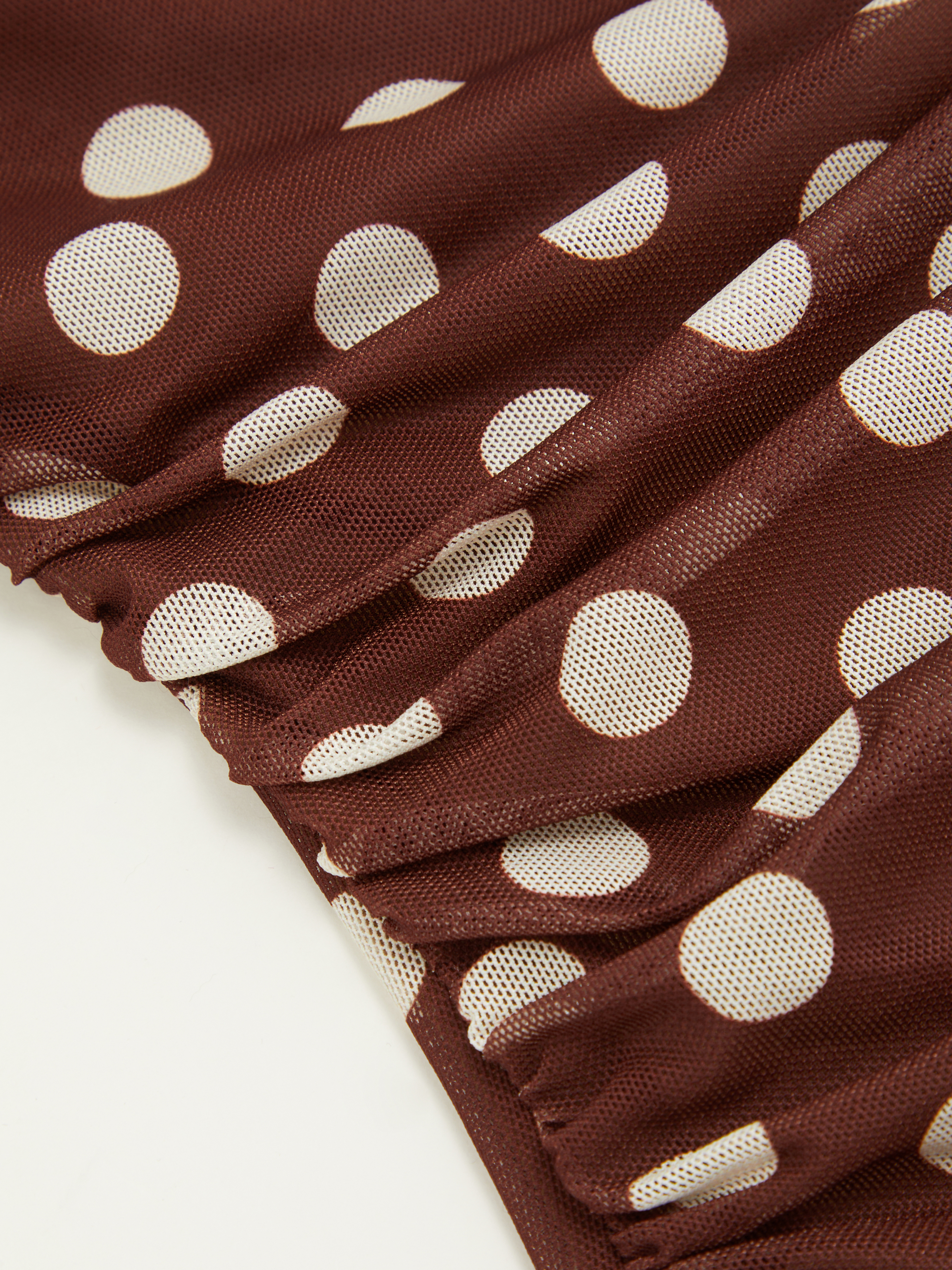 Vestito midi a rete con scollo ad aletta e increspature a pois