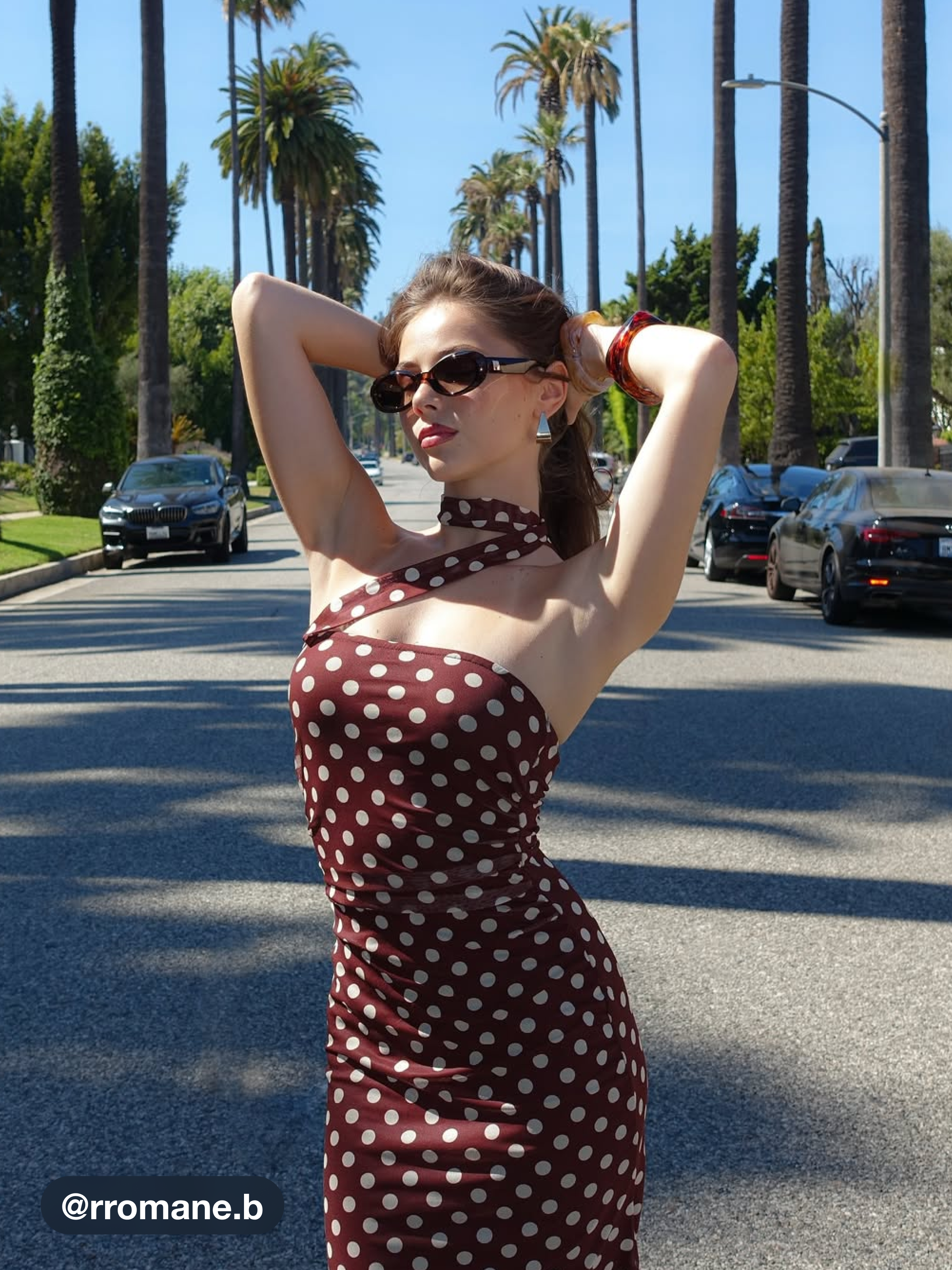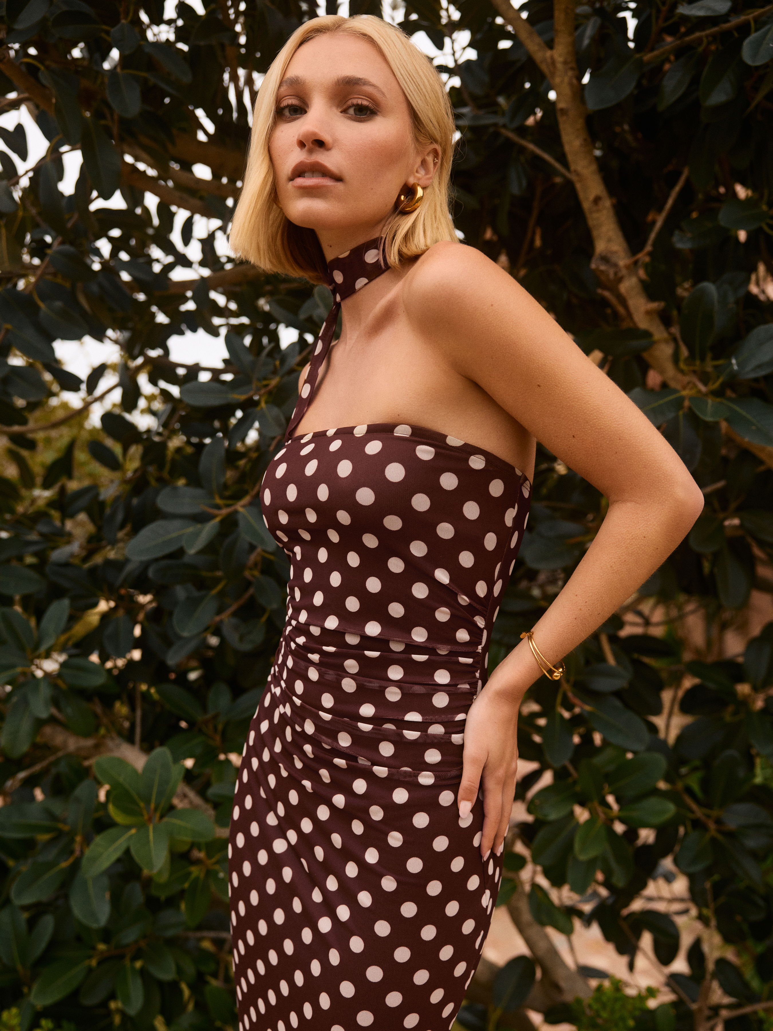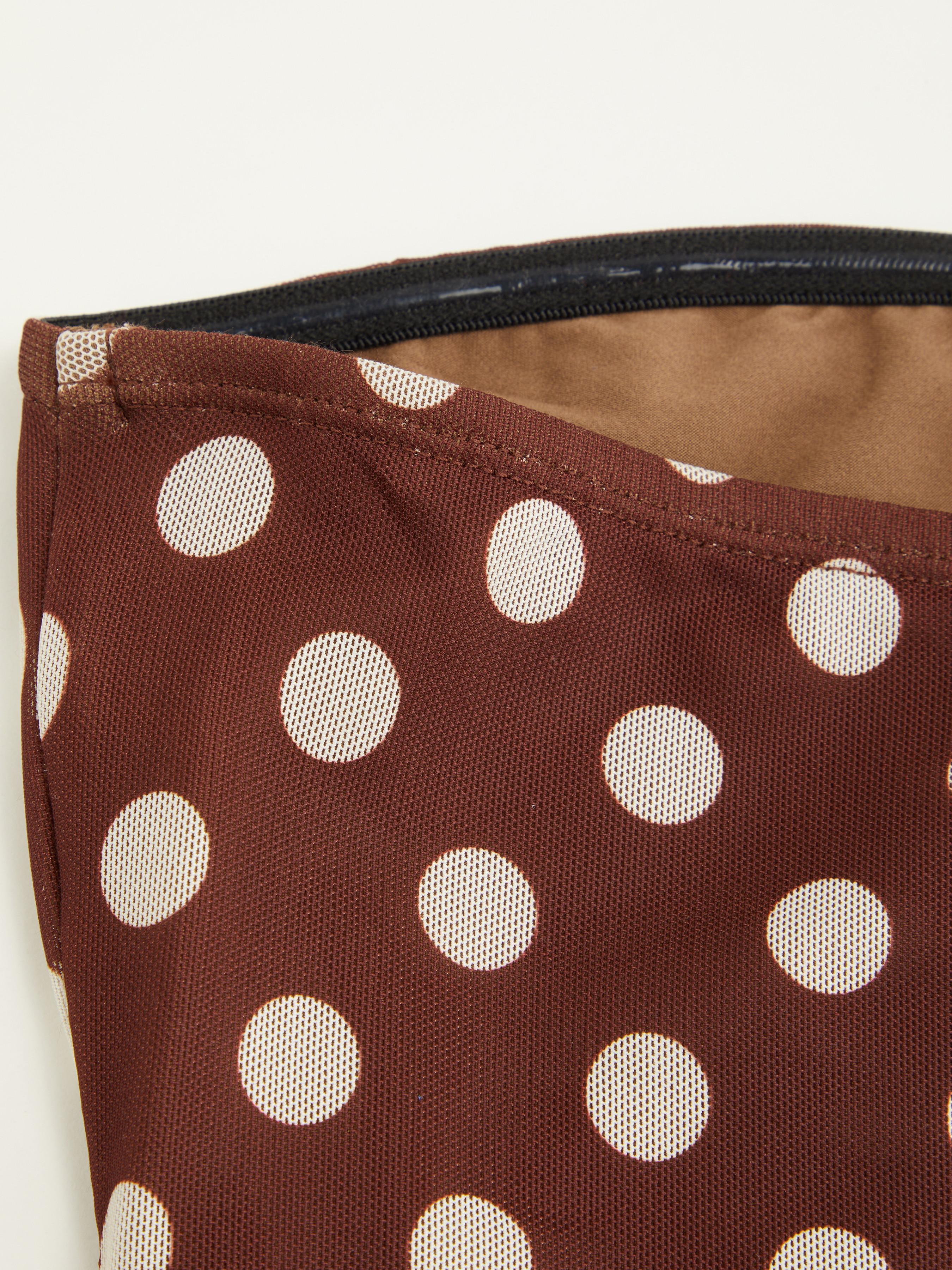 Vestito midi a rete con scollo ad aletta e increspature a pois