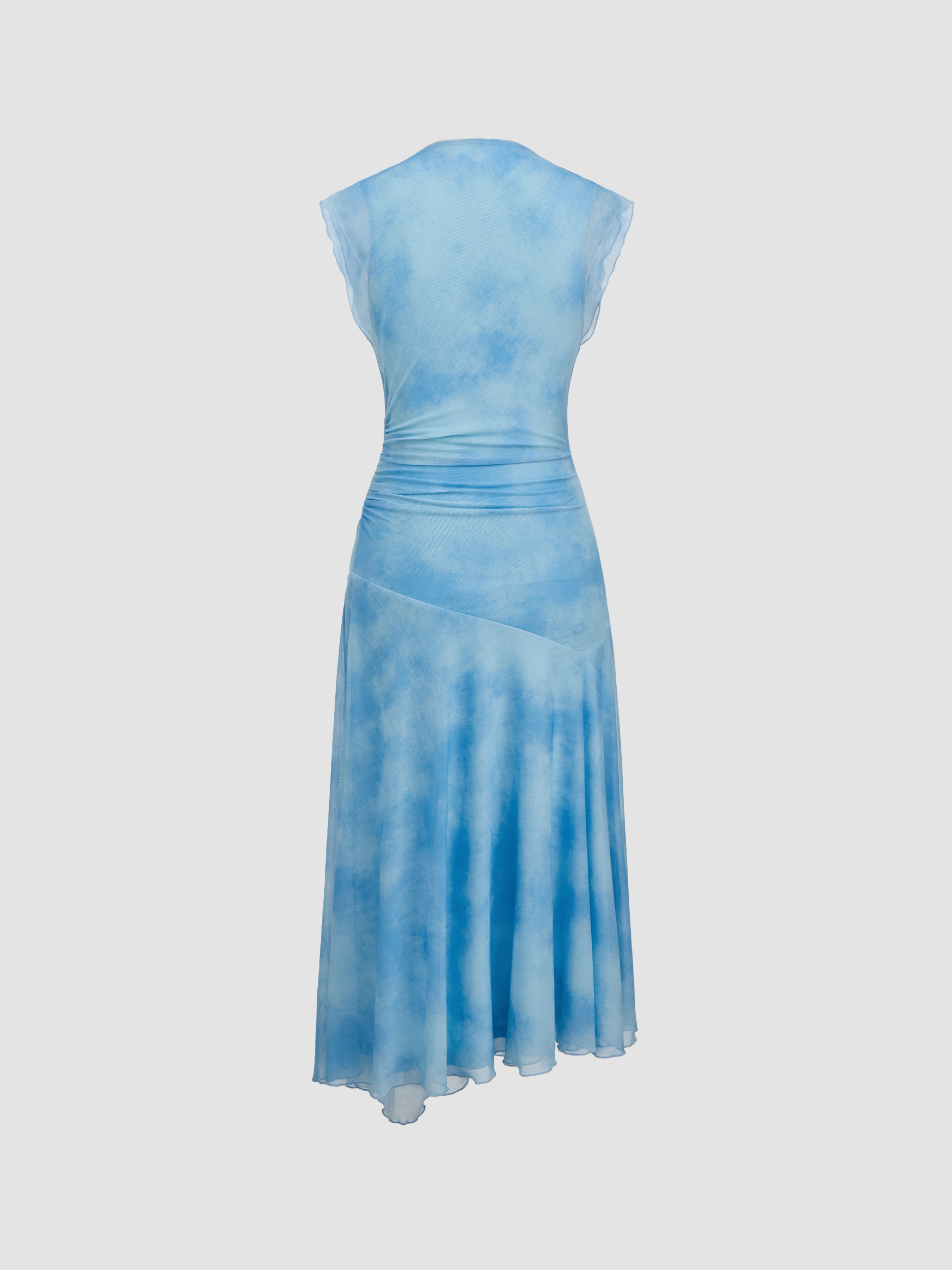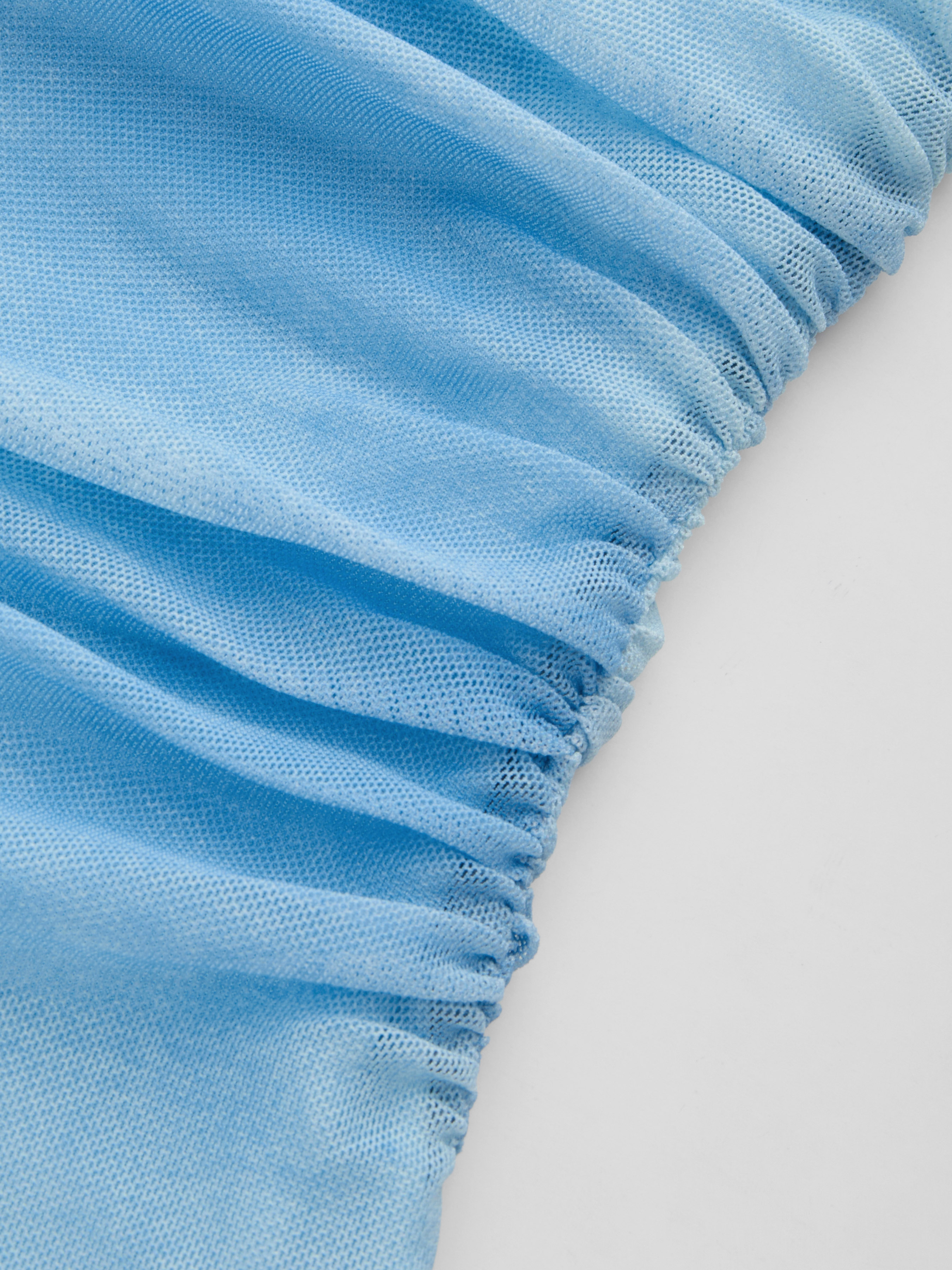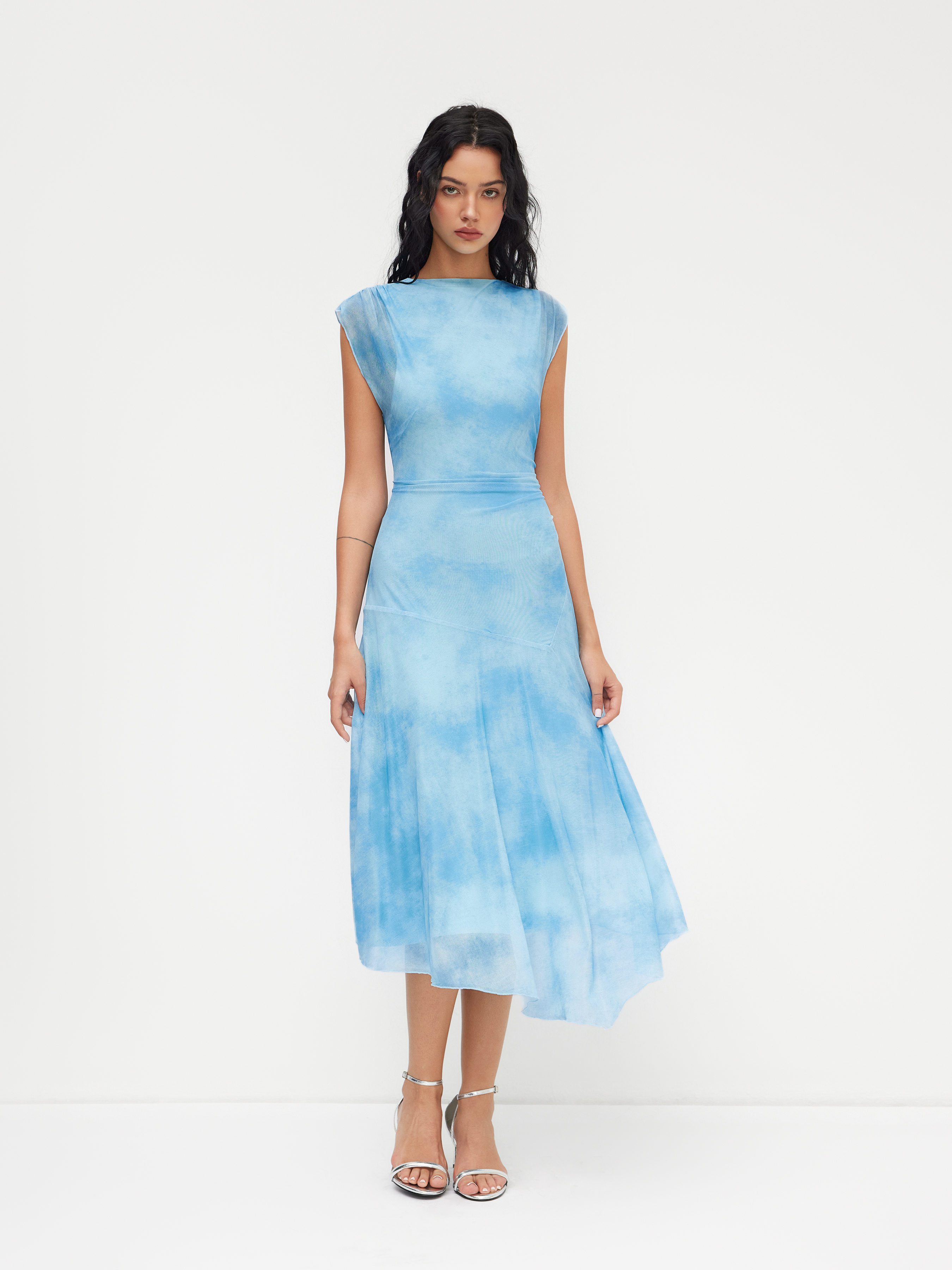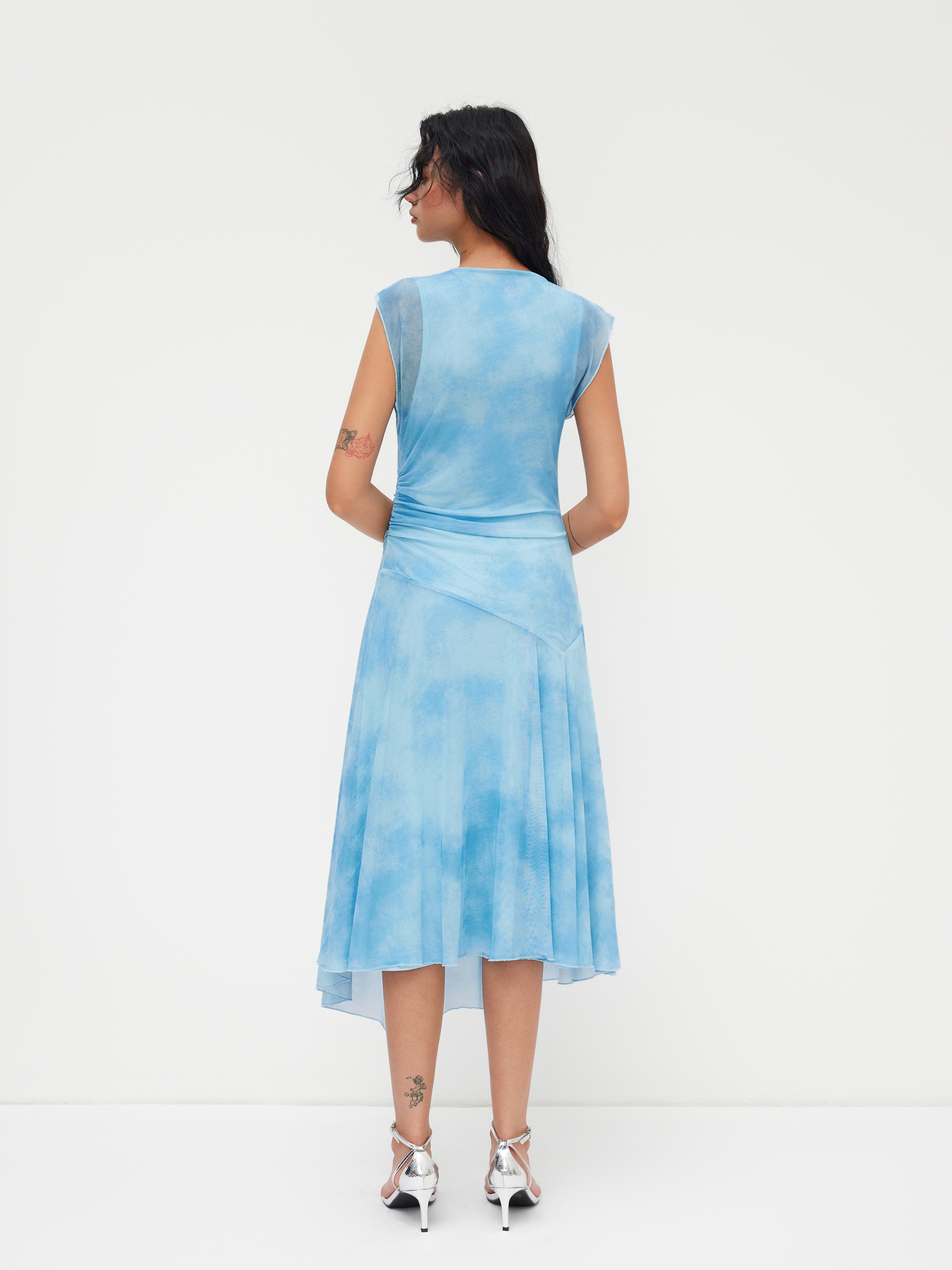 Abito midi in rete con collo alto, arricciature e orlo asimmetrico con effetto illusione