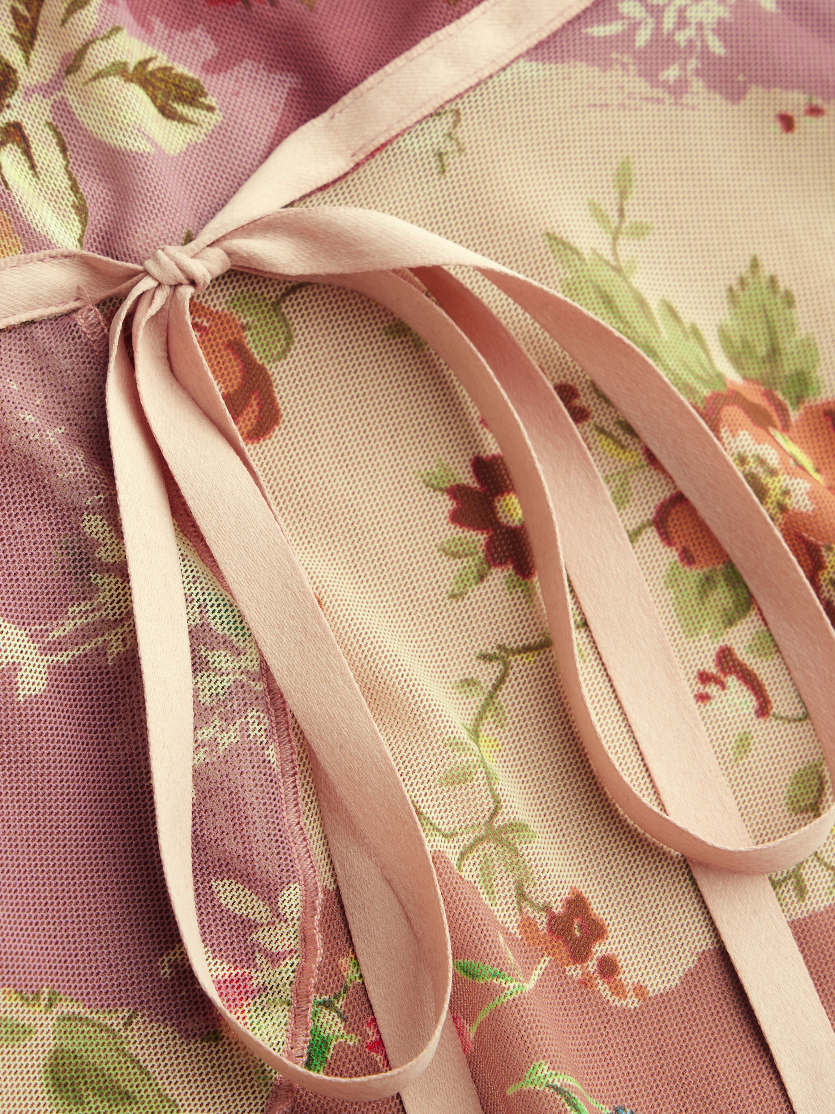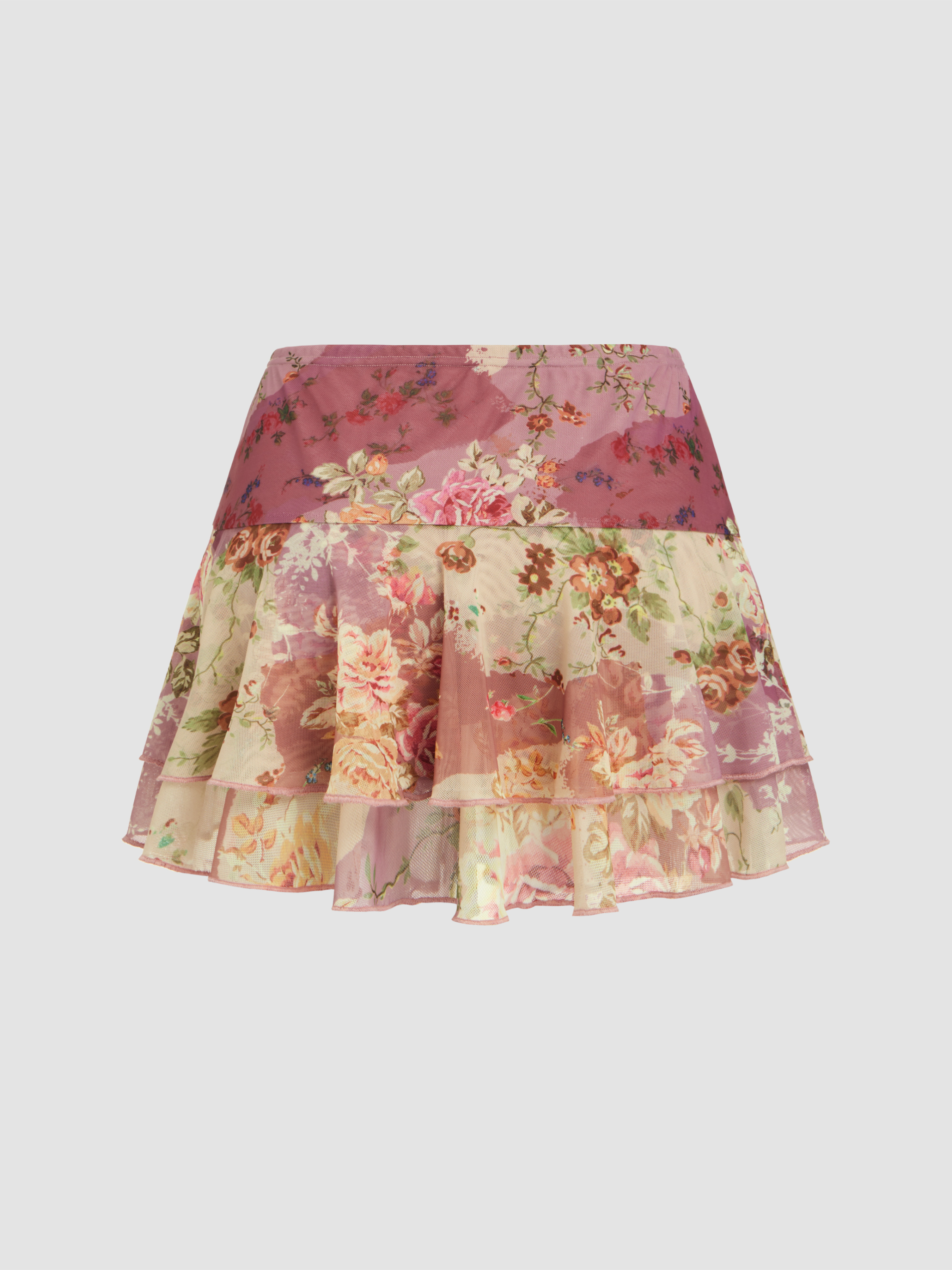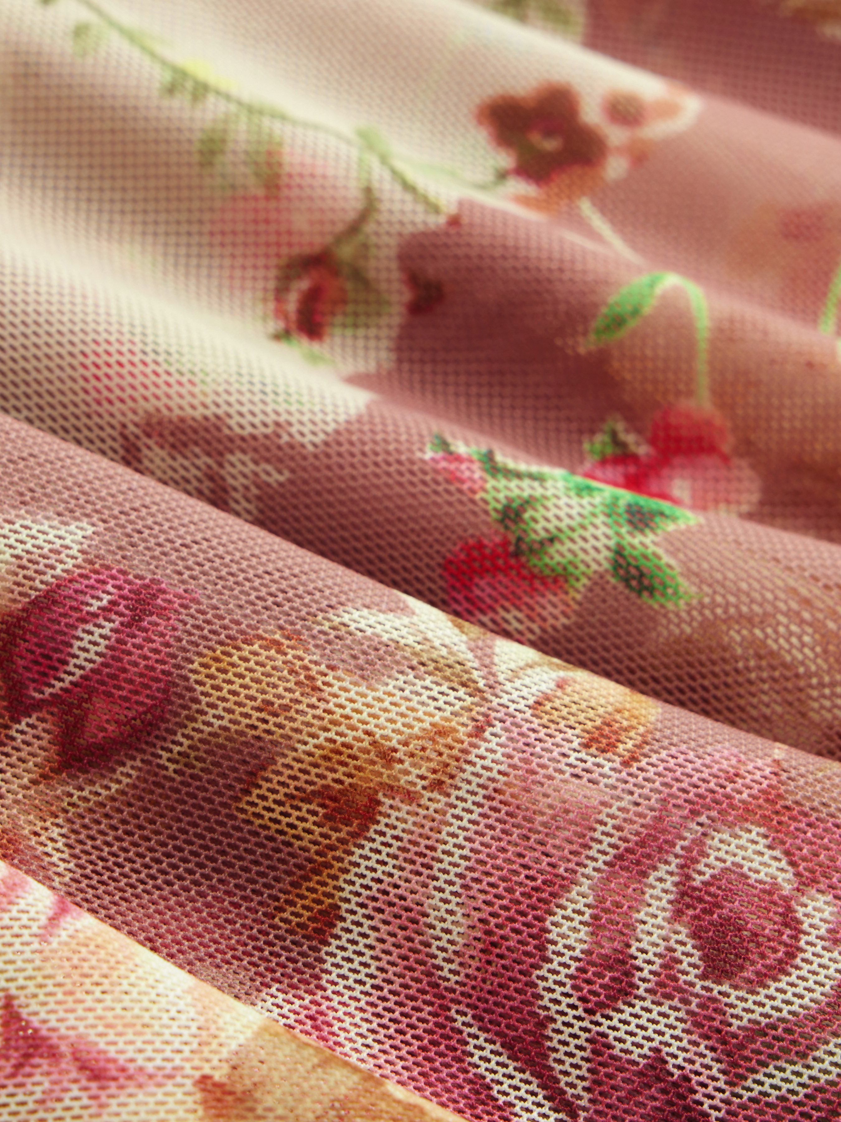 Mini gonna a vita bassa in mesh con fiocco floreale e orlo arricciato