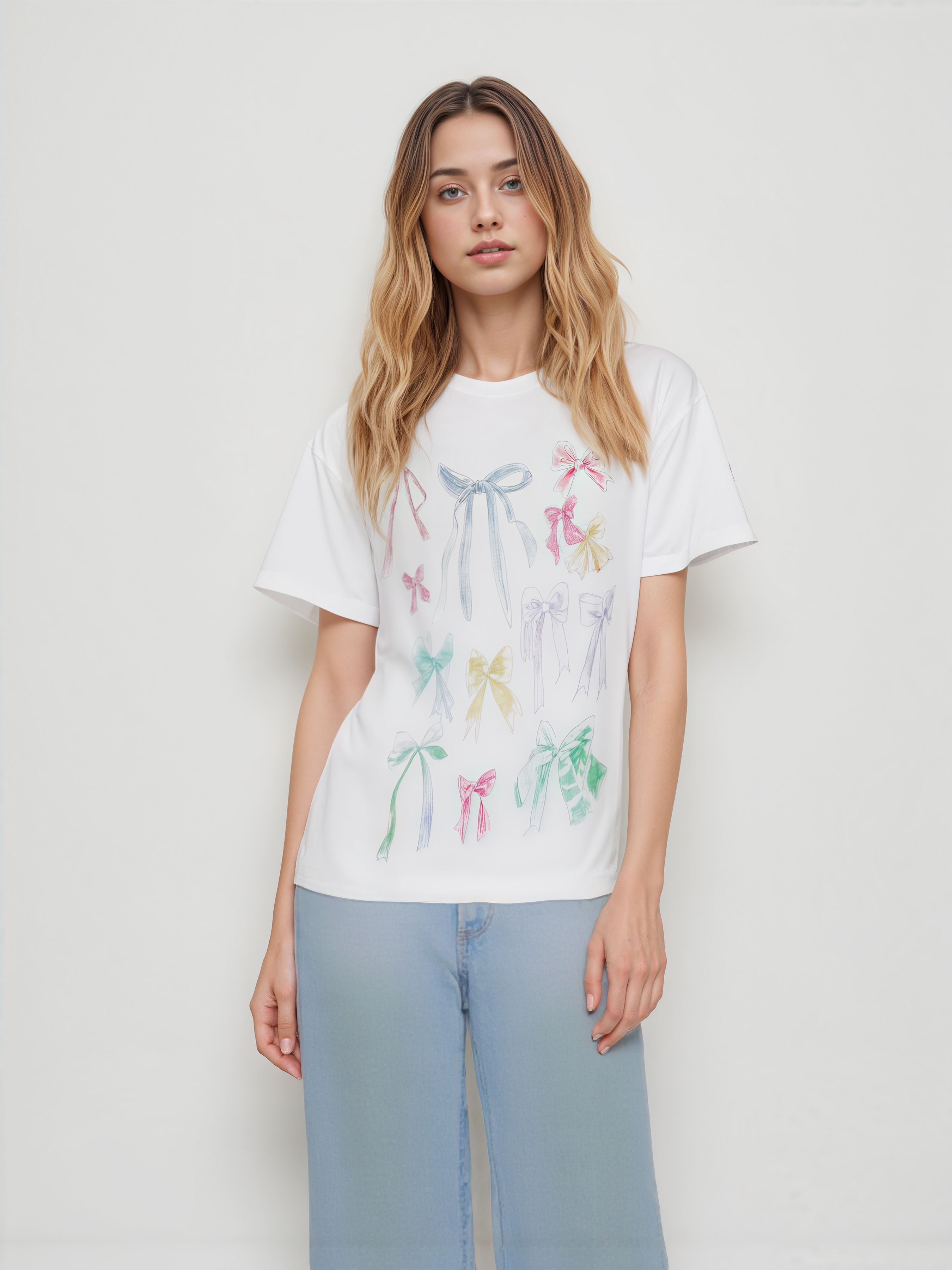 Scollo rotondo Bowknot Graphic Manica corta Tee oversize