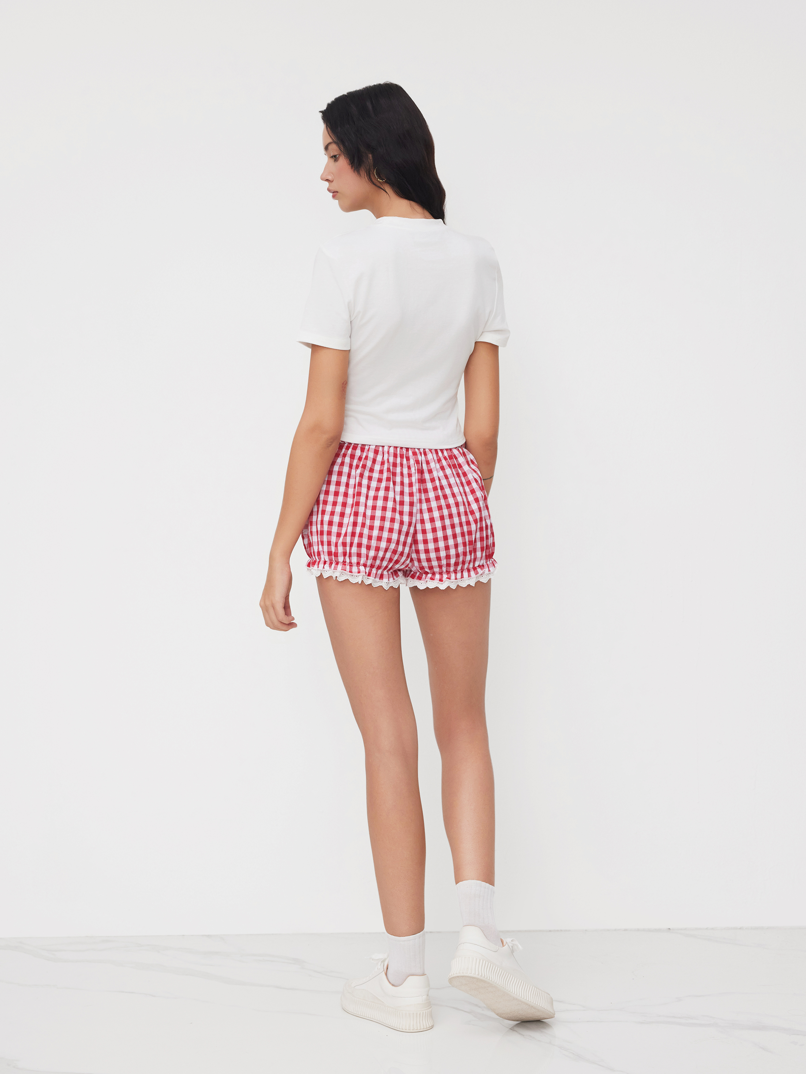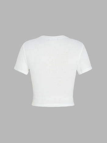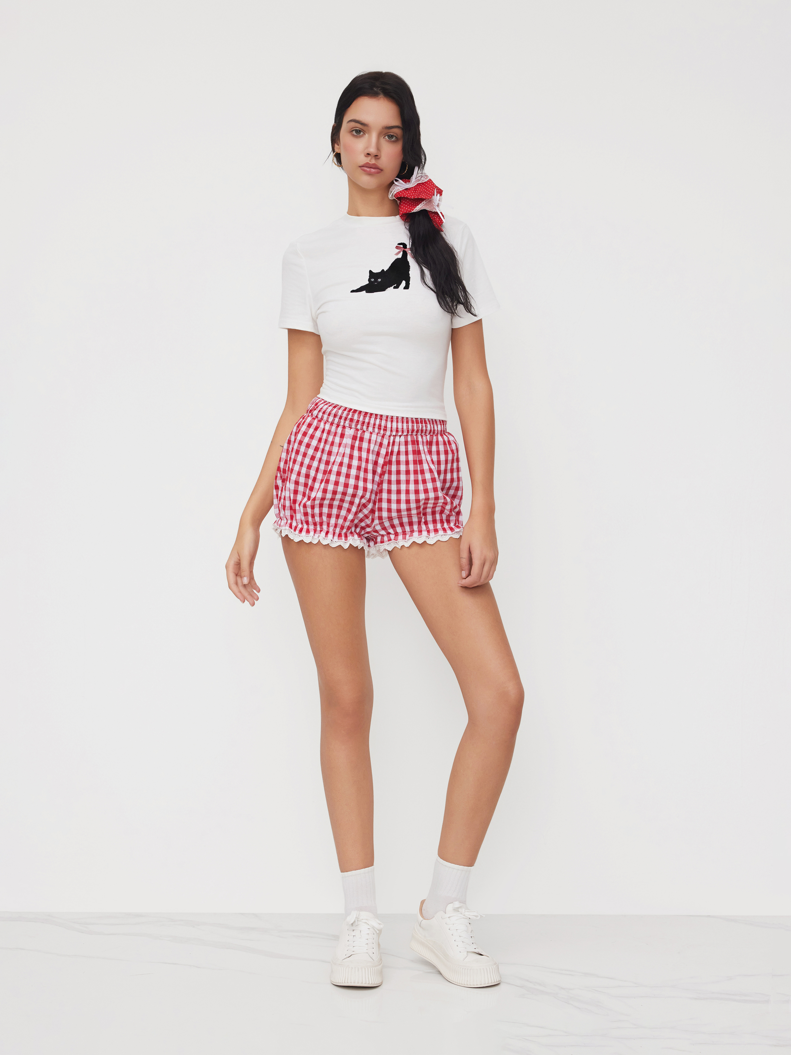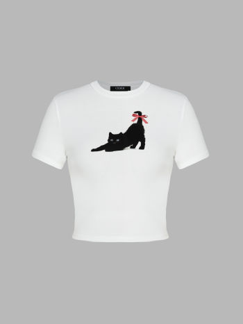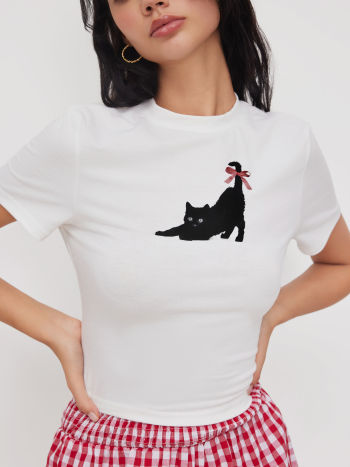 T-shirt corta con grafica di gatto e fiocco sul collo rotondo
