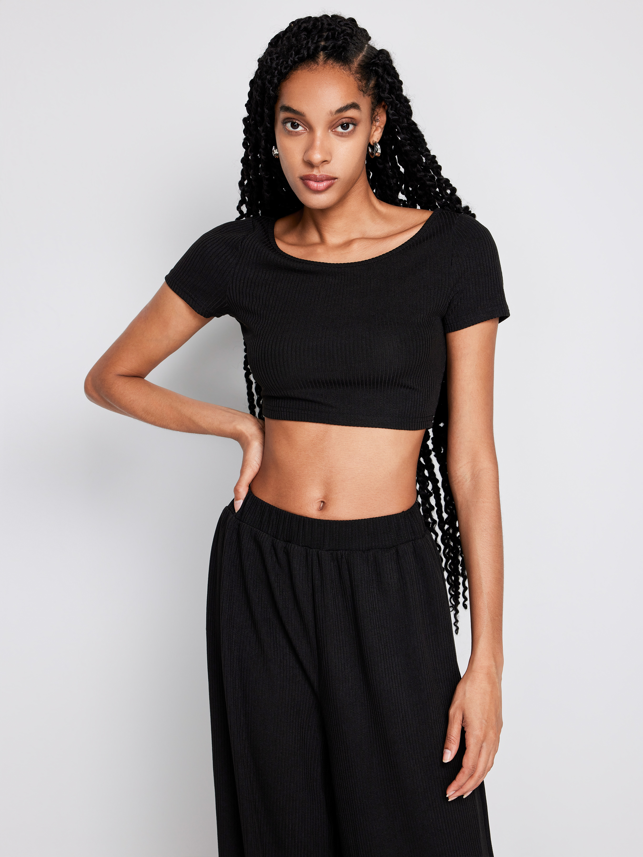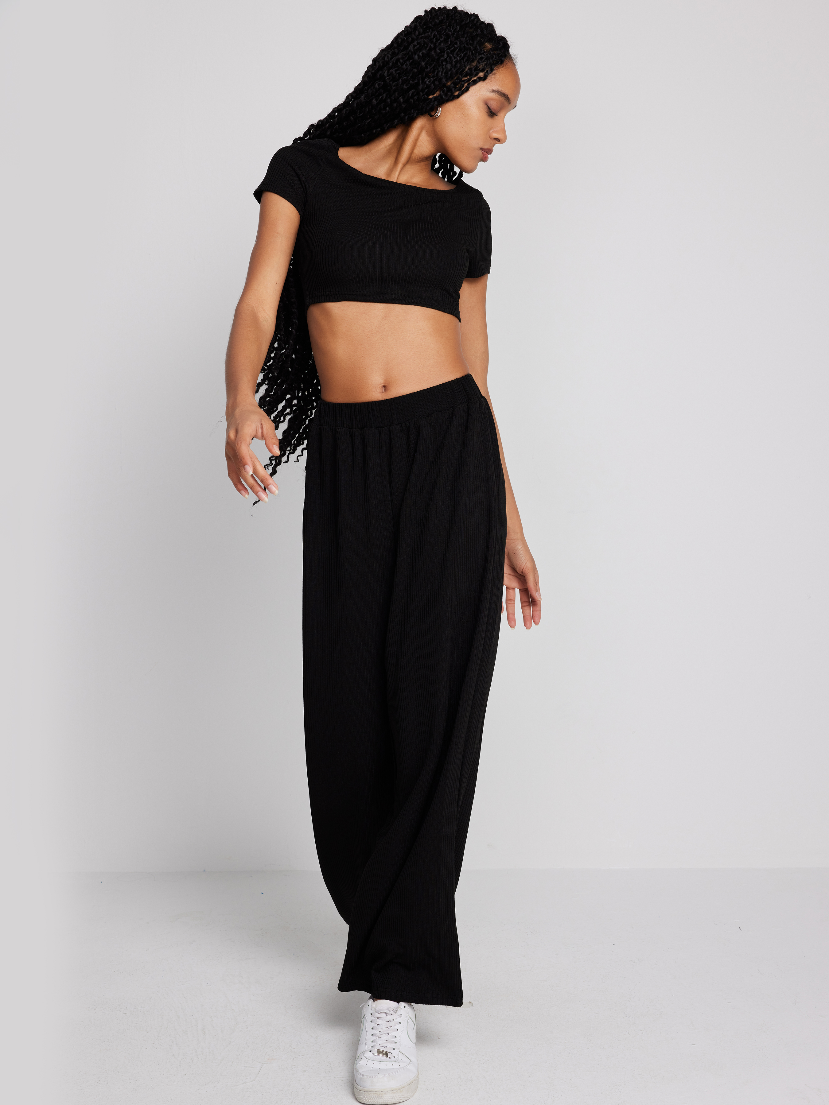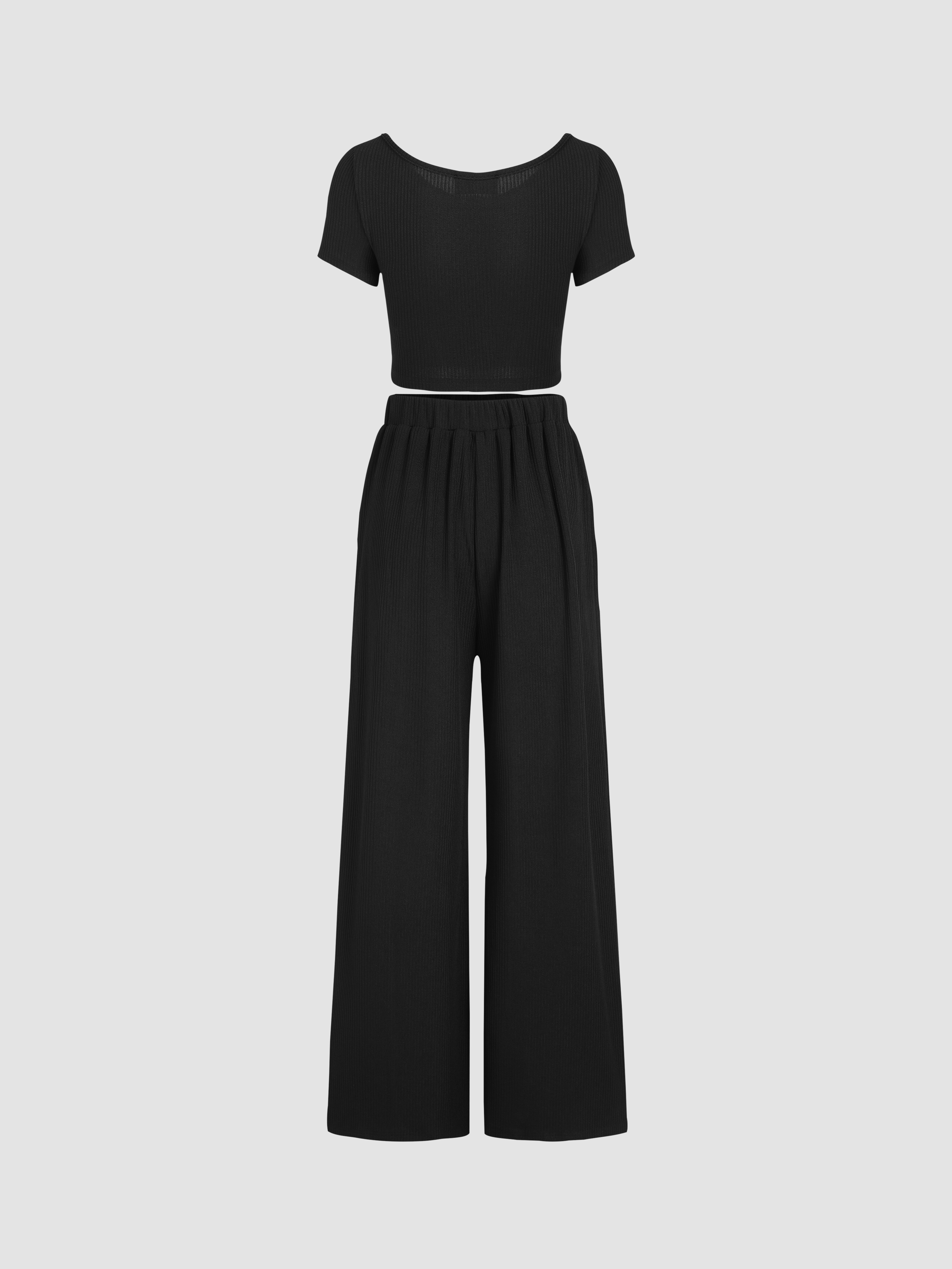 Top corto lavorato a maglia a maniche corte e pantaloni a gamba larga