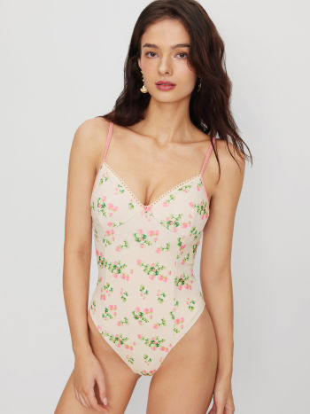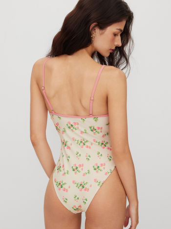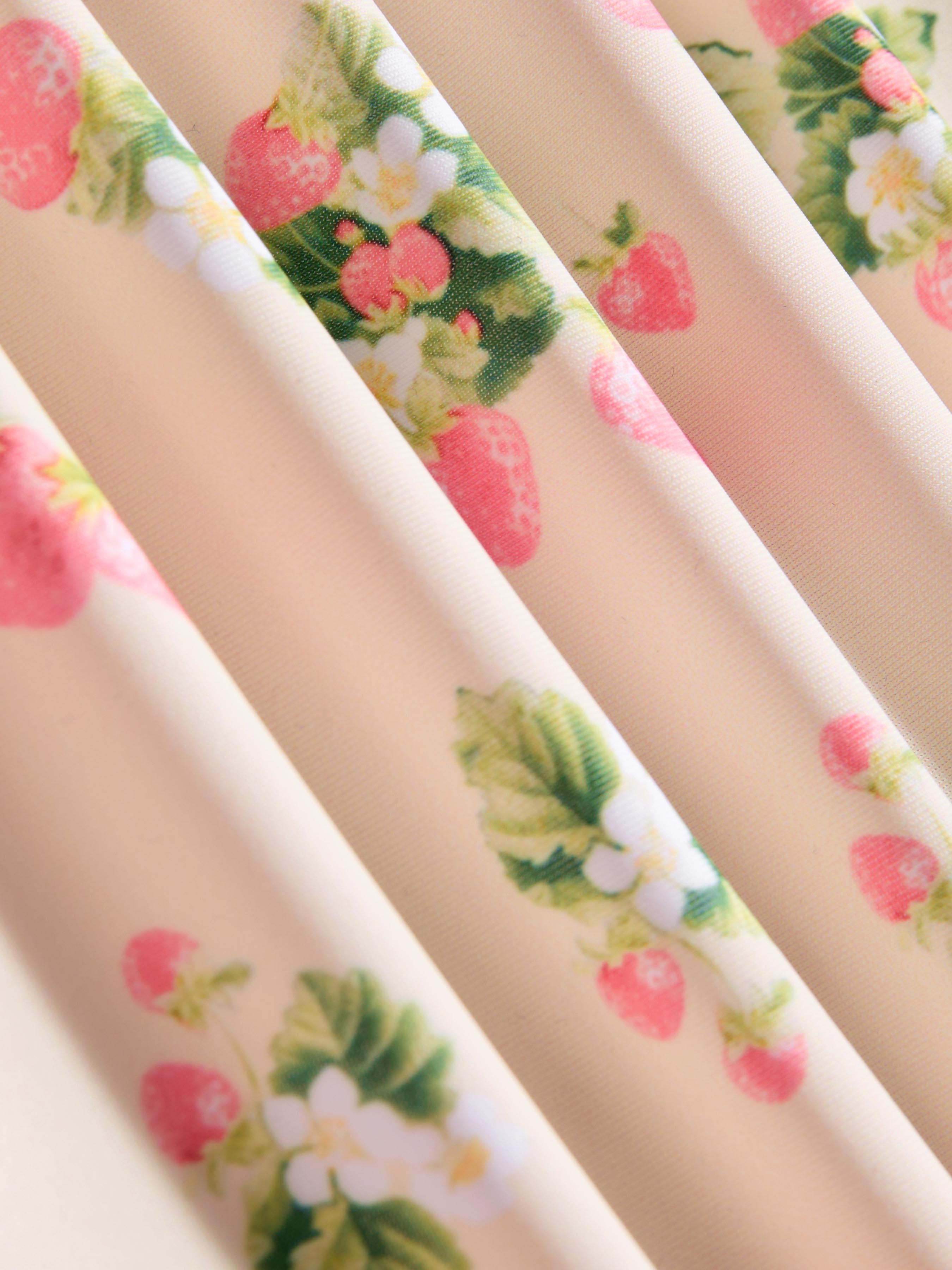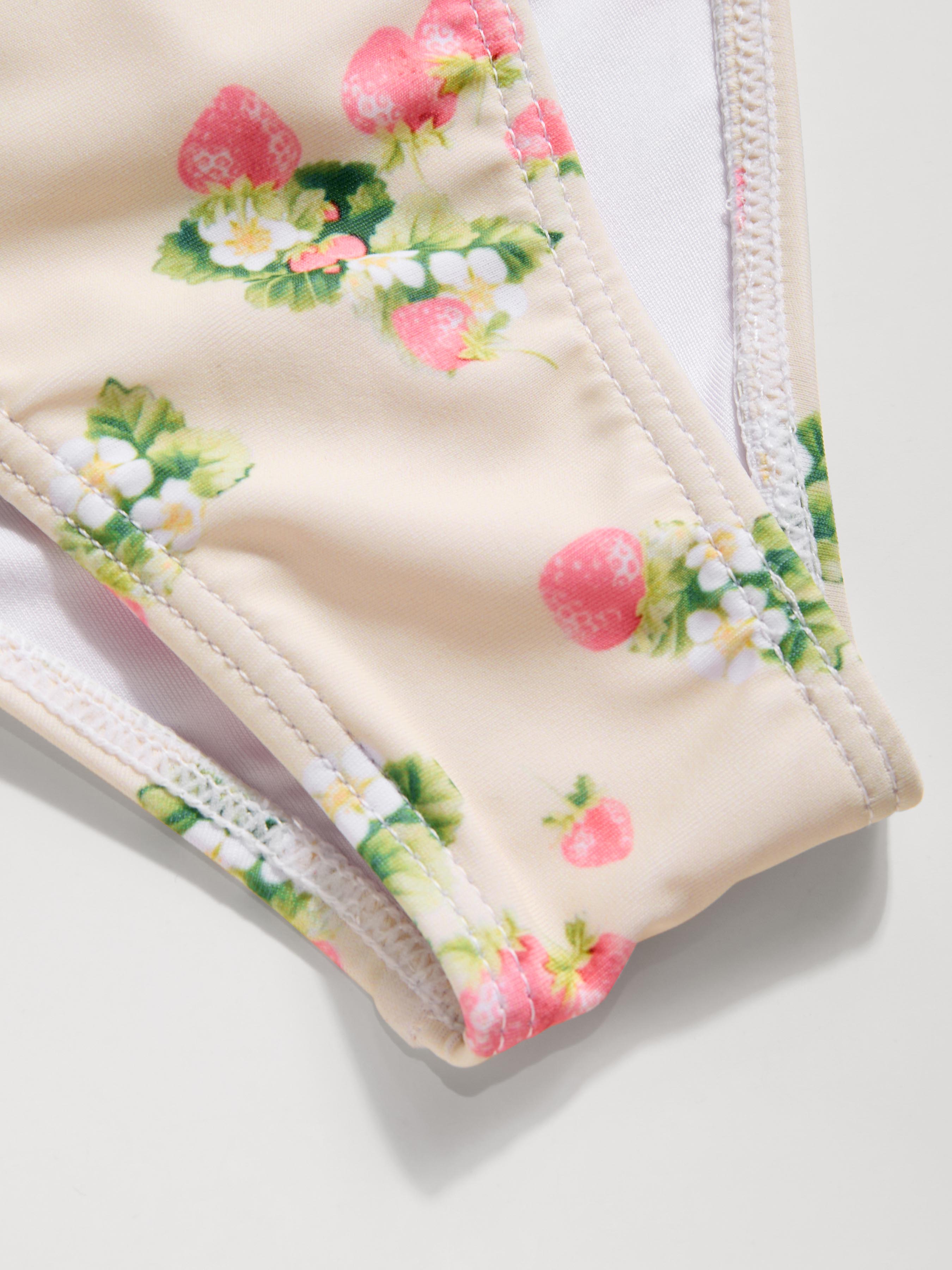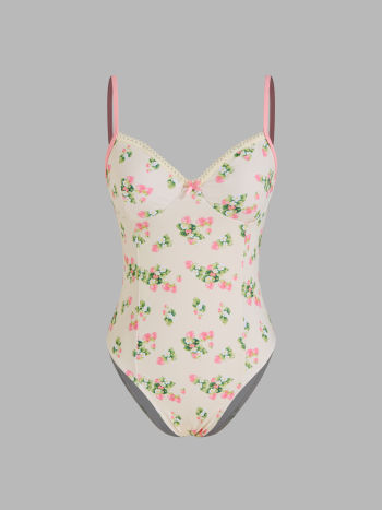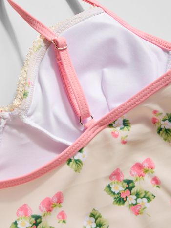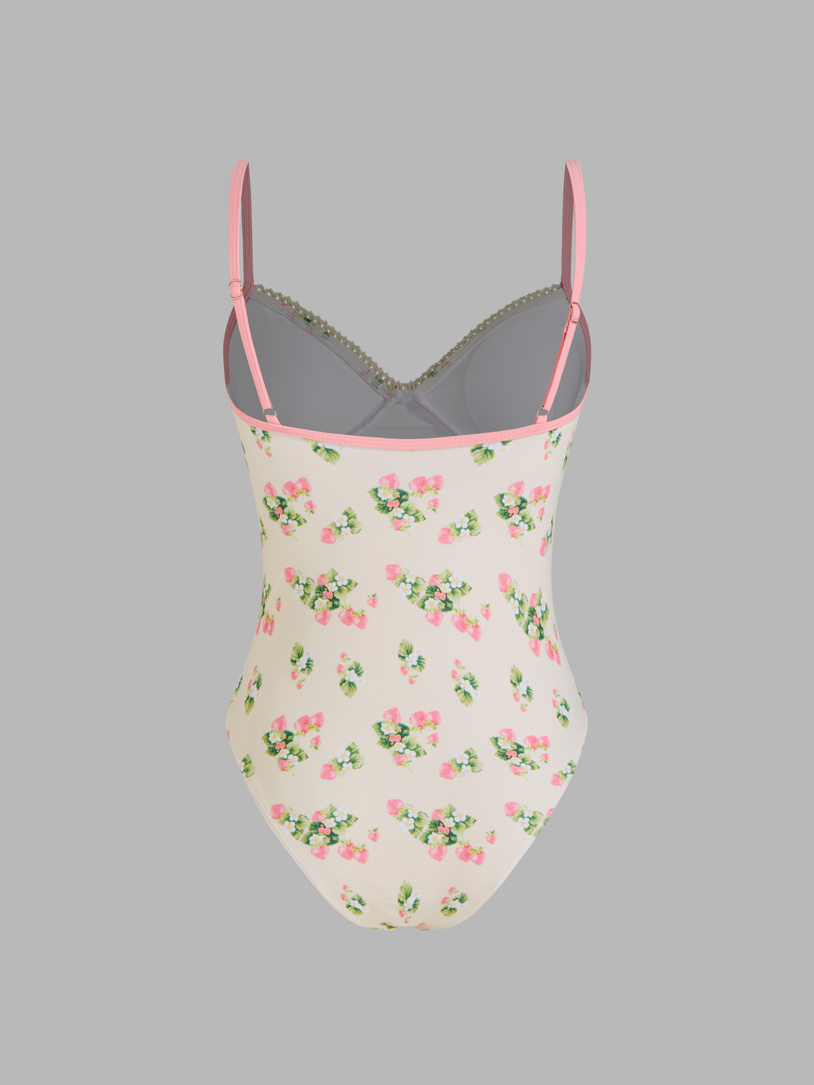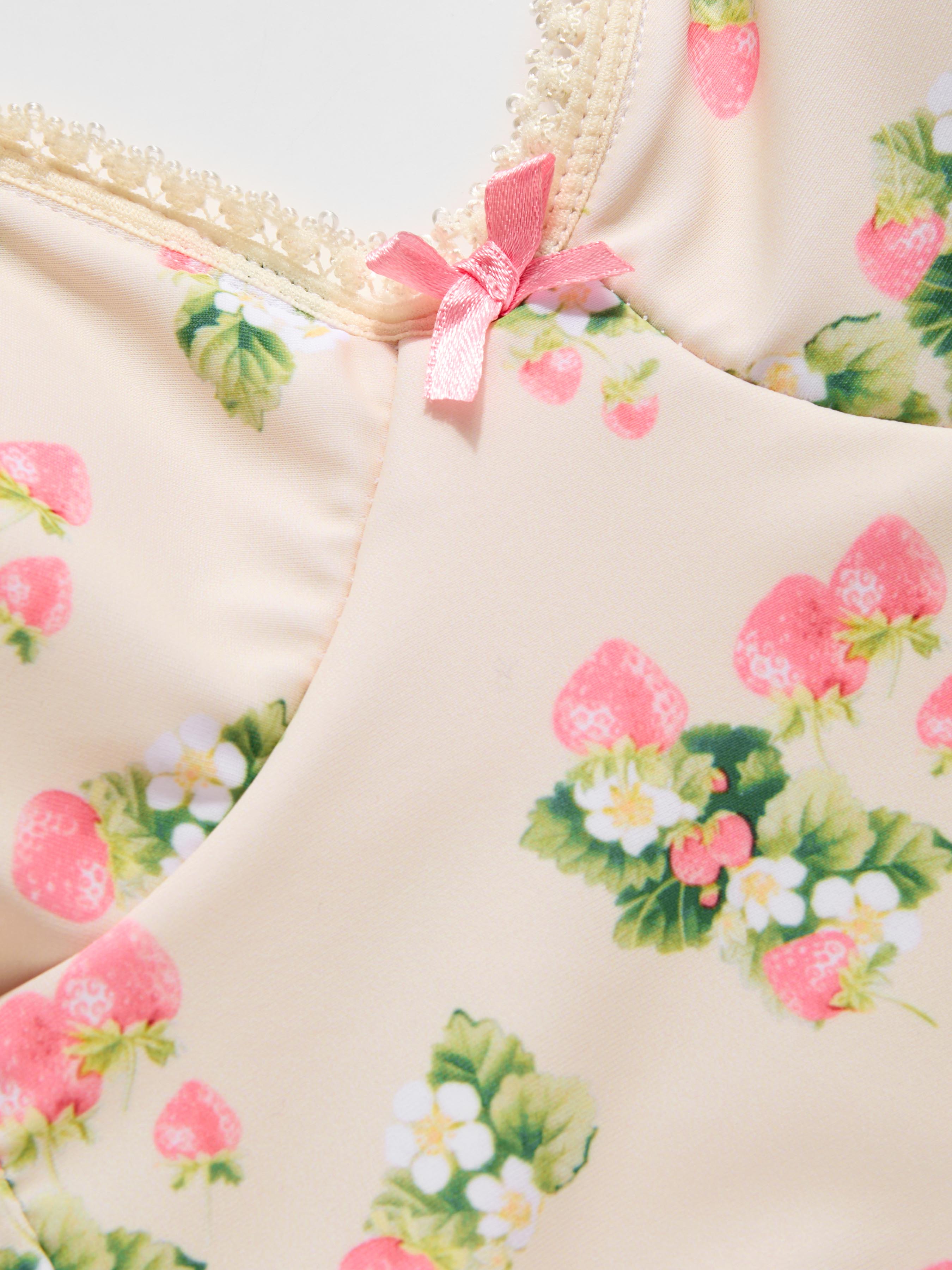 Costume da bagno intero con scollo a V, fiocco a fragola e finiture in pizzo