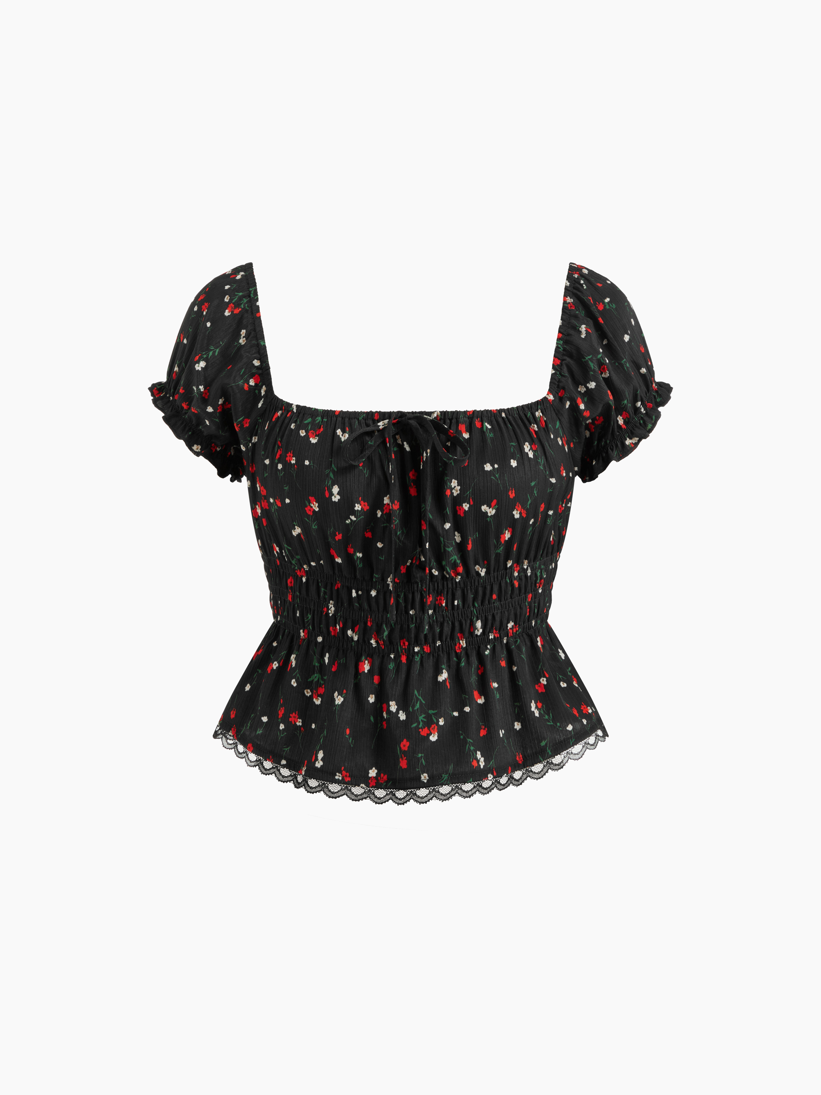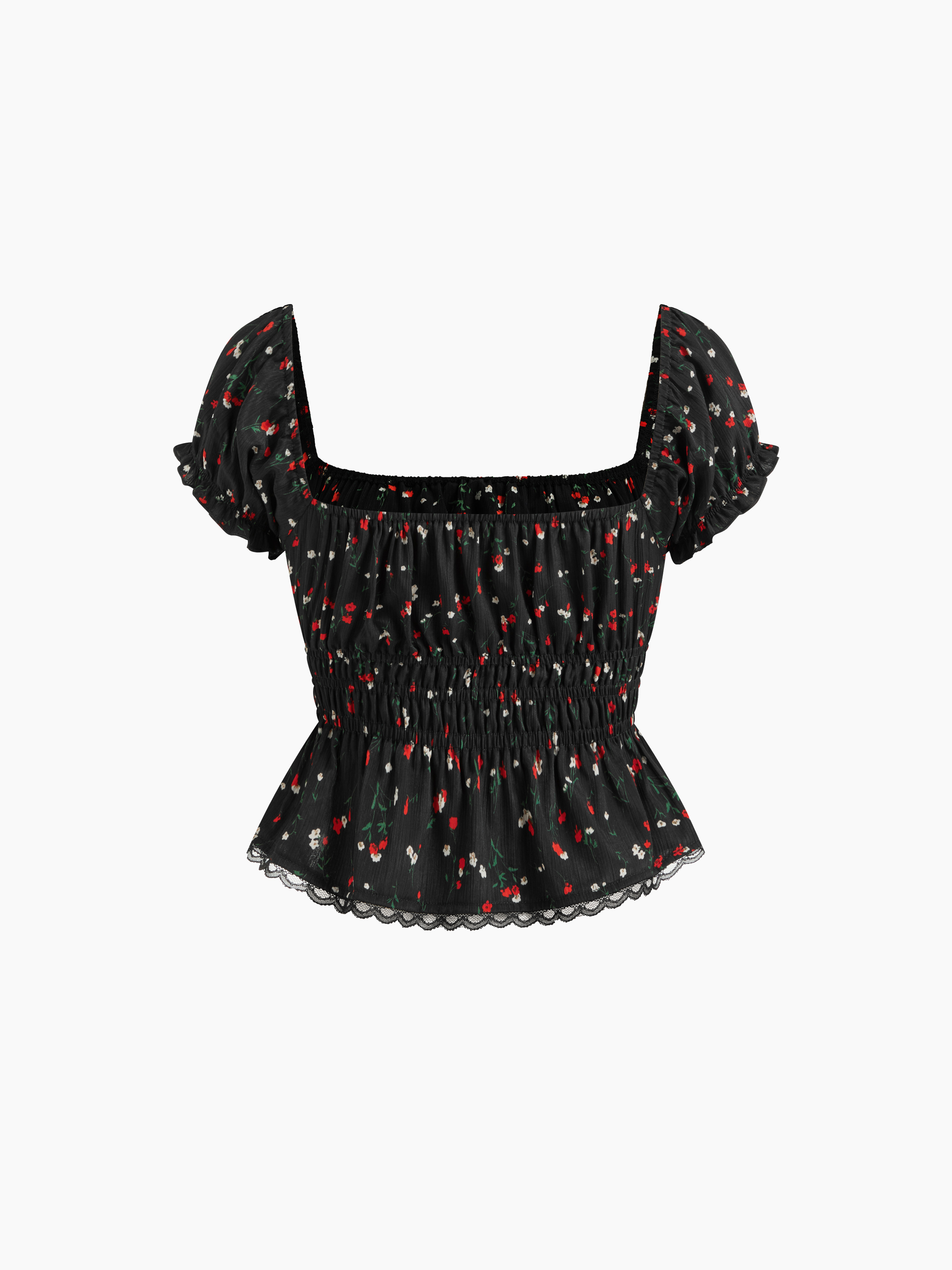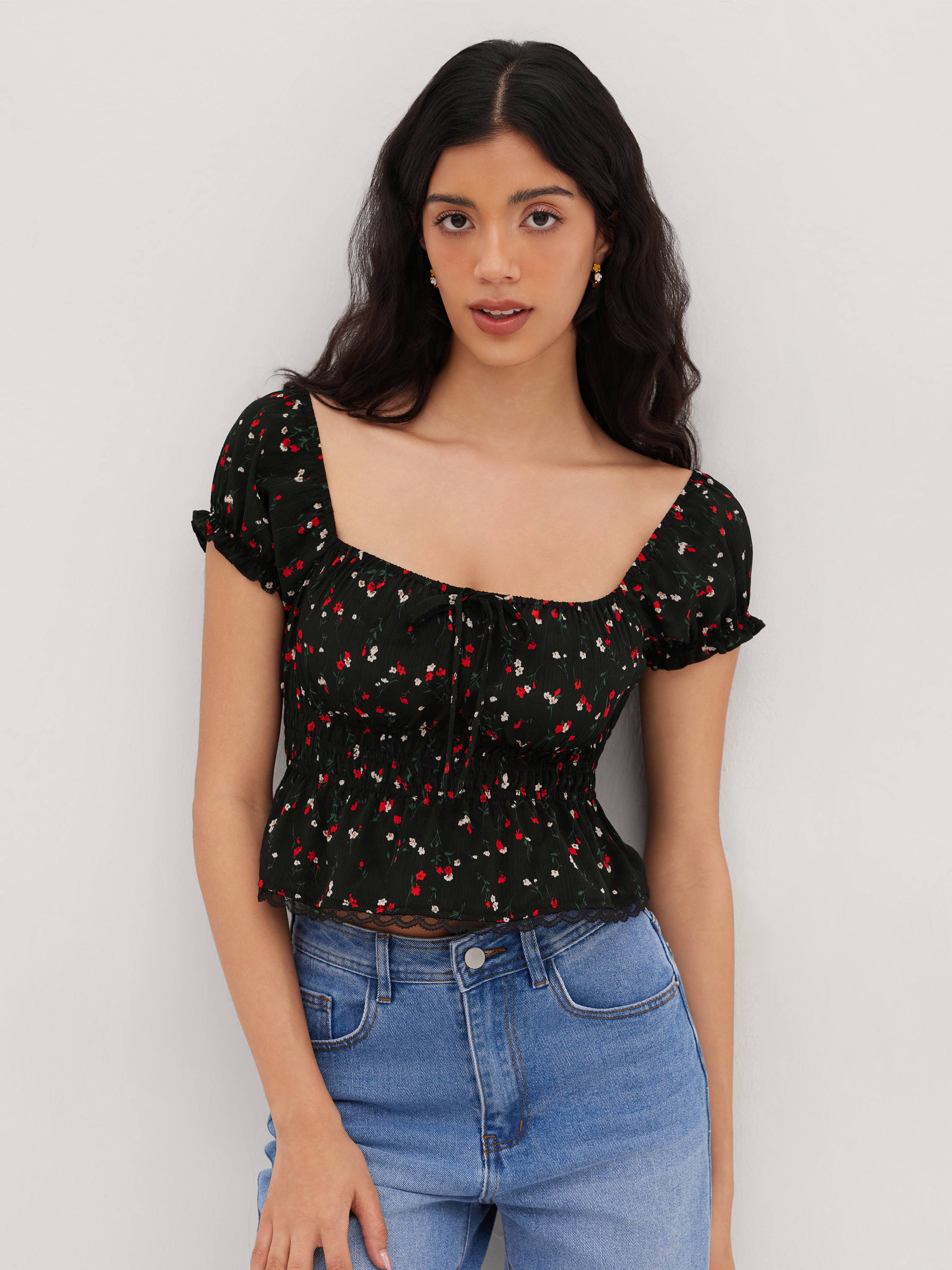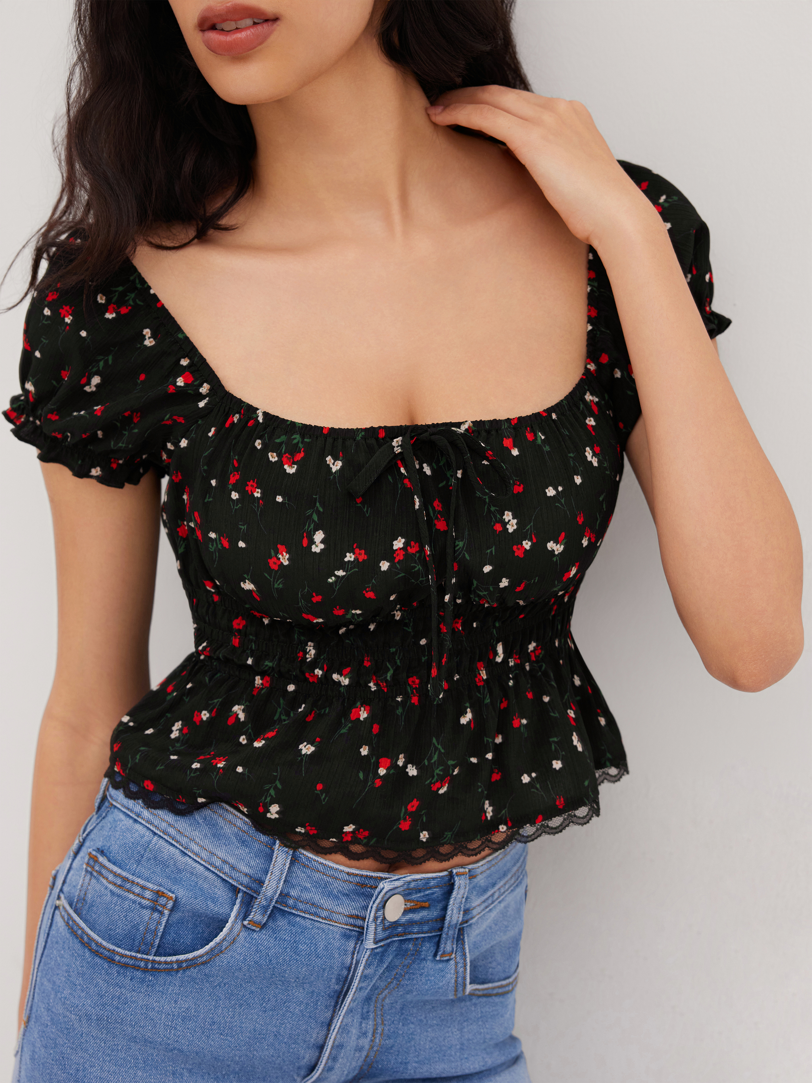 Top con Scollo Quadrato con Stampa Floreale e Bordo Lattuga