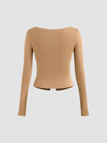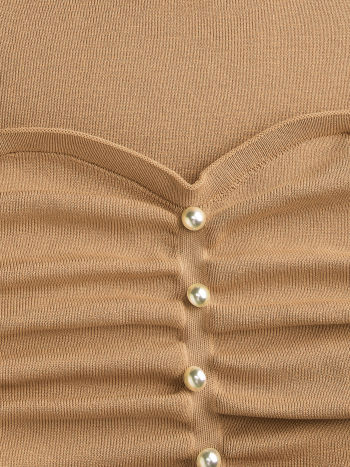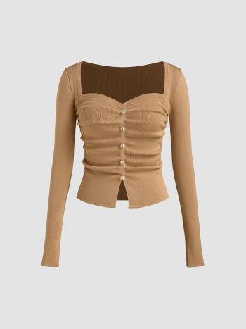 Crop top a manica lunga con scollo quadrato e solide perle finte, lavorate a maglia